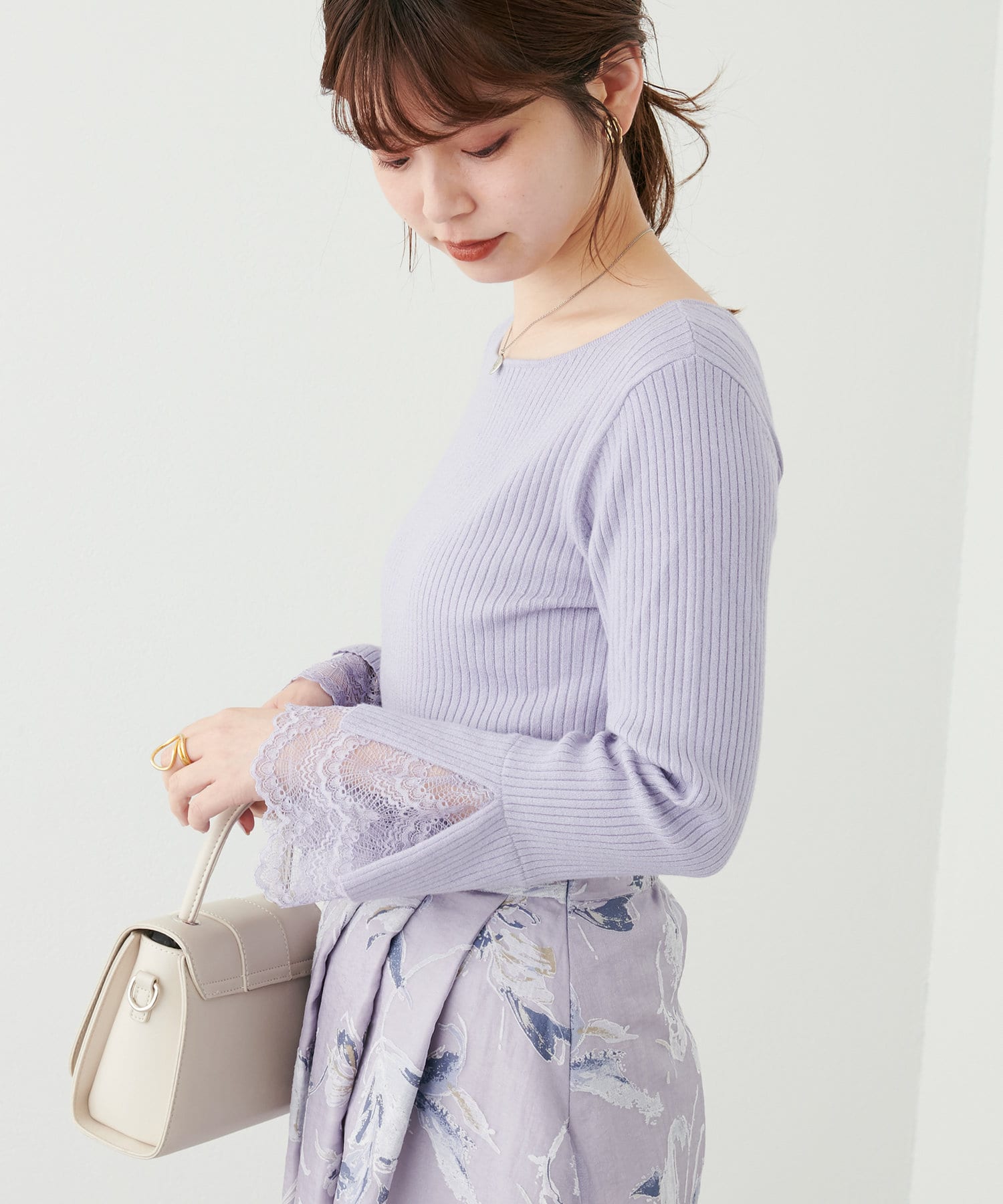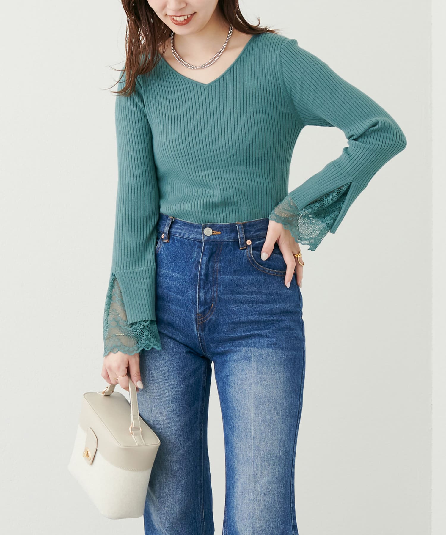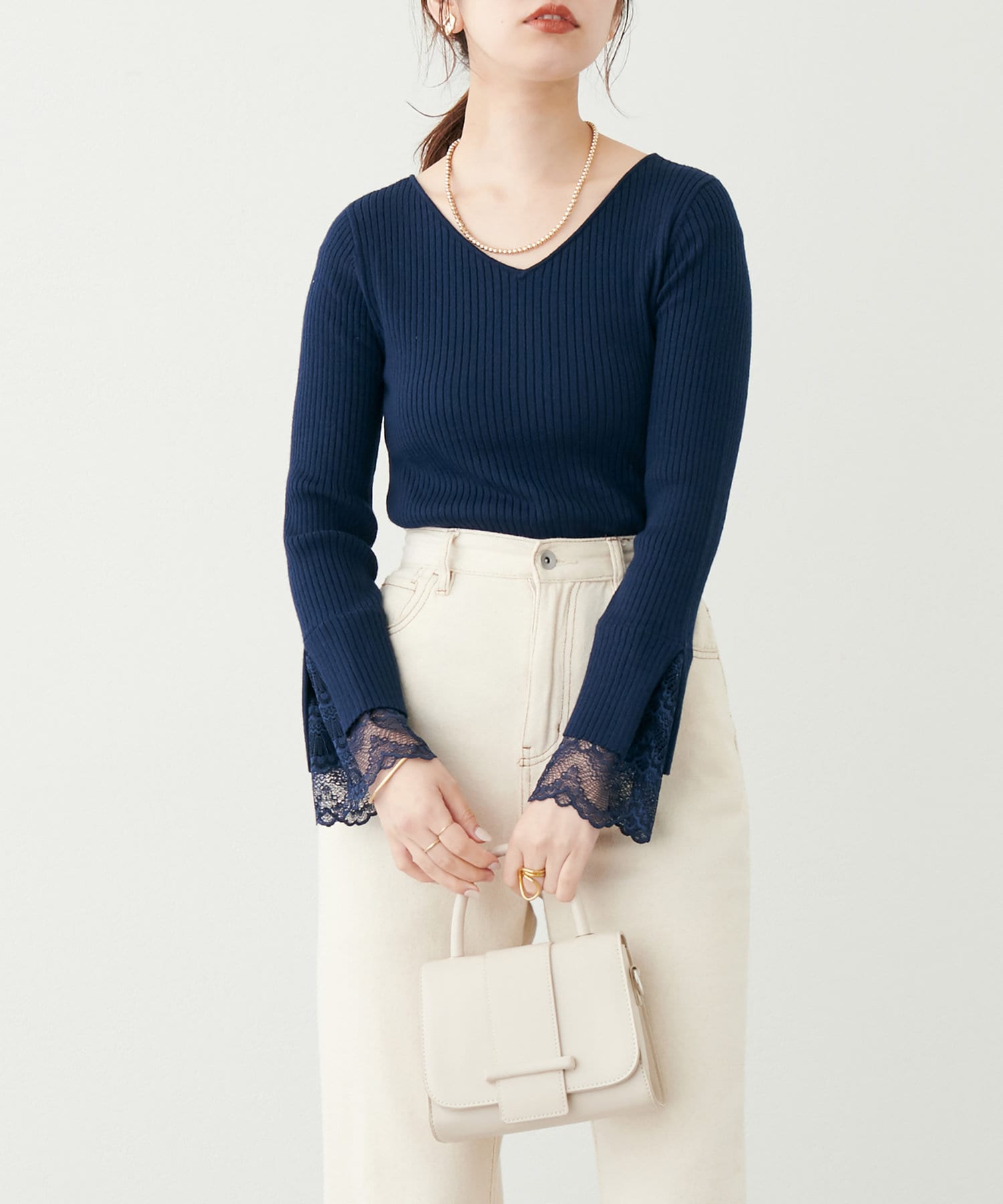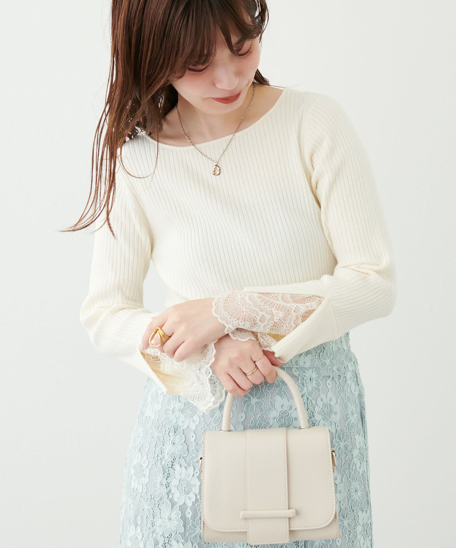 ニットの袖口には大きく切り込みをいれ、内側のレースでほんのり甘さもプラス。