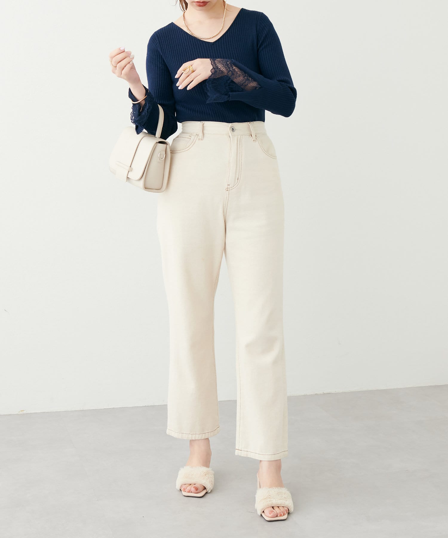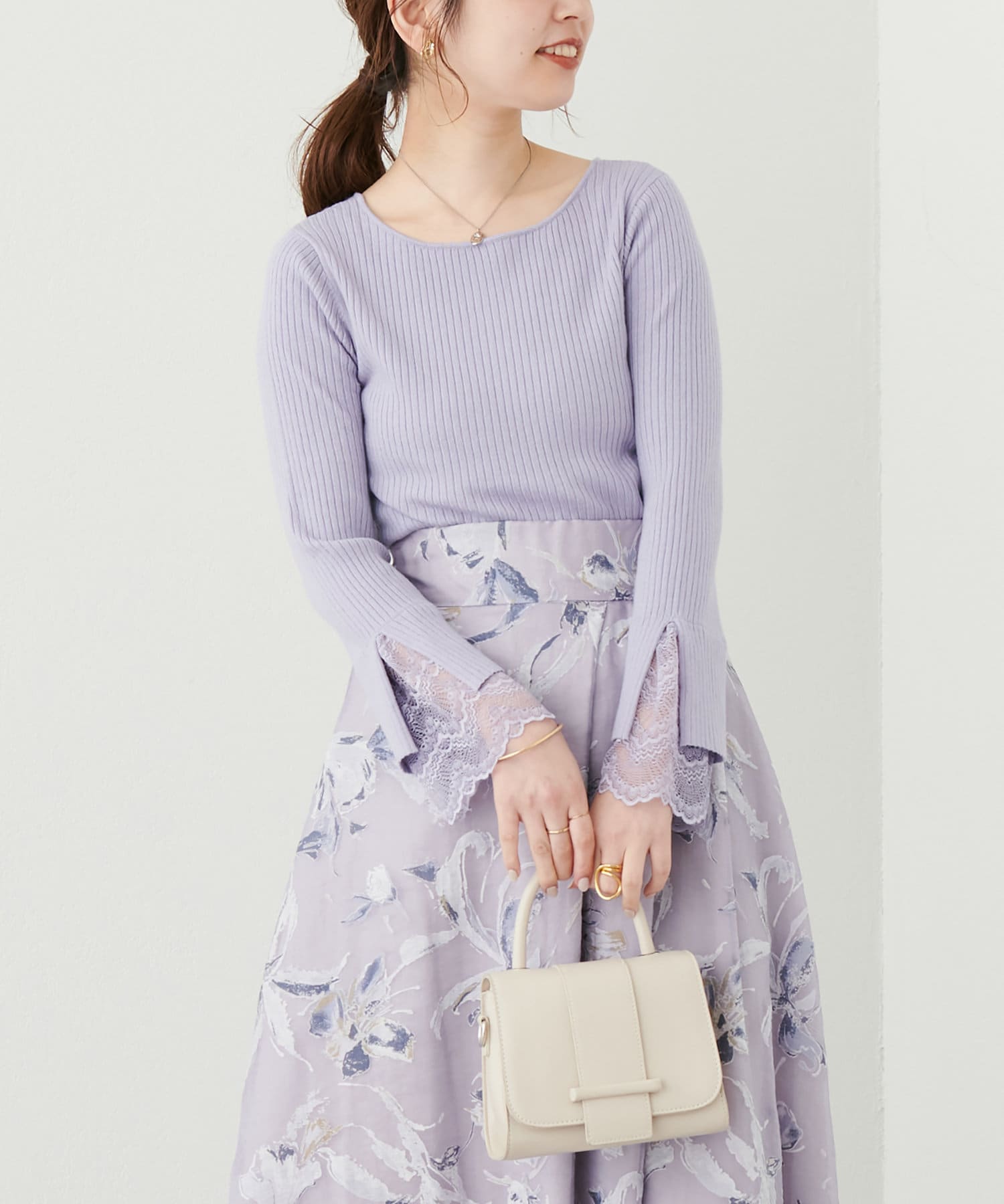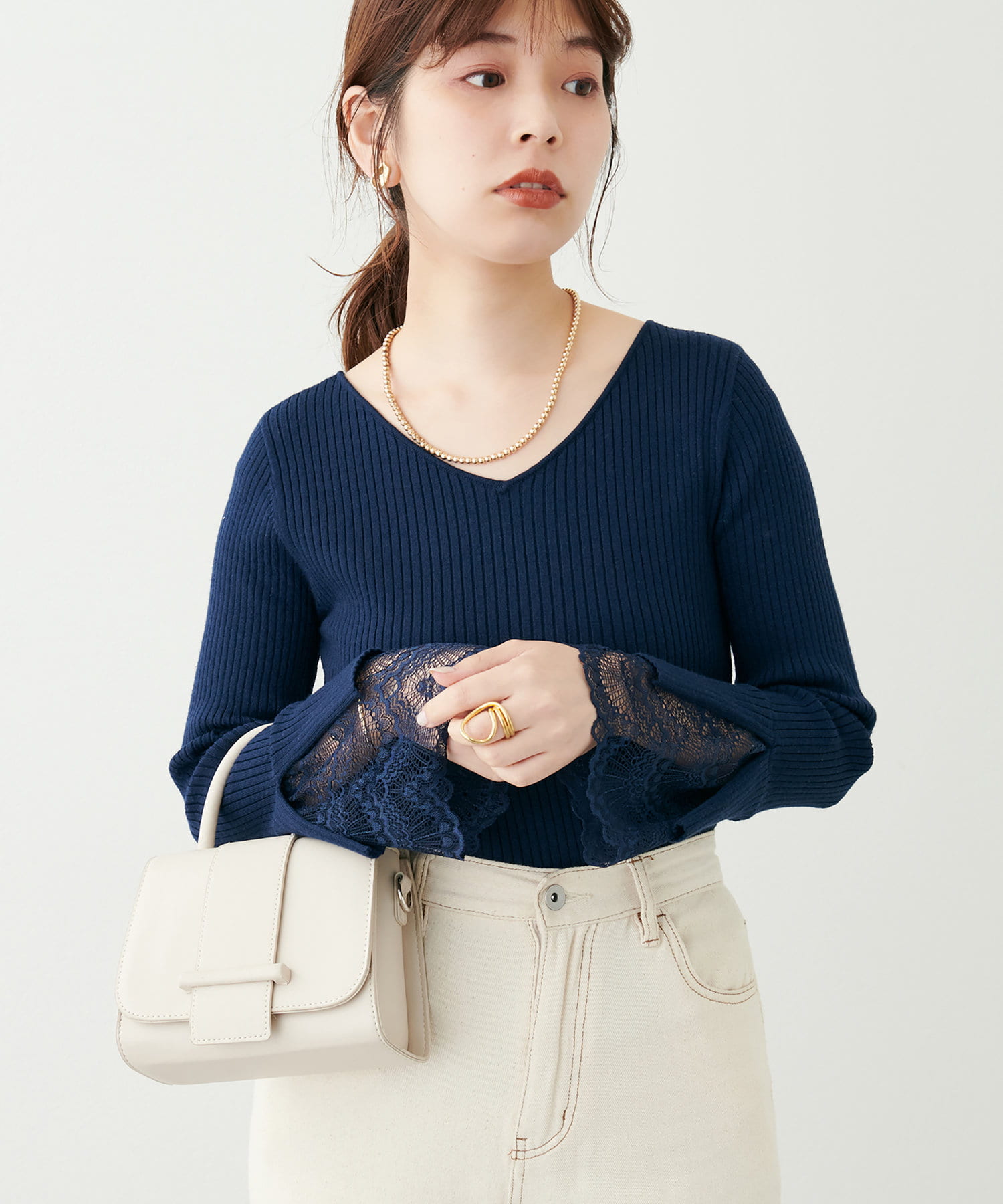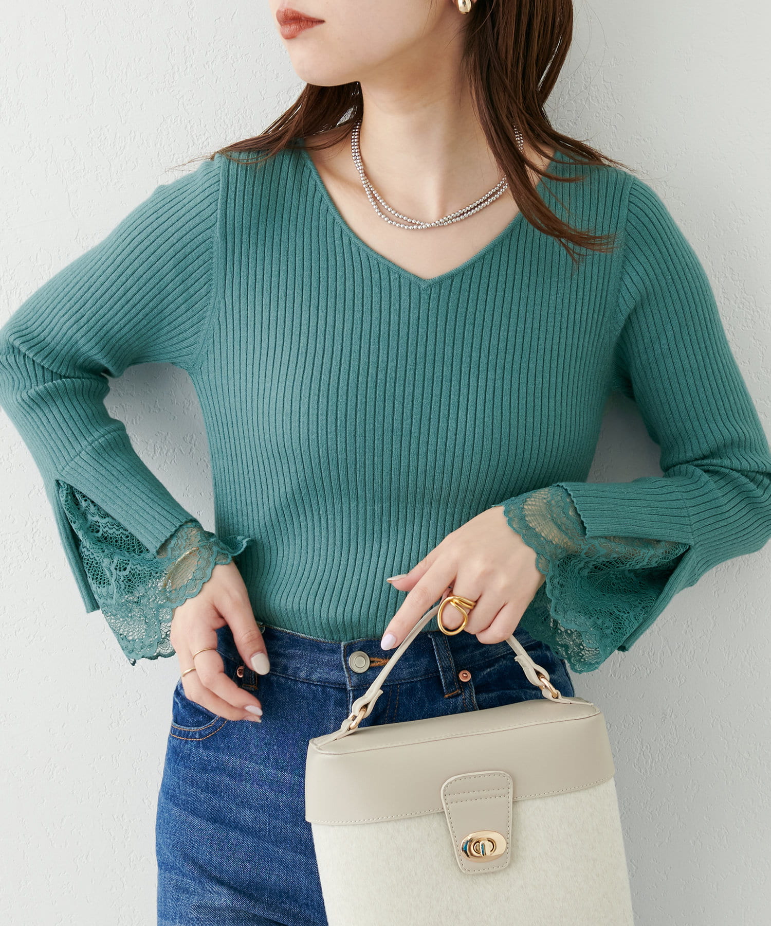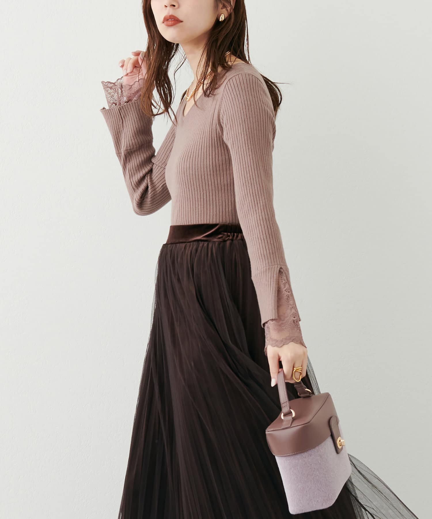 ニットの袖口には大きく切り込みをいれ、内側のレースでほんのり甘さもプラス。