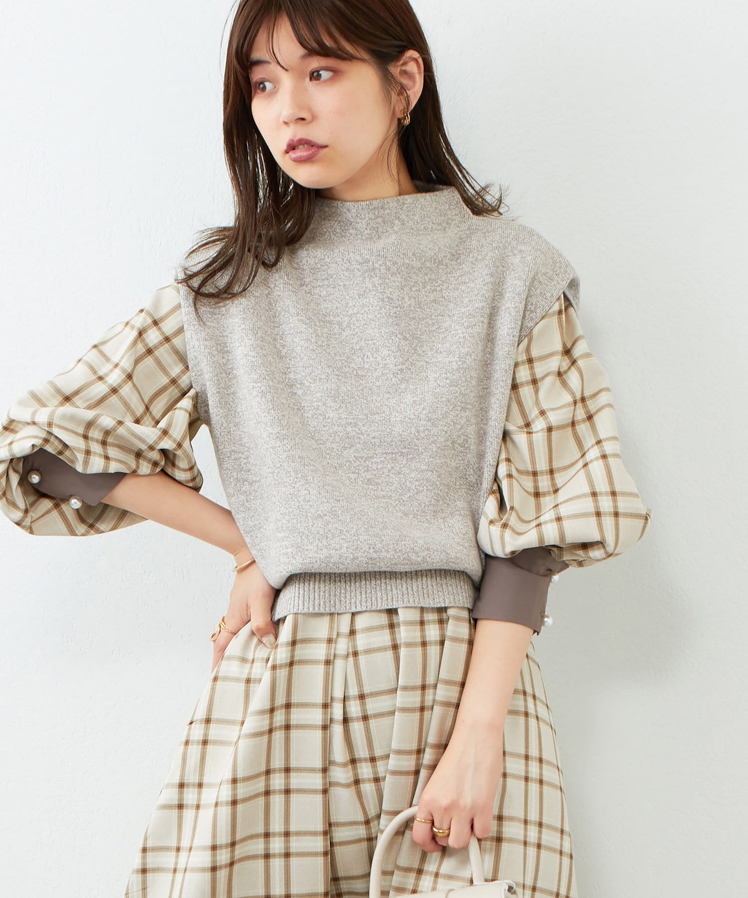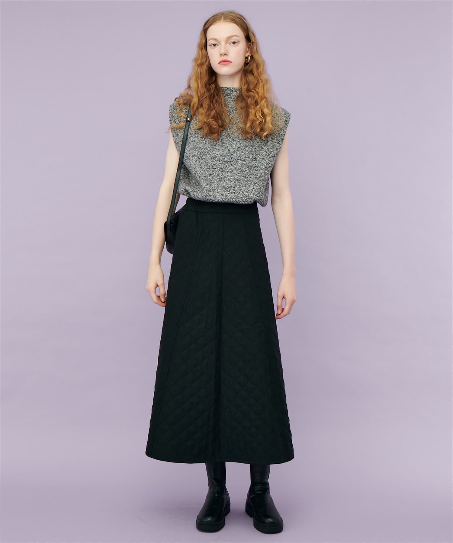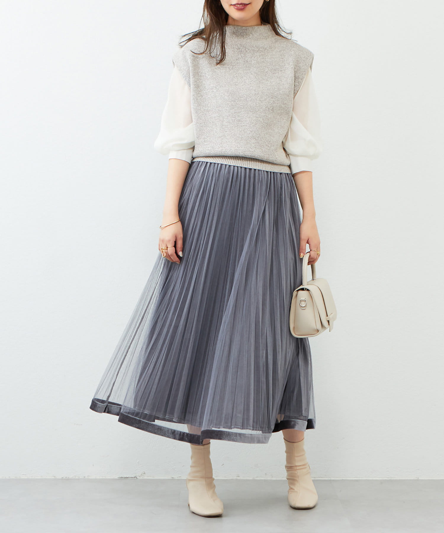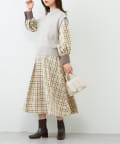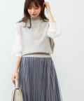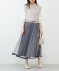 ボトムは丈は少しボリューム感のあるフレアスカート合わせでもキレイめな印象で着ていただけます。