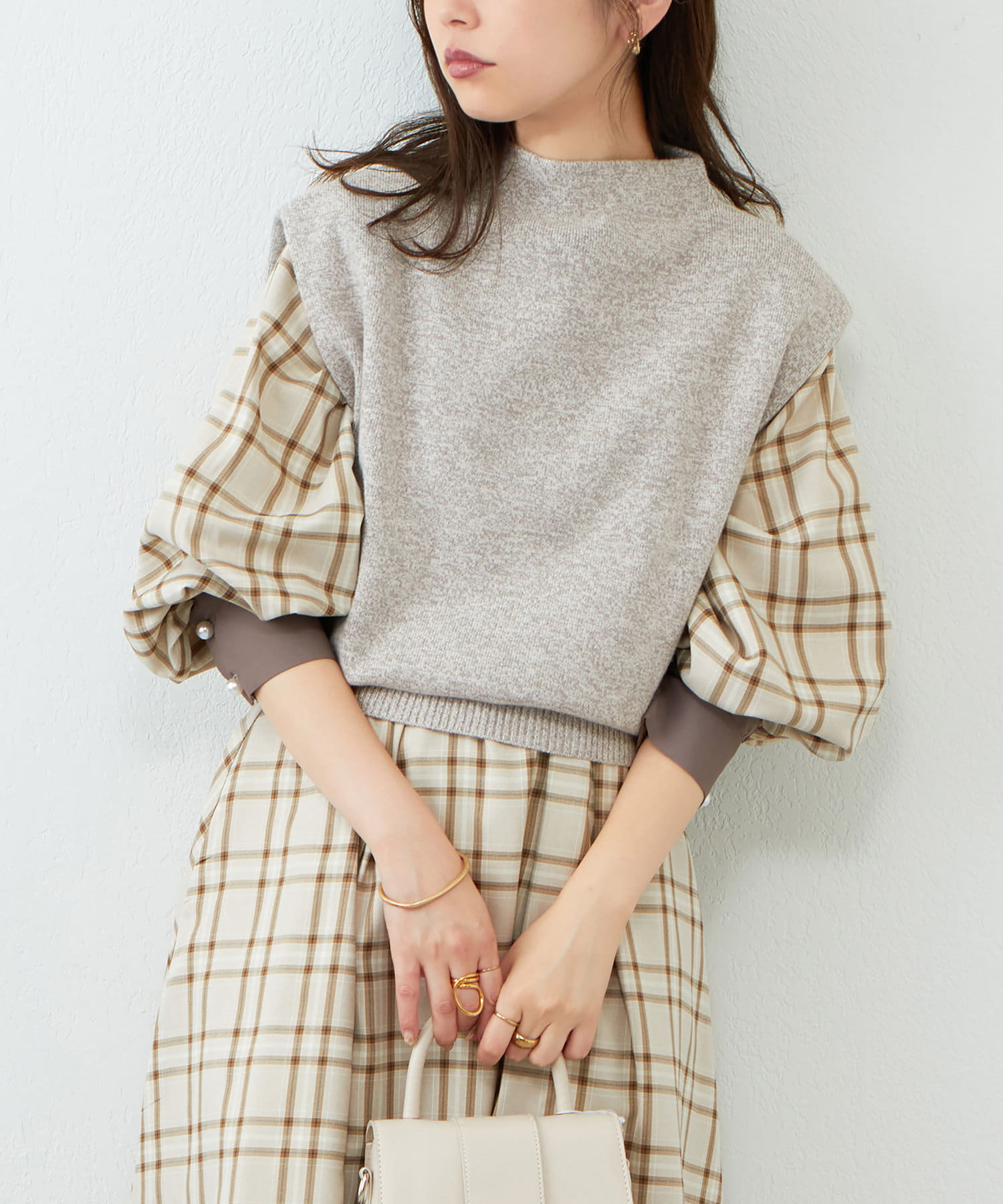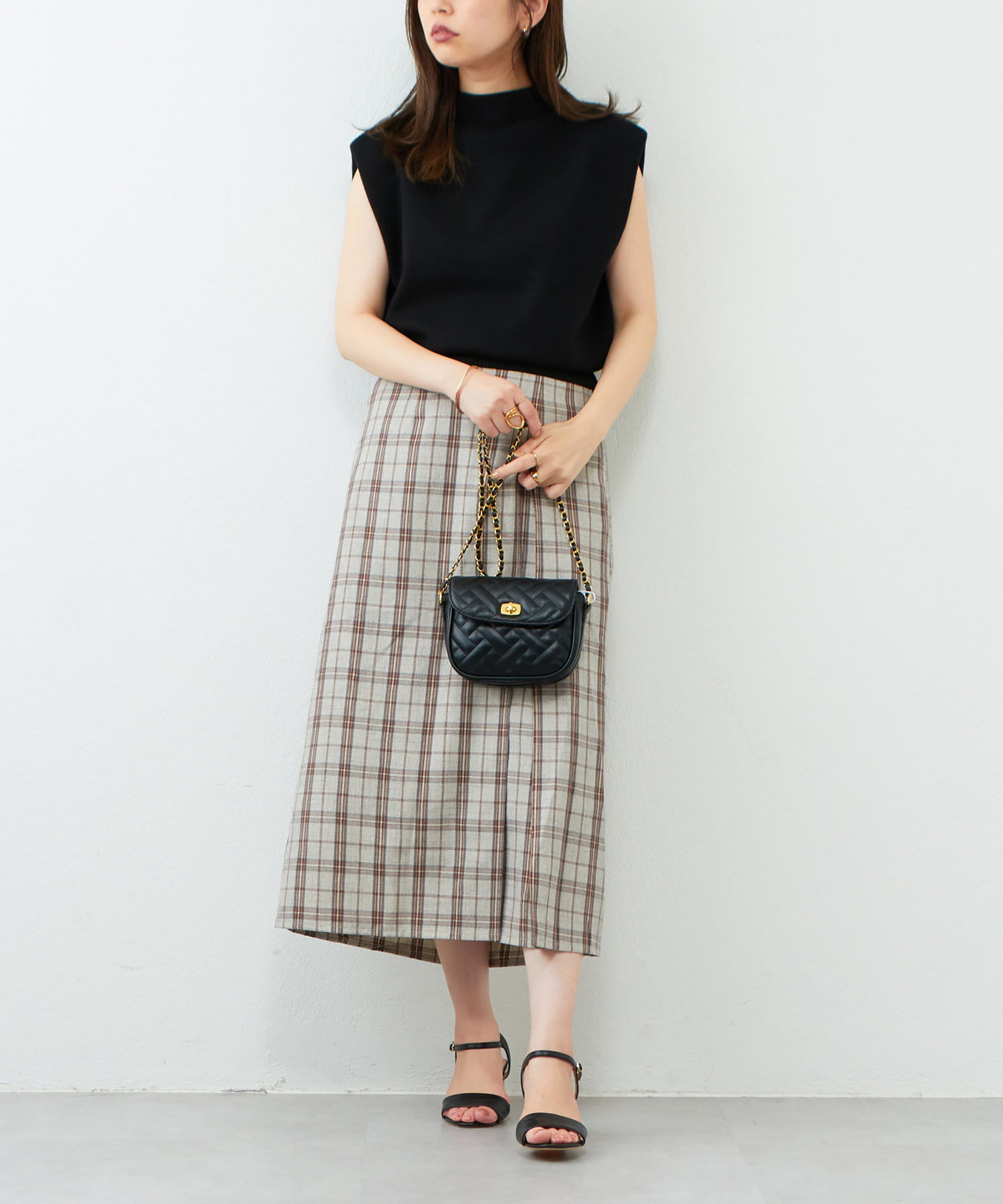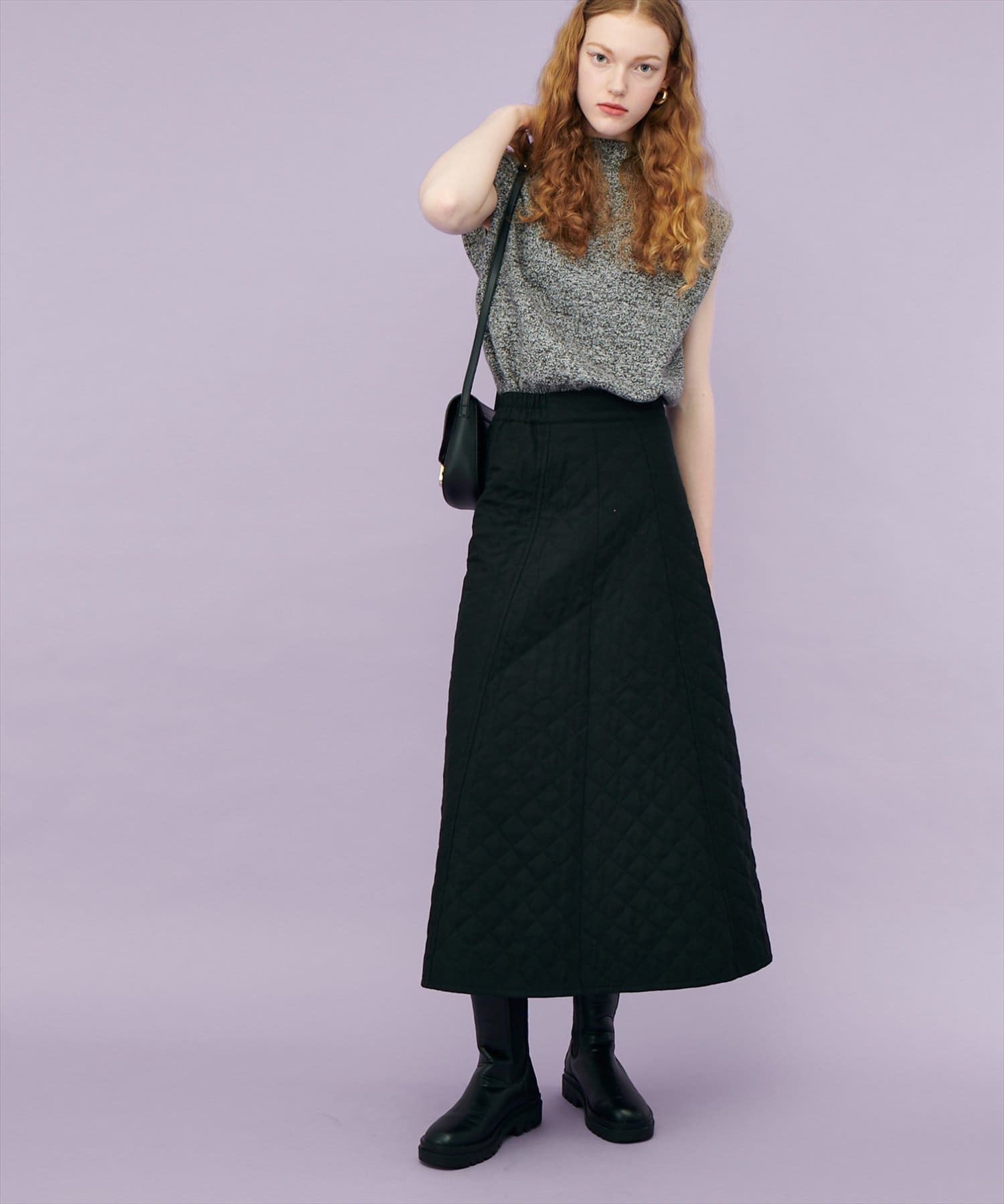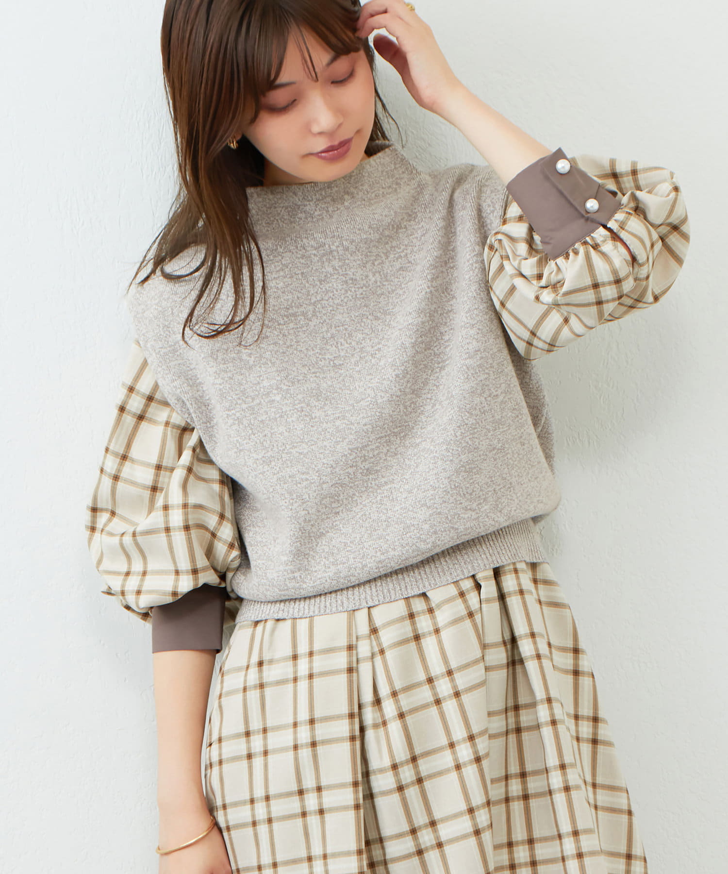ボトムは丈は少しボリューム感のあるフレアスカート合わせでもキレイめな印象で着ていただけます。