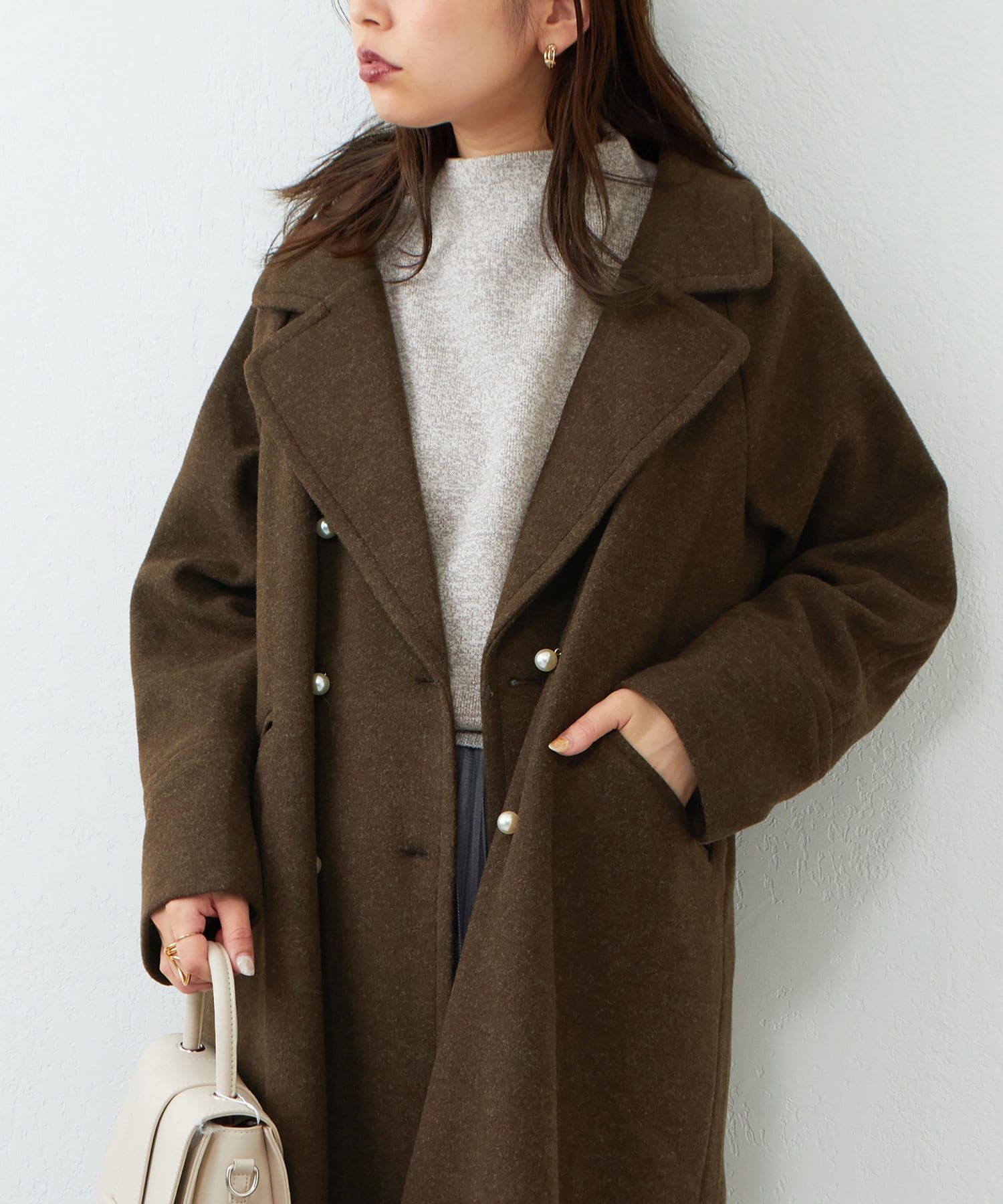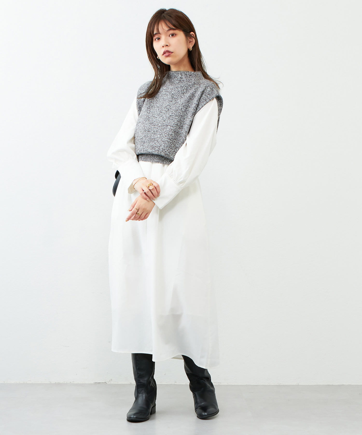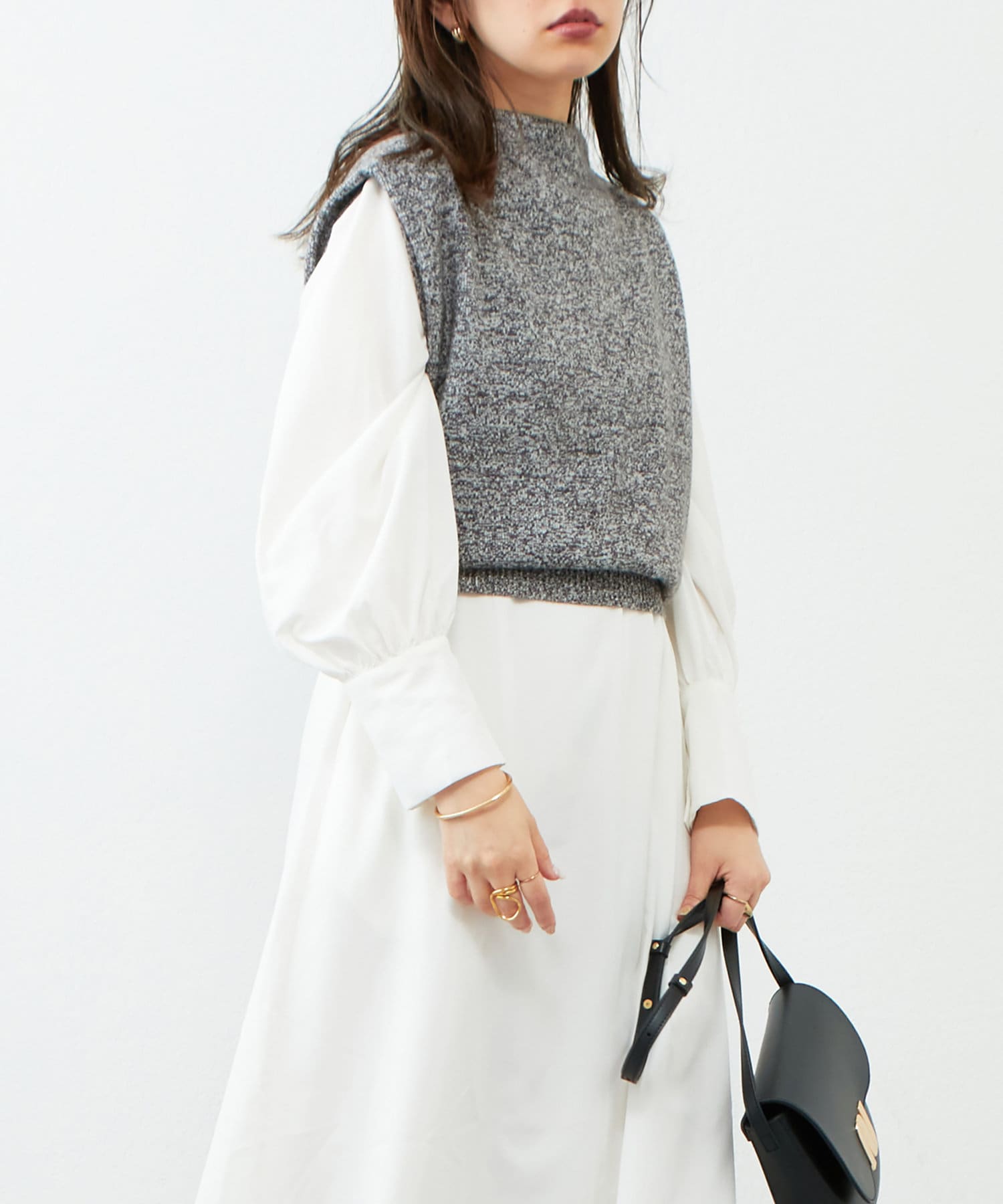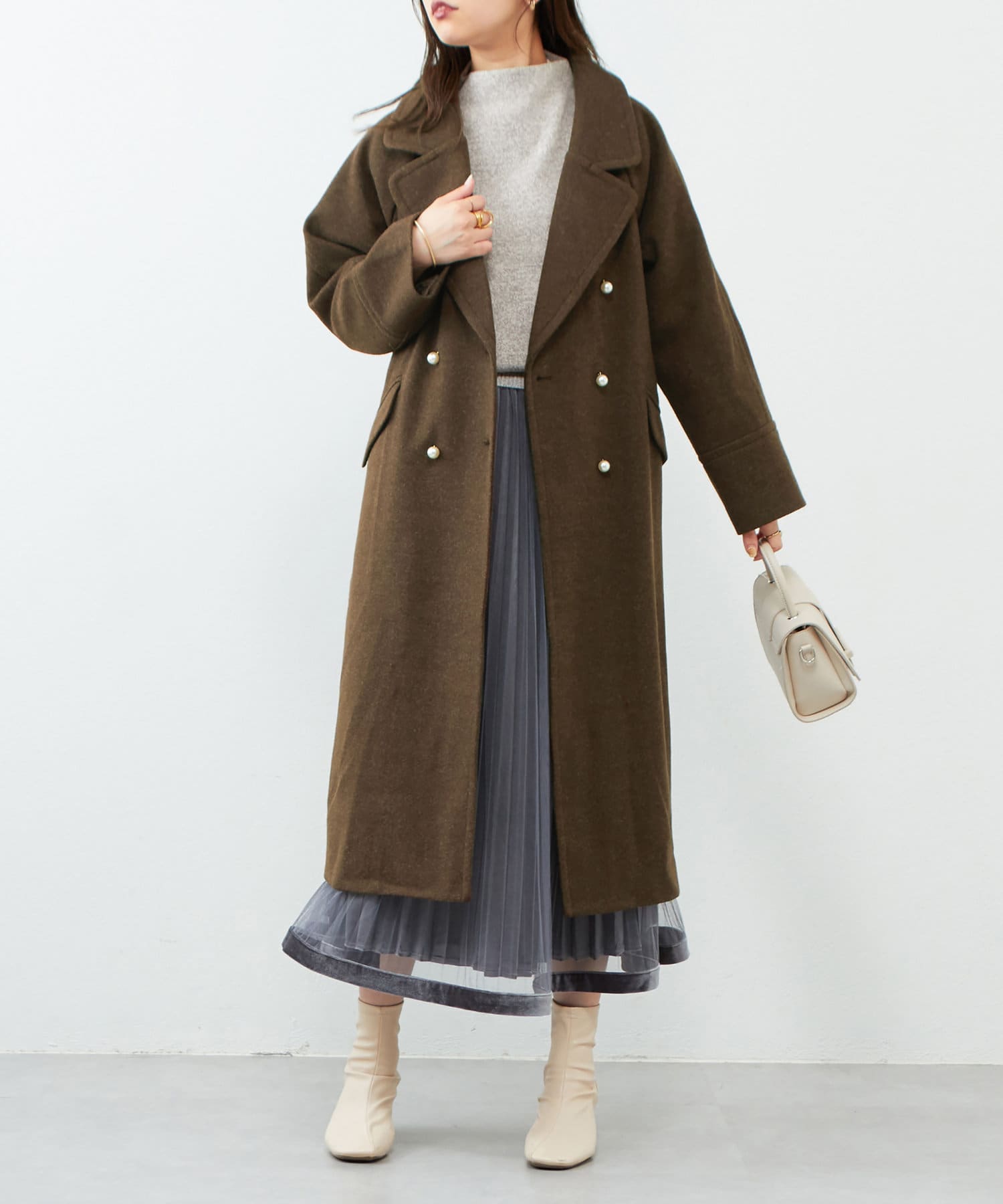 インナーにはシアー素材のトップスや、シャツワンピースなどのハリ感のある素材を合わせたり、異素材感を楽しんで頂けます。