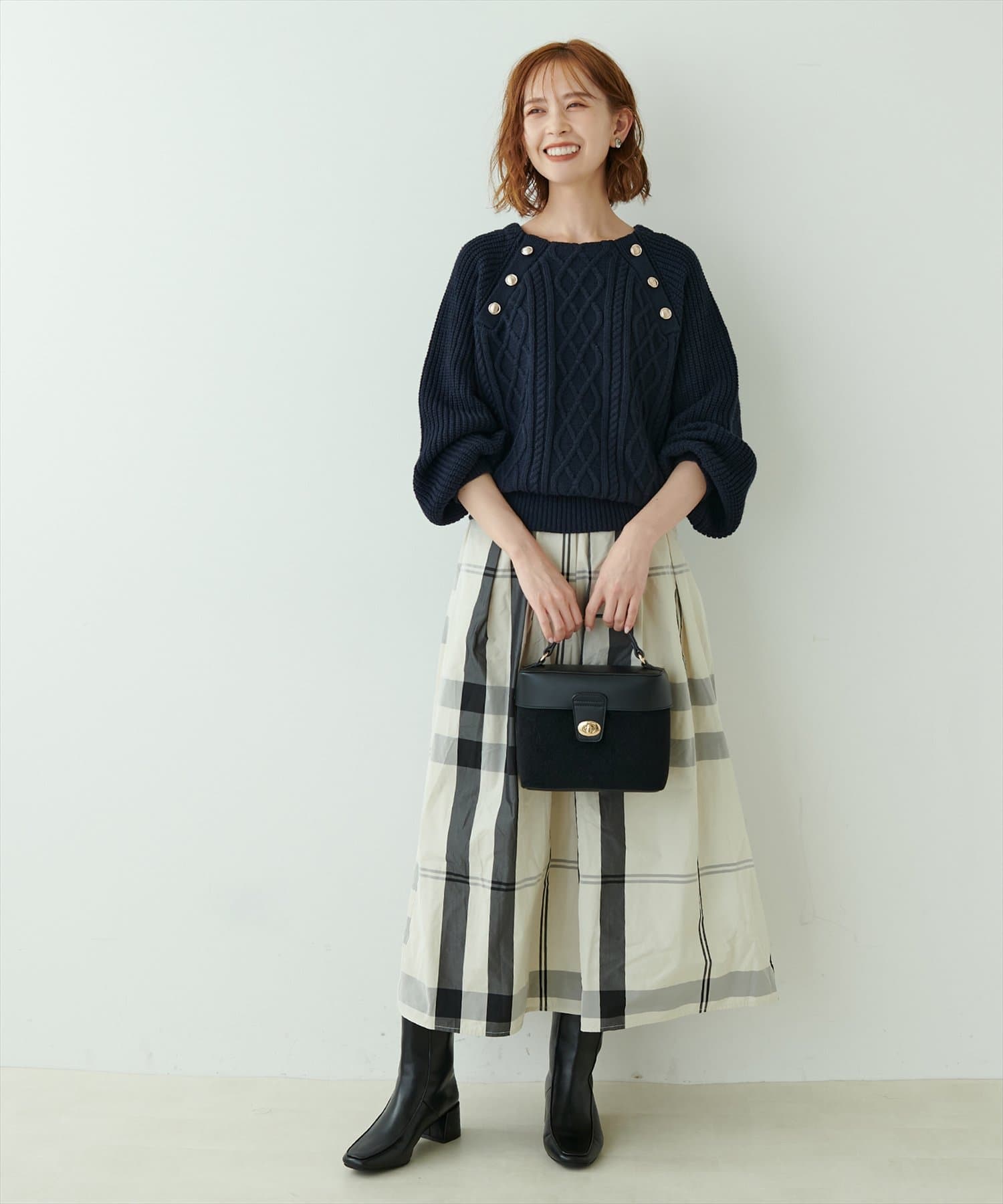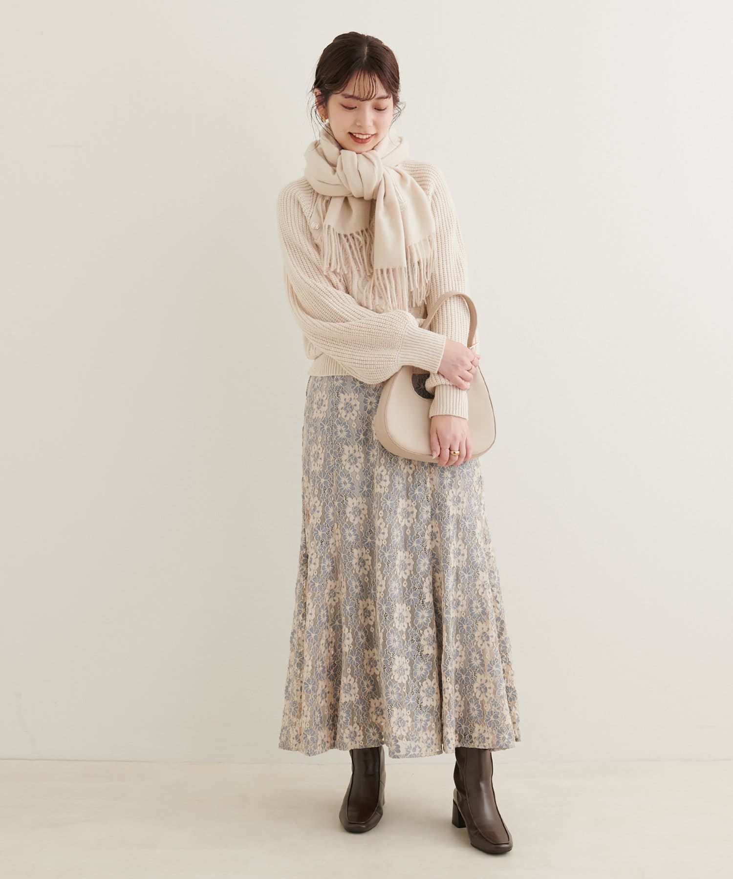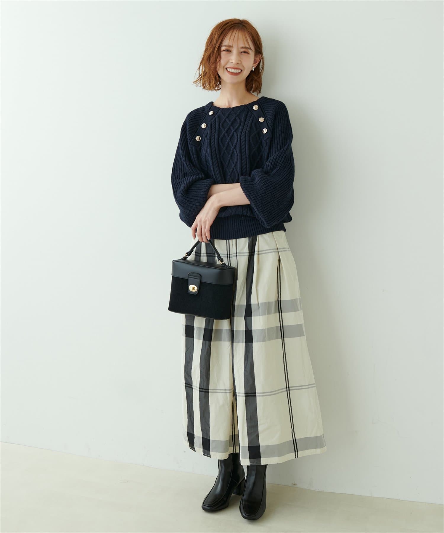 網目がザックりしているので、つるんとした生地のスカートやパンツ合わせがおすすめ。
