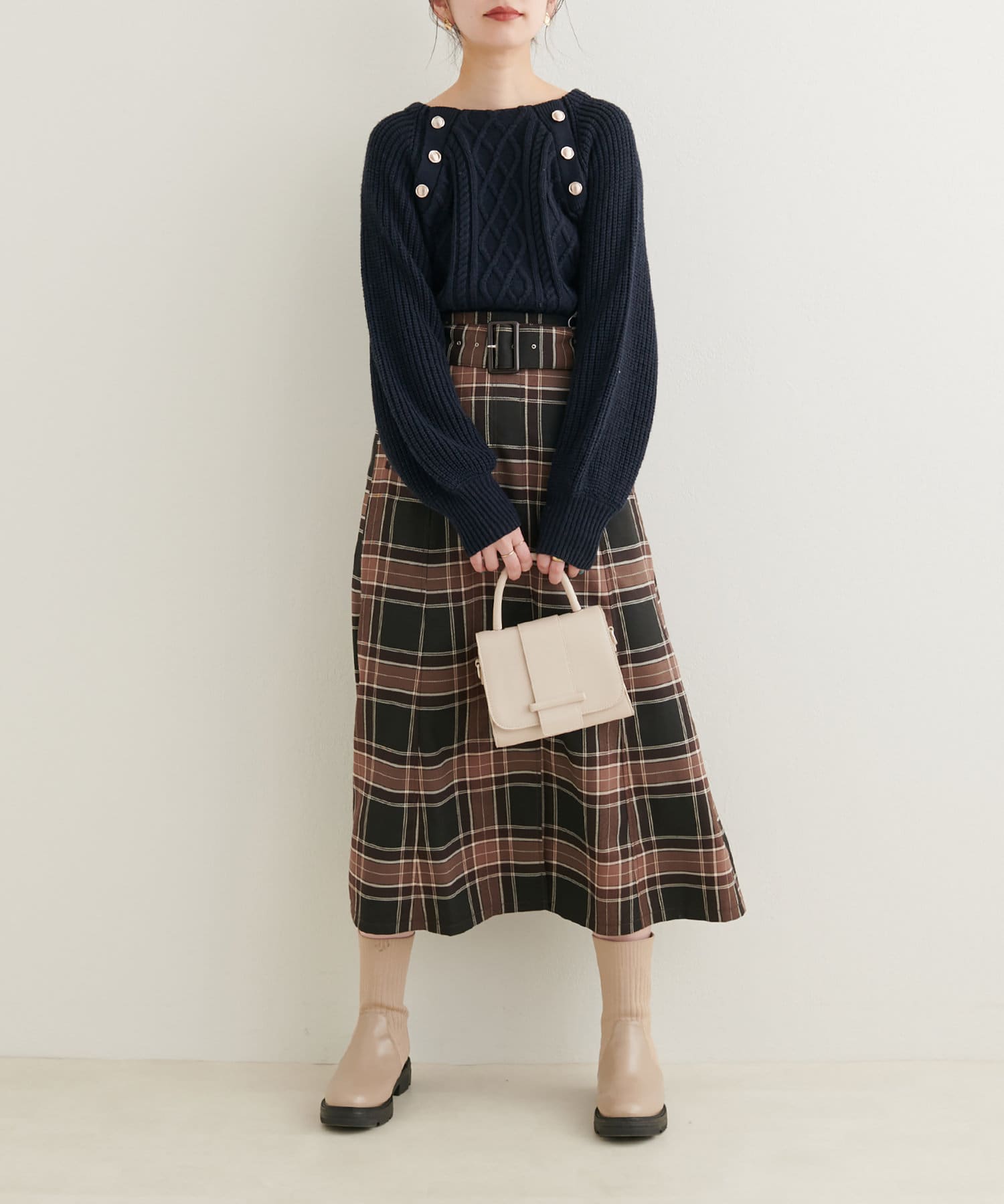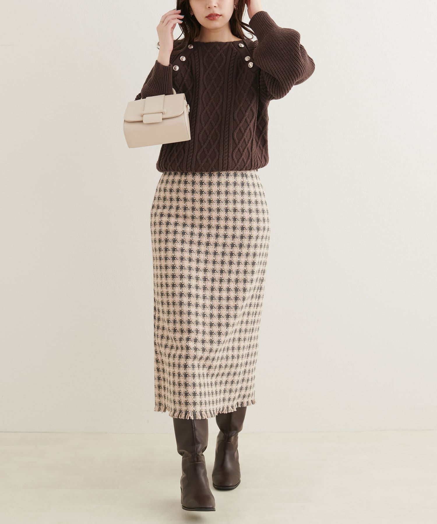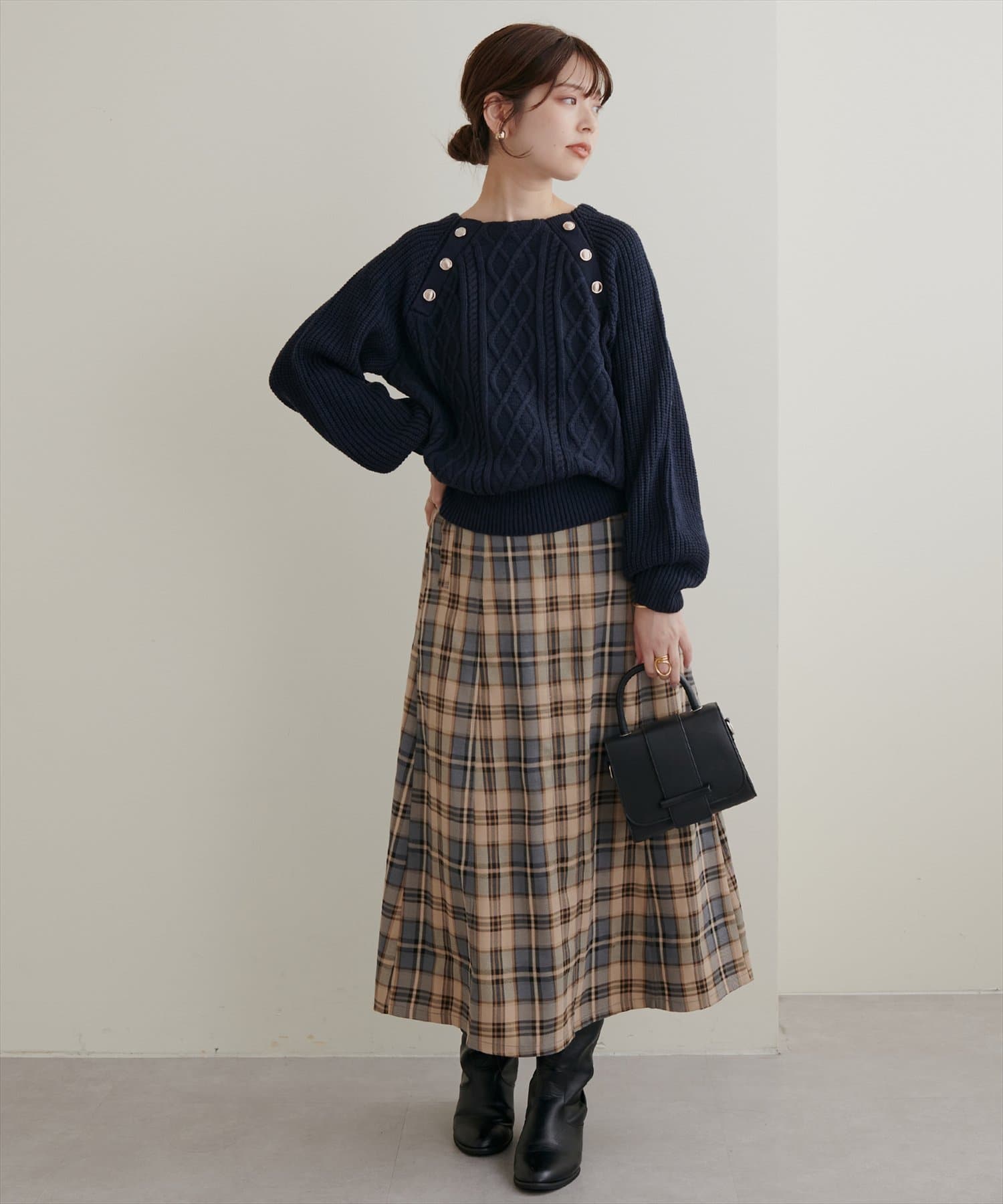 網目がザックりしているので、つるんとした生地のスカートやパンツ合わせがおすすめ。