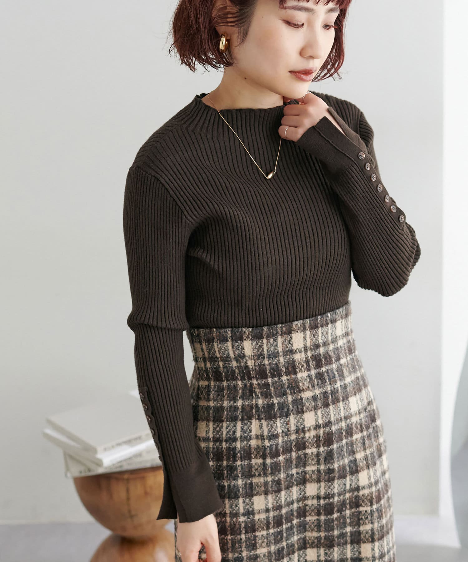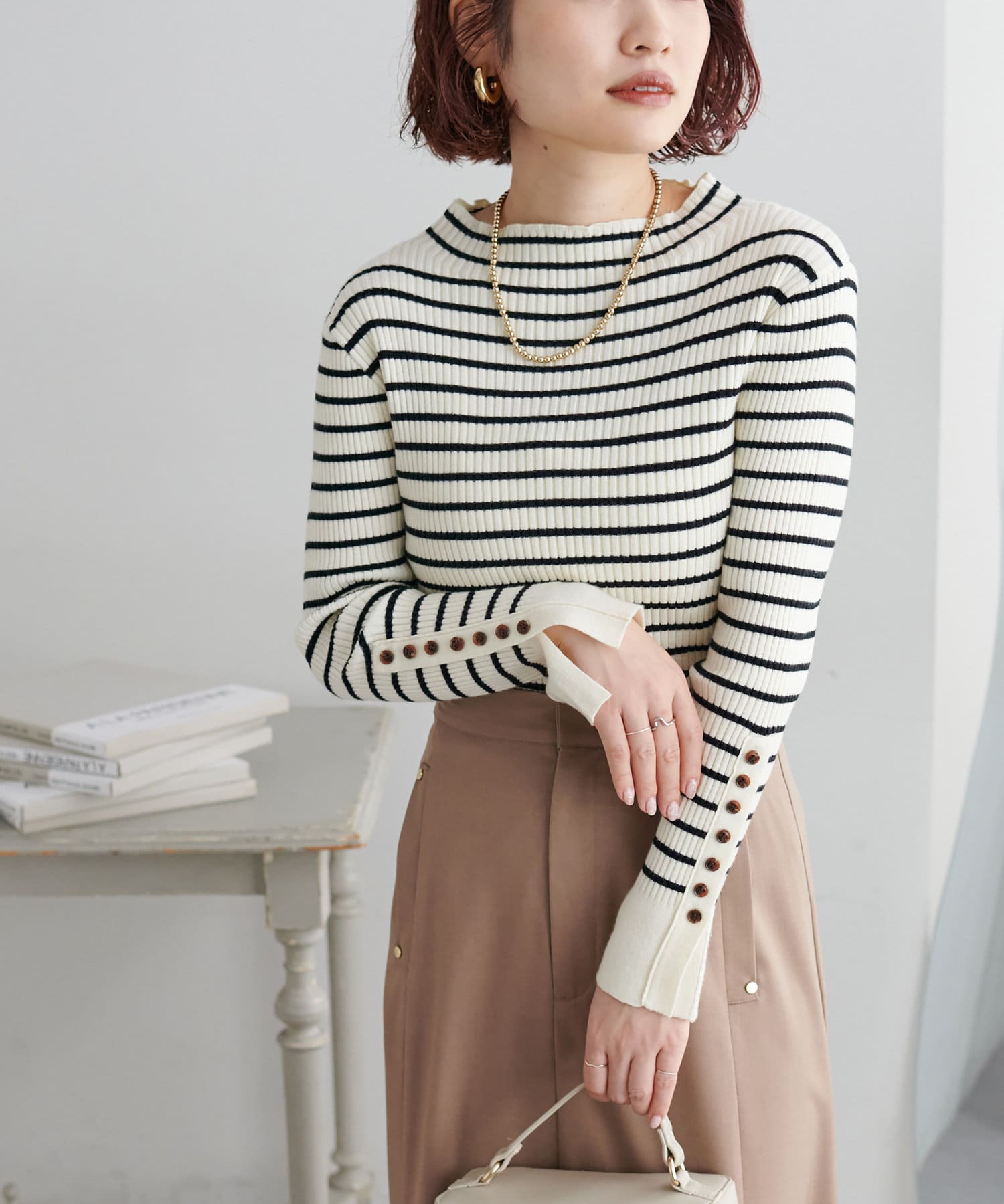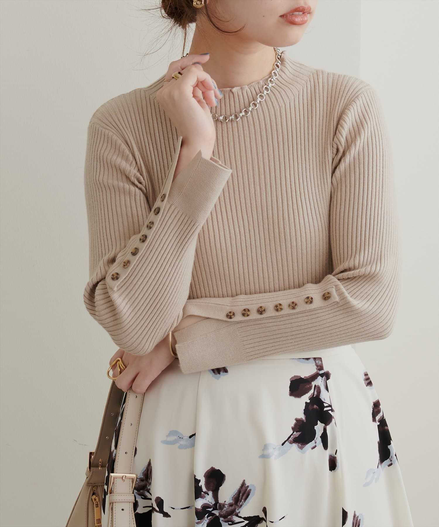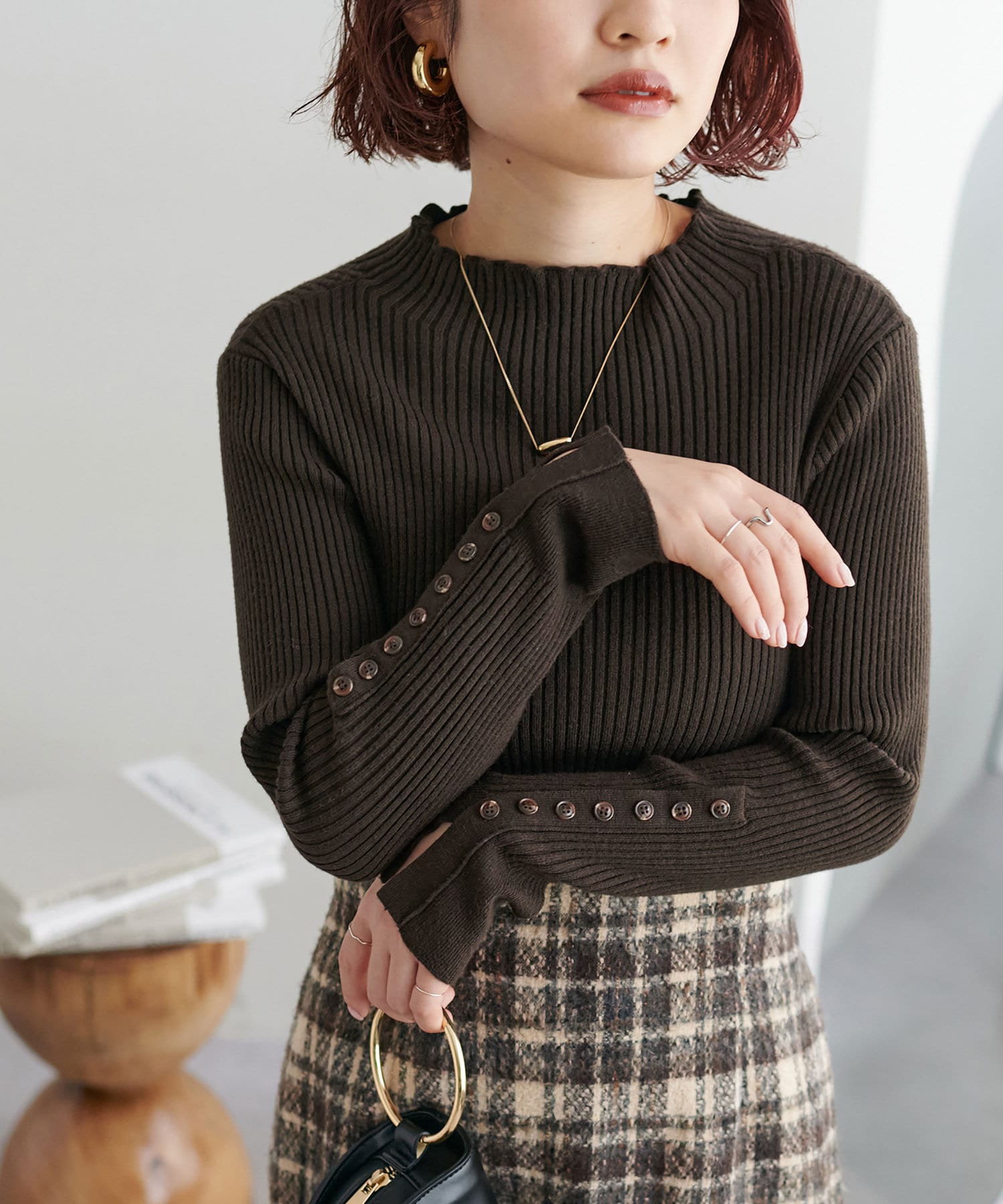 ナチュラルに高見えするべっ甲釦を袖に施した、もちもち素材のハイネックリブニット。