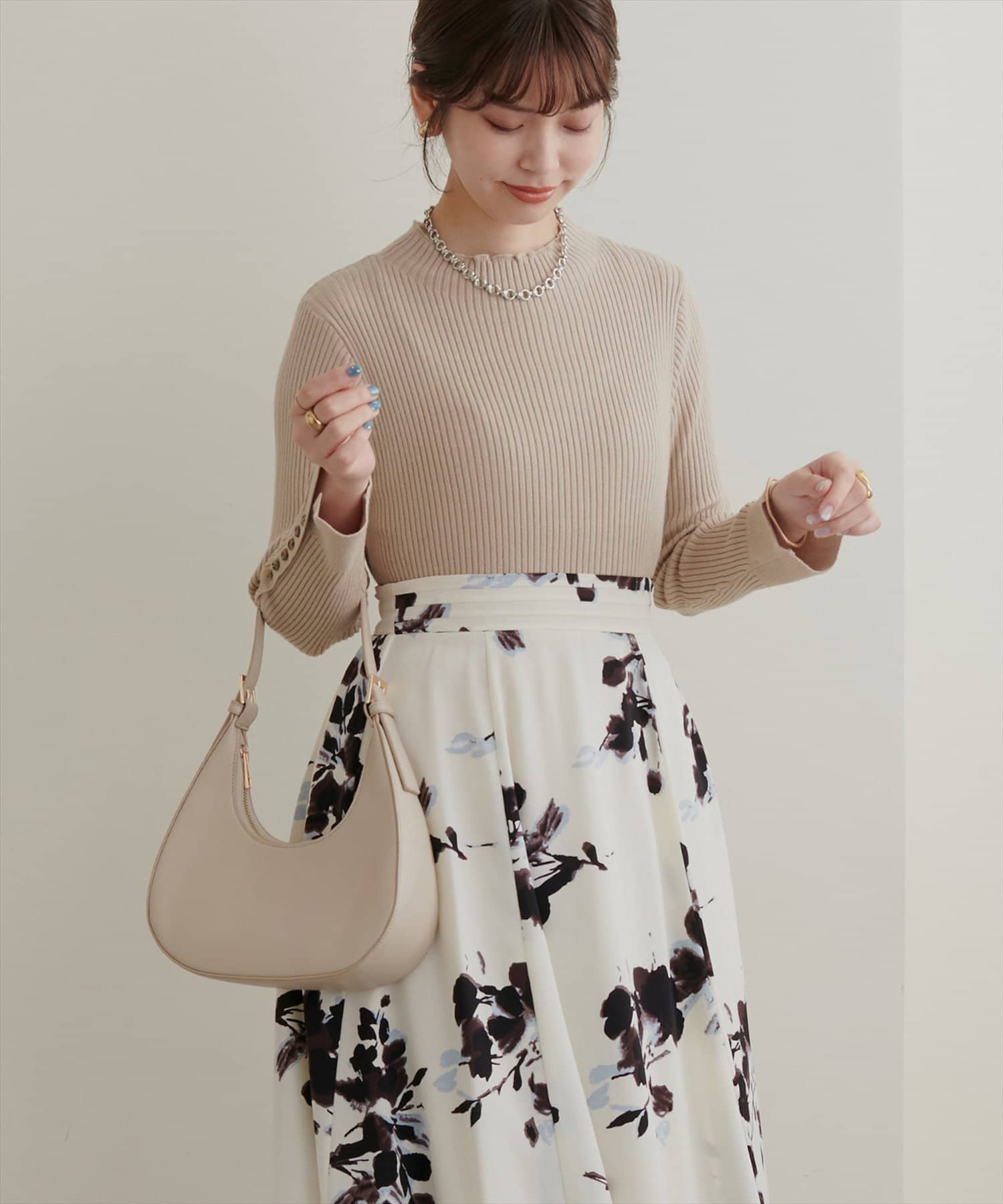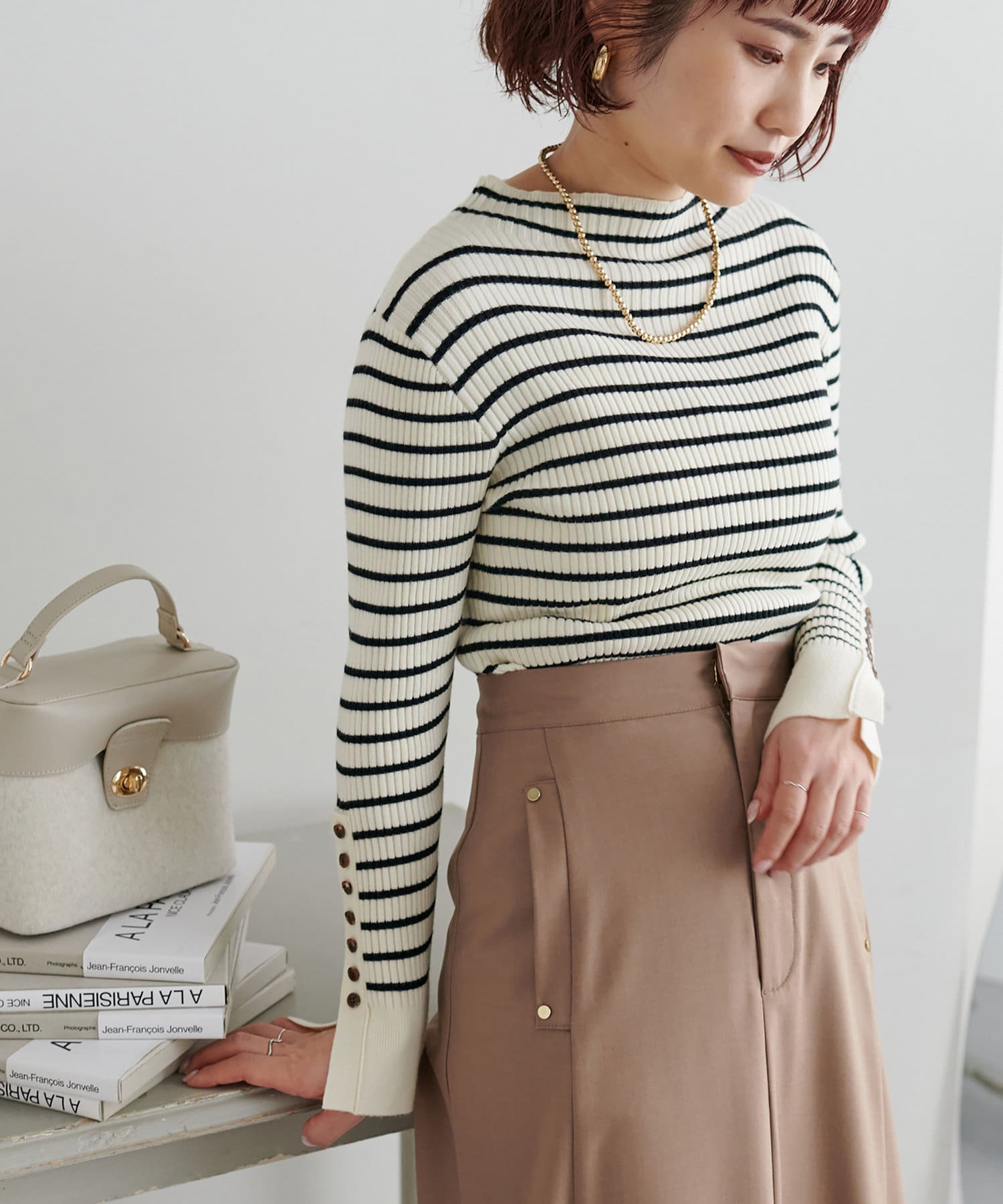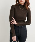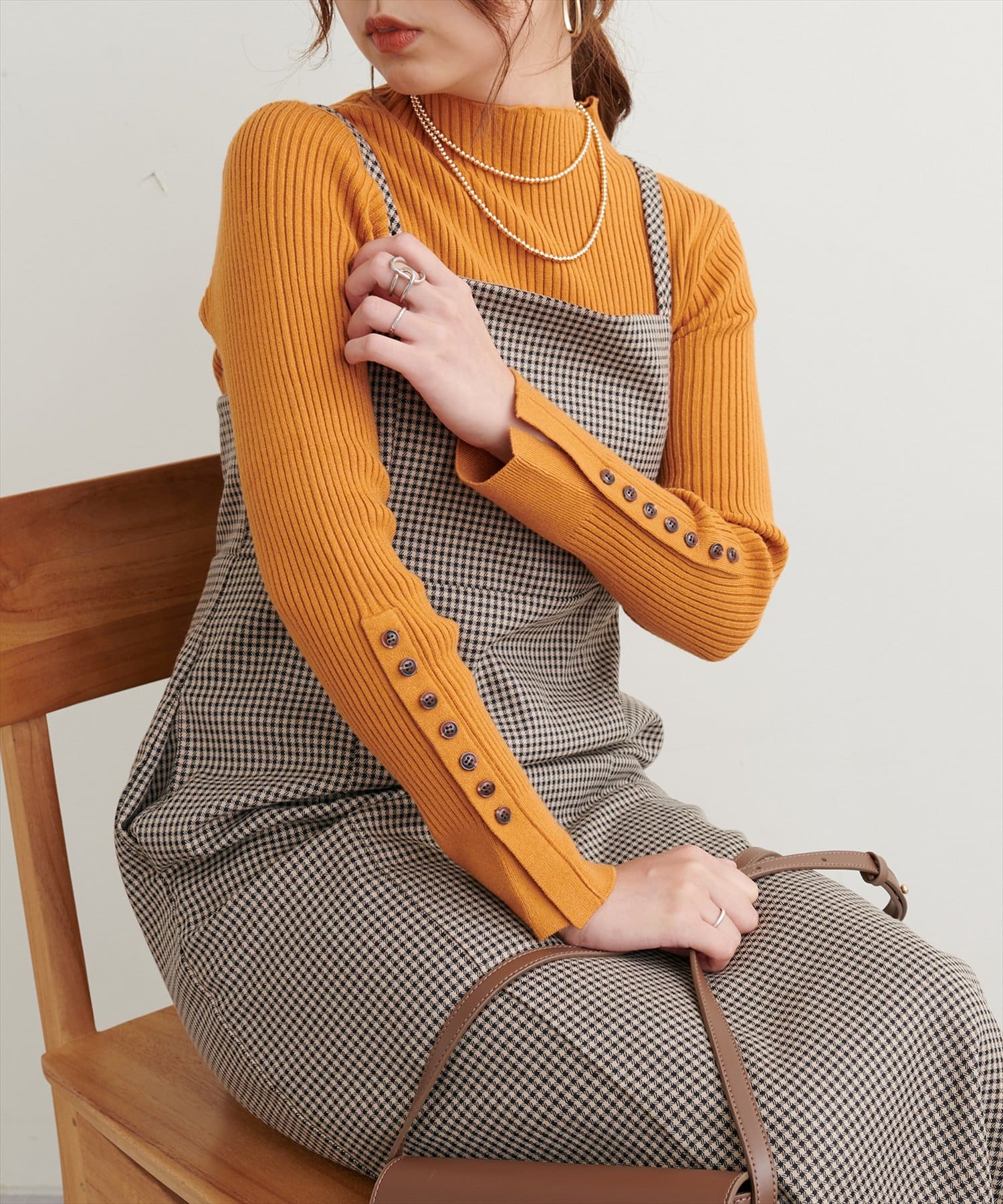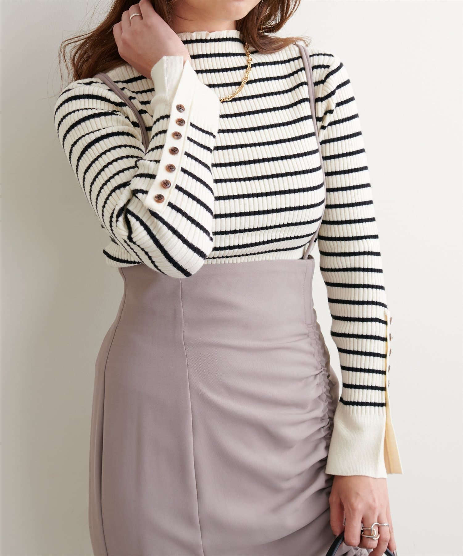 ナチュラルに高見えするべっ甲釦を袖に施した、もちもち素材のハイネックリブニット。