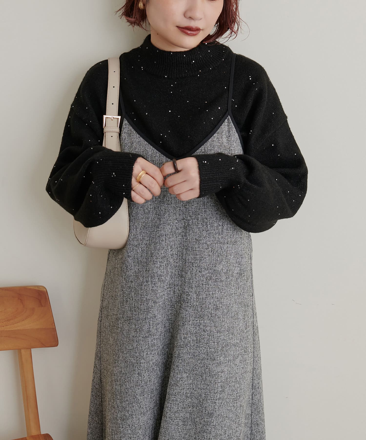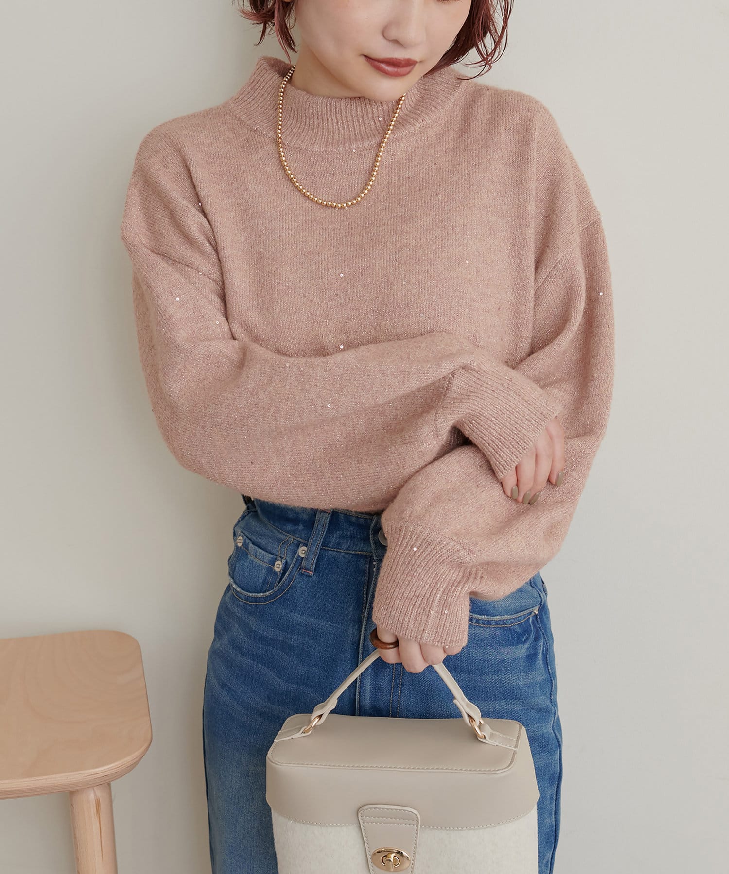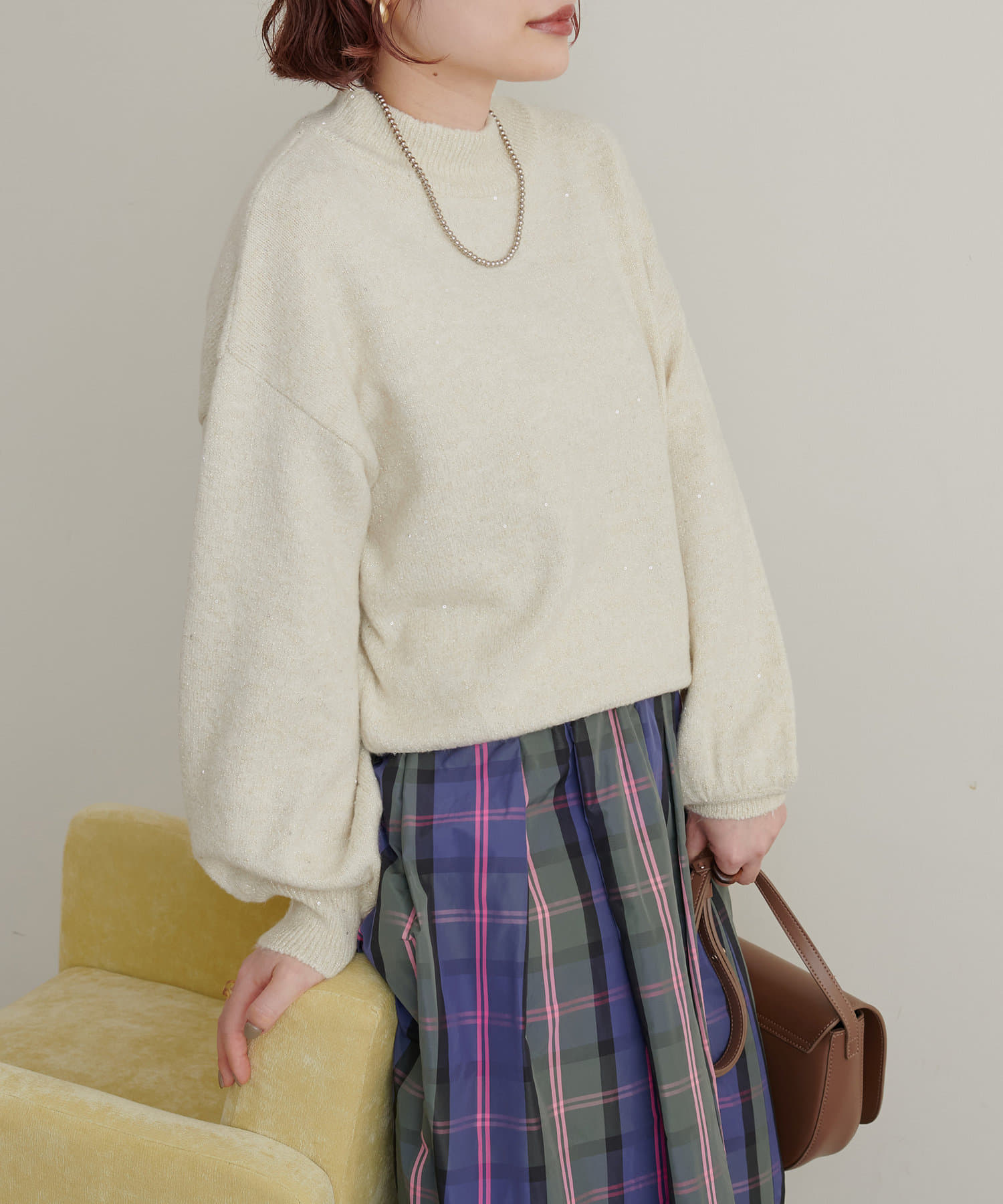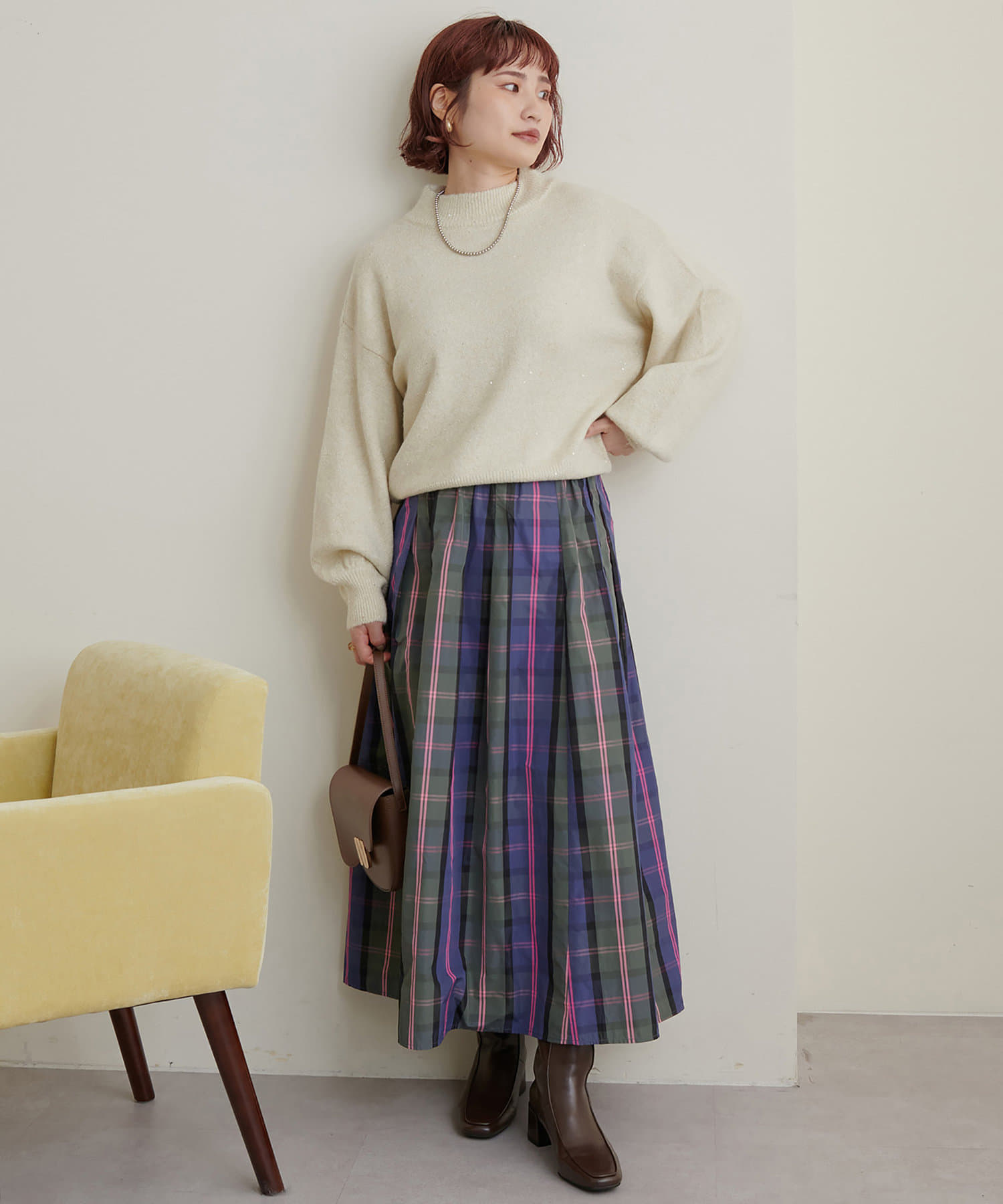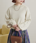 ニットですがボトムにインしてもかさばりづらい薄めの厚さなので、着太りして見えないのも嬉しいポイント。
