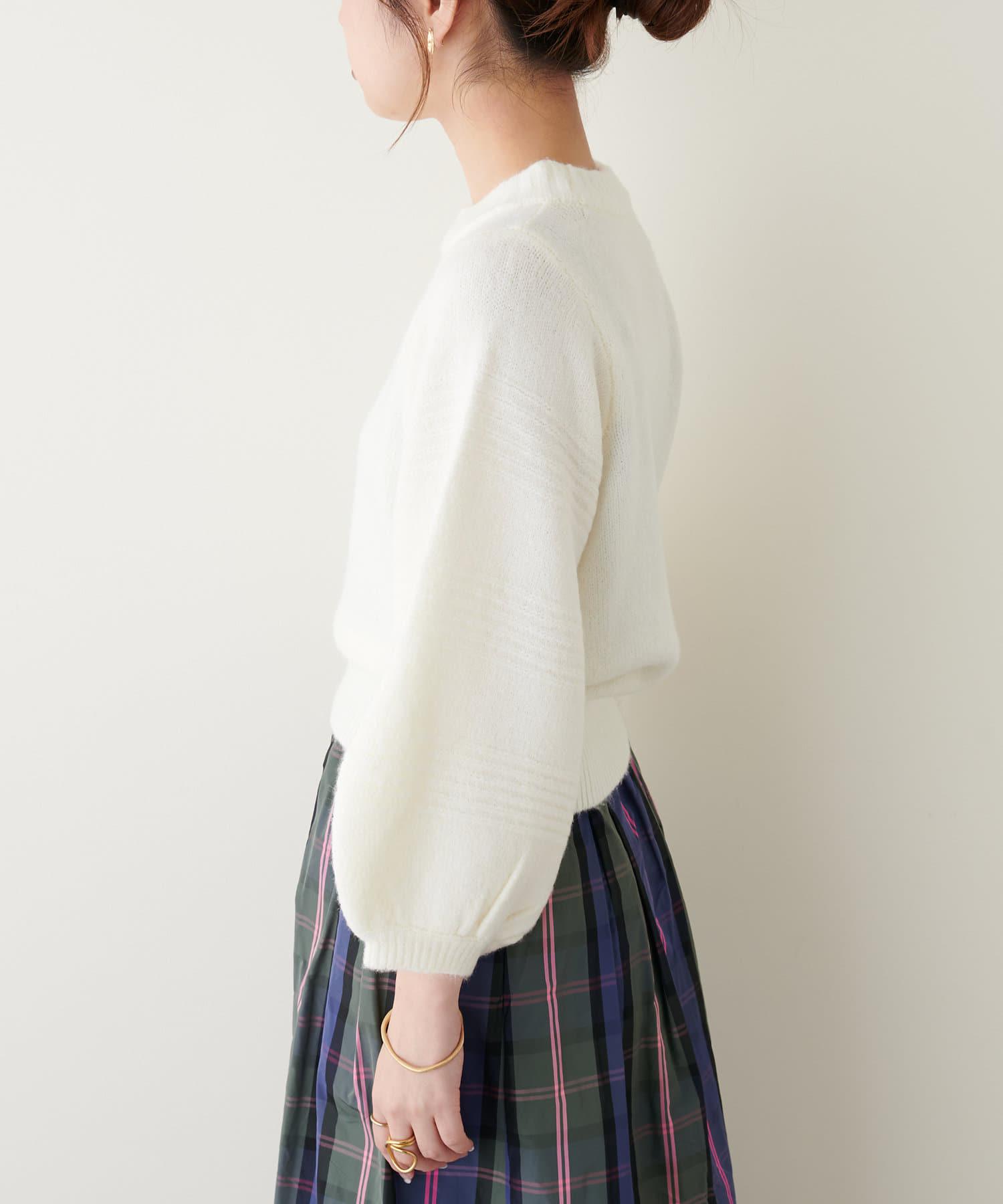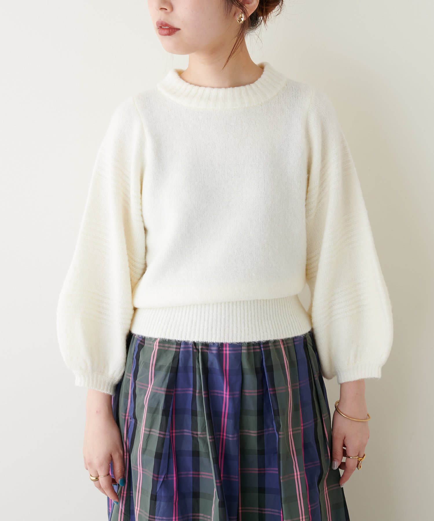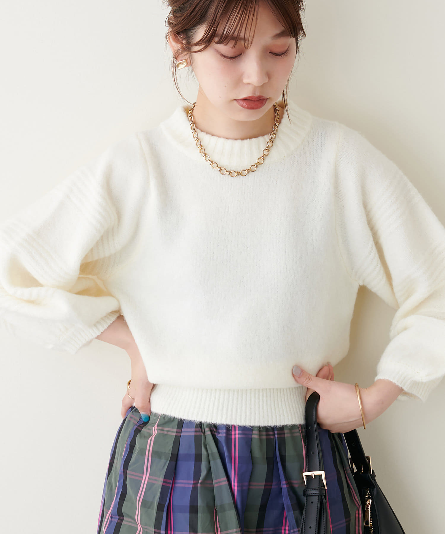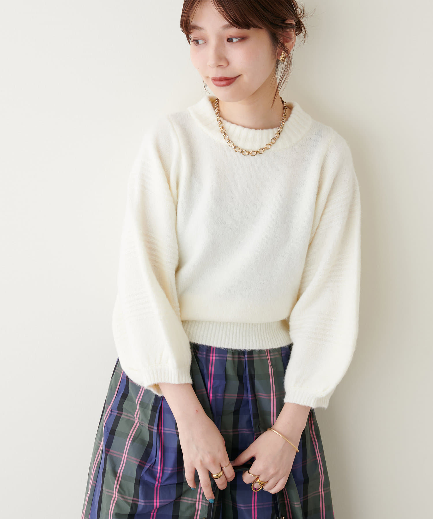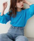 ショート丈ニットなので、ハイウエストのボトムと合わせるとスタイルアップ効果が期待できます。