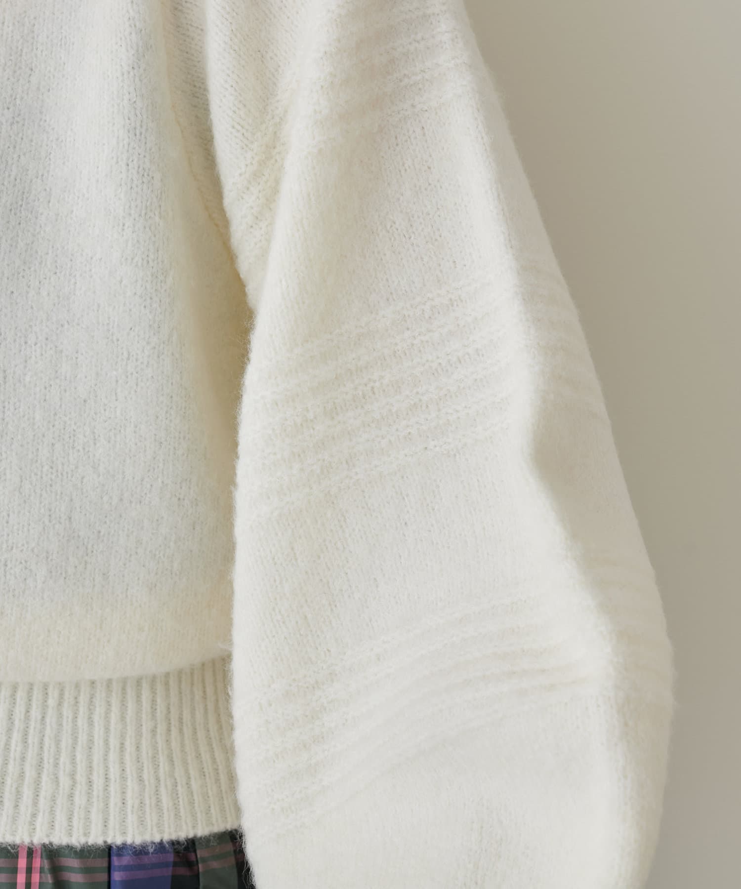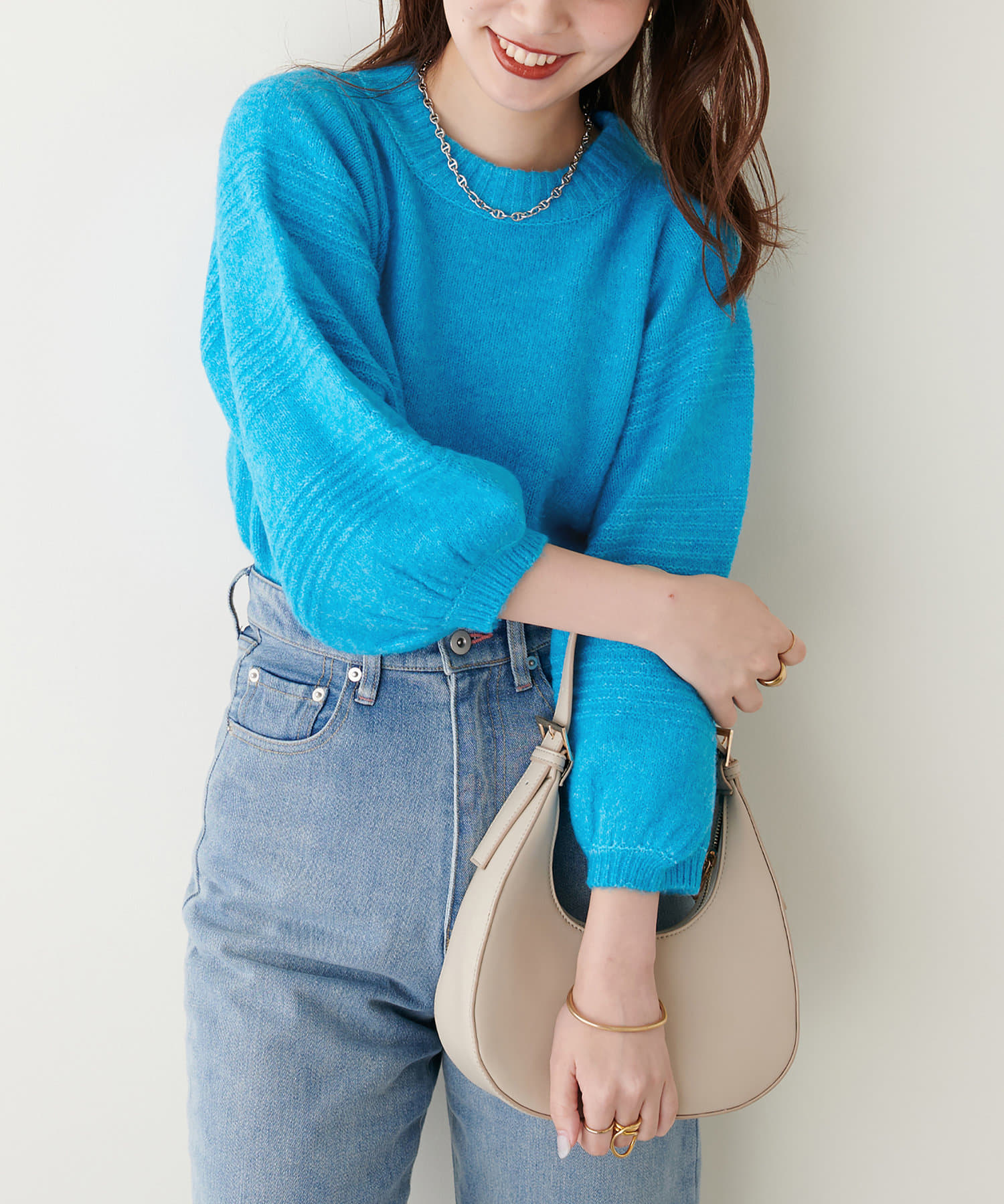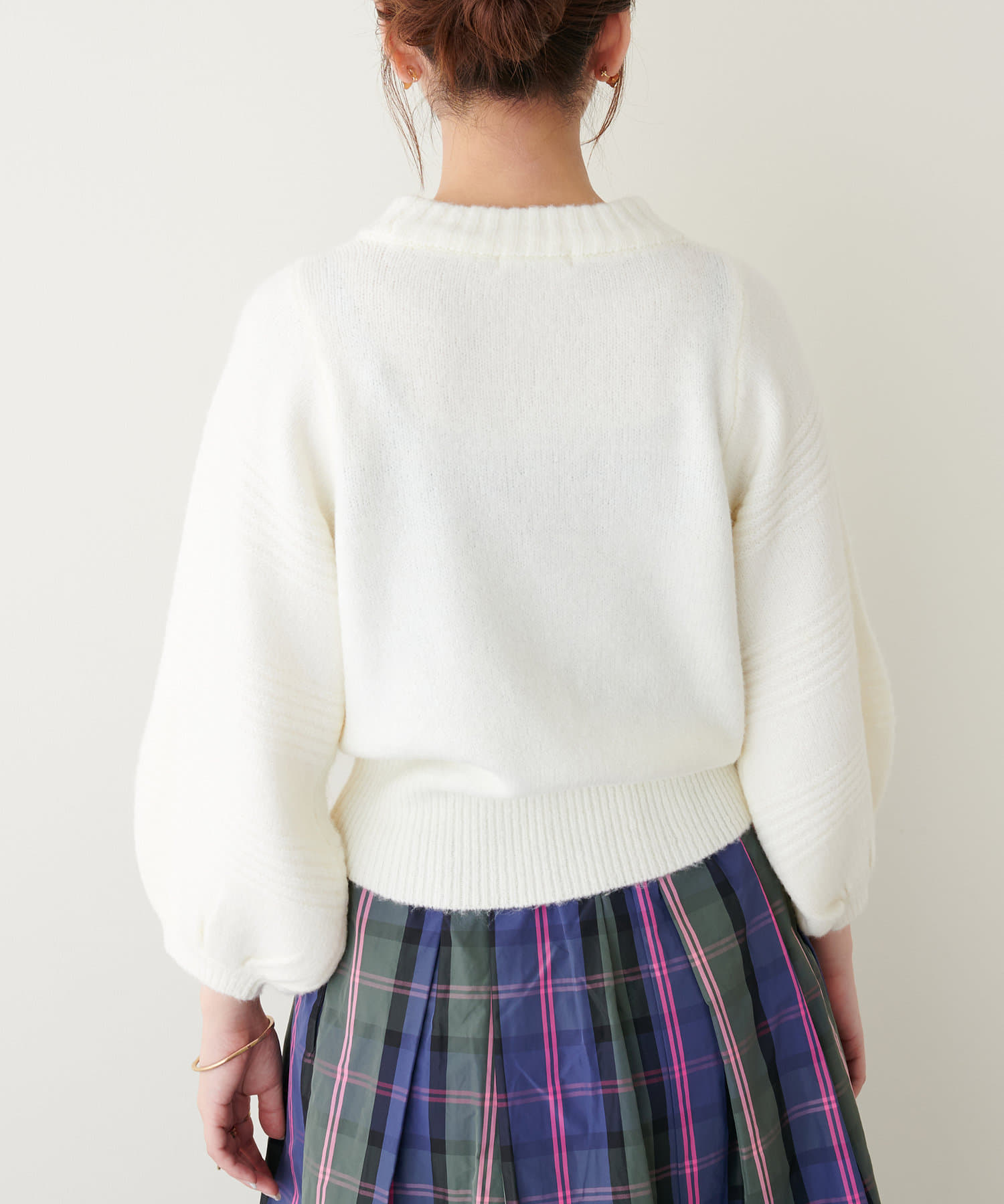 ショート丈ニットなので、ハイウエストのボトムと合わせるとスタイルアップ効果が期待できます。