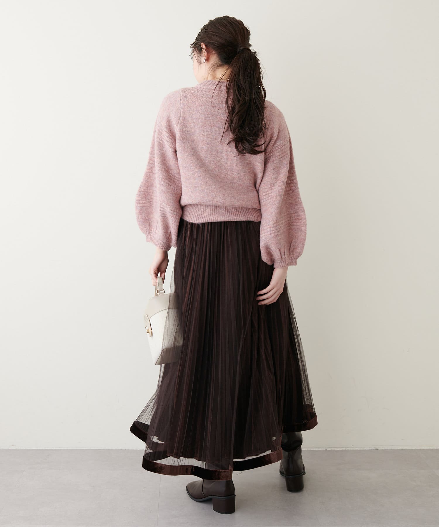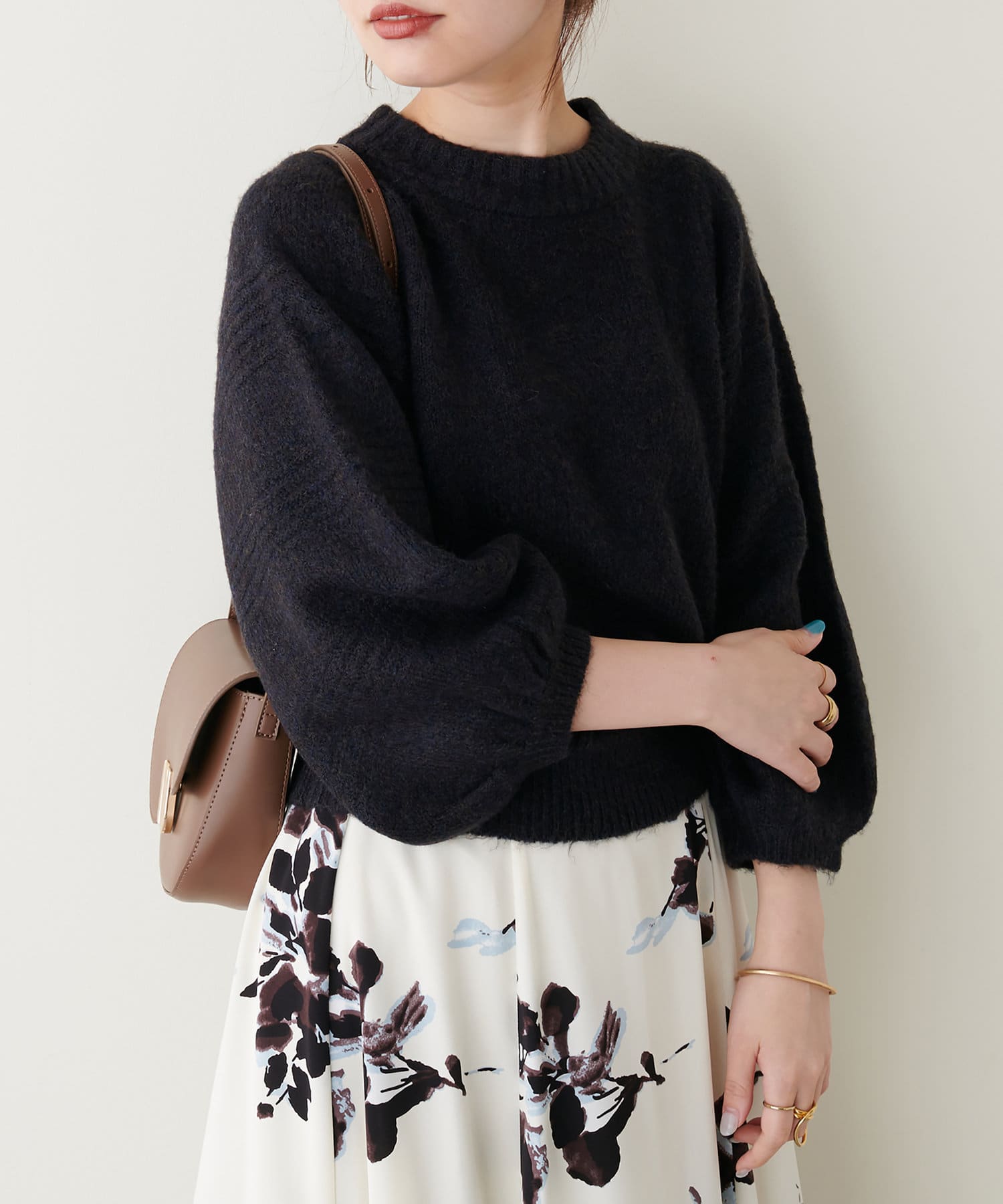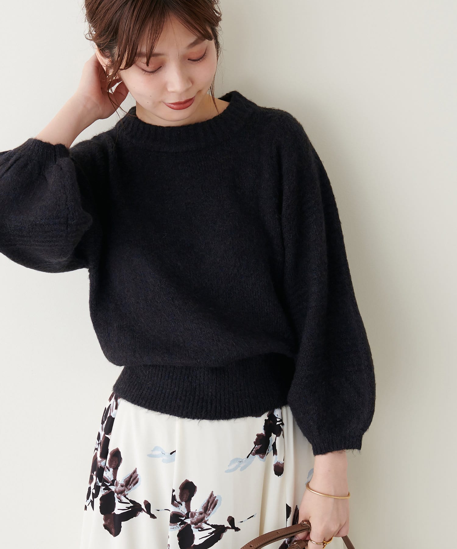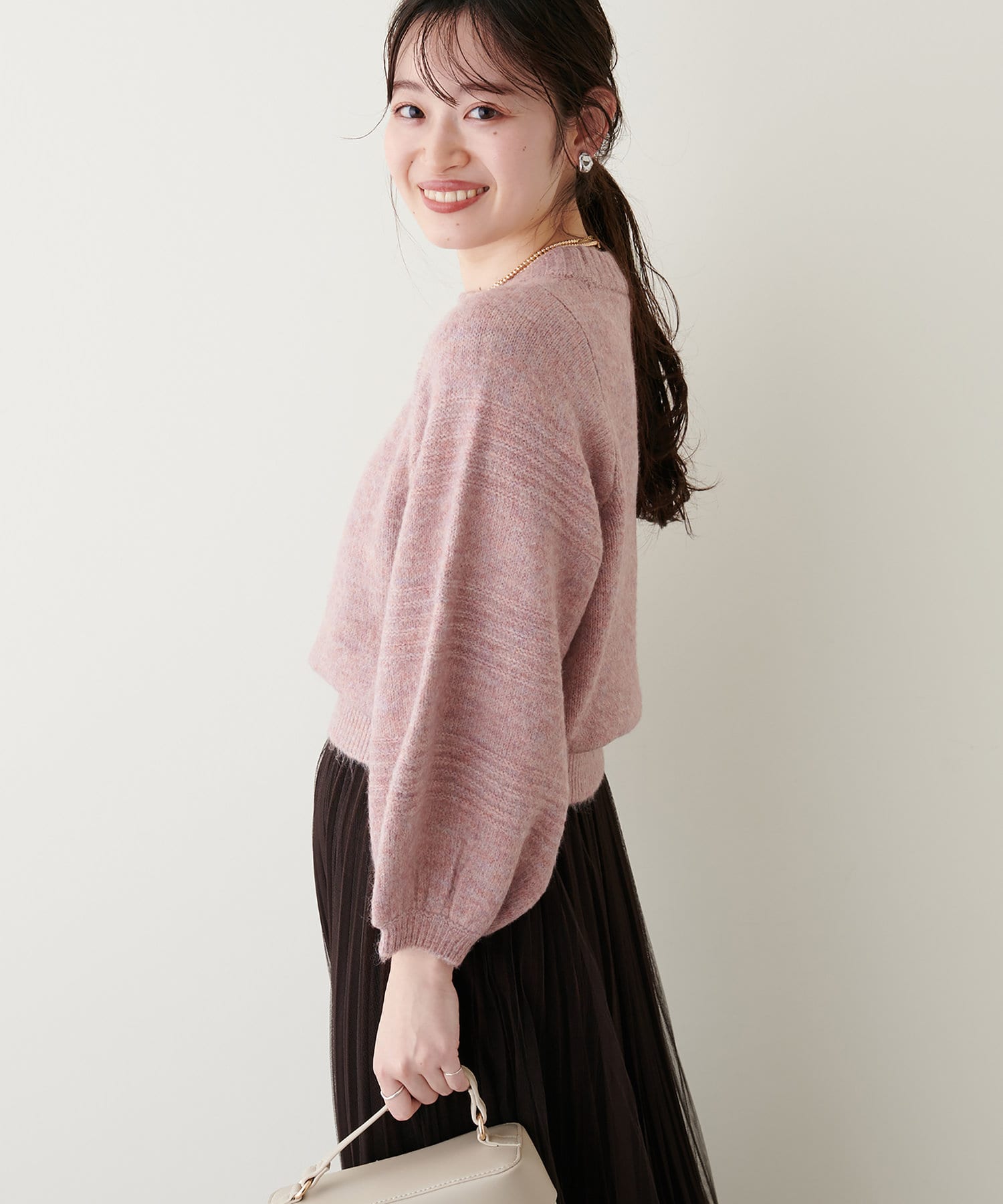 ショート丈ニットなので、ハイウエストのボトムと合わせるとスタイルアップ効果が期待できます。