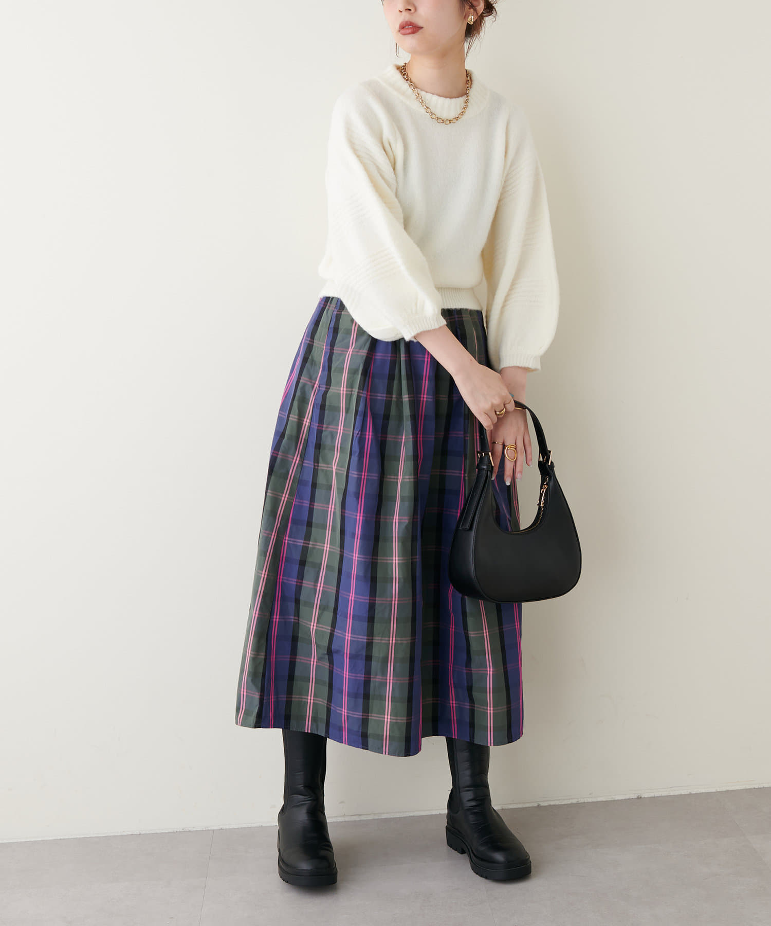 きれいめなアイテムとの相性が良く、タイトスカート、テーパードパンツなどすっきりとしたシルエットのアイテムと合わせると、より品のある印象になります。