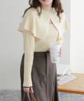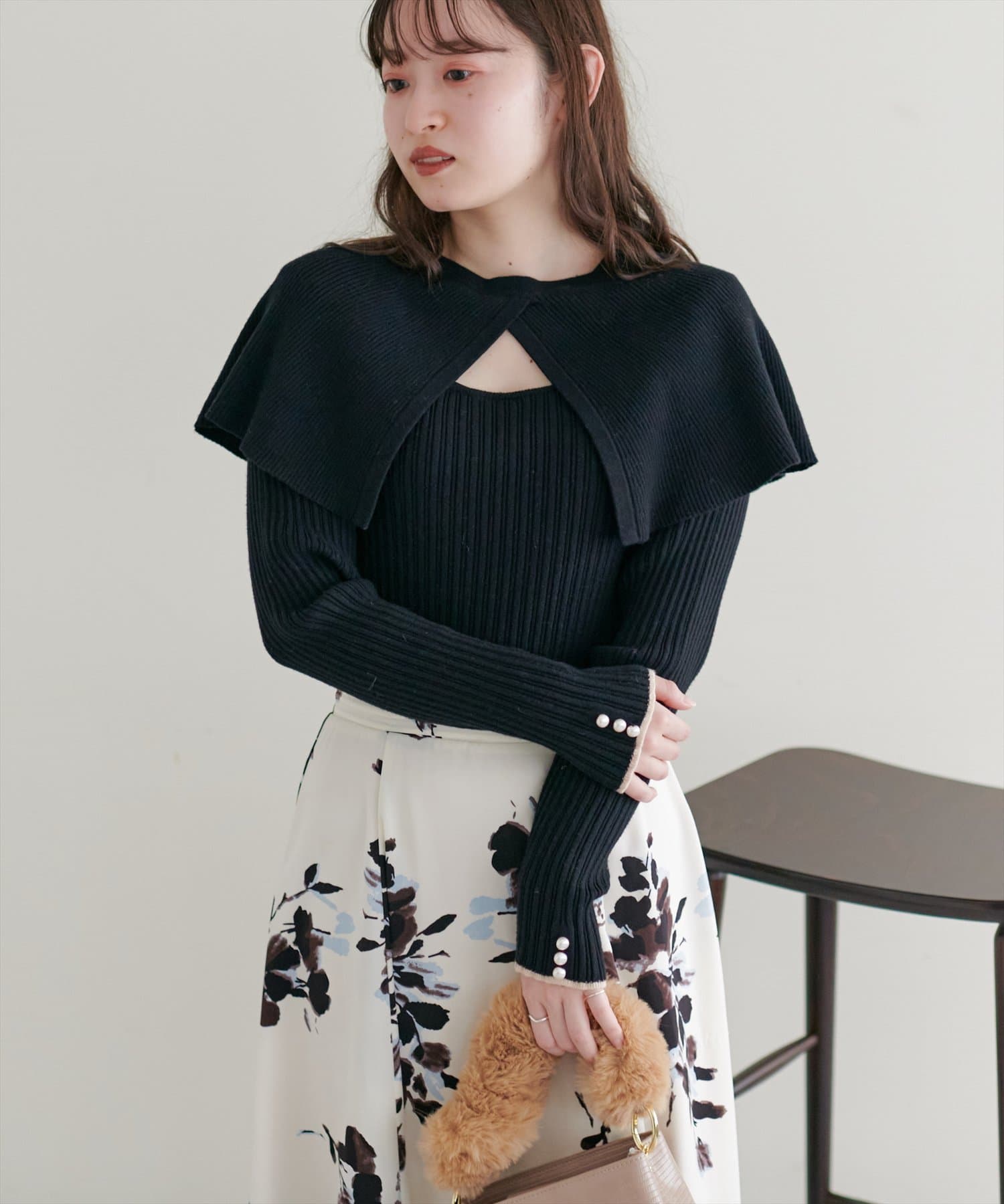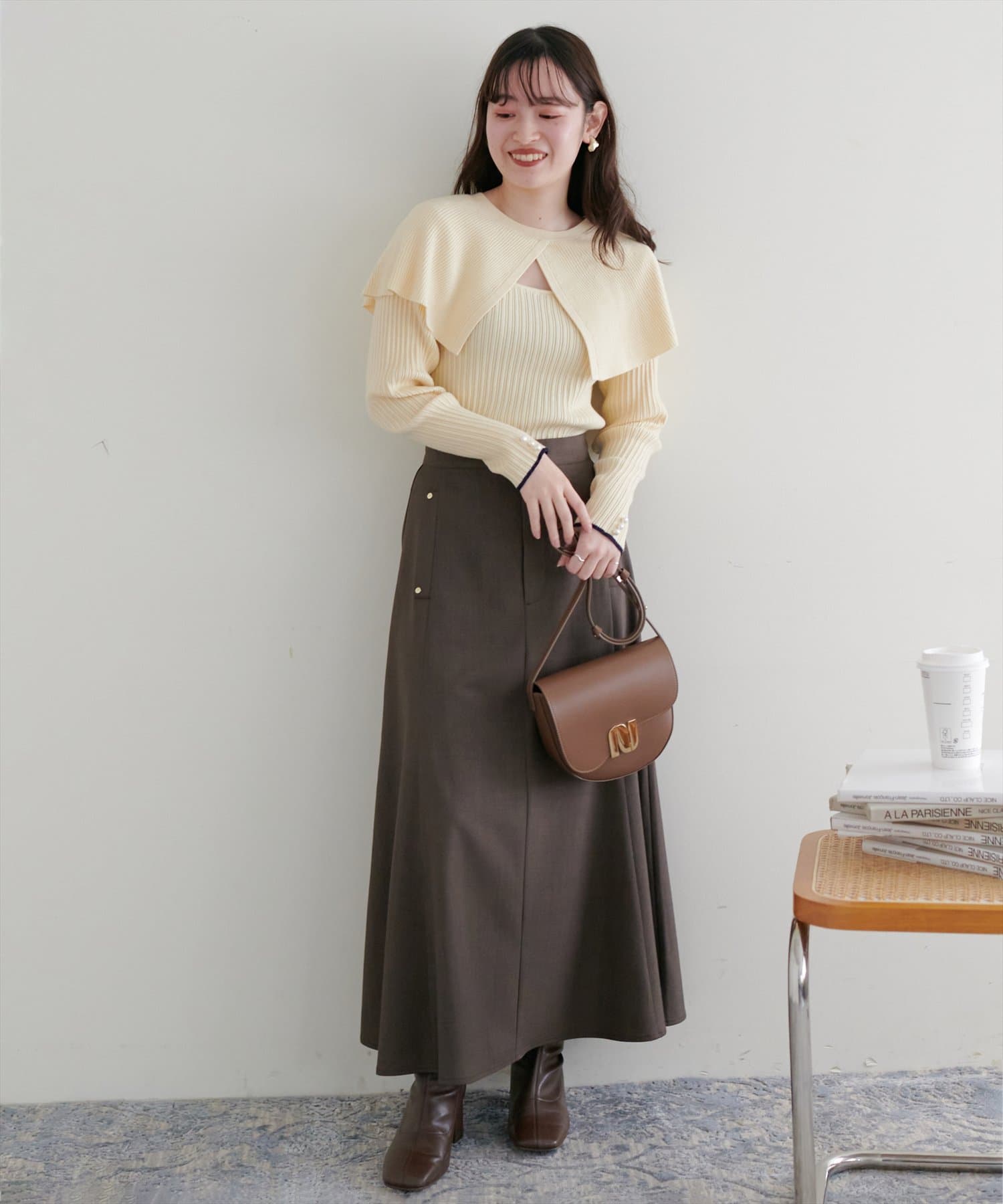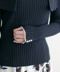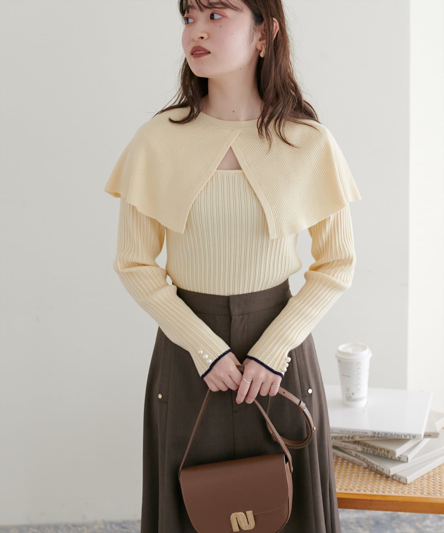 ニットの衿を重ねて着用することで女性らしい程よい肌見せに◎