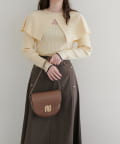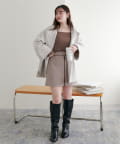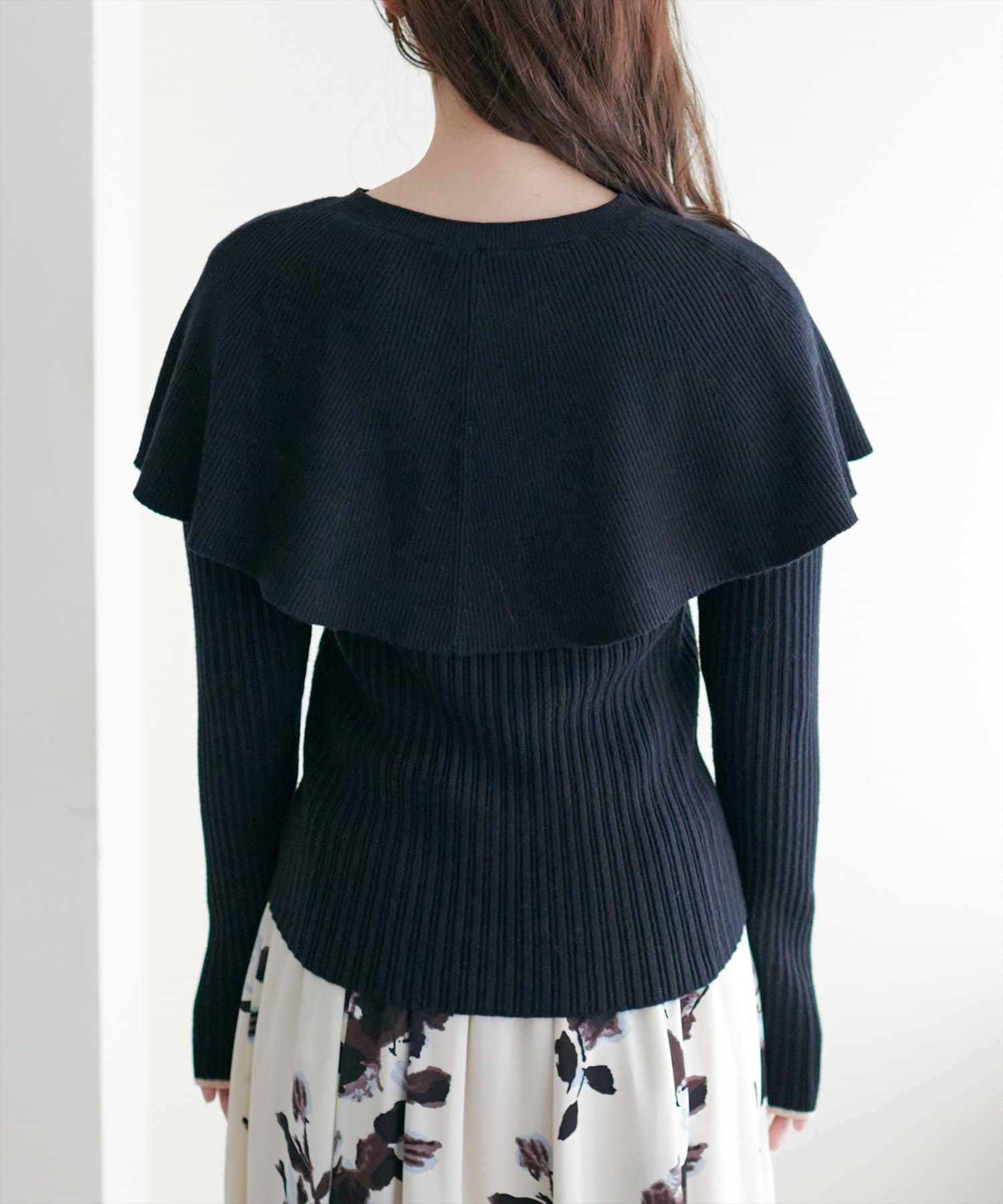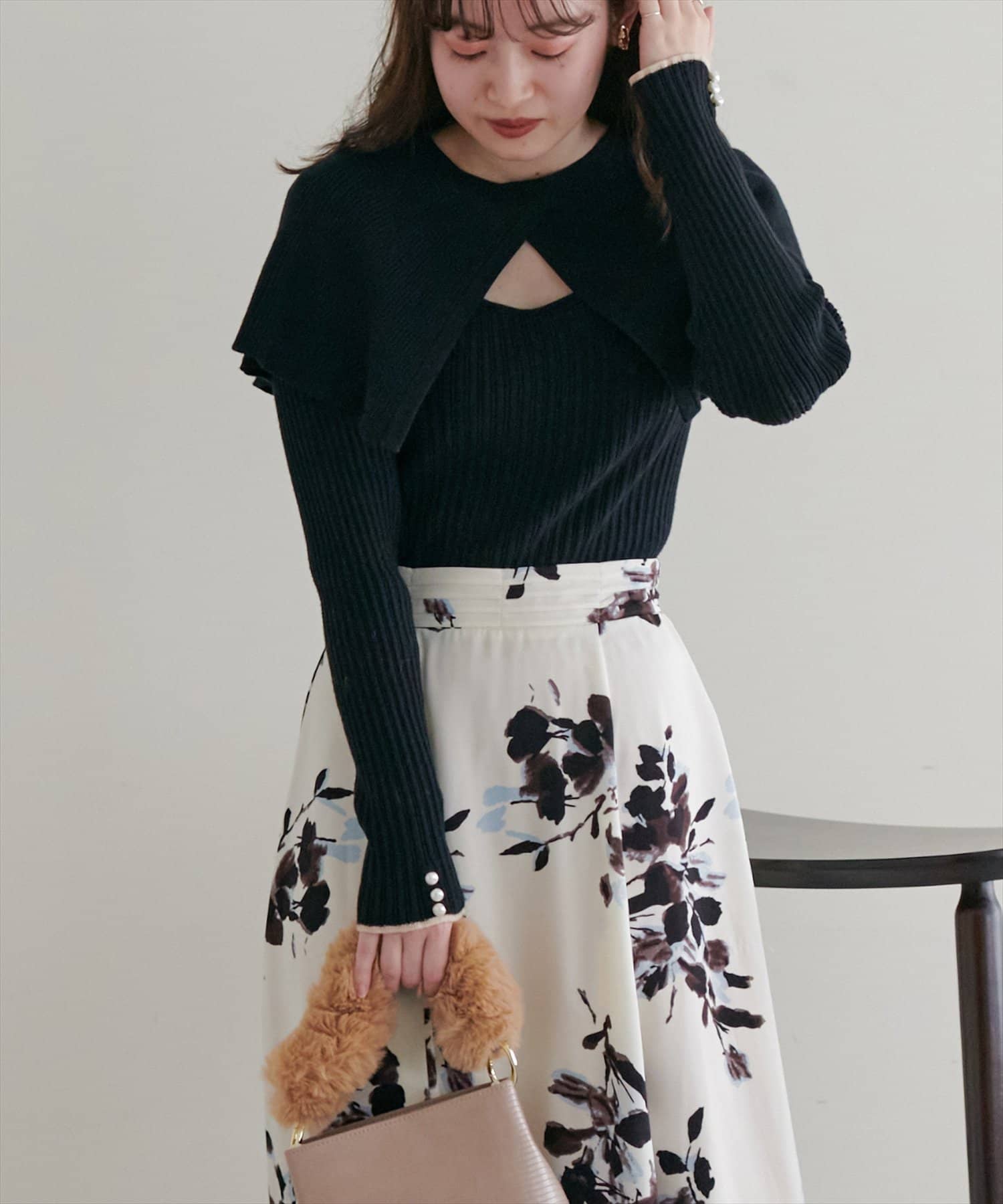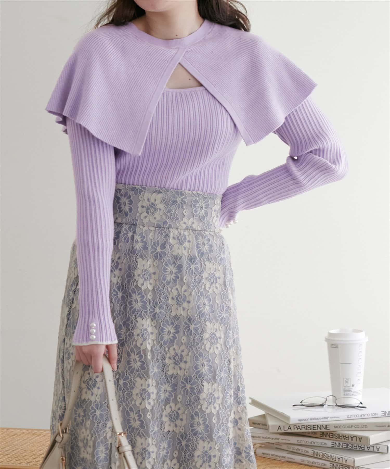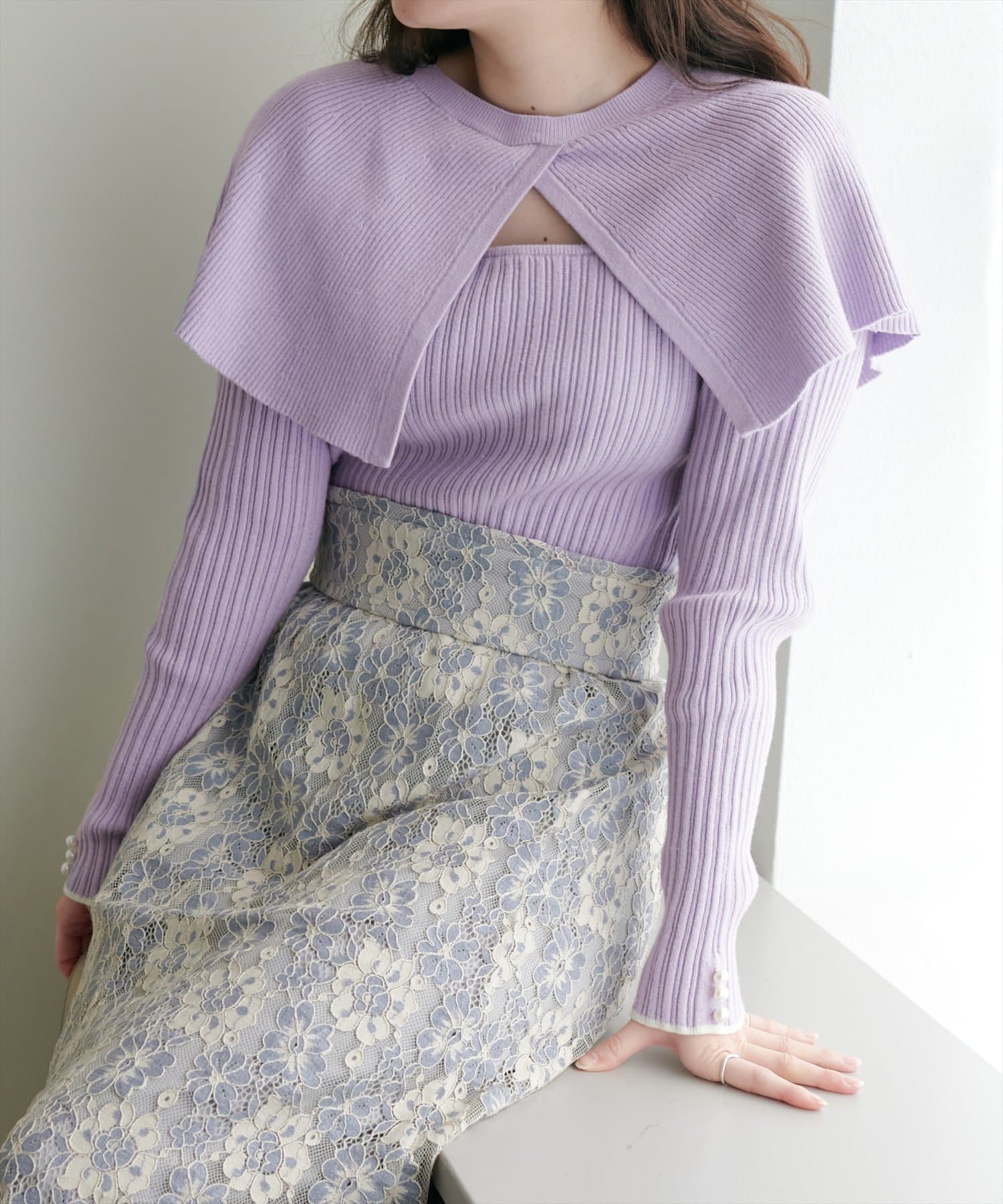 ニットの衿を重ねて着用することで女性らしい程よい肌見せに◎