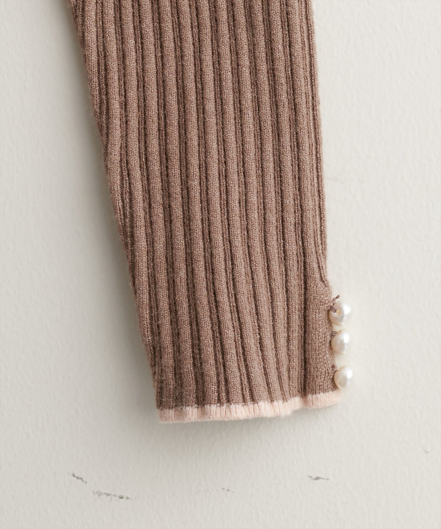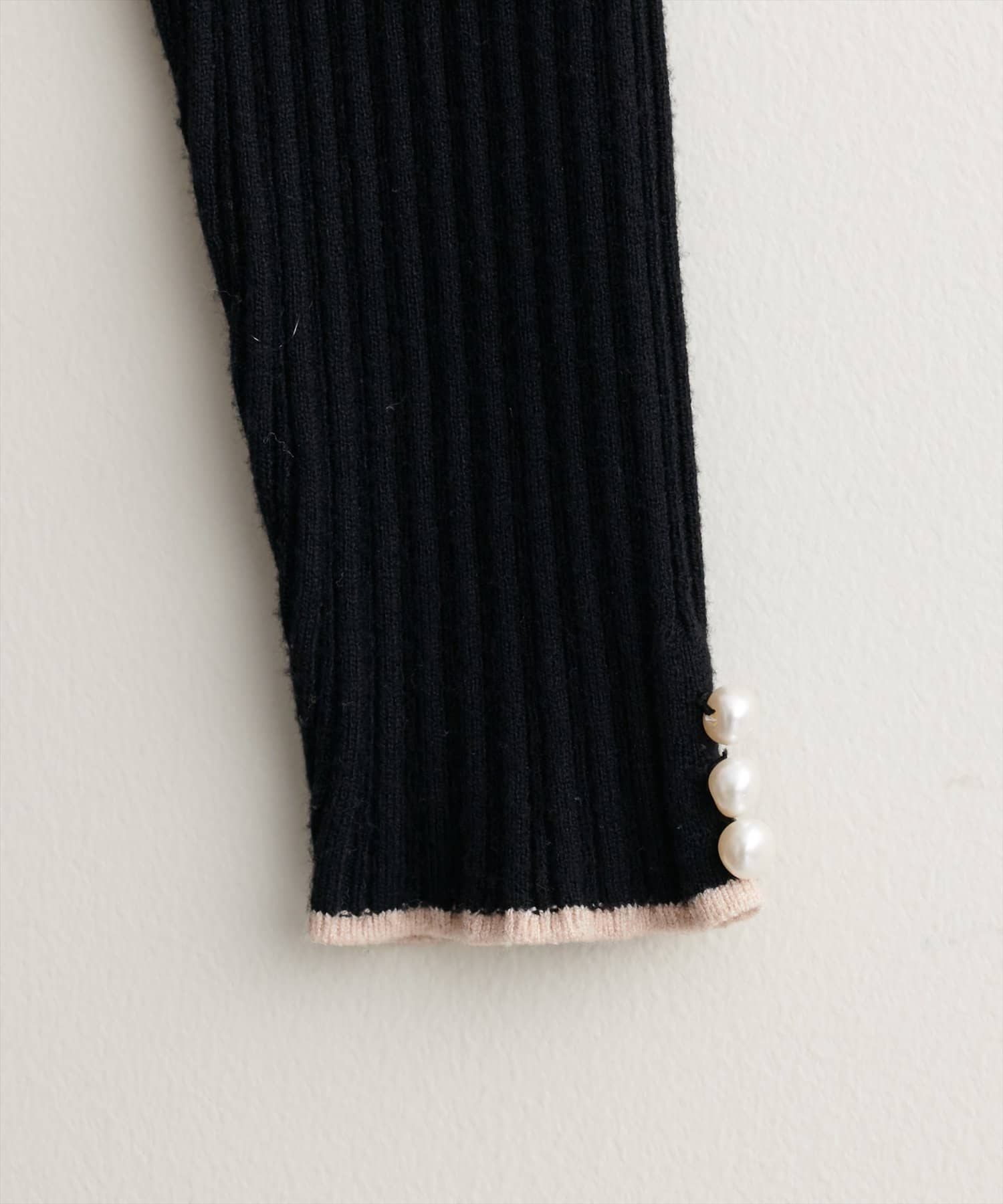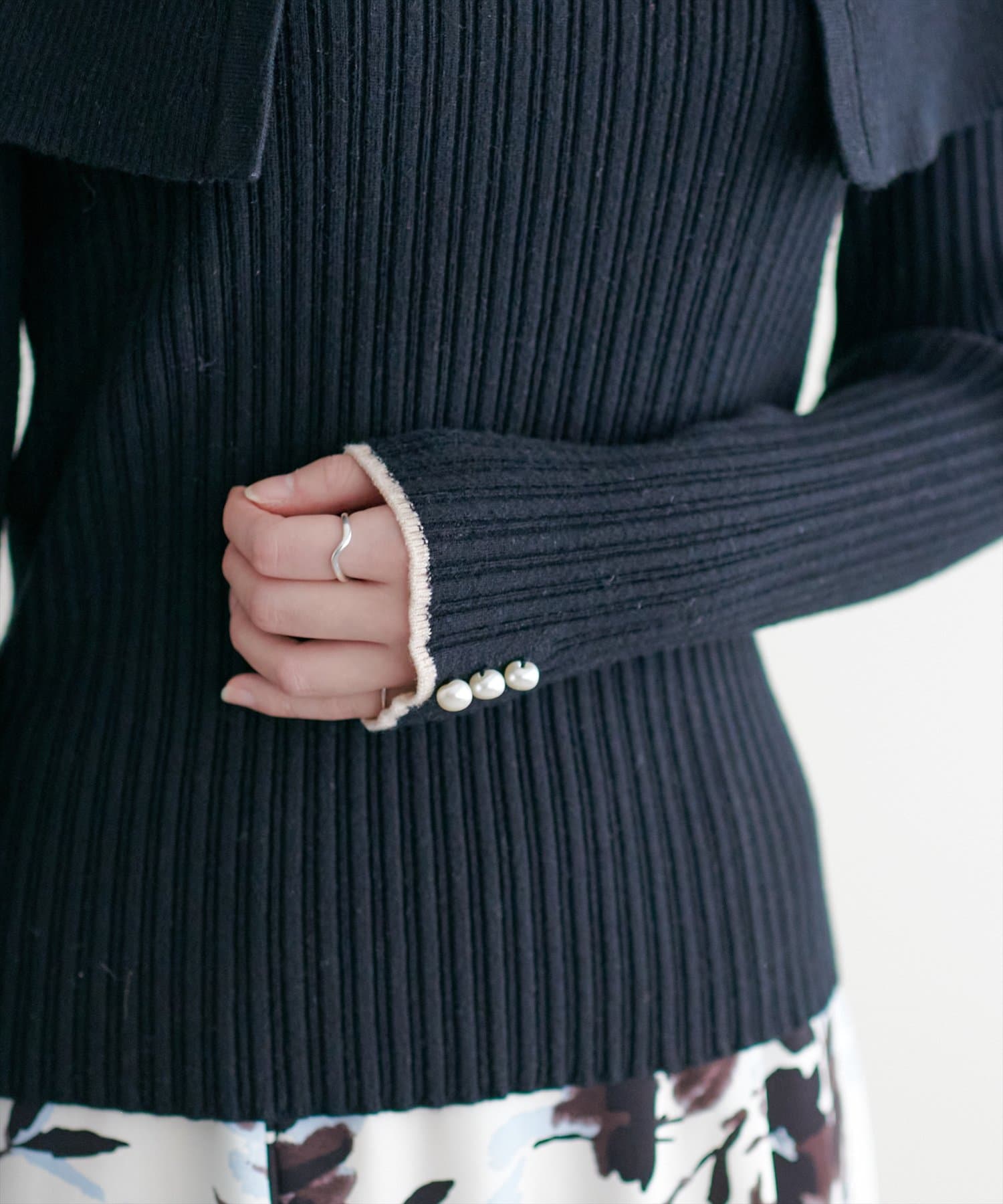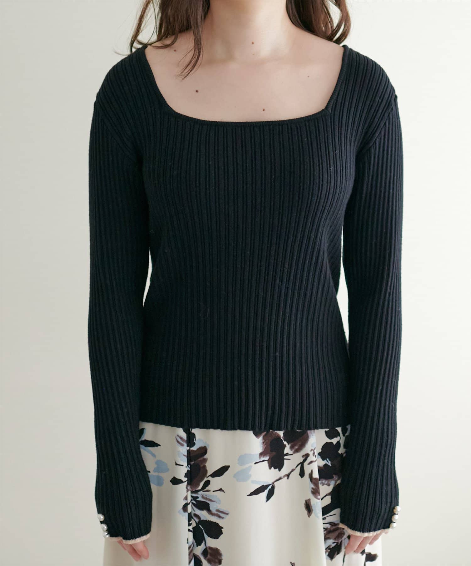 襟なしでも着用できるニットです。襟なしだとスクエアネックになっていて袖口のパールが可愛いです。
