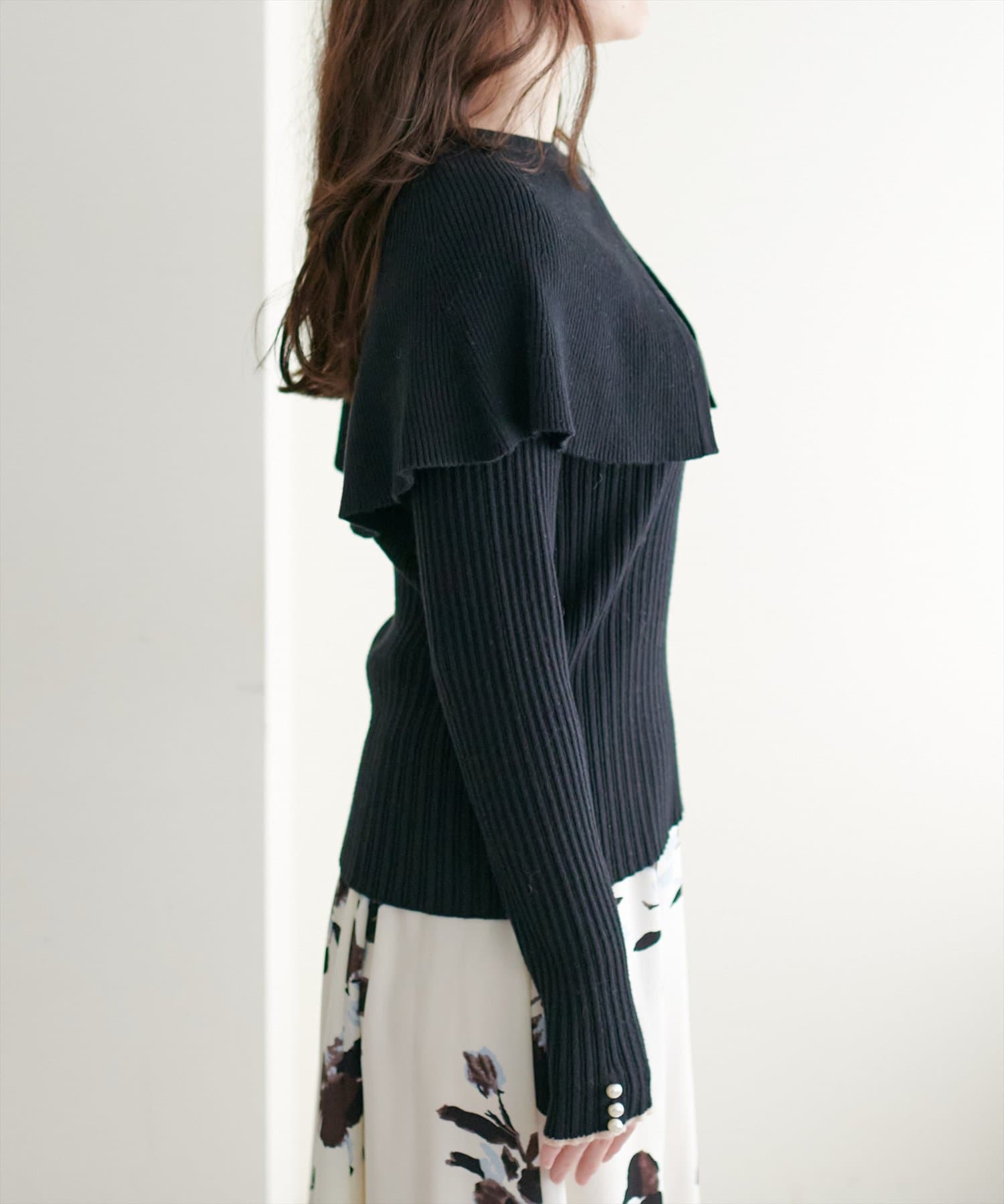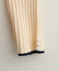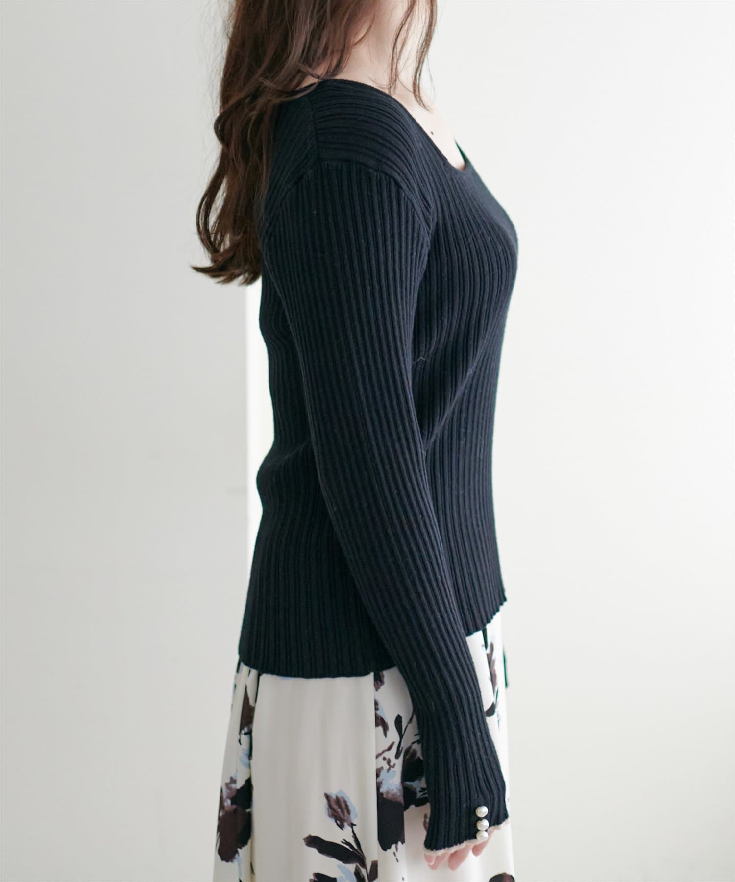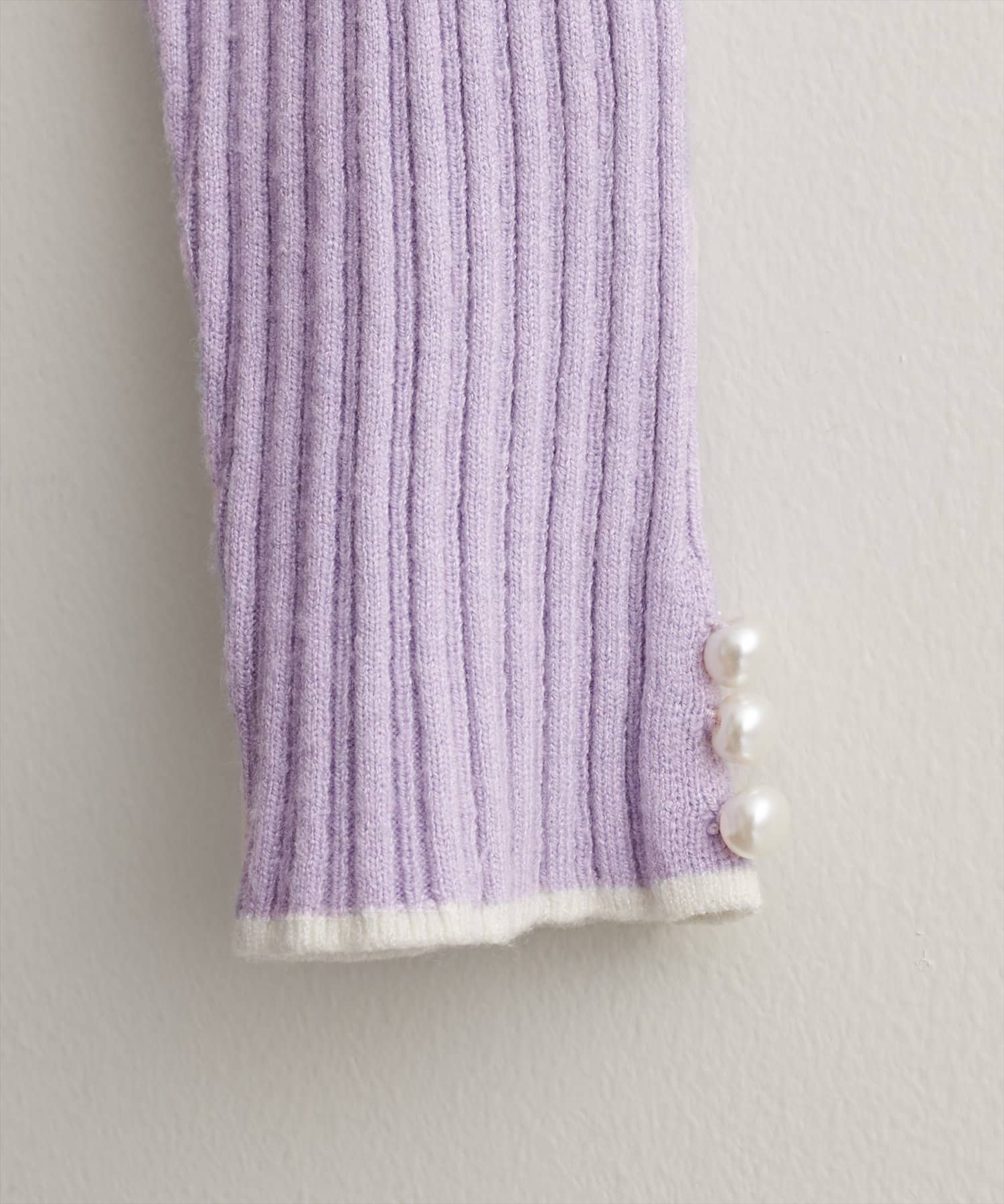 襟なしでも着用できるニットです。襟なしだとスクエアネックになっていて袖口のパールが可愛いです。