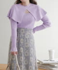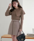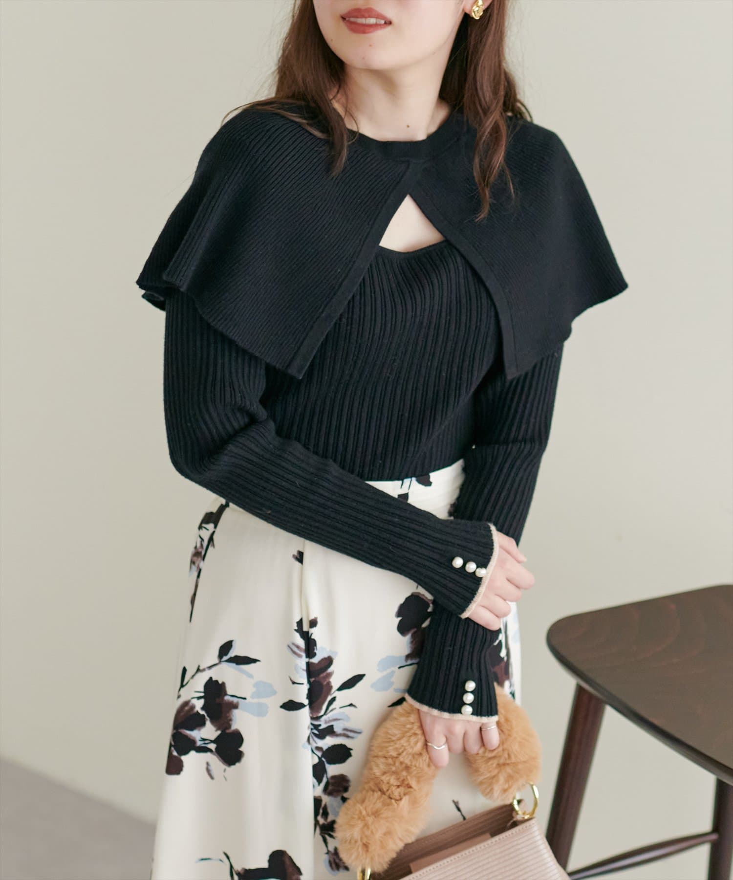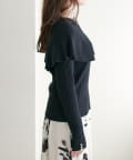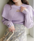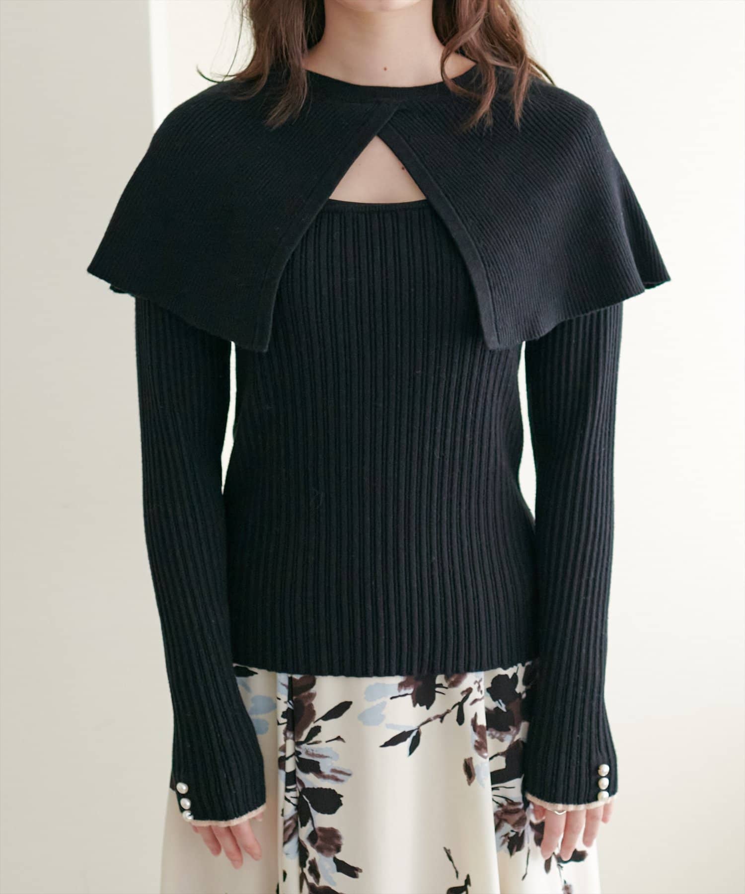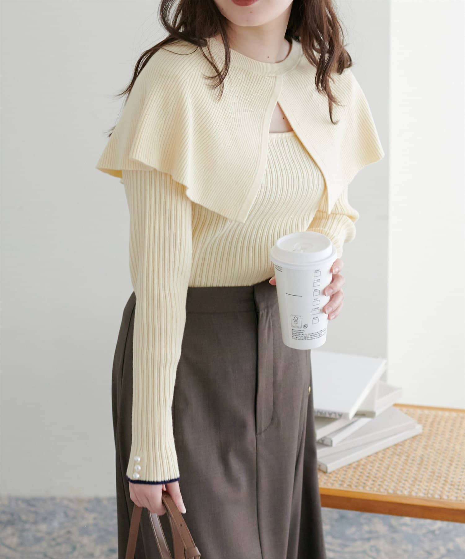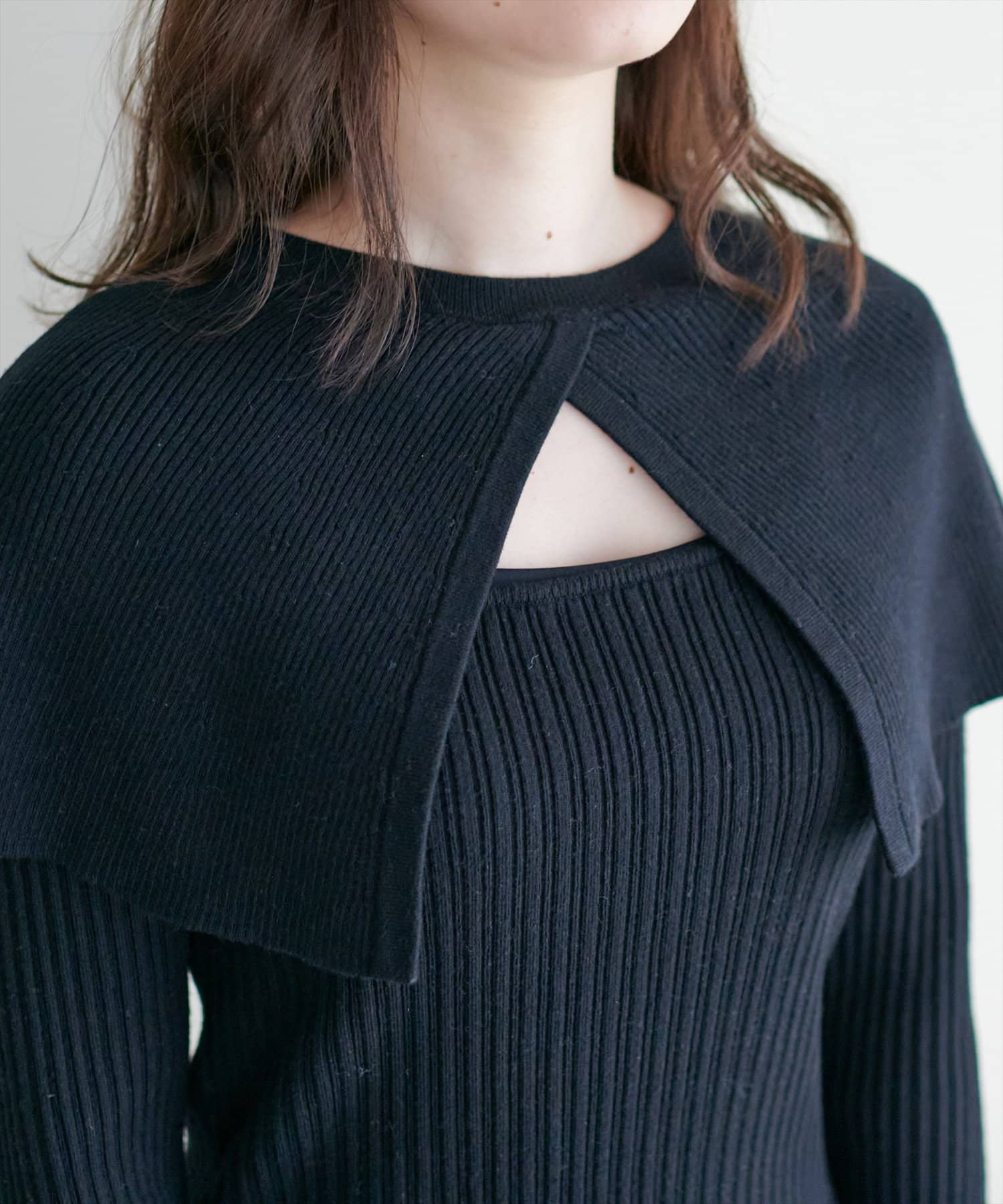 シンプルなスクエアネックのニットにニットの衿をレイヤードした万能セットアイテム。