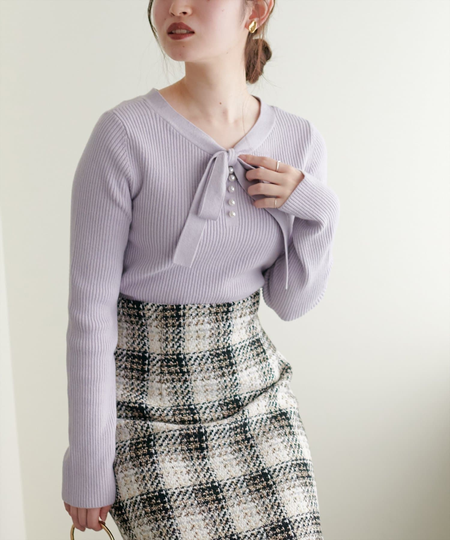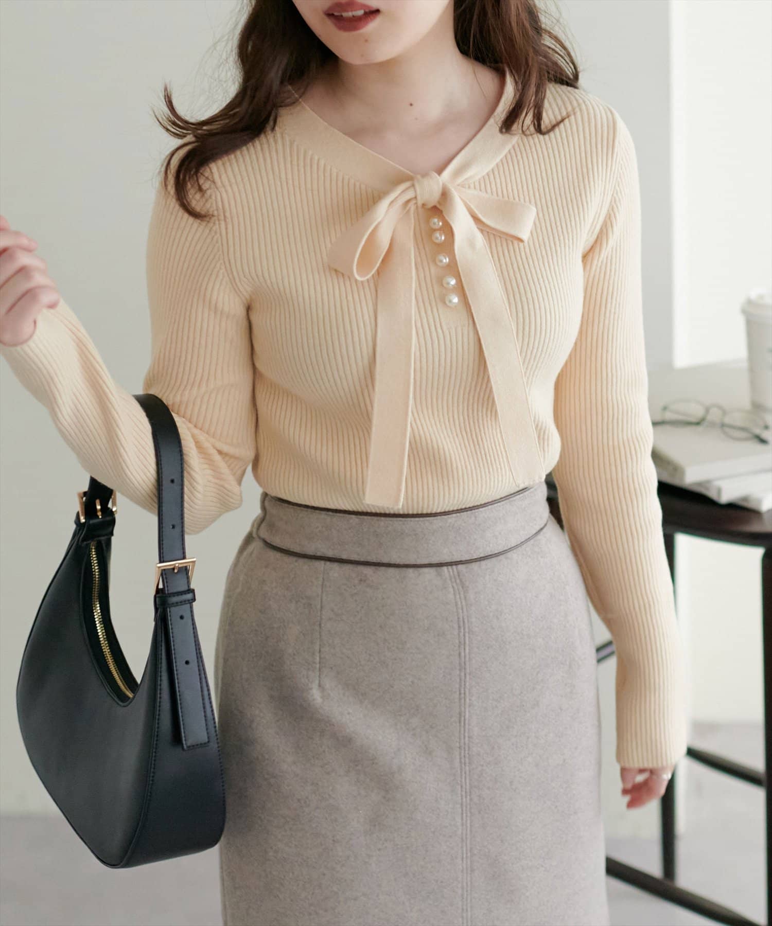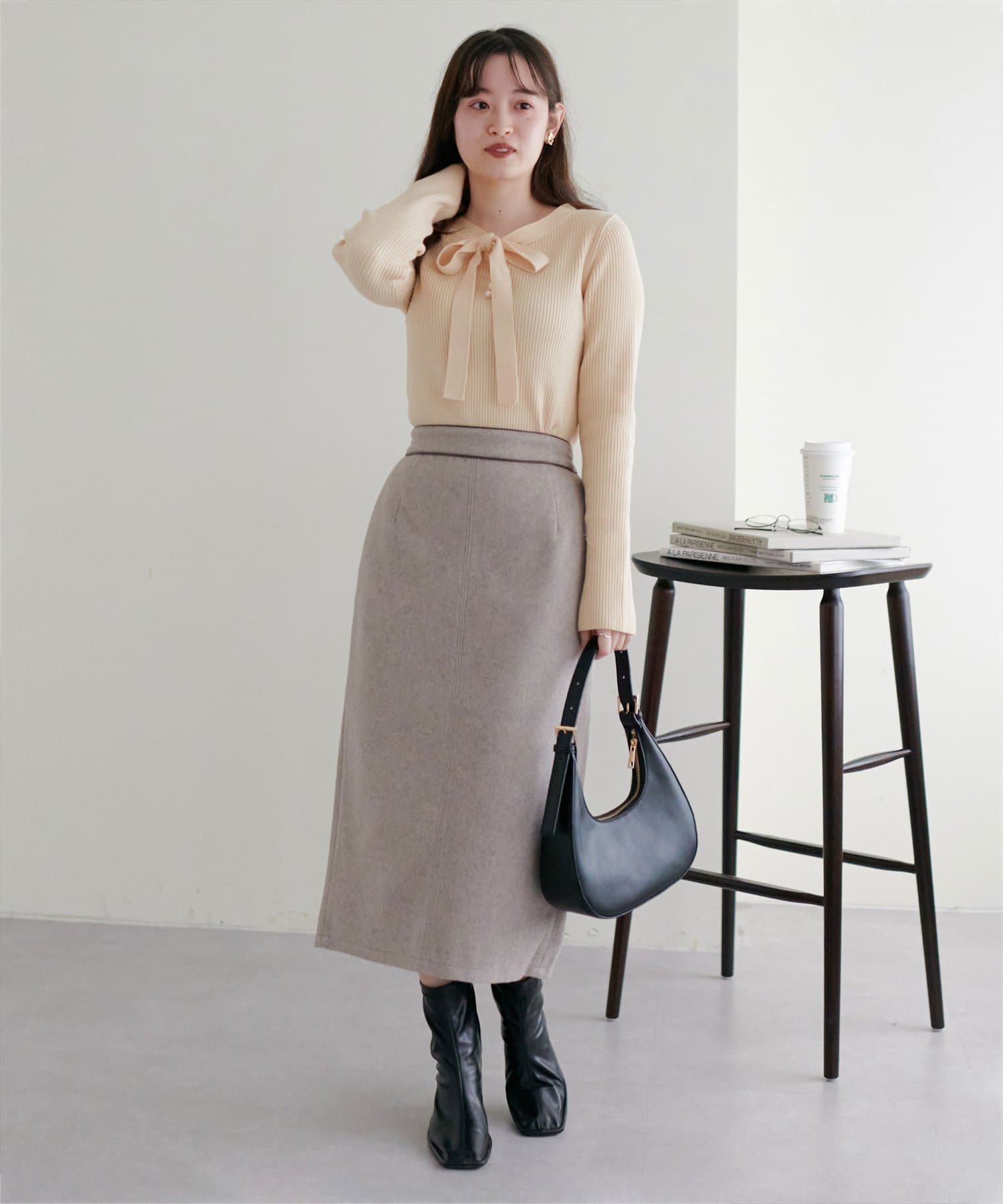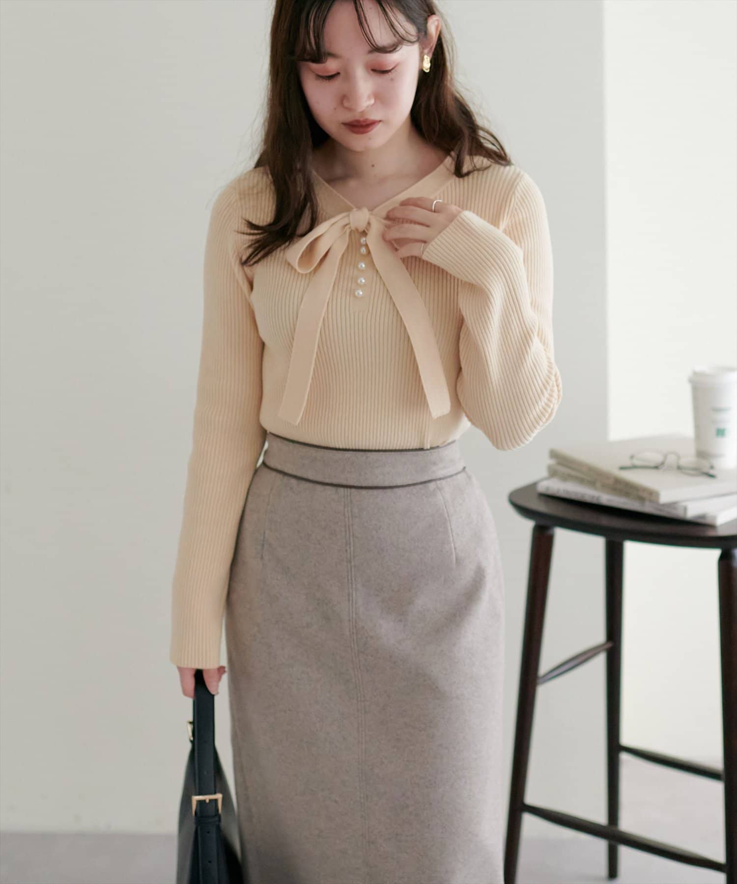 ボータイを前に着てタイトスカートやレーススカートと合わせたお仕事コーデにも、