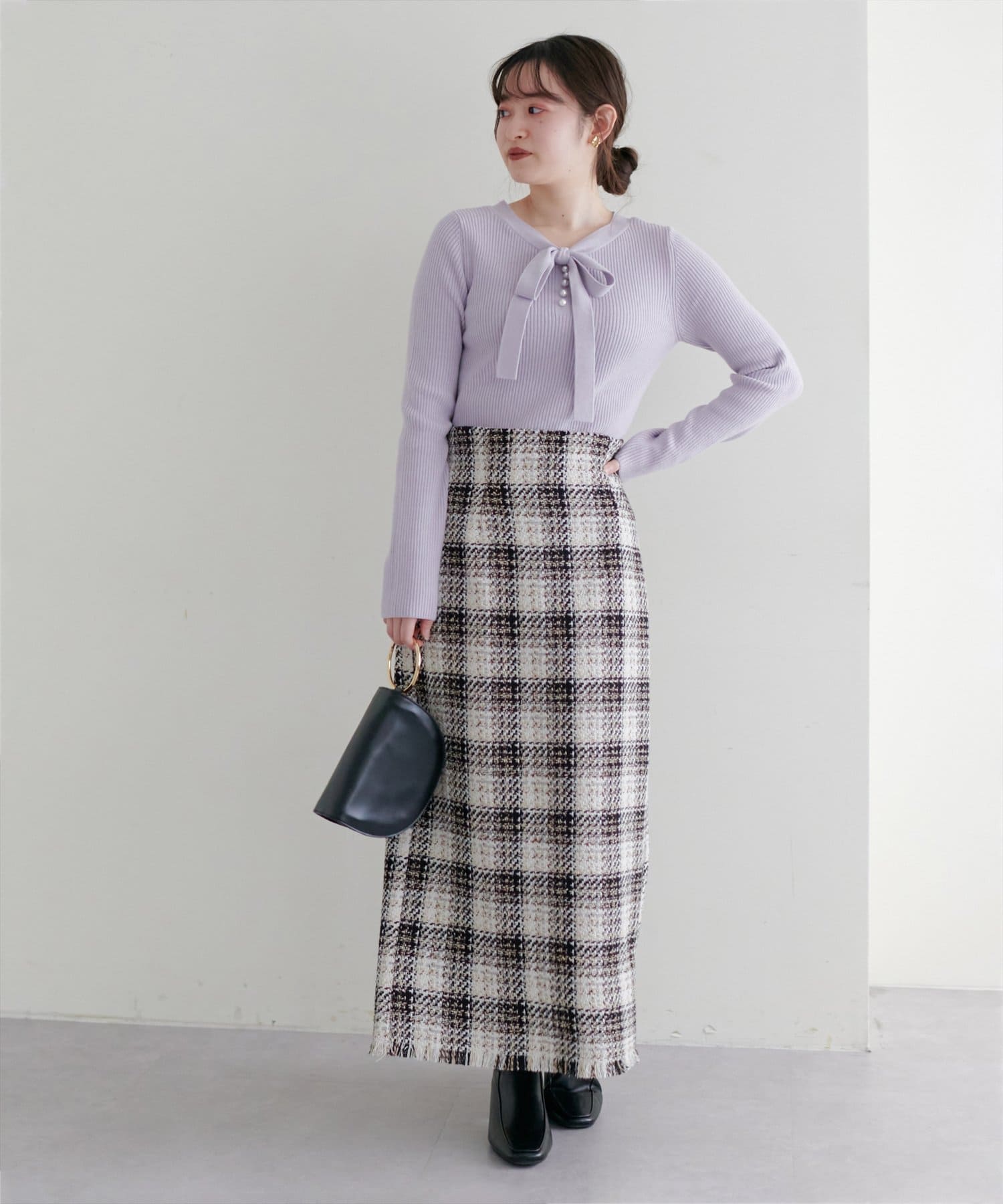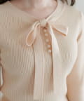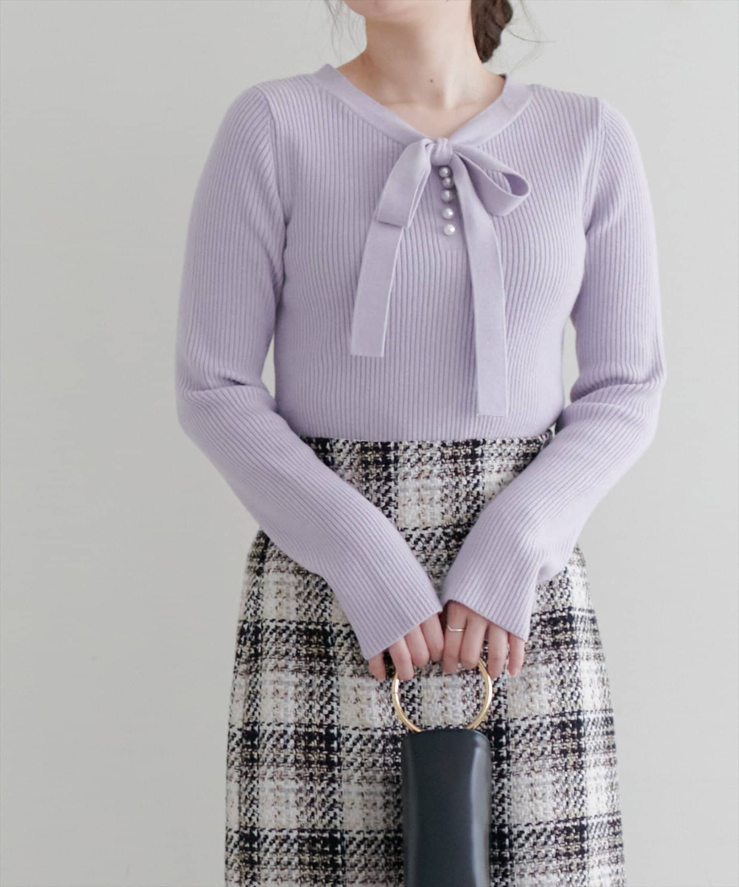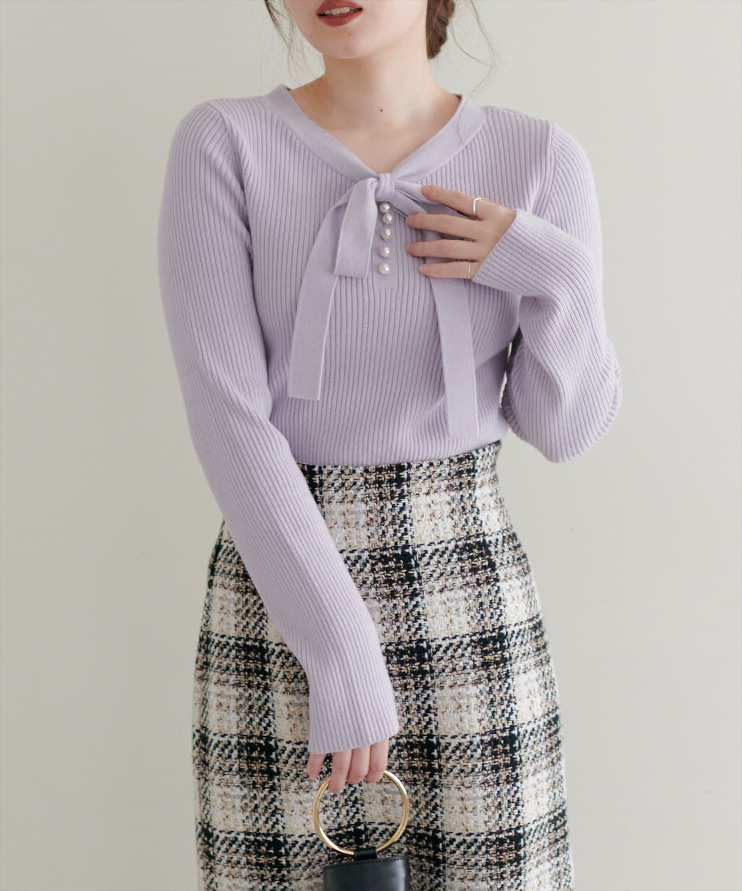 ボータイを前に着てタイトスカートやレーススカートと合わせたお仕事コーデにも、