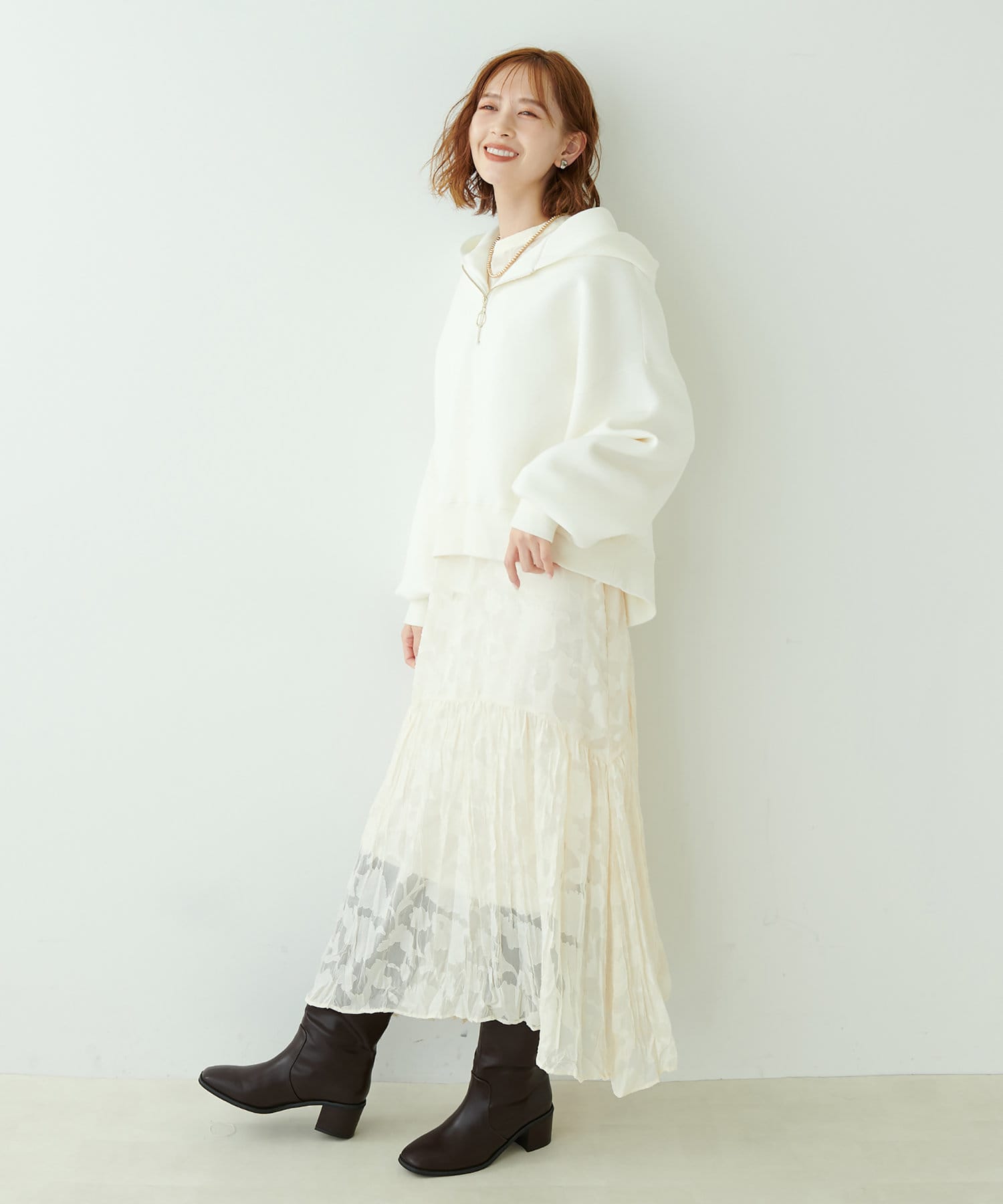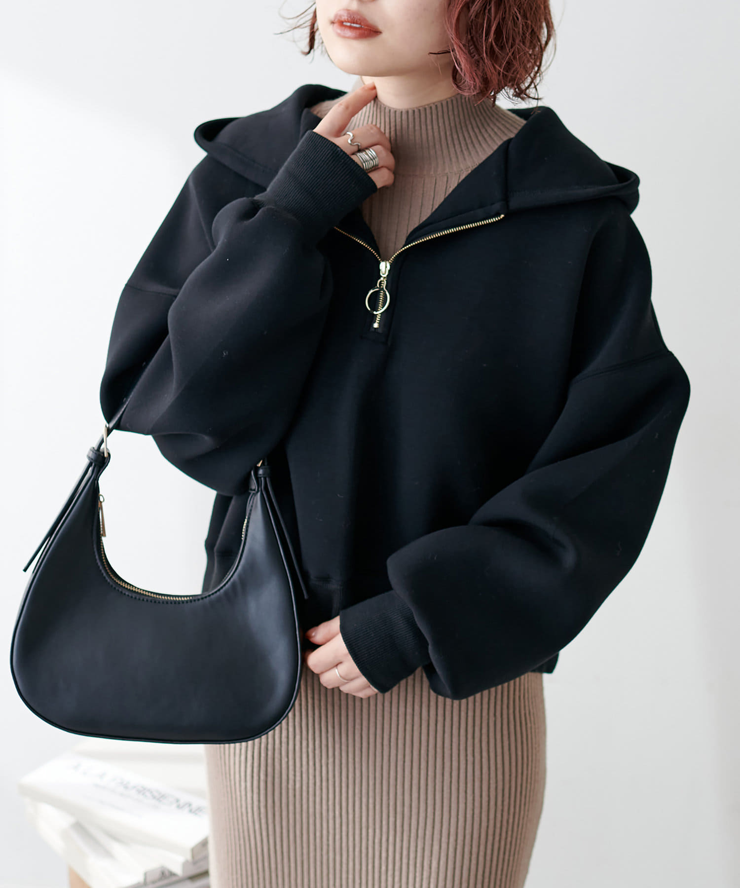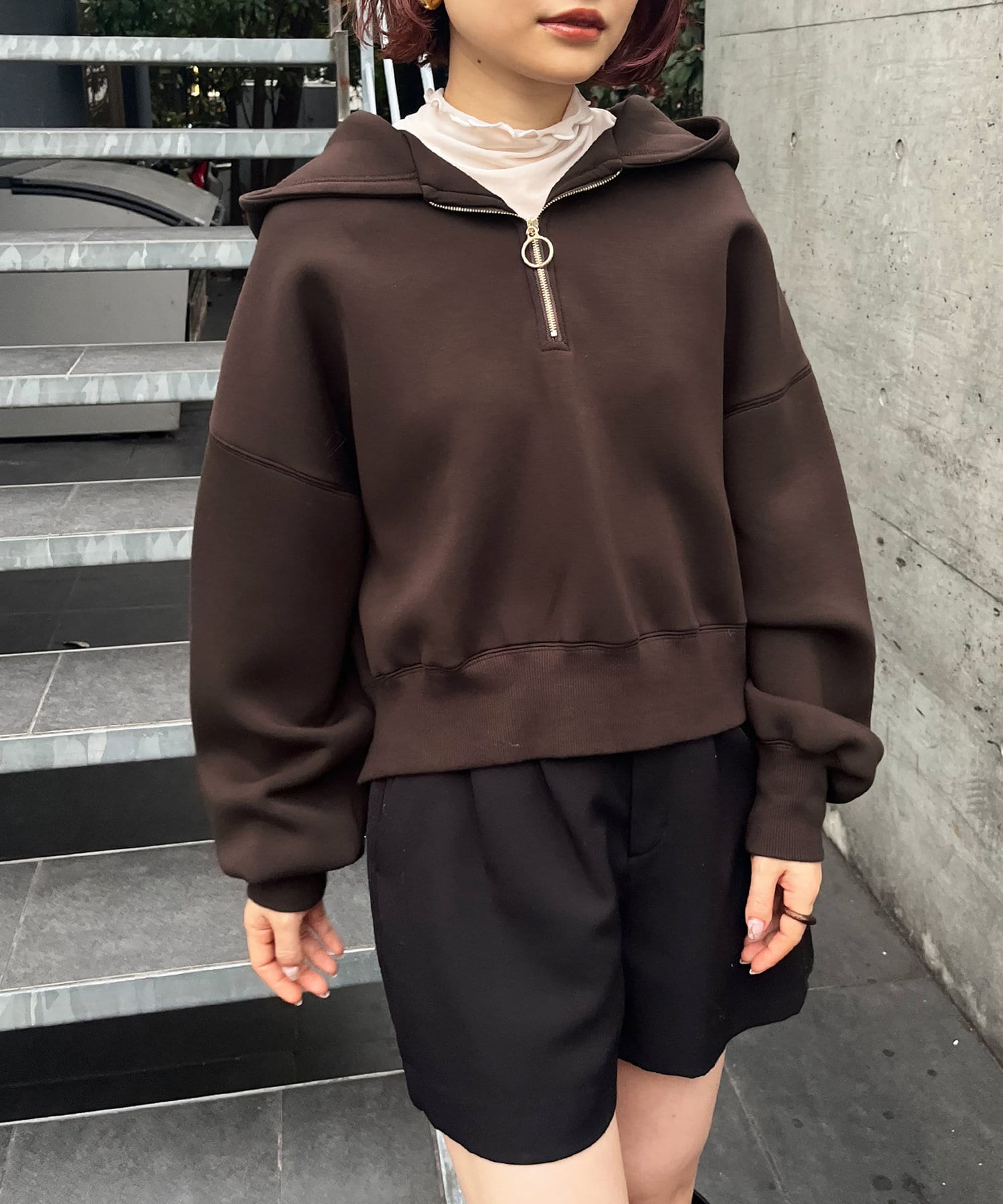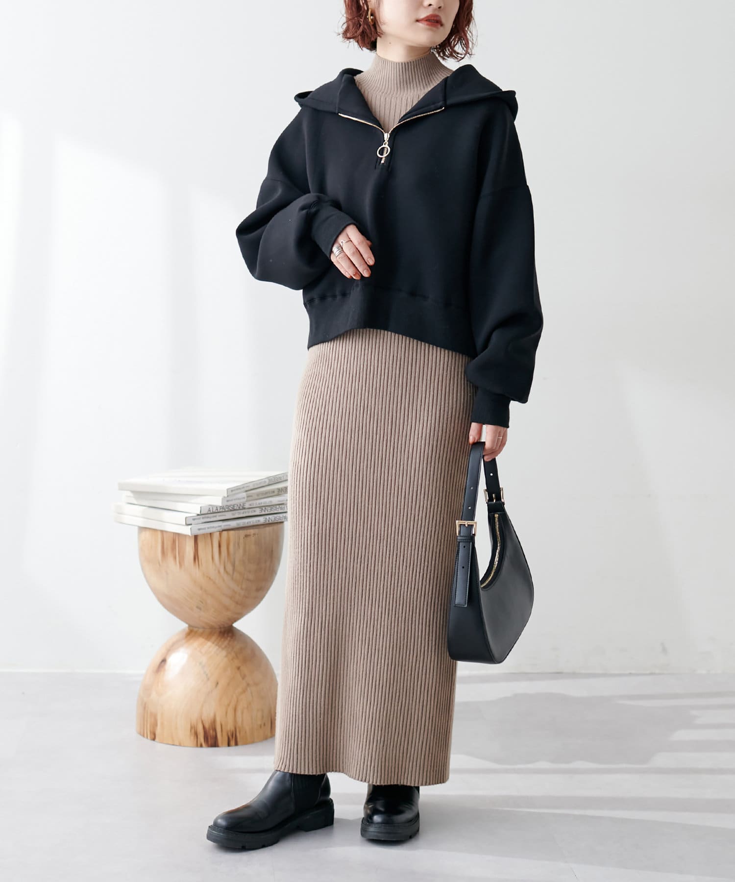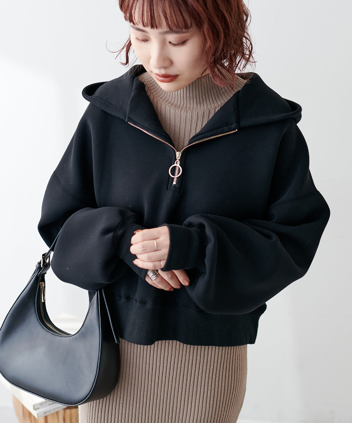 ハーフジップなので、インナーにはハイネックを仕込んでレイヤードを楽しむのがおすすめです。