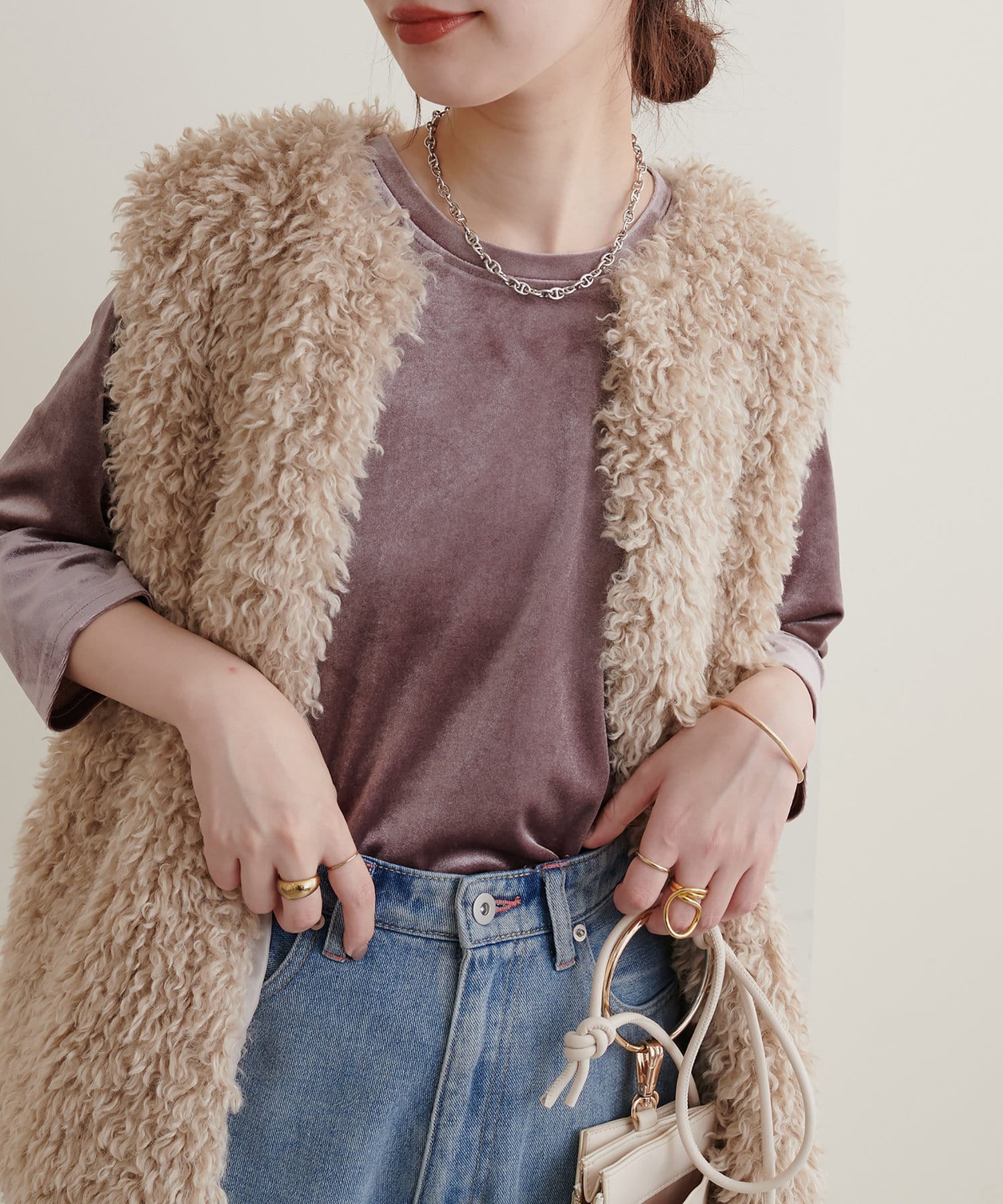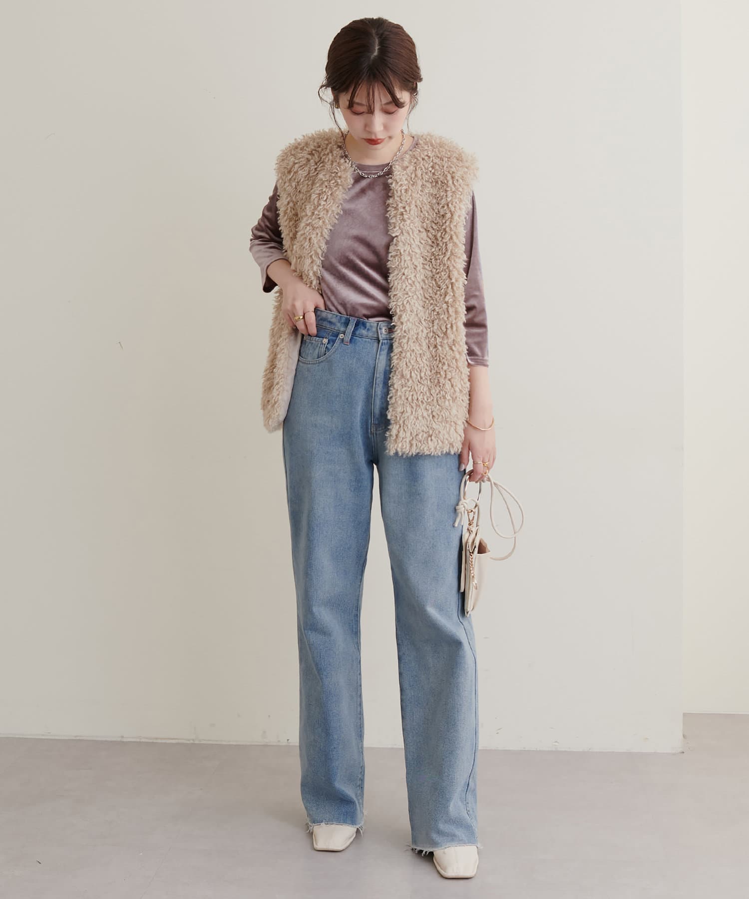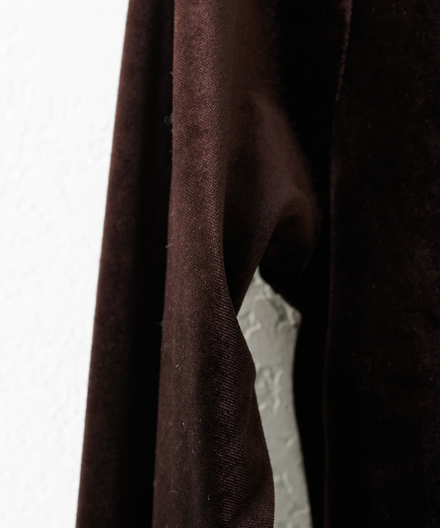 ベロアの生地感を活かしてデニムなどのシンプルなボトムに合わせても、シーズンムードな着こなしに仕上がります。