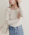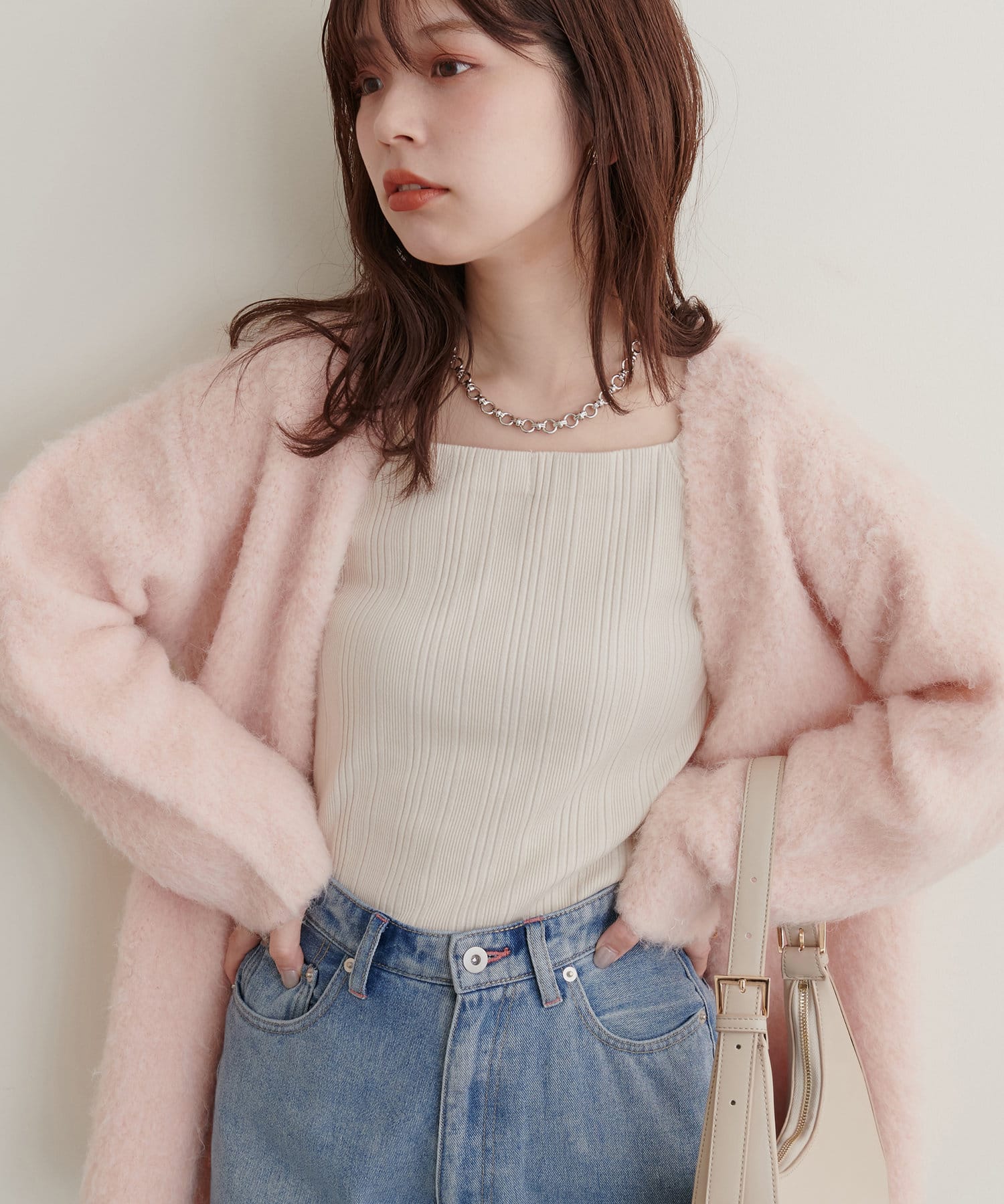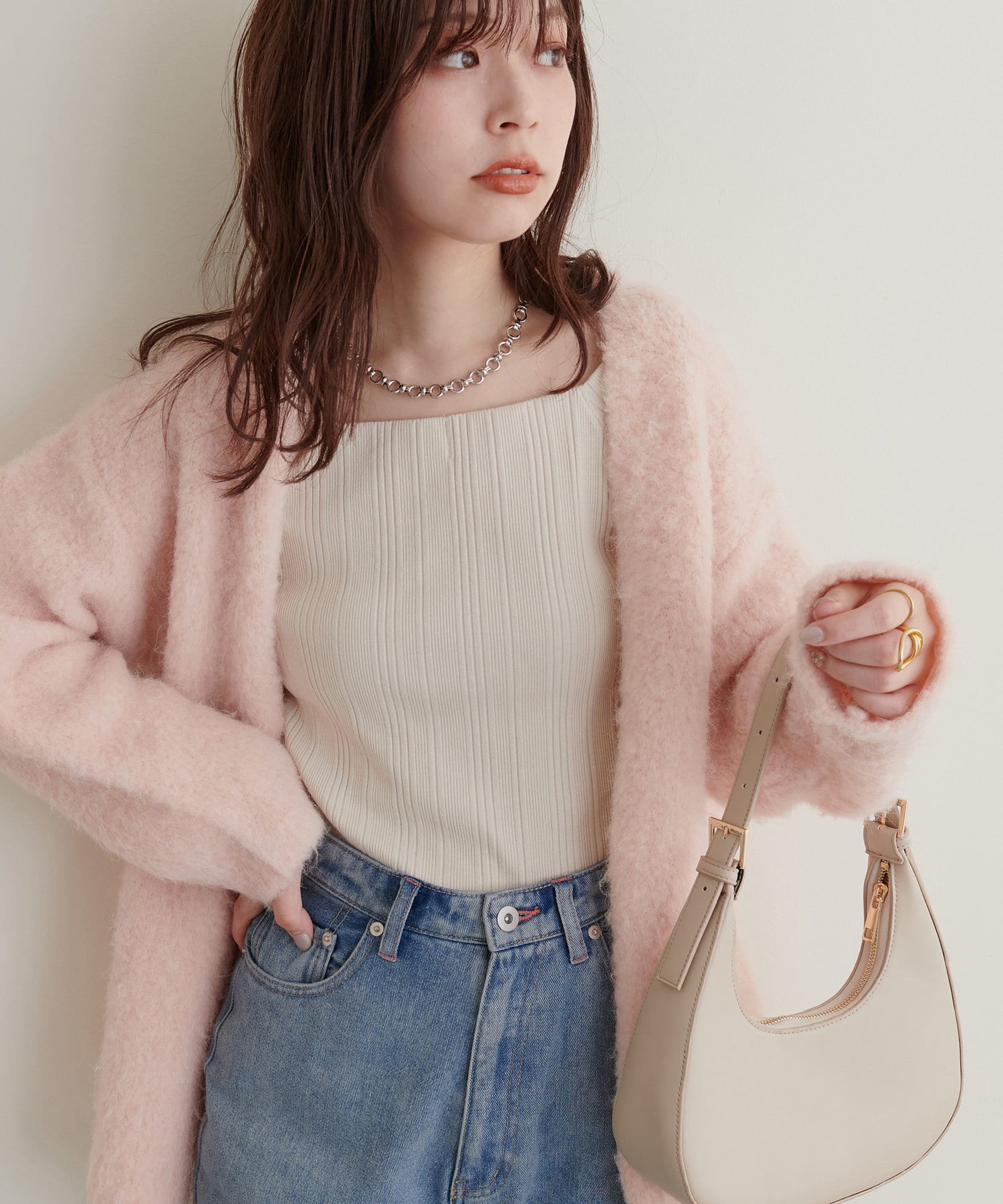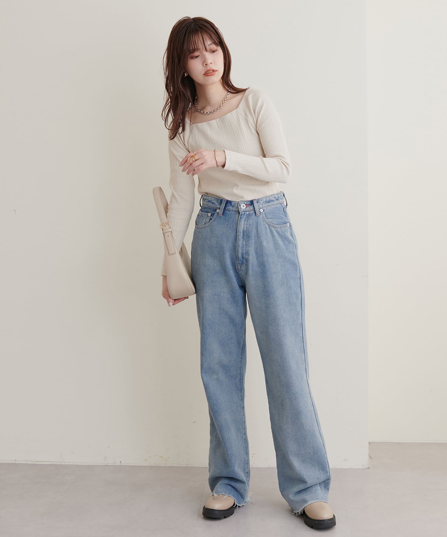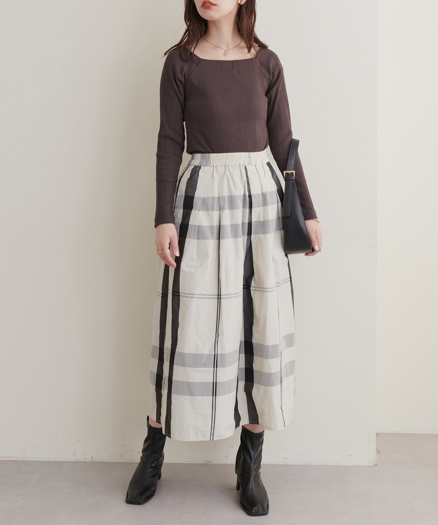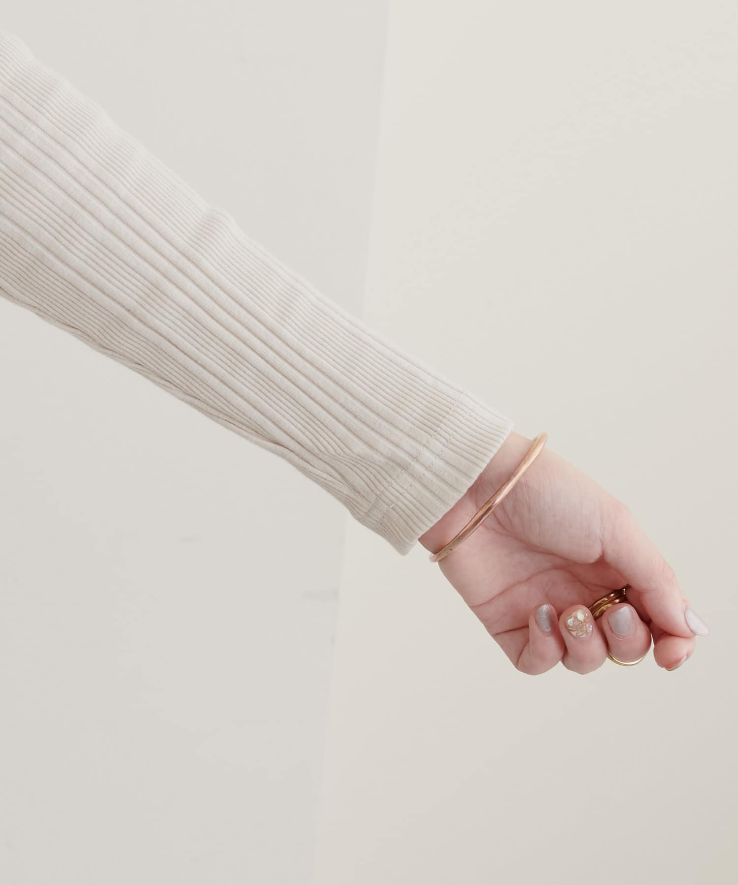 単色ですが模様のようにランダムな太さのリブが入っているので、ボシンプルなボトムでも決まります。