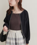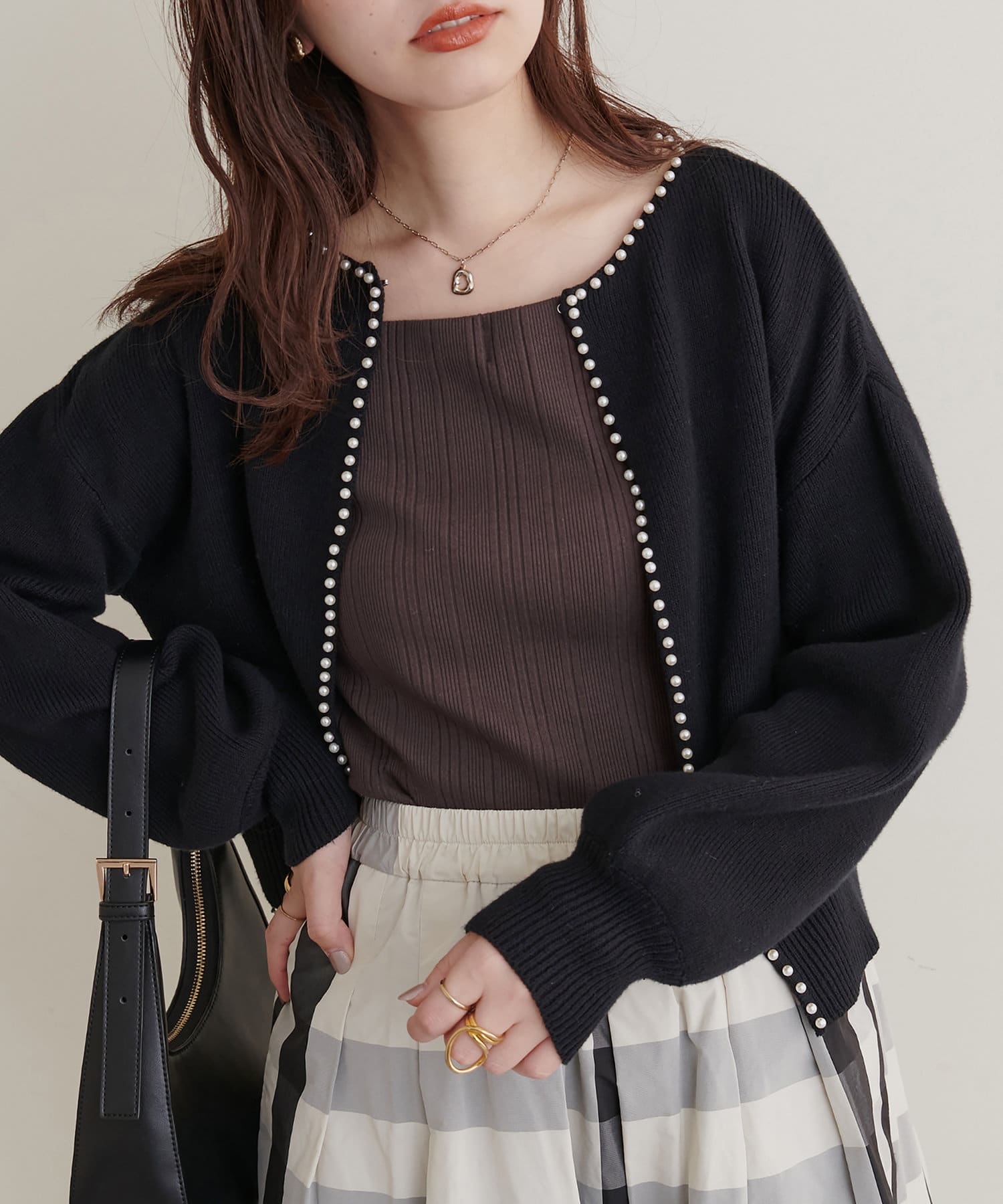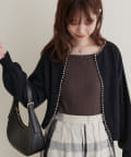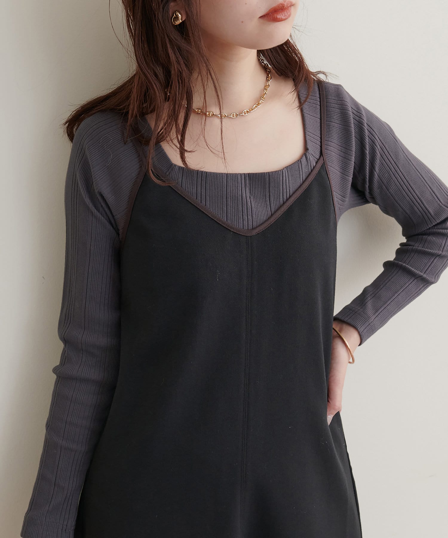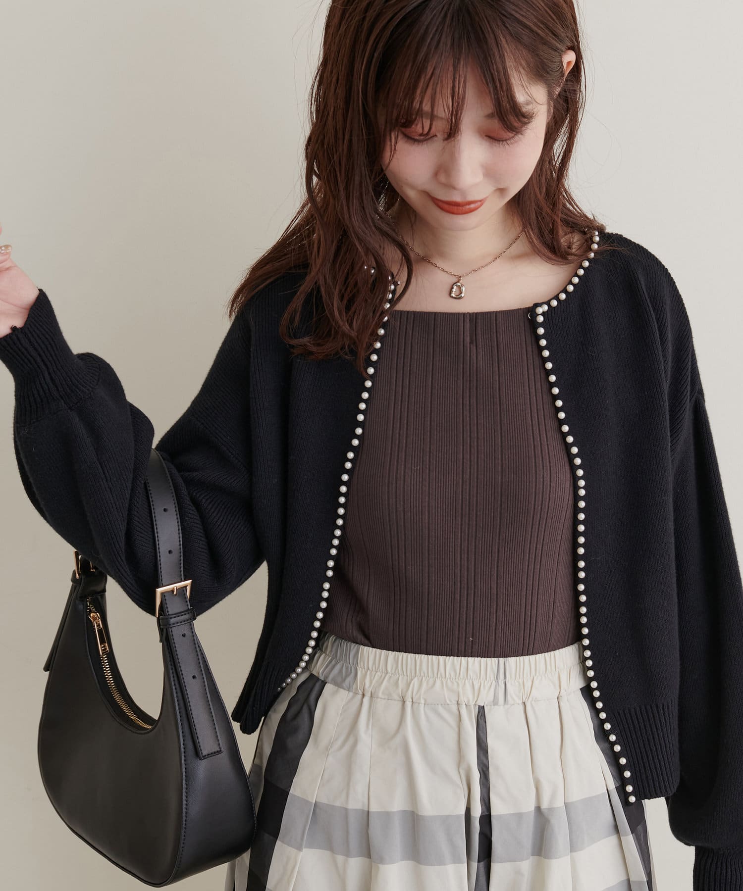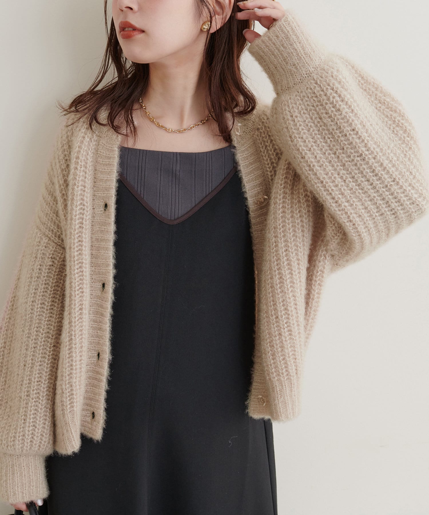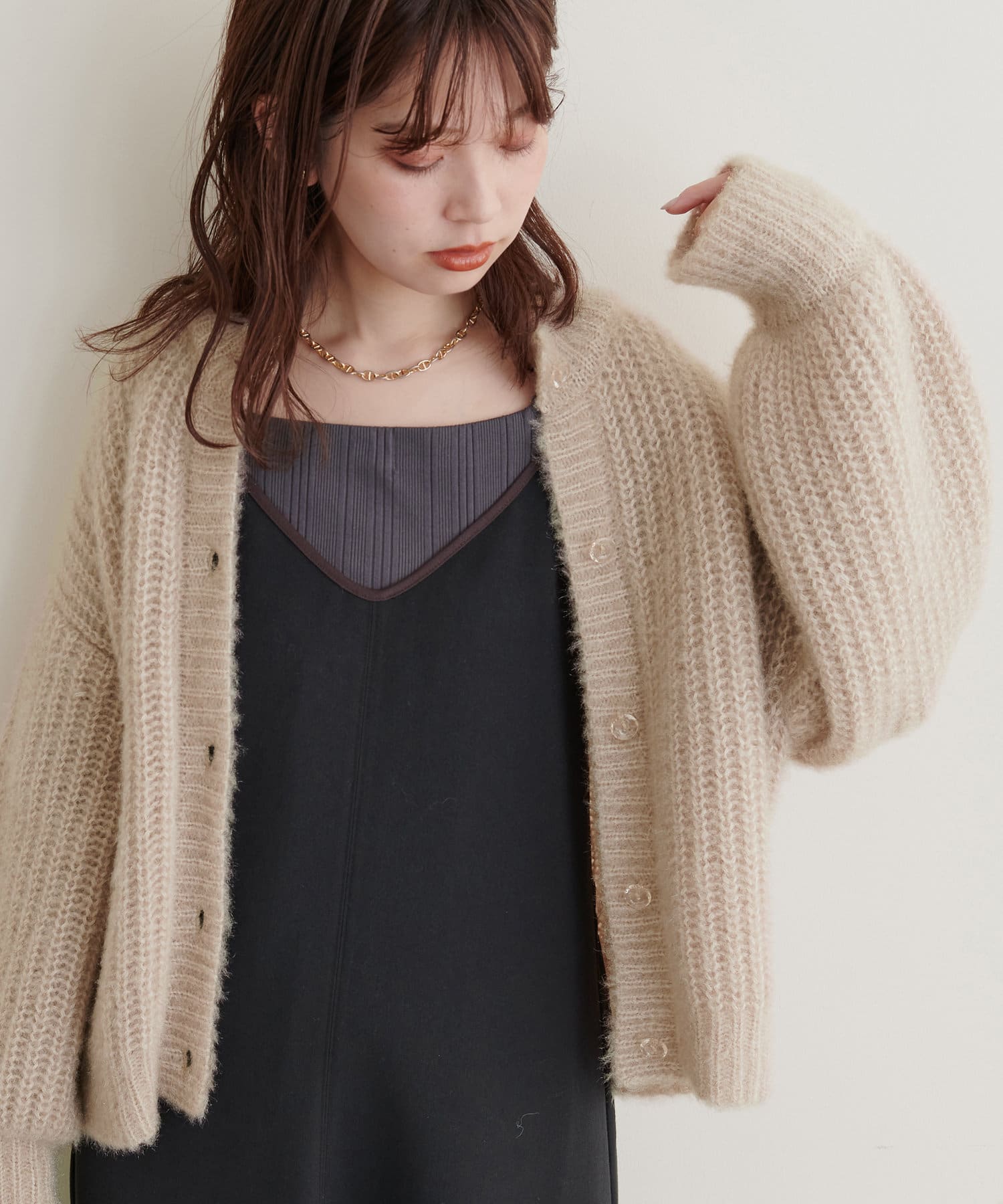 単色ですが模様のようにランダムな太さのリブが入っているので、ボシンプルなボトムでも決まります。