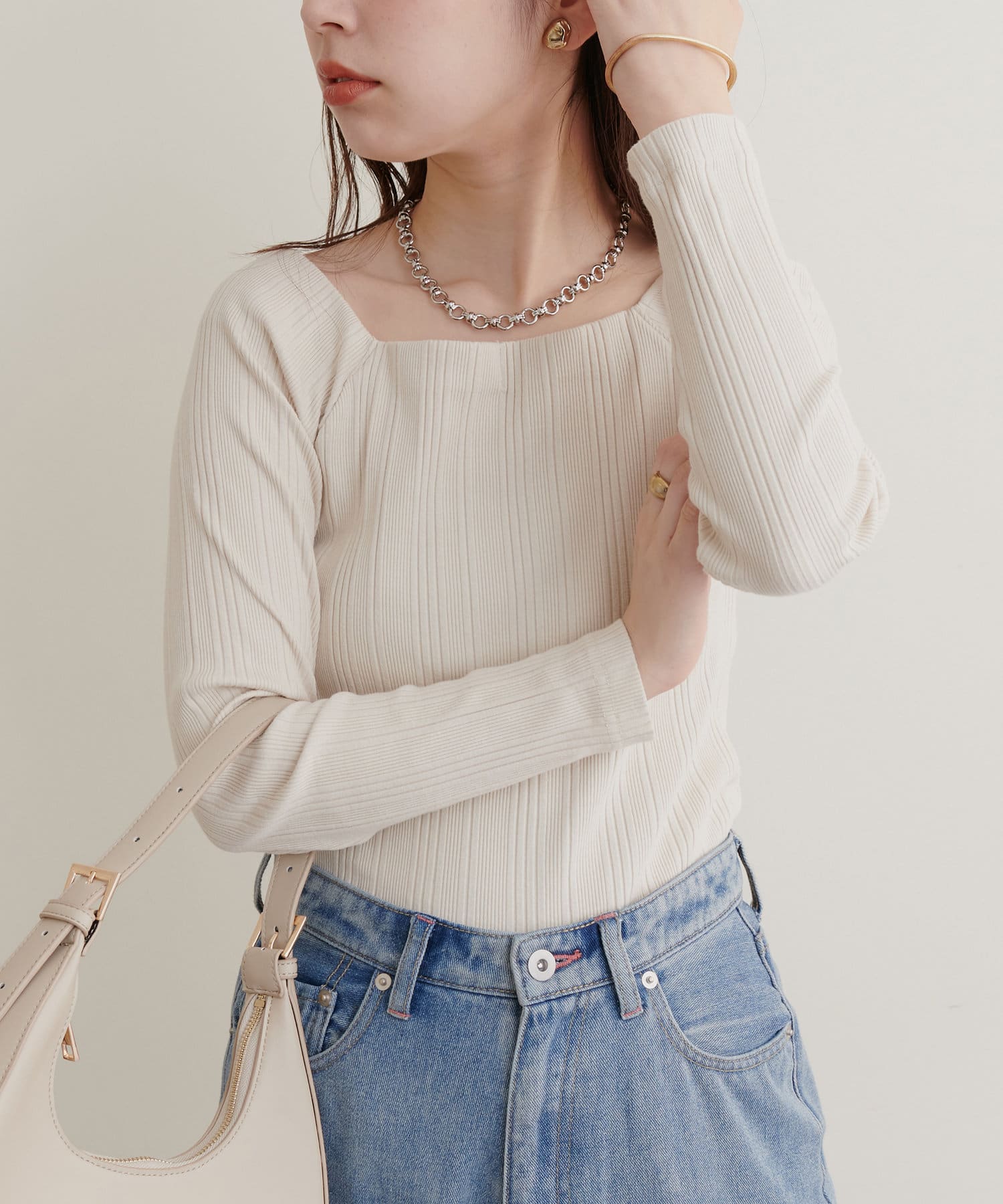 デコルテのヘルシーな肌見せが抜け感のあるレディーな着こなしでお楽しみ頂けます!