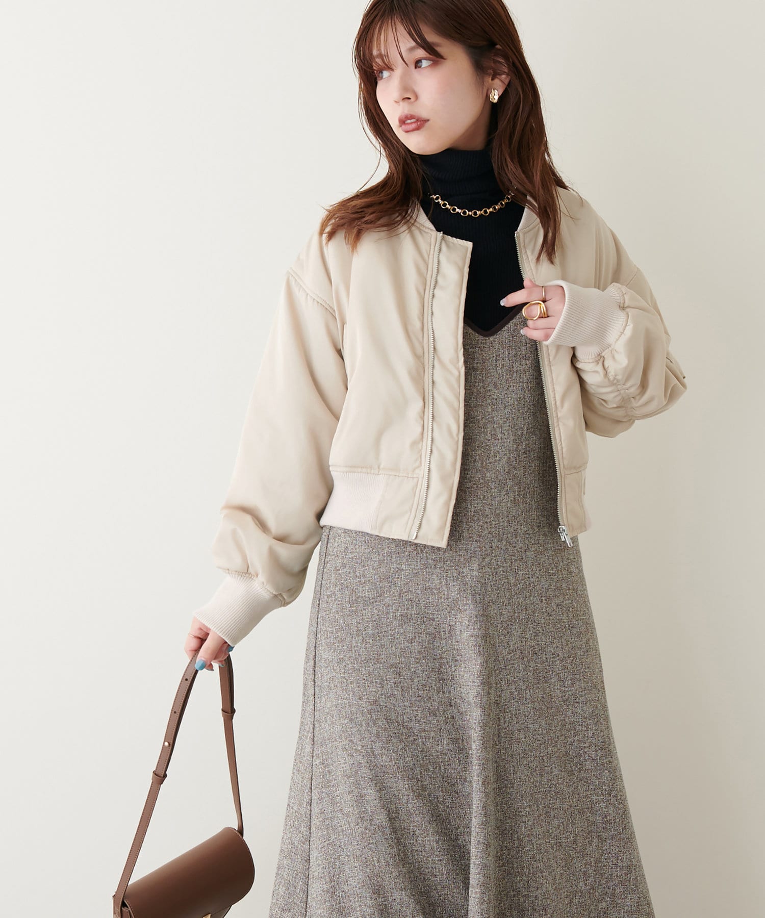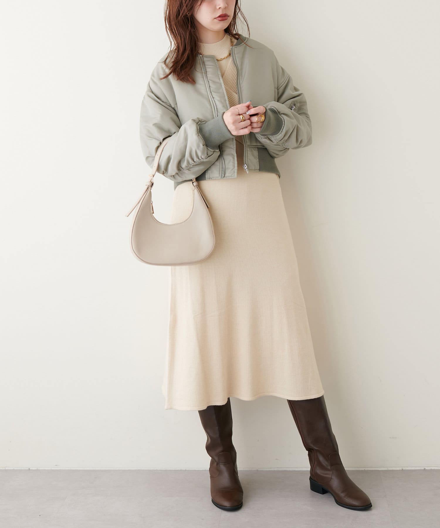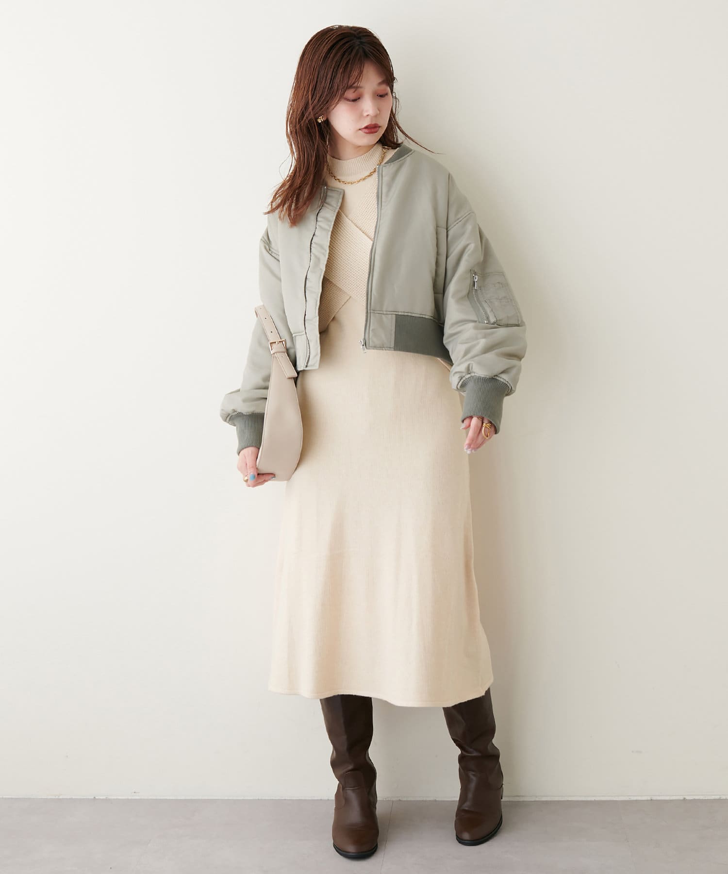 これからの寒くなる季節であれば、リブニットのワンピースなどに羽織ると