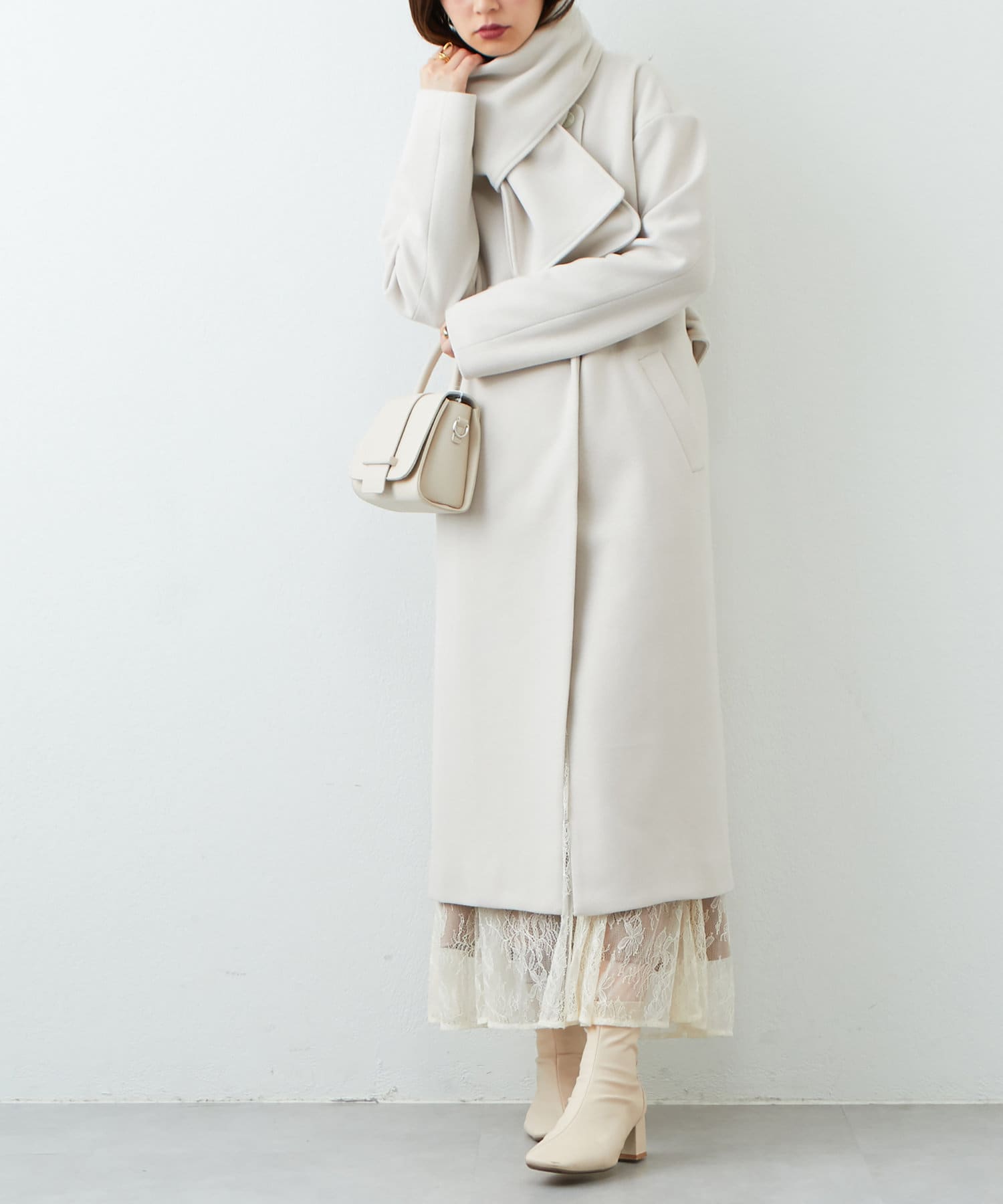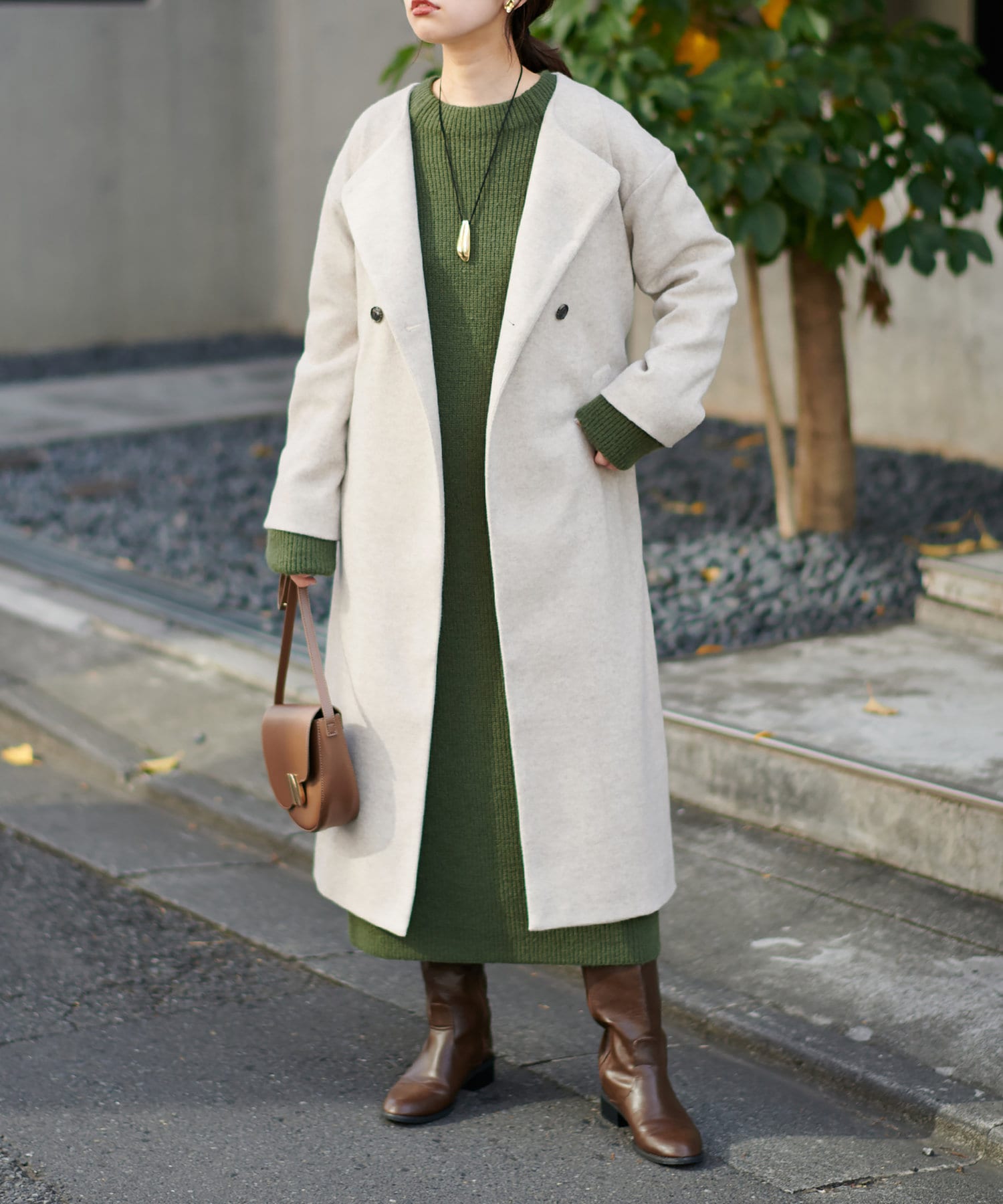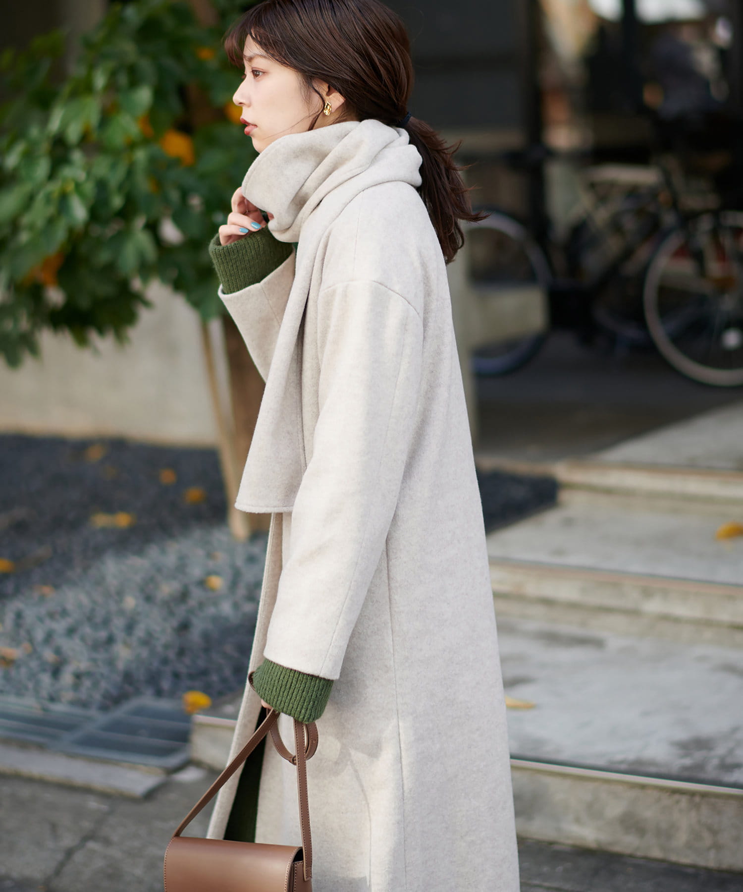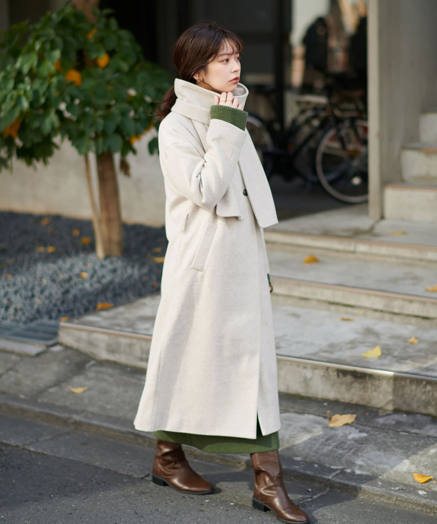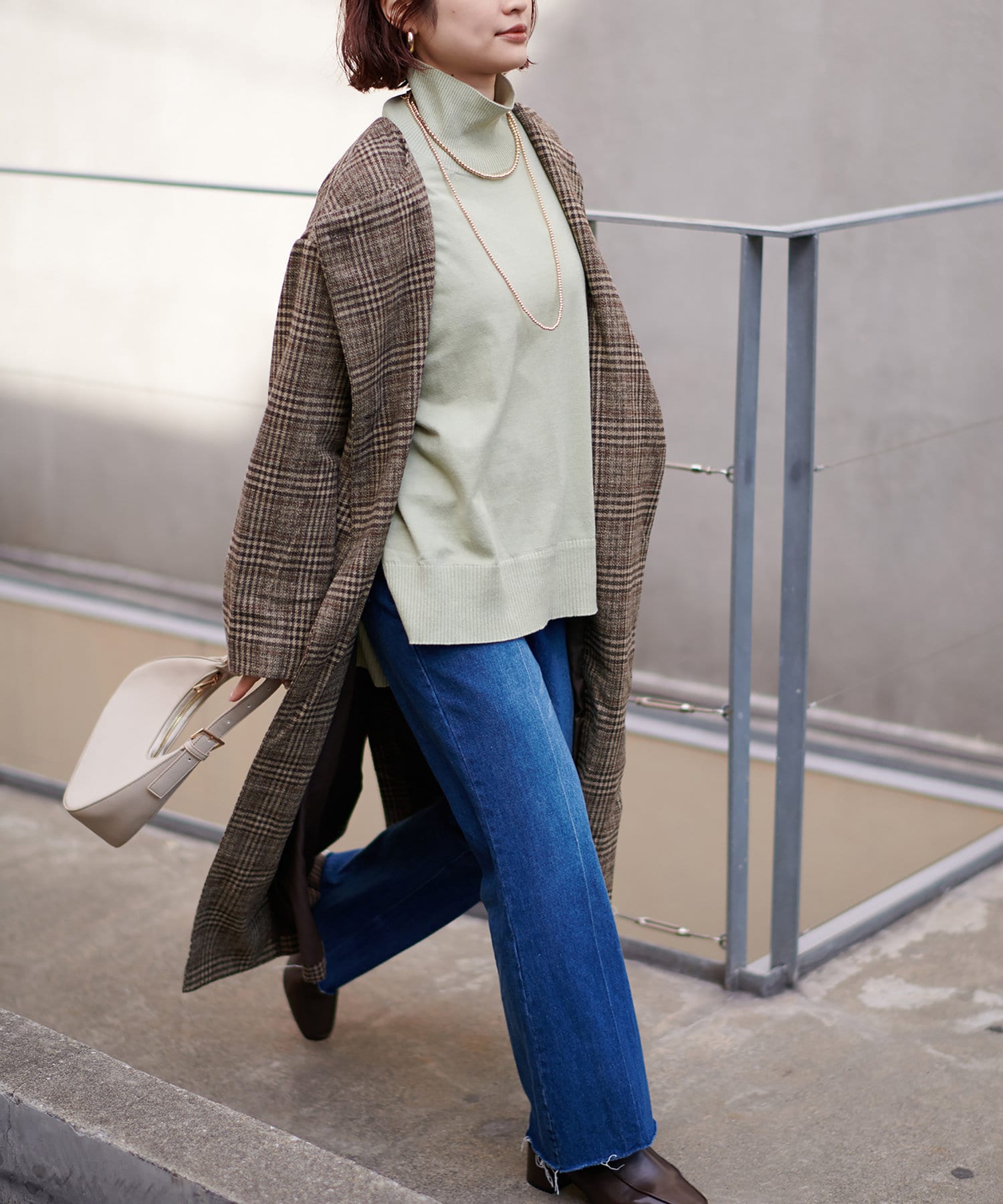 クルーネックのコートなので首元にデザインのあるハイネックのインナーを合わせてメリハリ付けても◎