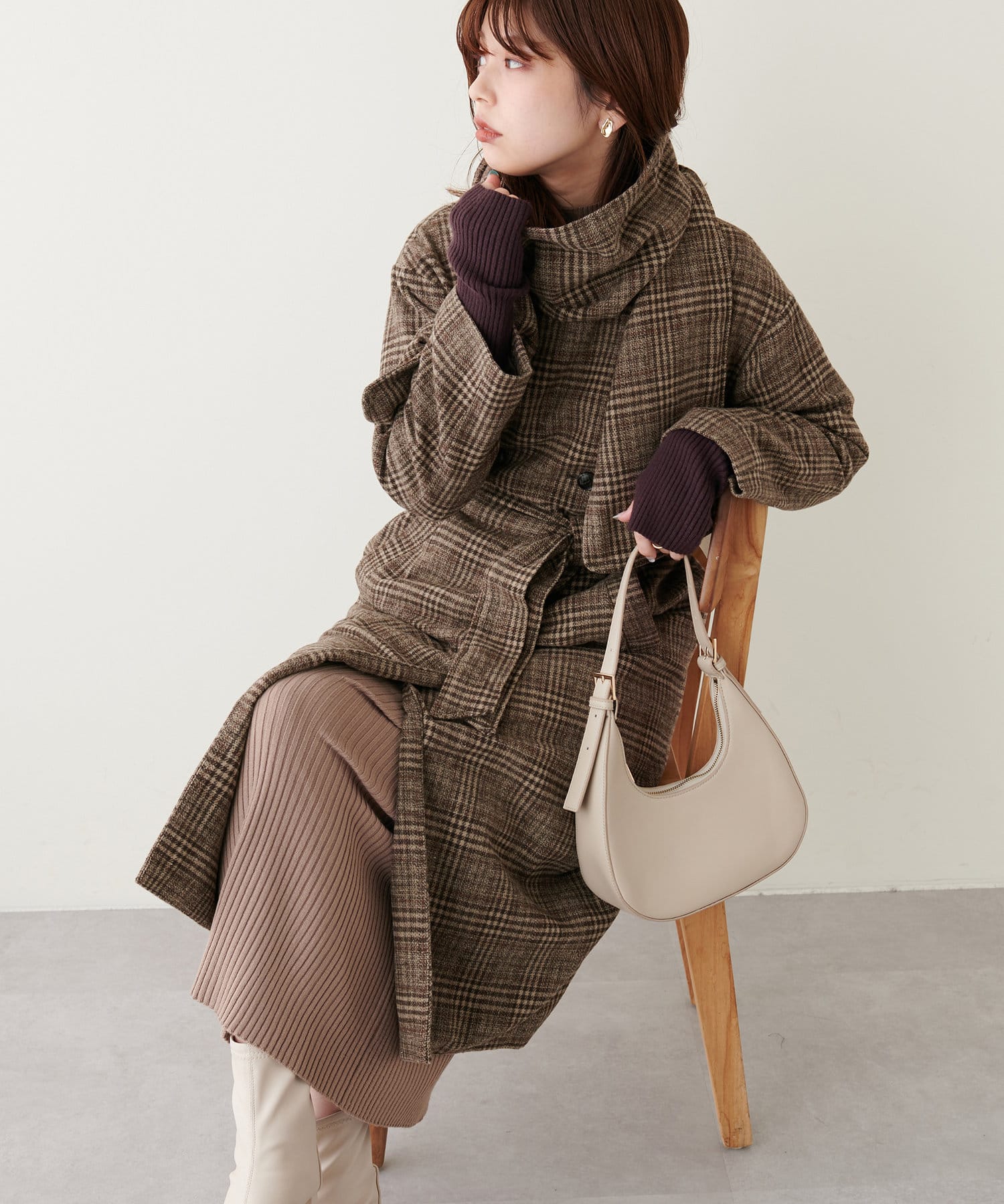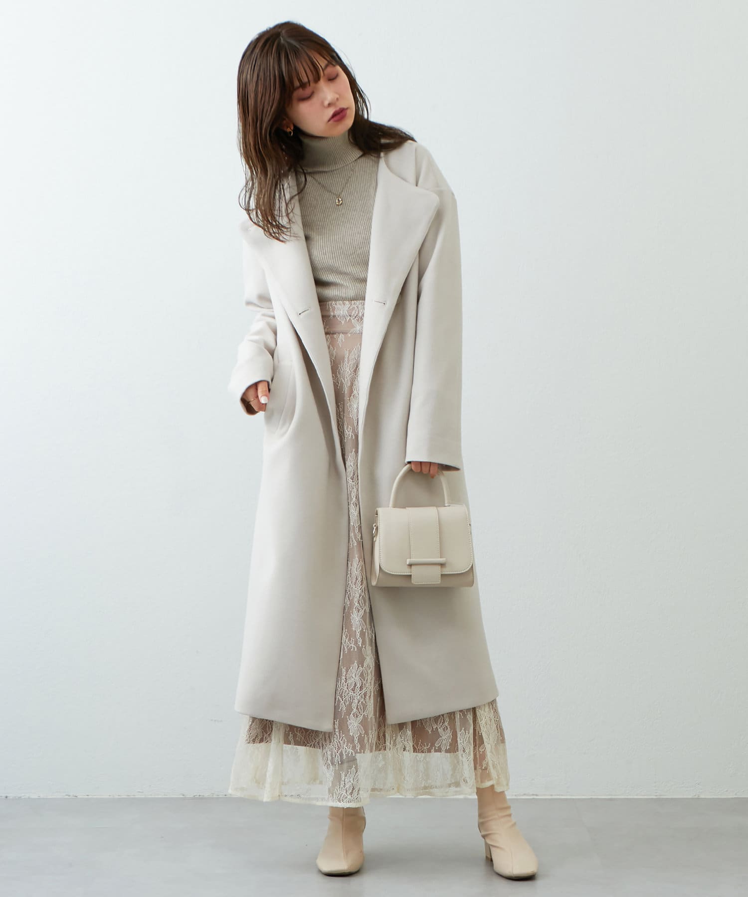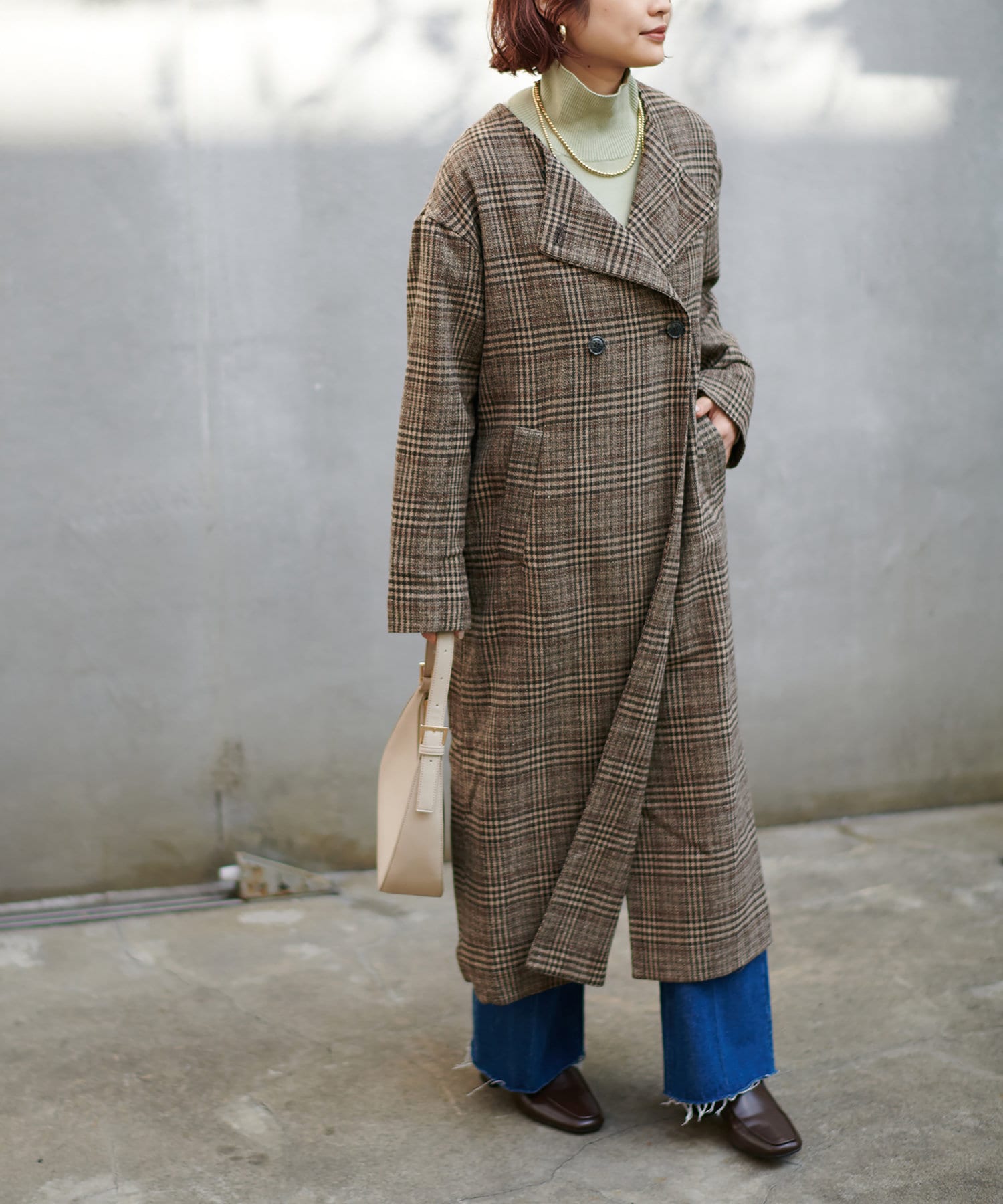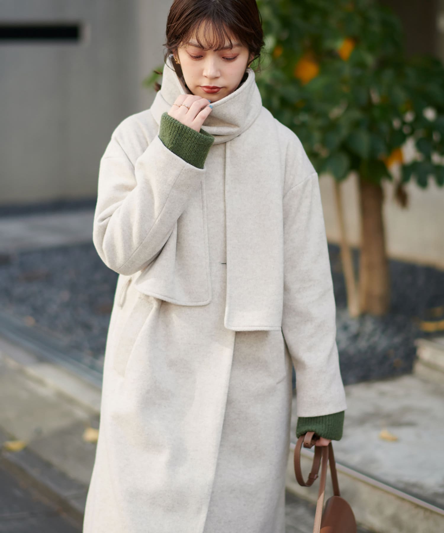 クルーネックのコートなので首元にデザインのあるハイネックのインナーを合わせてメリハリ付けても◎