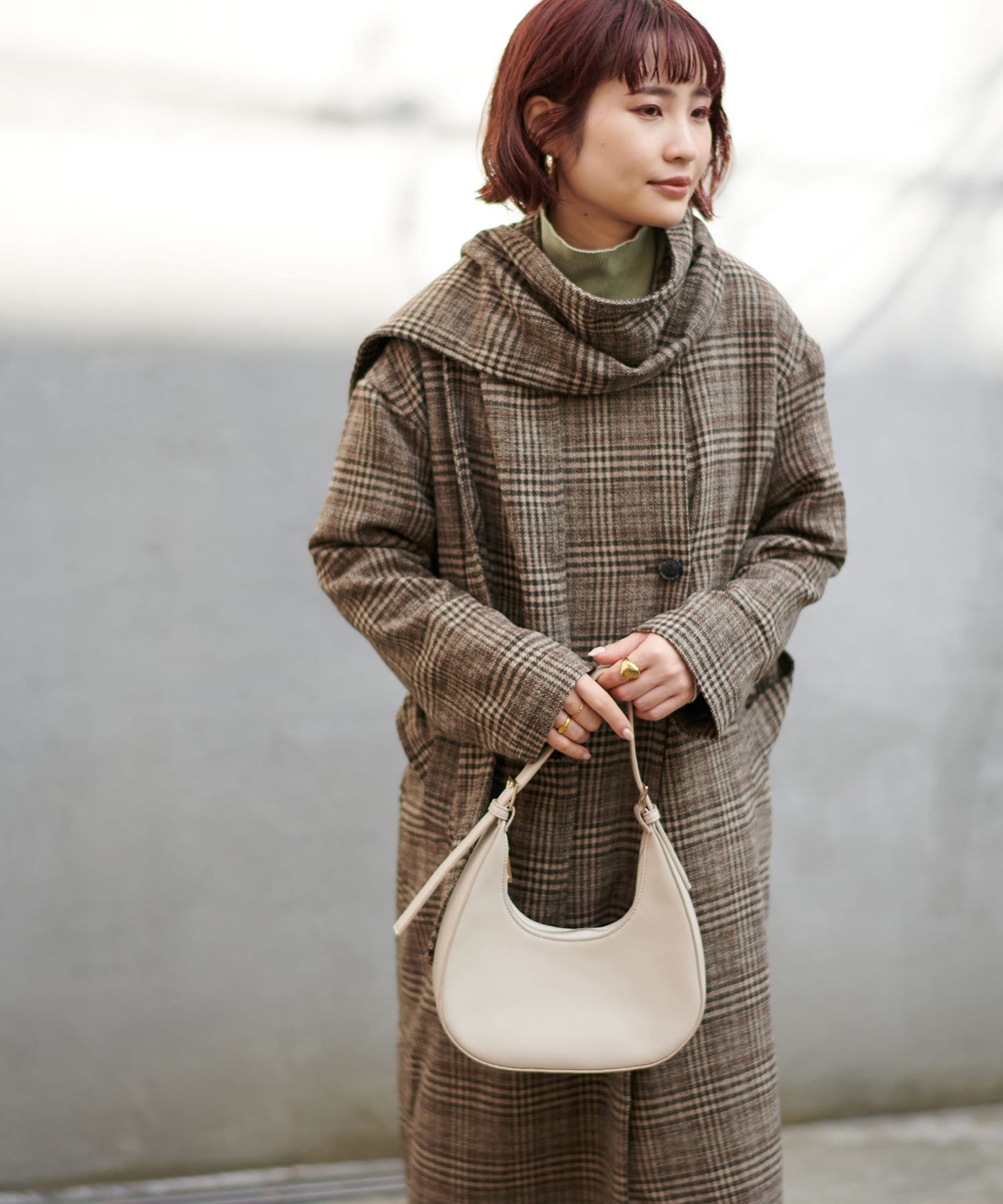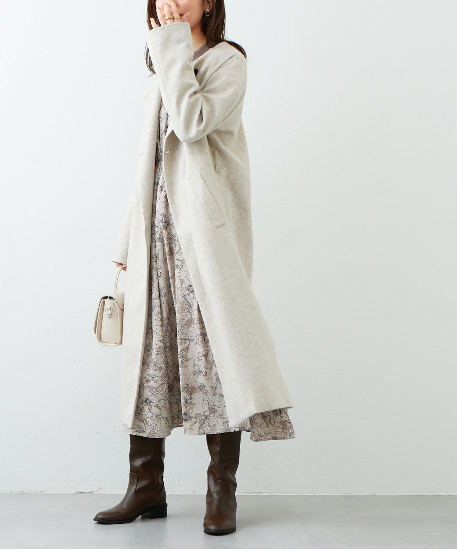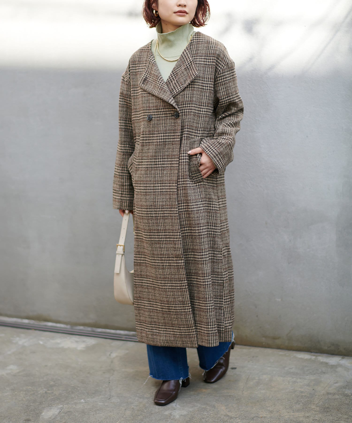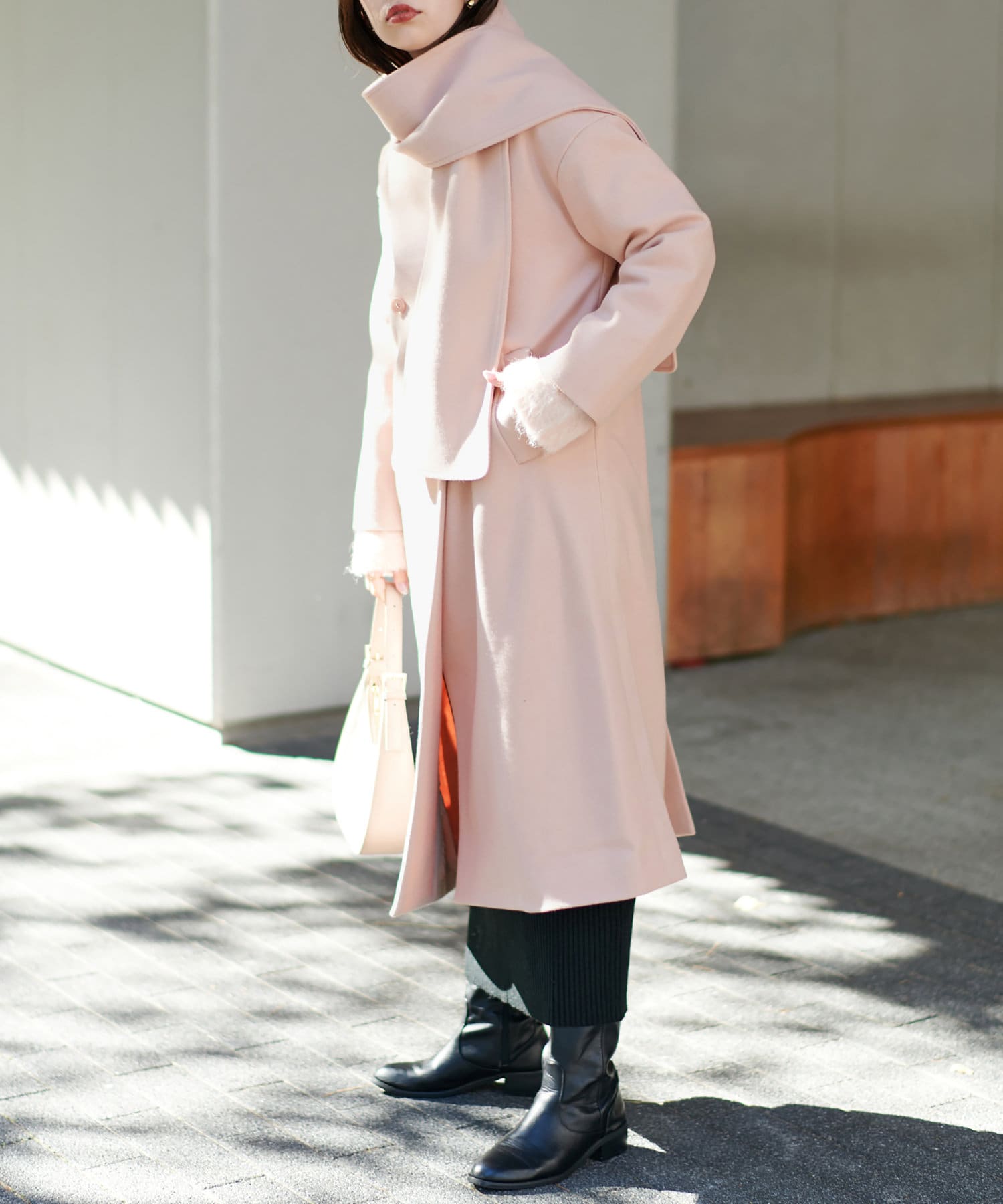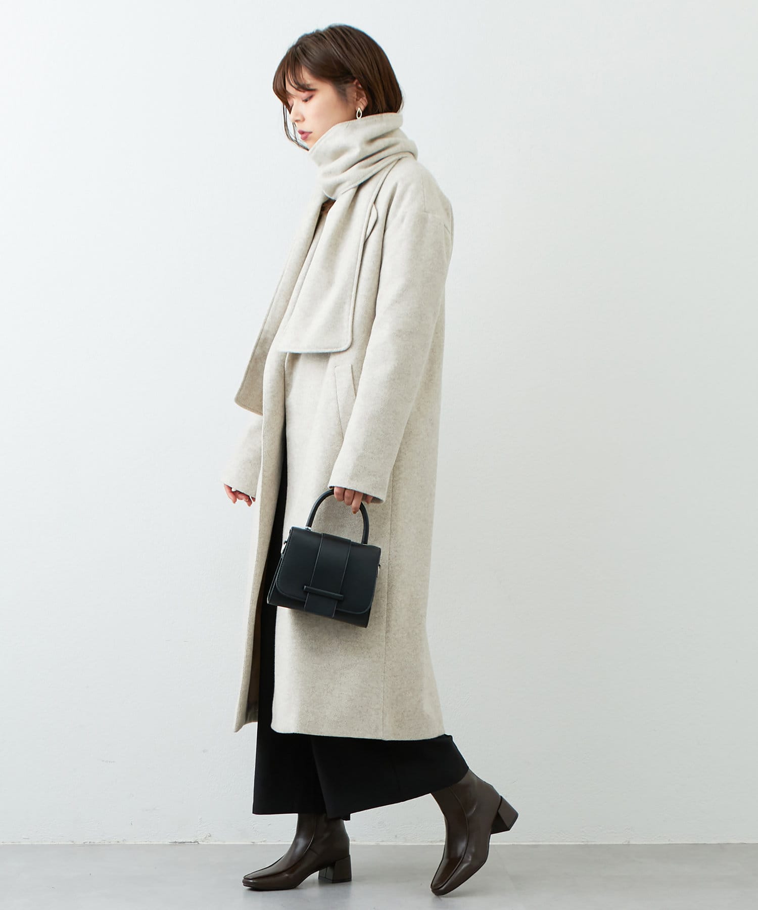 クルーネックのコートなので首元にデザインのあるハイネックのインナーを合わせてメリハリ付けても◎