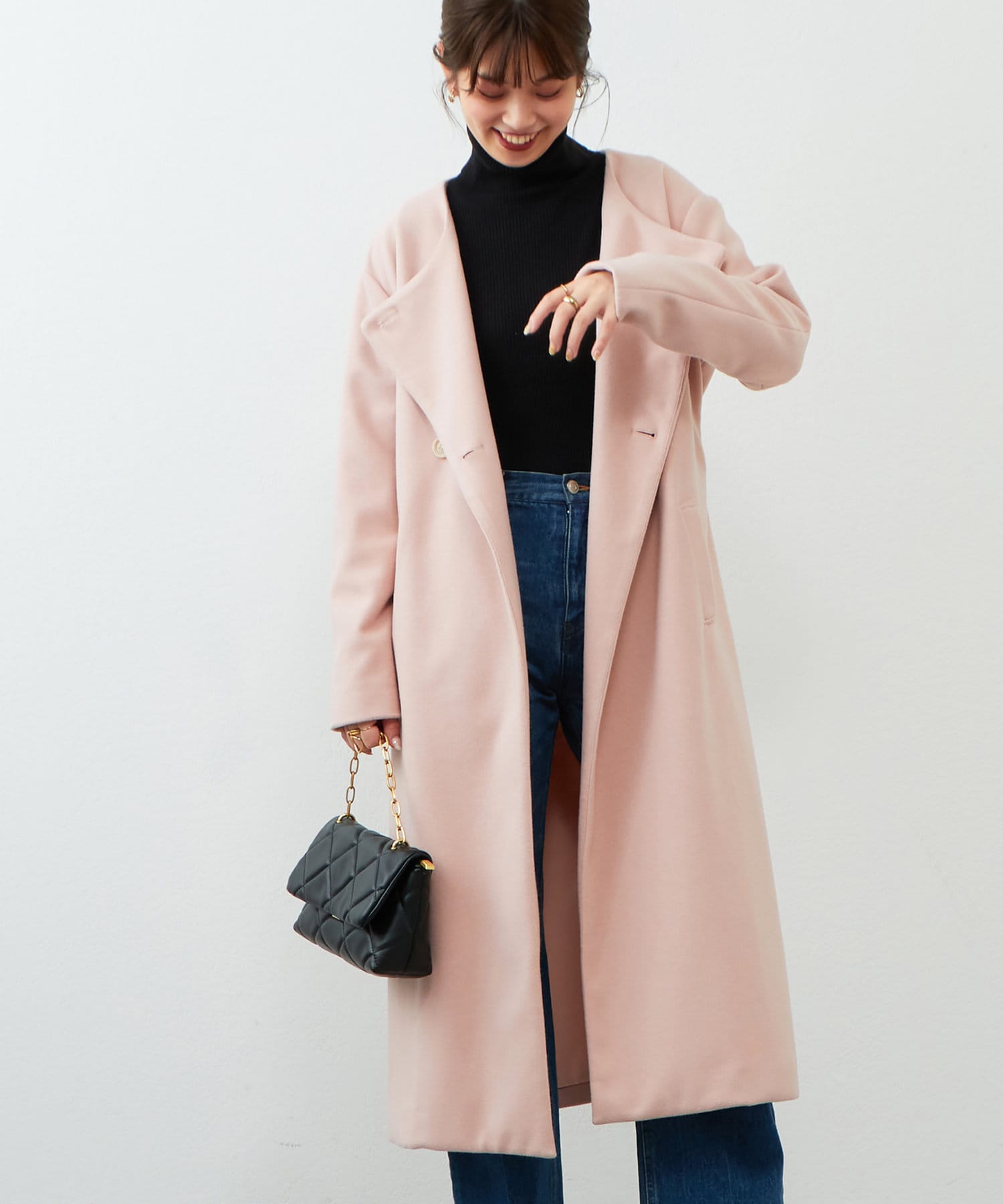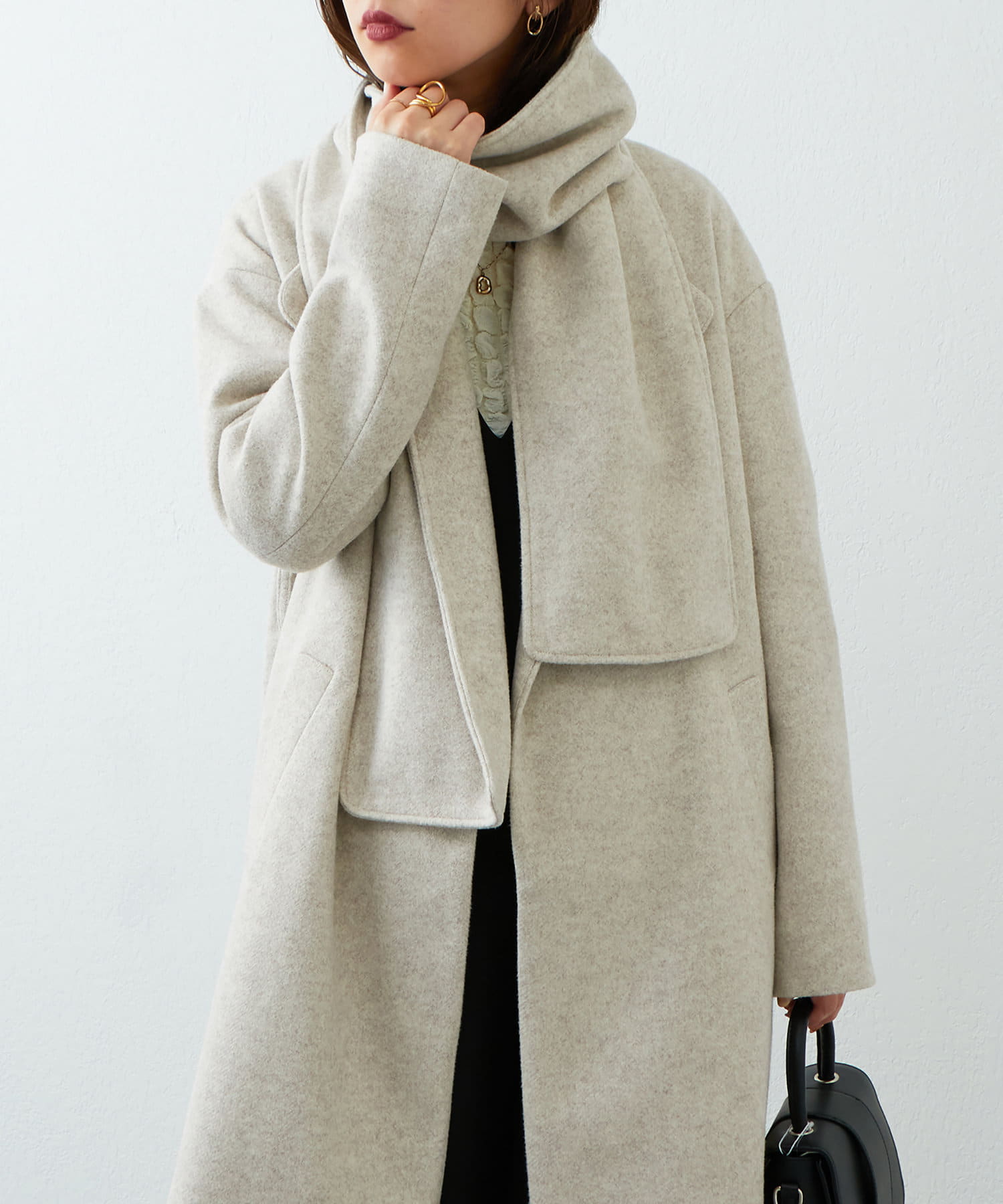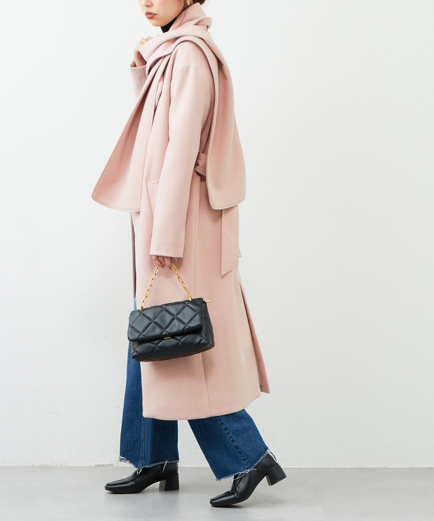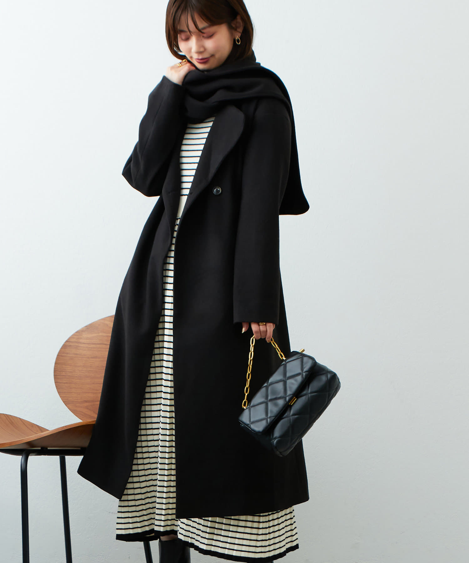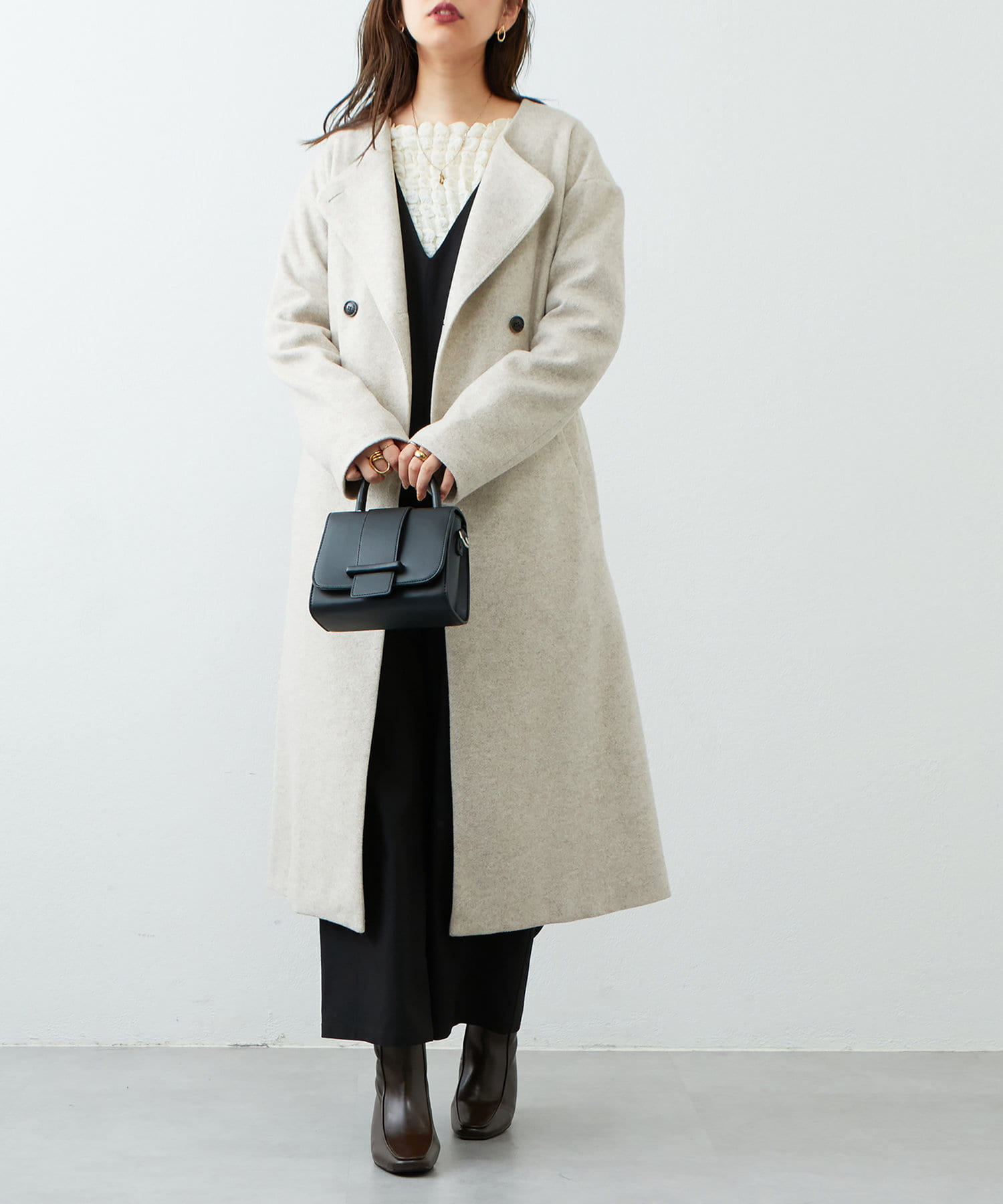 クルーネックのコートなので首元にデザインのあるハイネックのインナーを合わせてメリハリ付けても◎