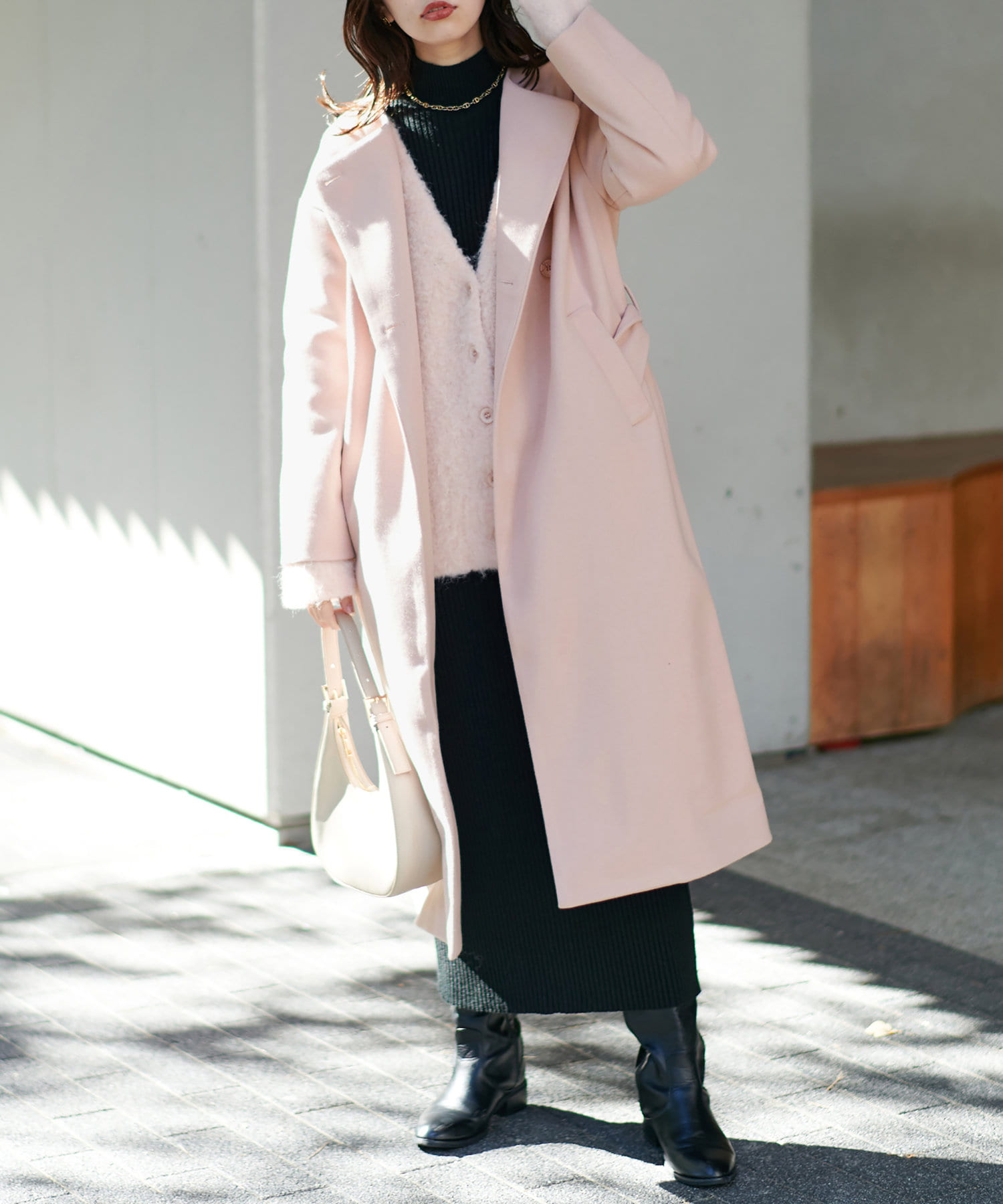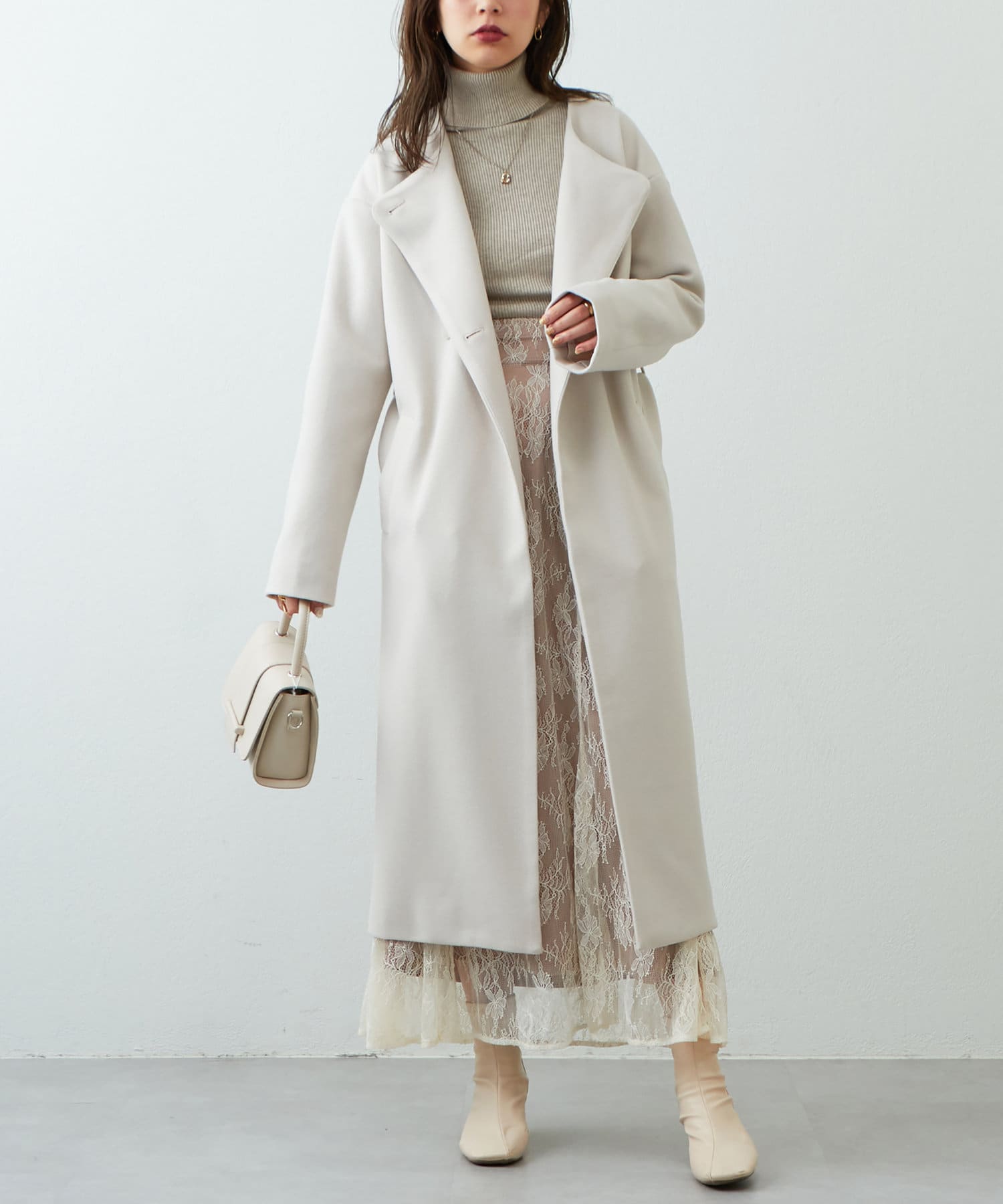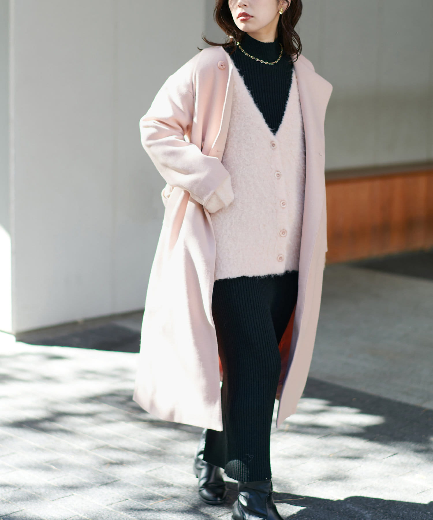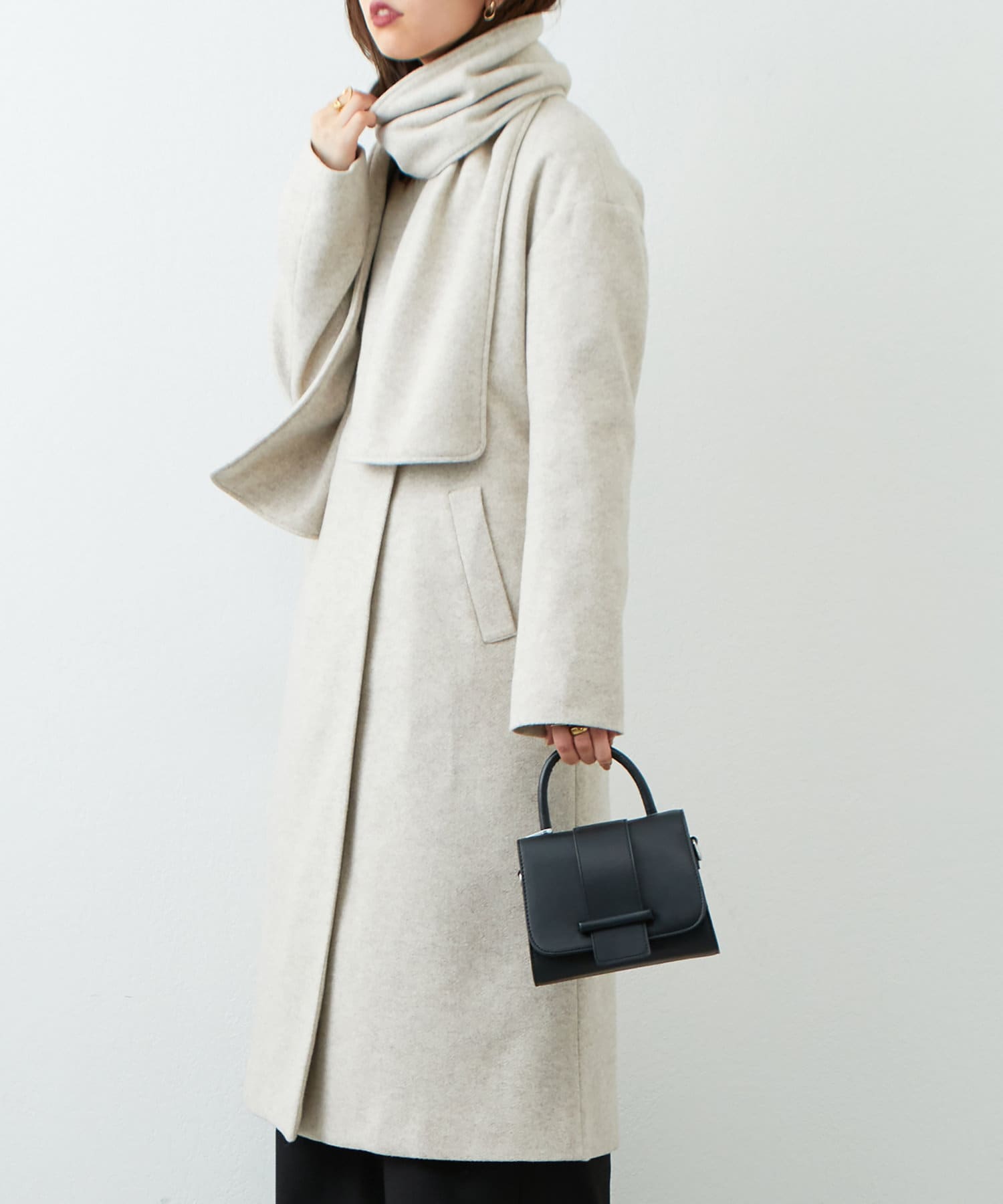 クルーネックのコートなので首元にデザインのあるハイネックのインナーを合わせてメリハリ付けても◎
