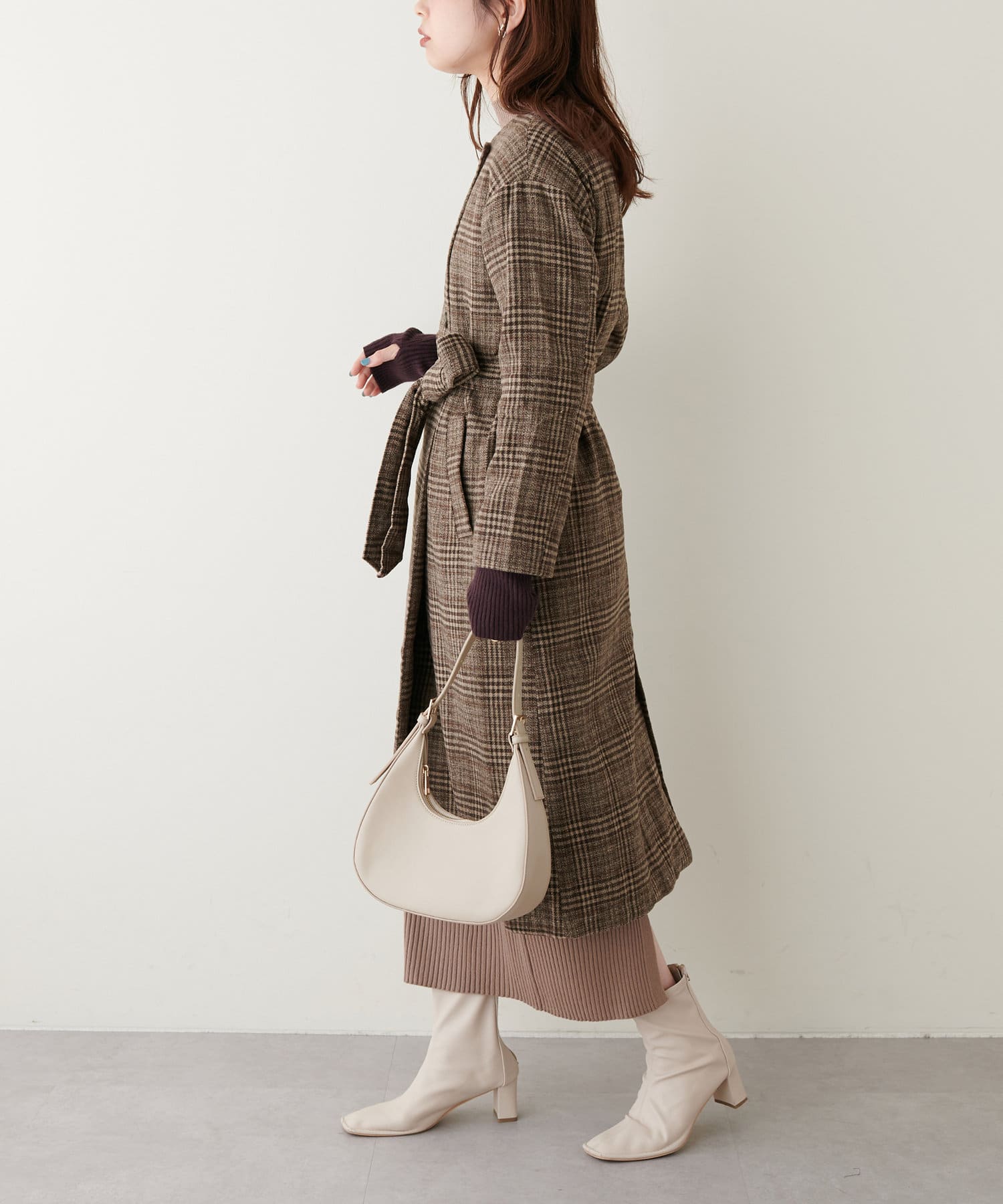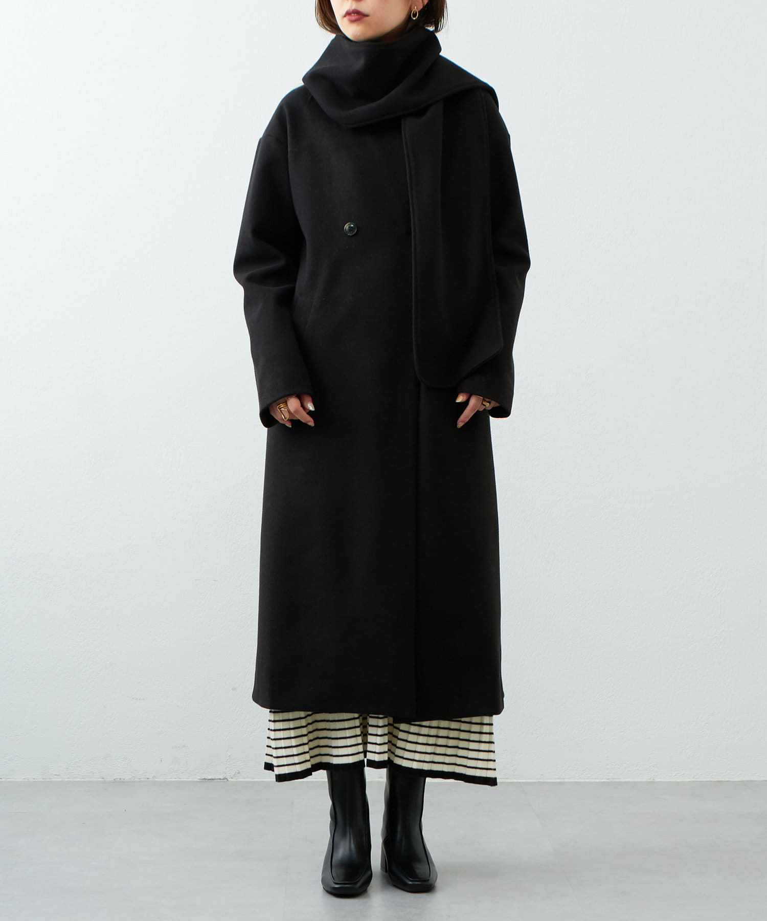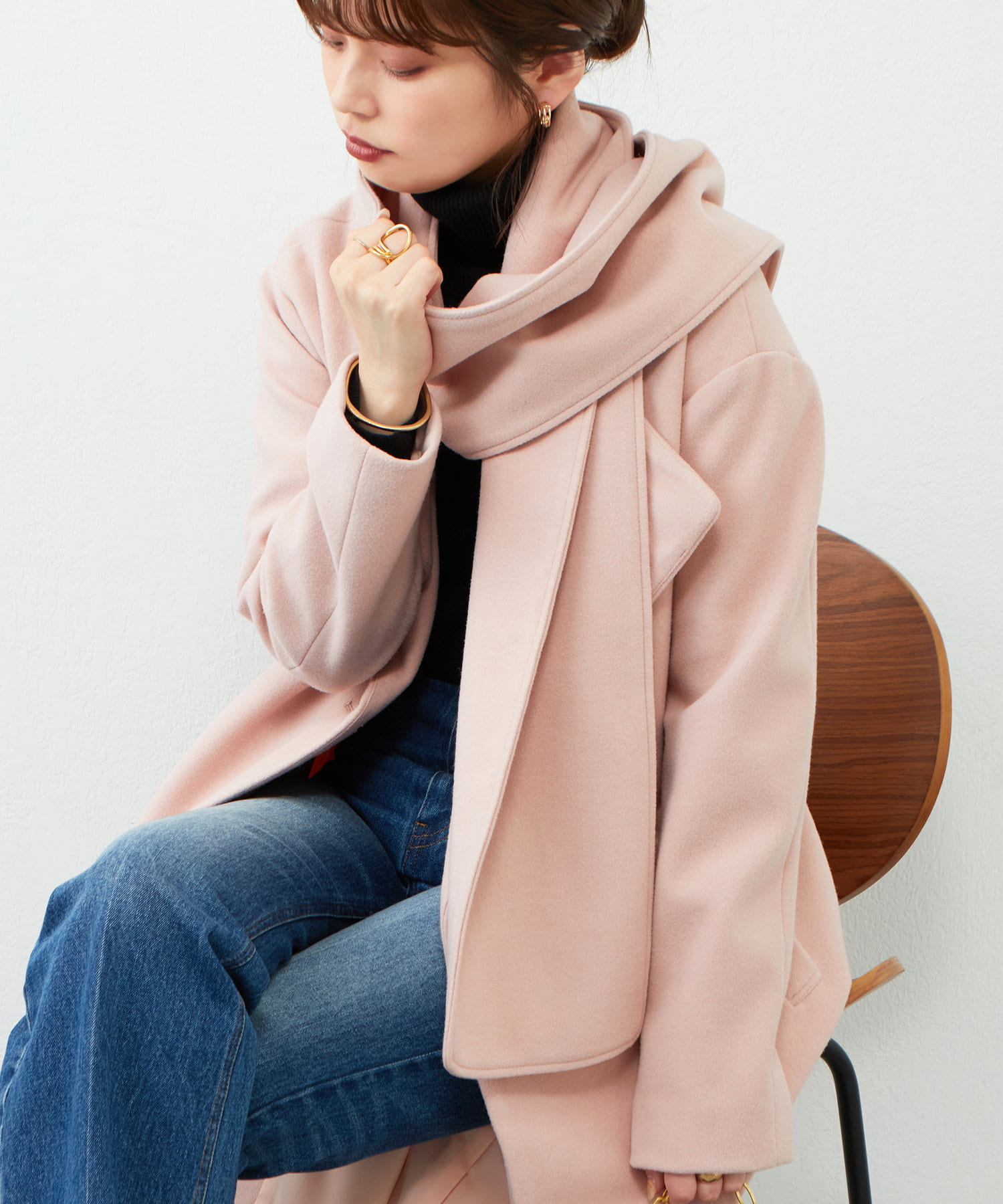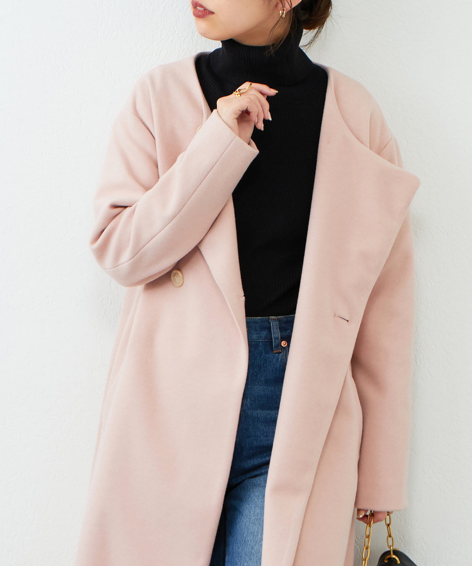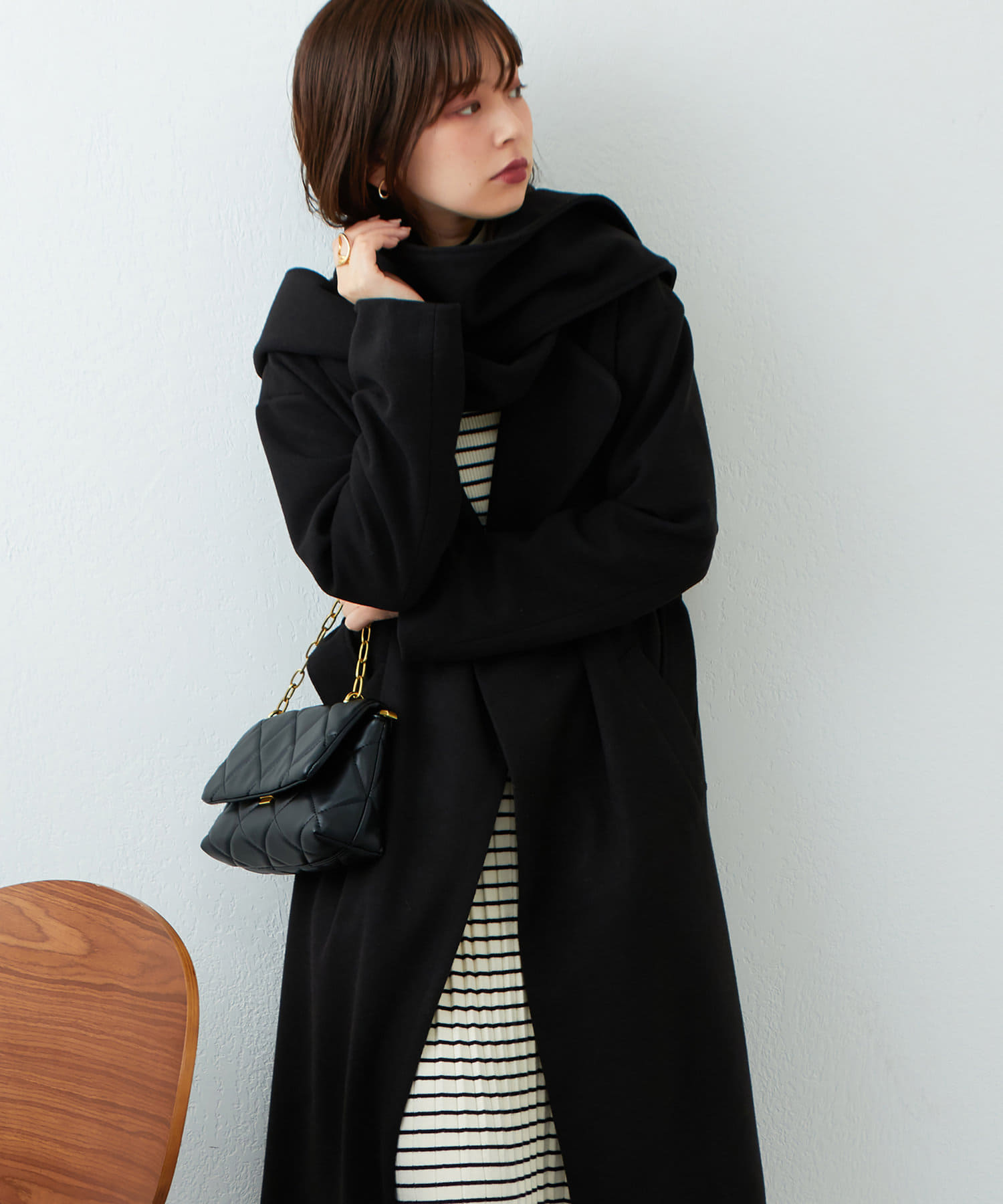 クルーネックのコートなので首元にデザインのあるハイネックのインナーを合わせてメリハリ付けても◎