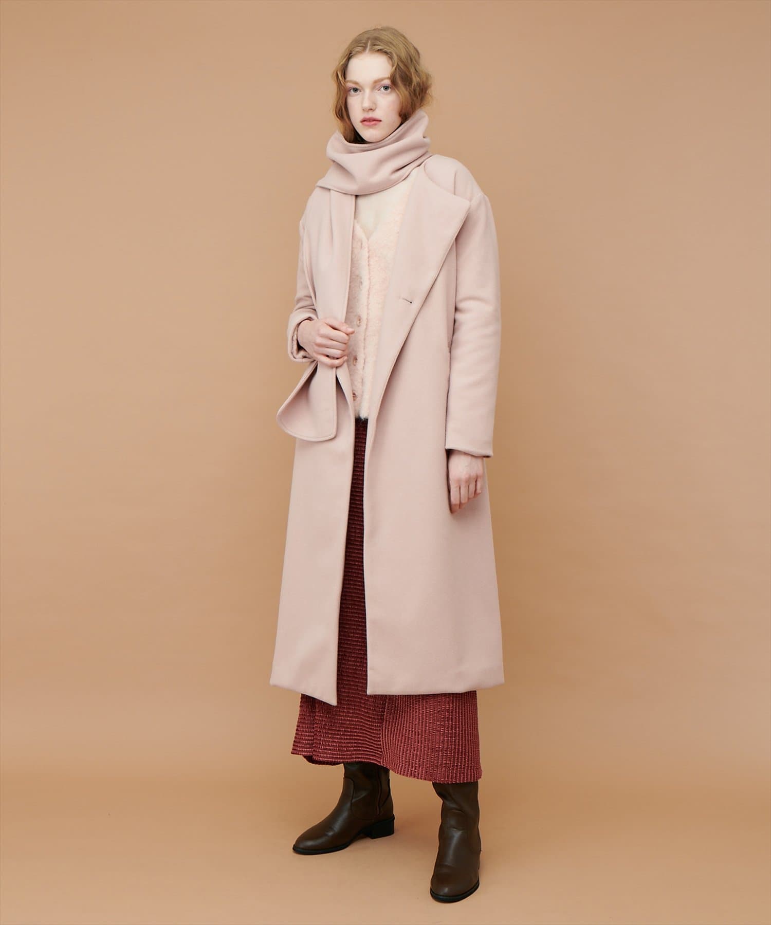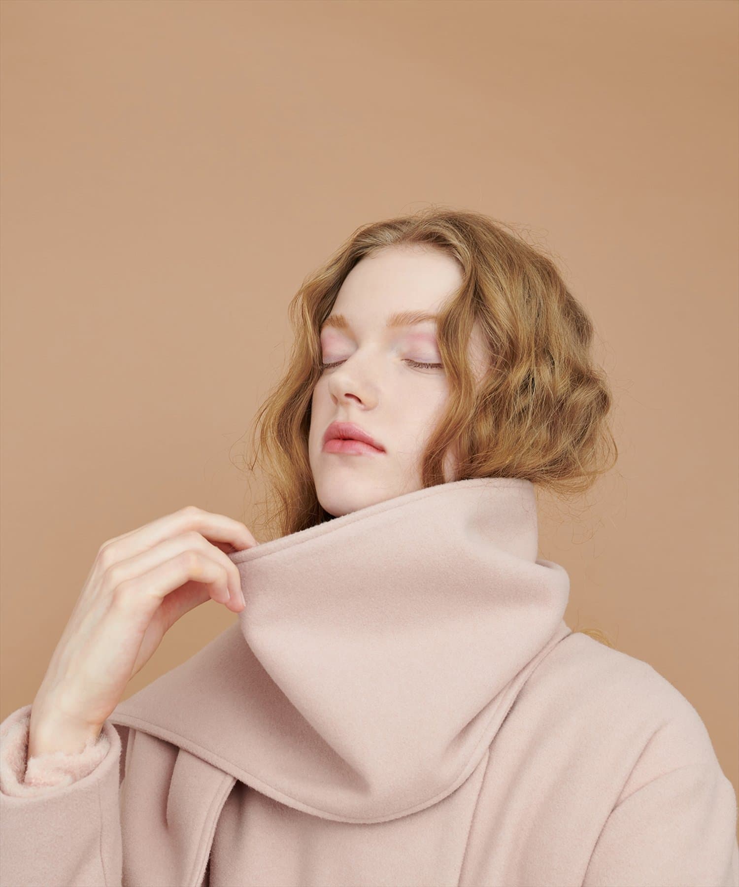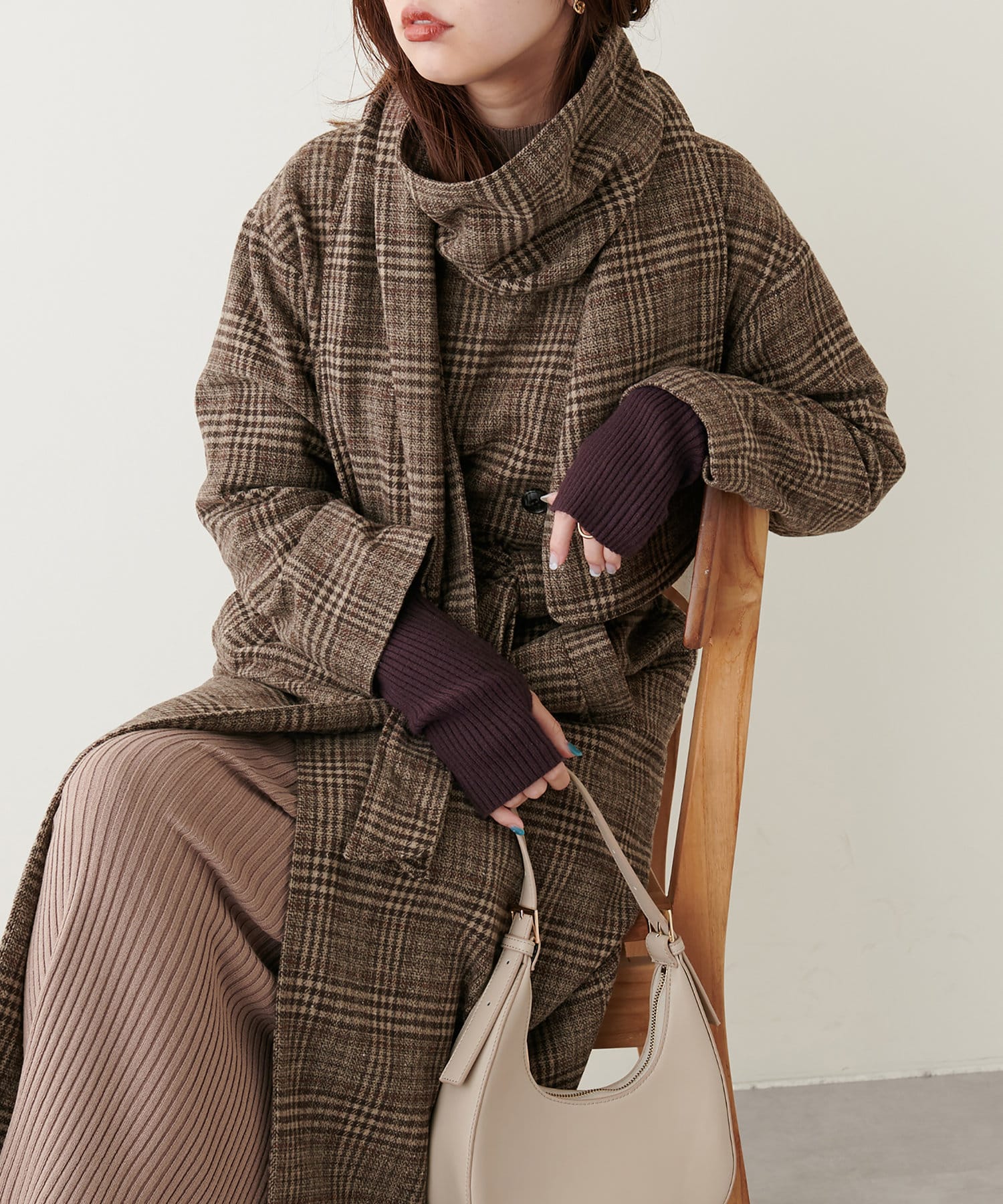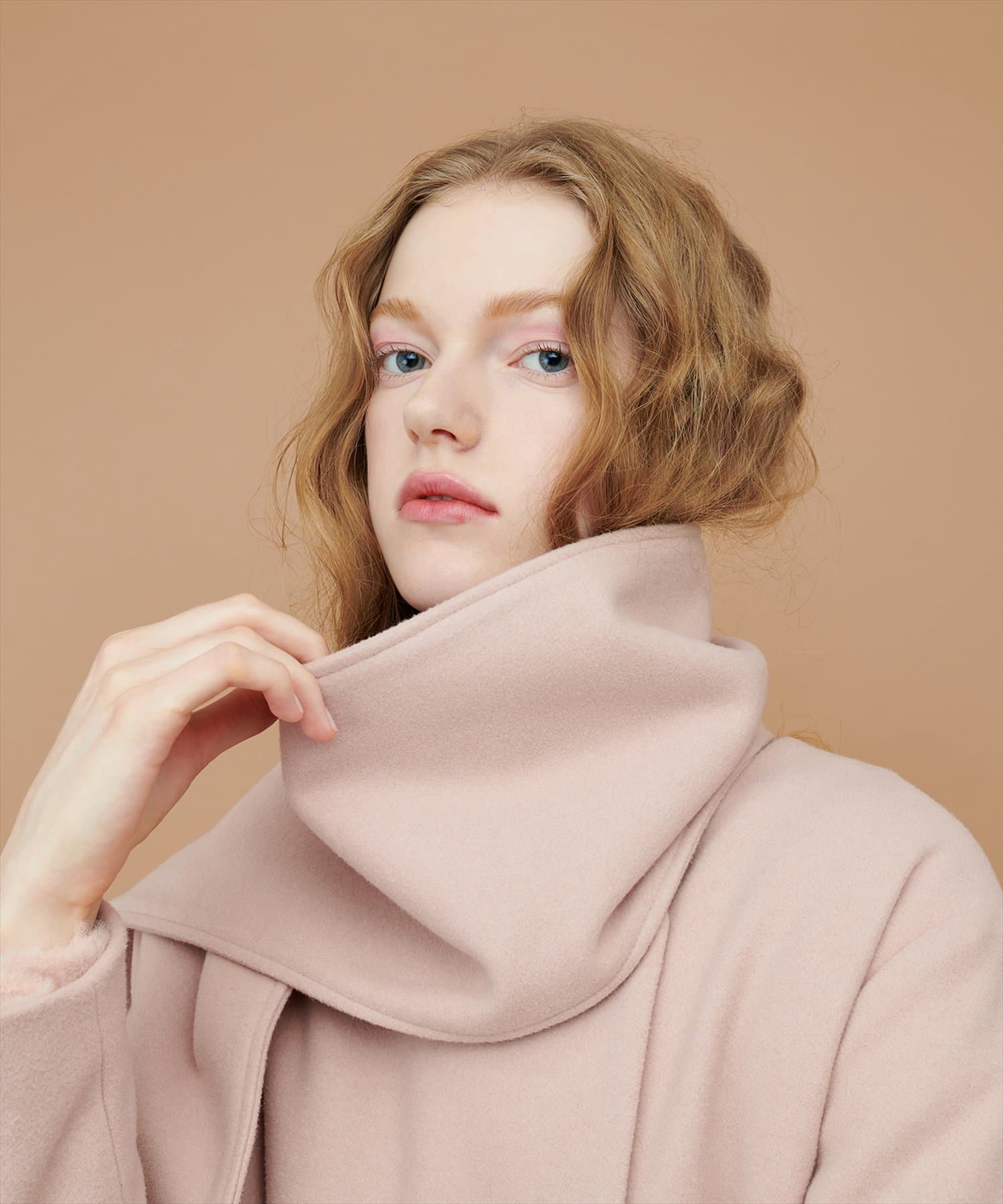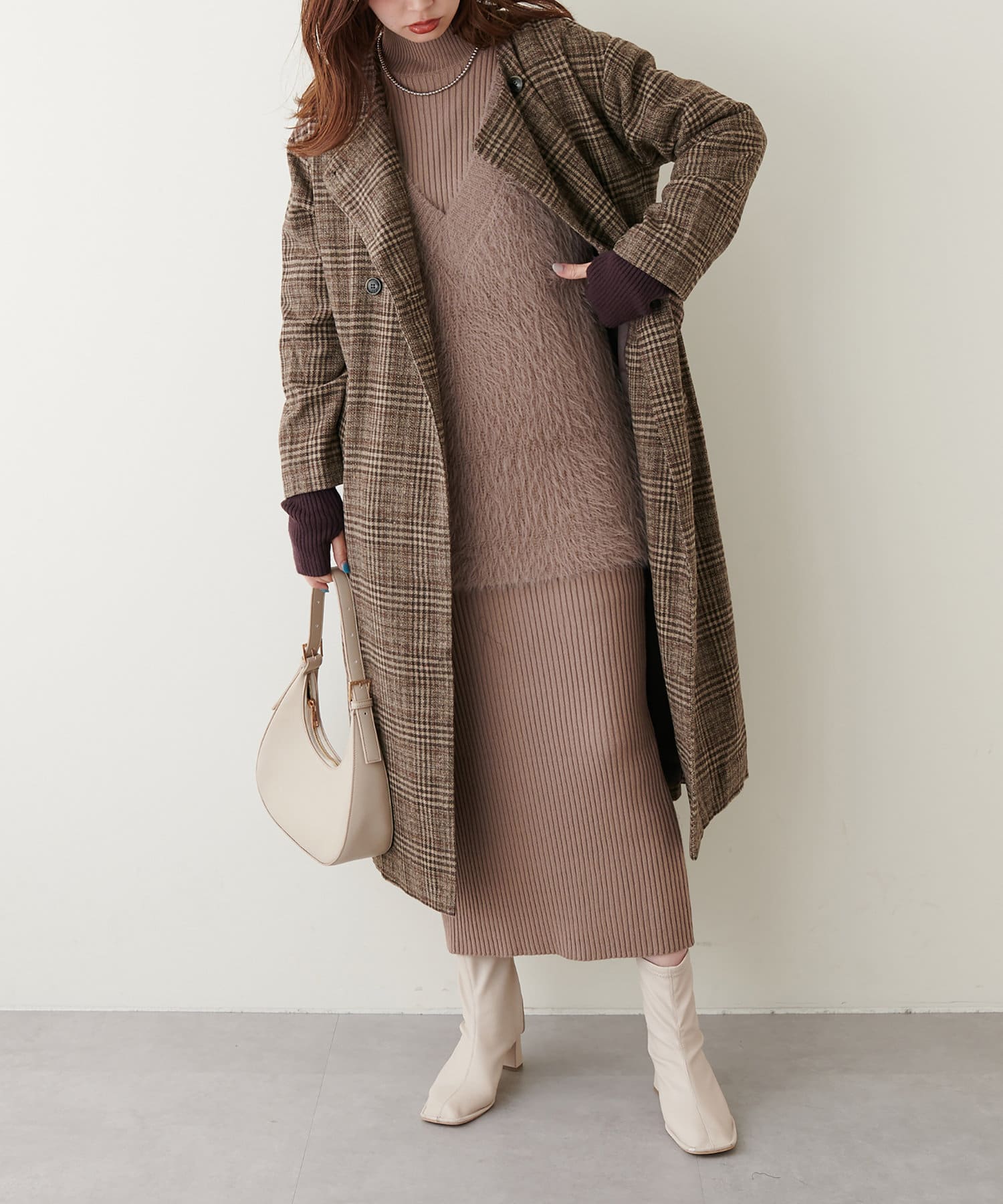 クルーネックのコートなので首元にデザインのあるハイネックのインナーを合わせてメリハリ付けても◎
