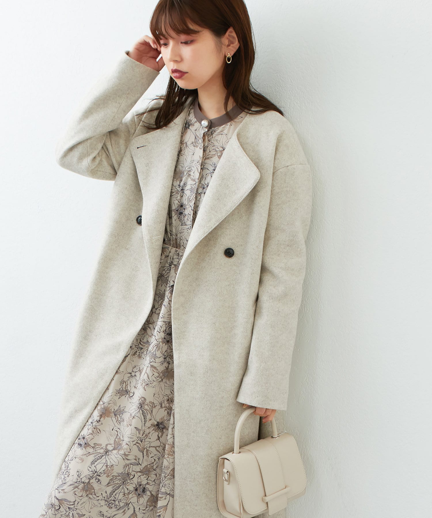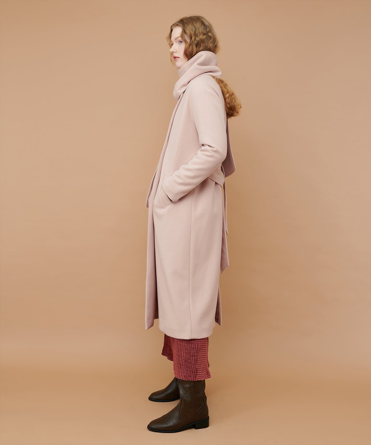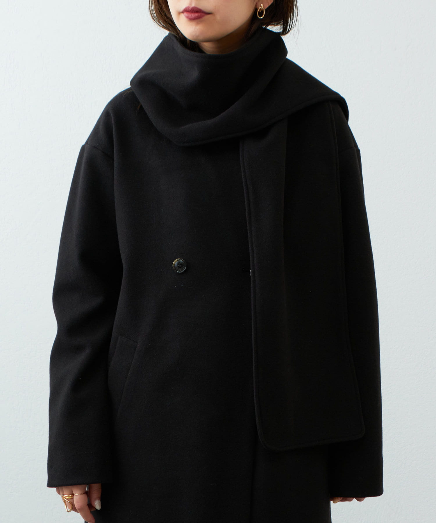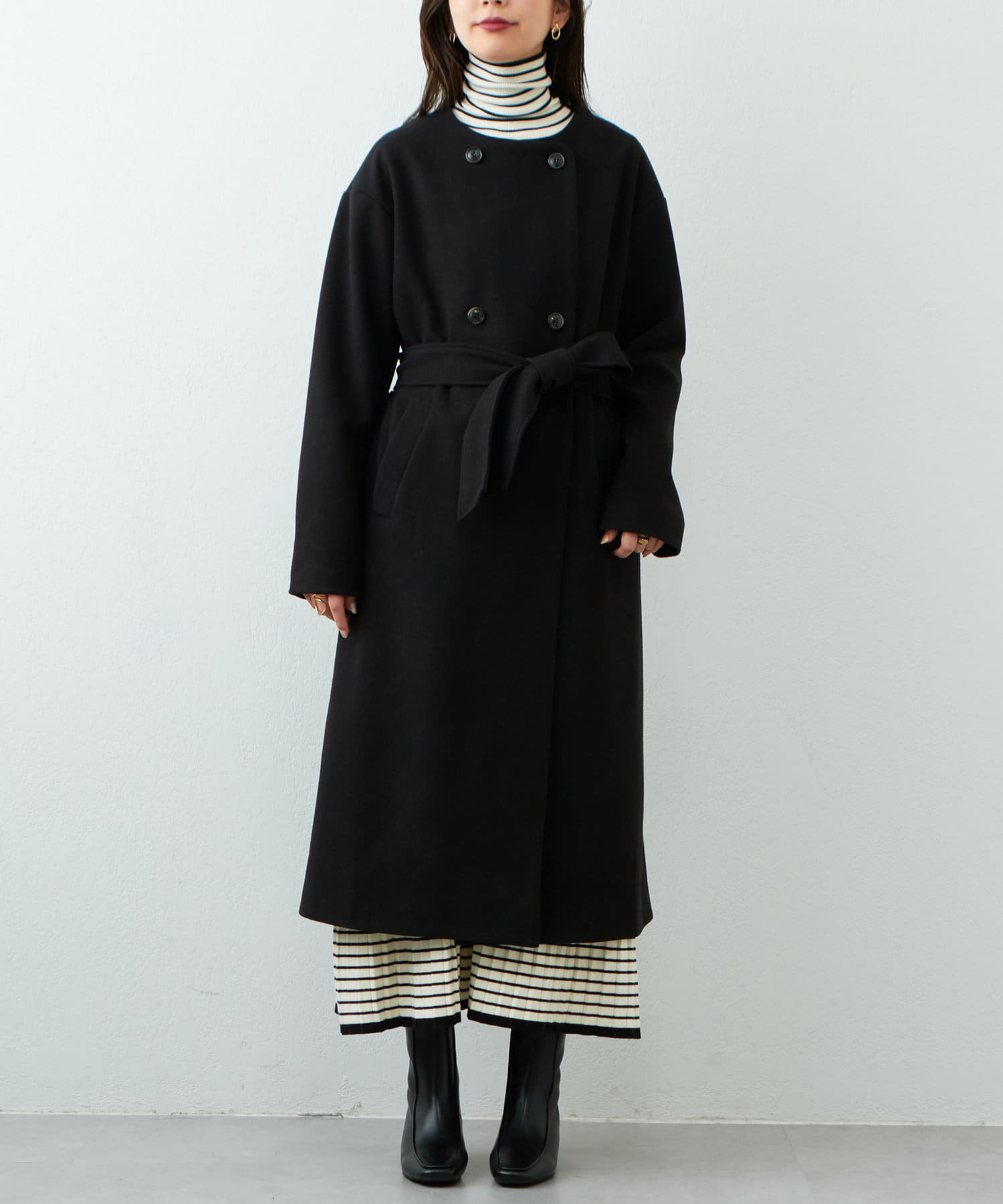 クルーネックのコートなので首元にデザインのあるハイネックのインナーを合わせてメリハリ付けても◎