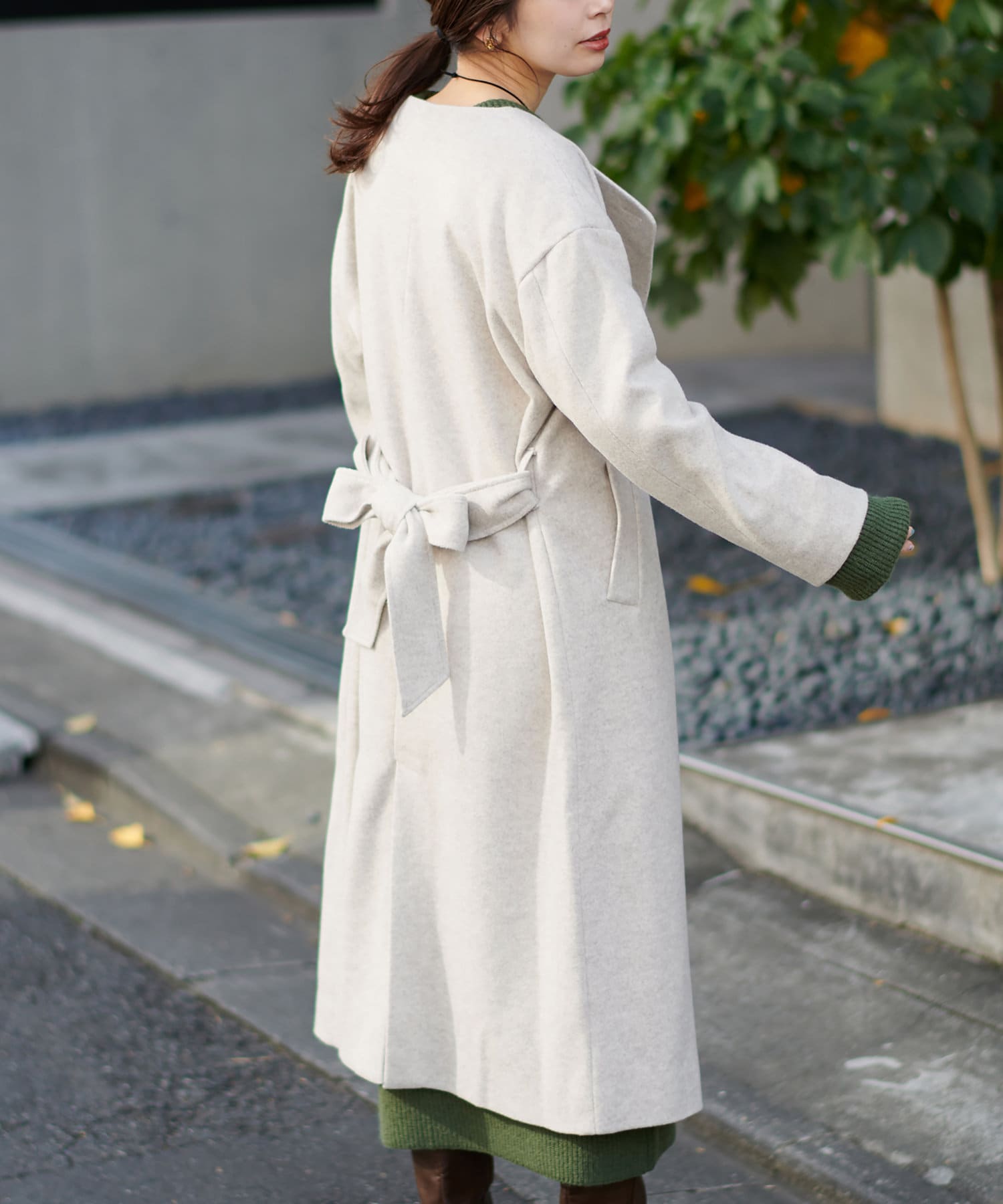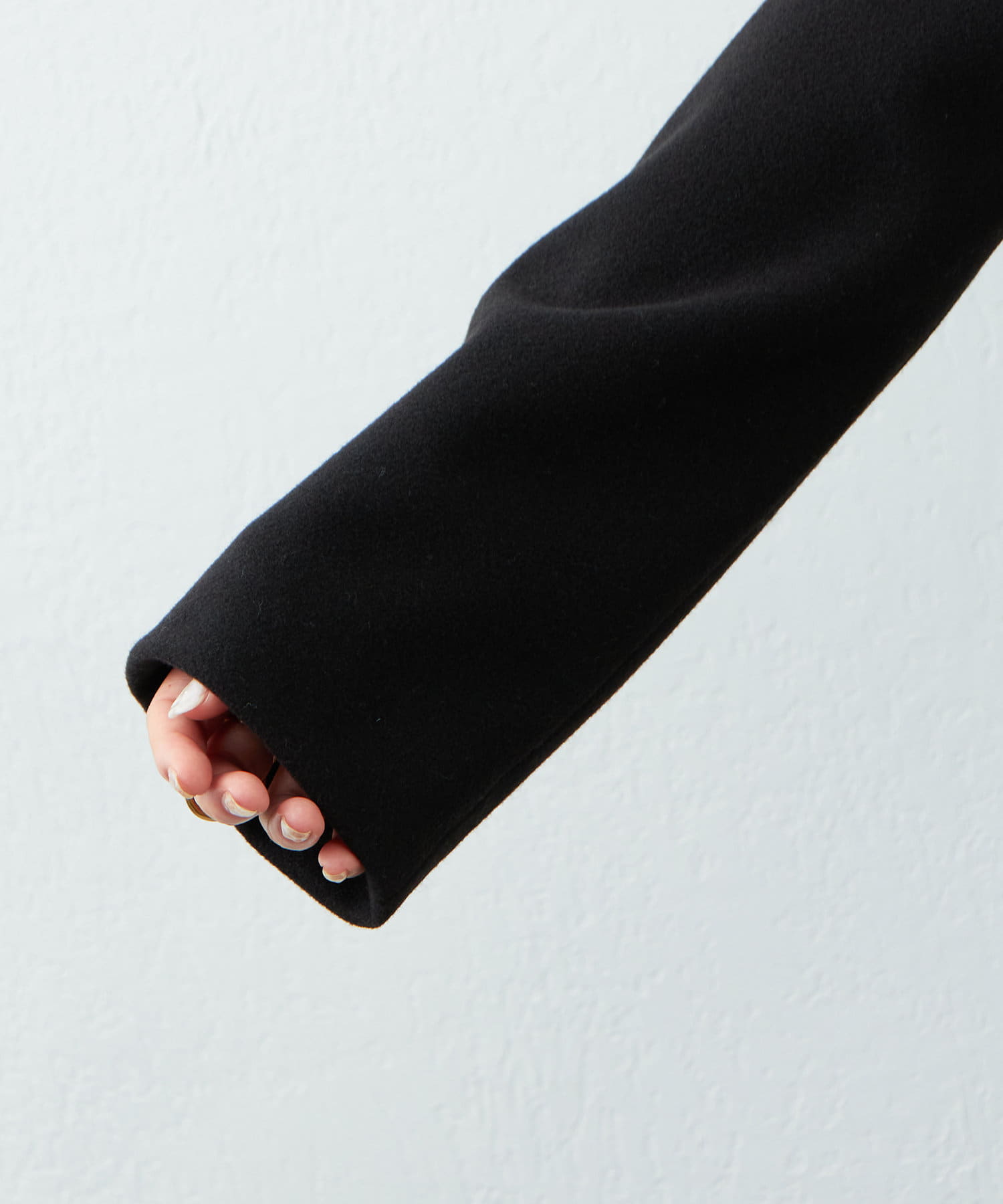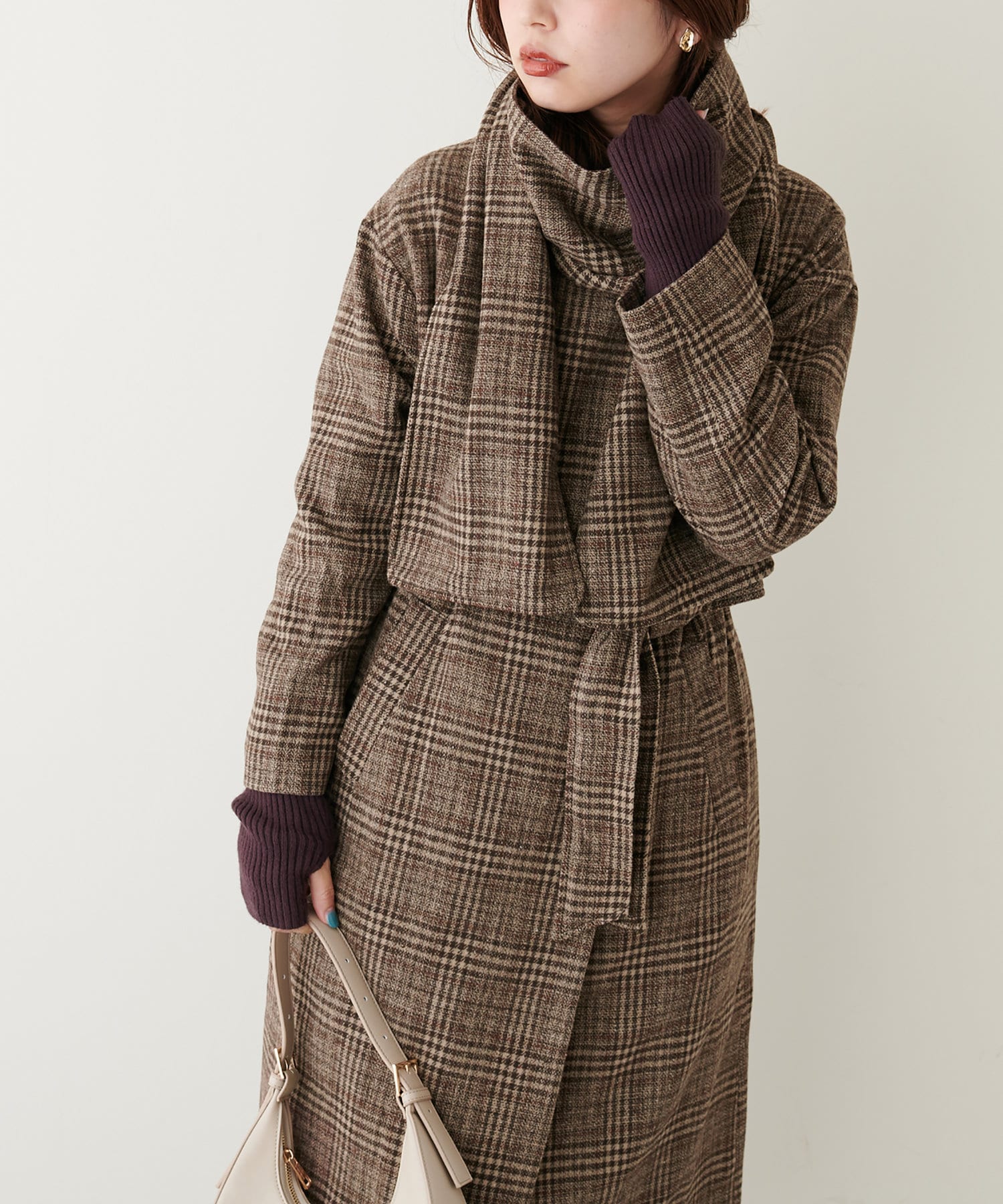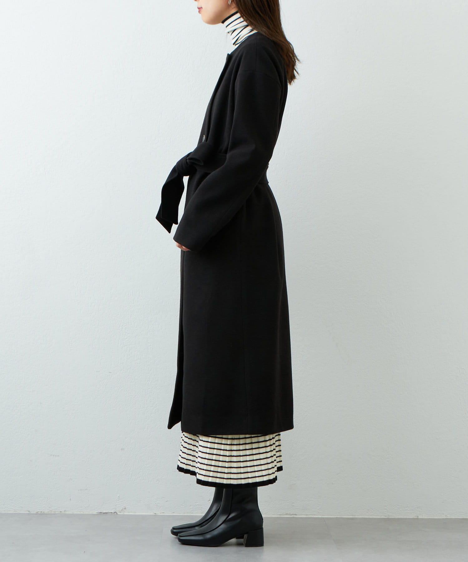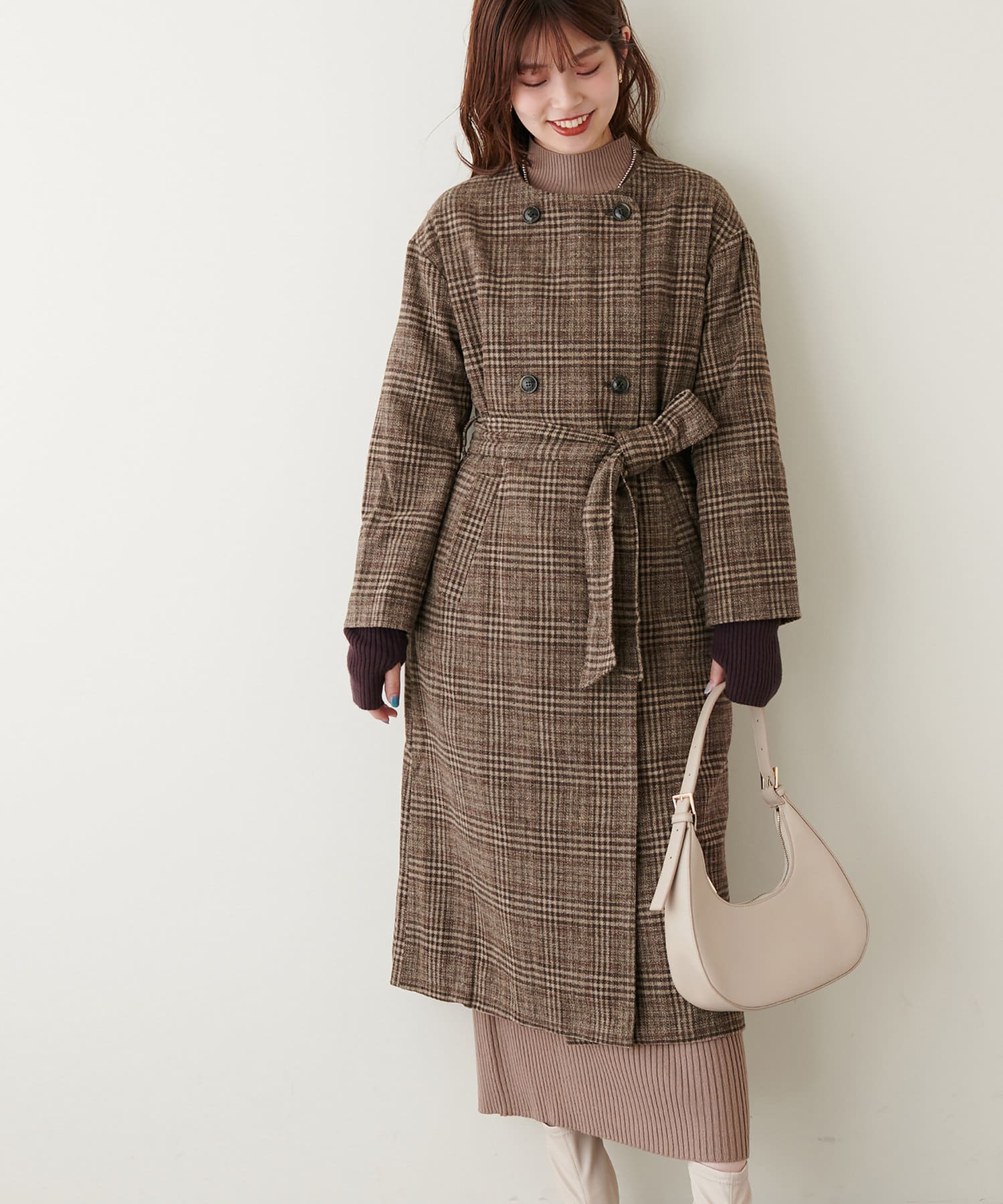 クルーネックのコートなので首元にデザインのあるハイネックのインナーを合わせてメリハリ付けても◎