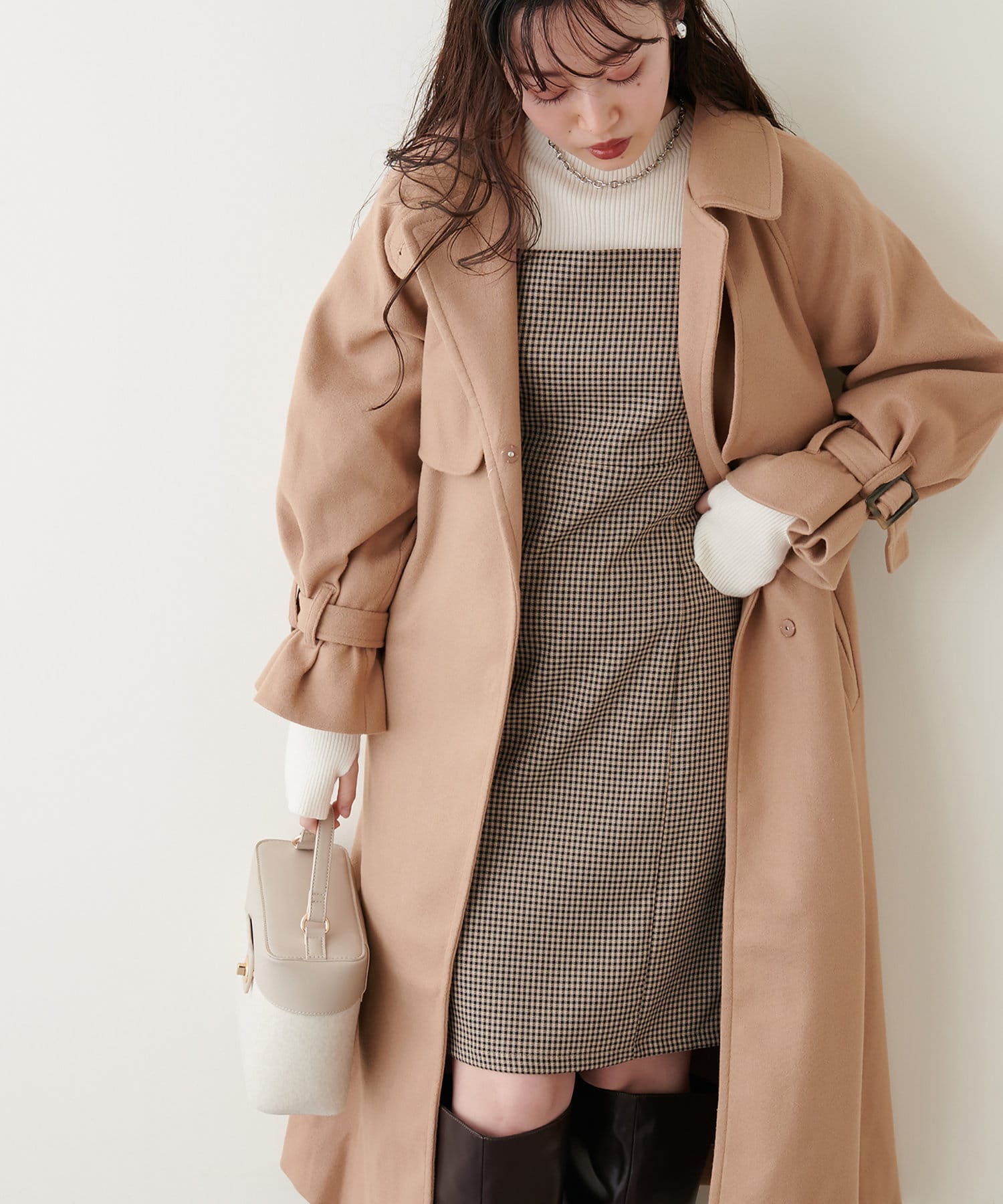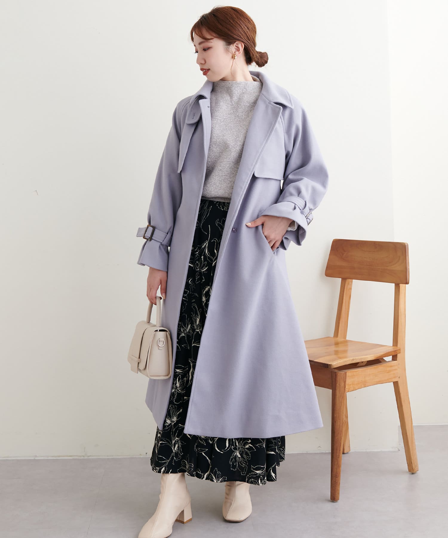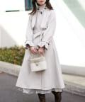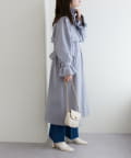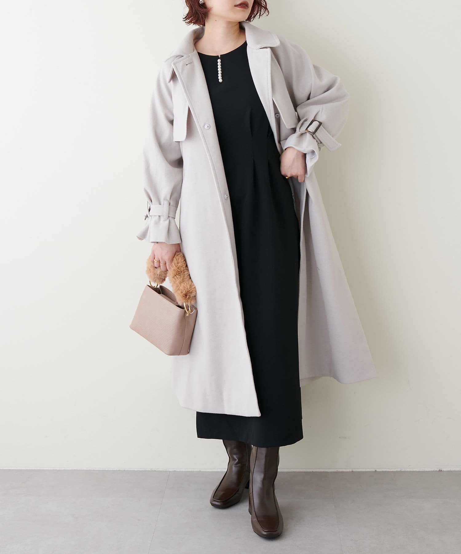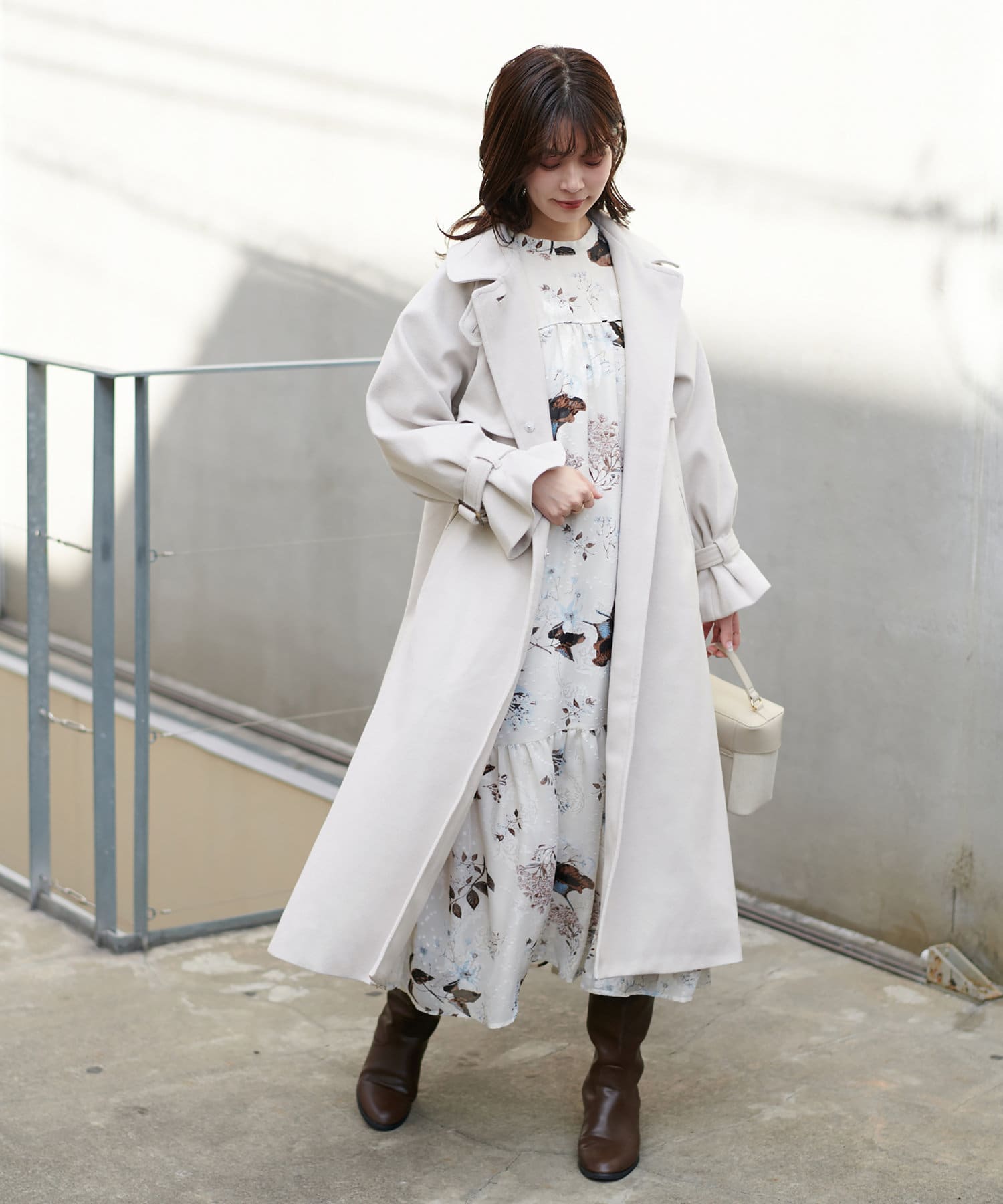 前を閉めるとふんわり裾の広がるワンピースようなシルエットになり、コーデにエレガントさをプラスしてくれます。