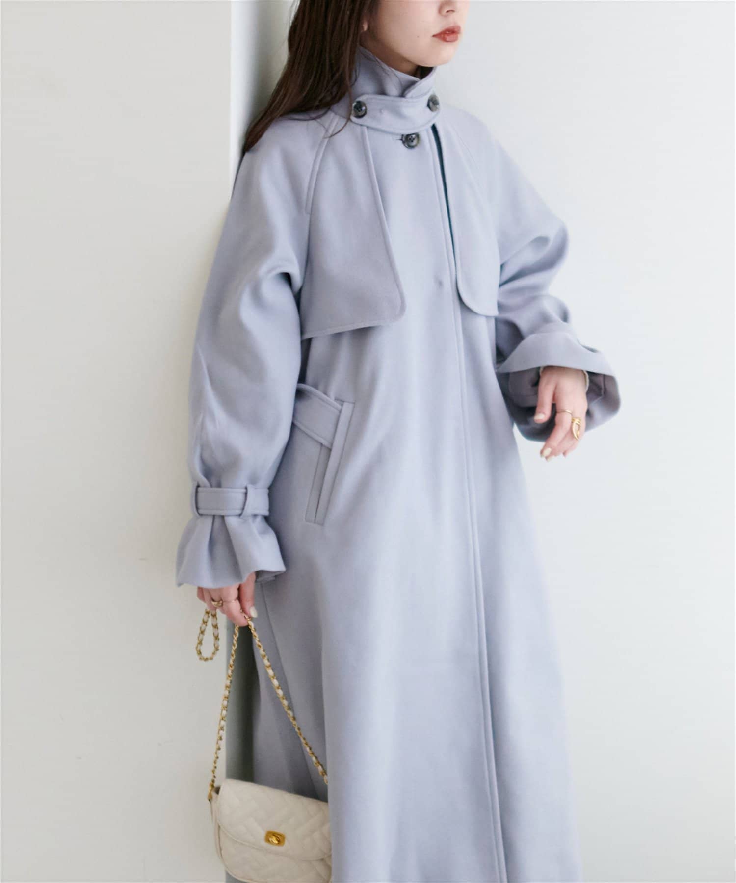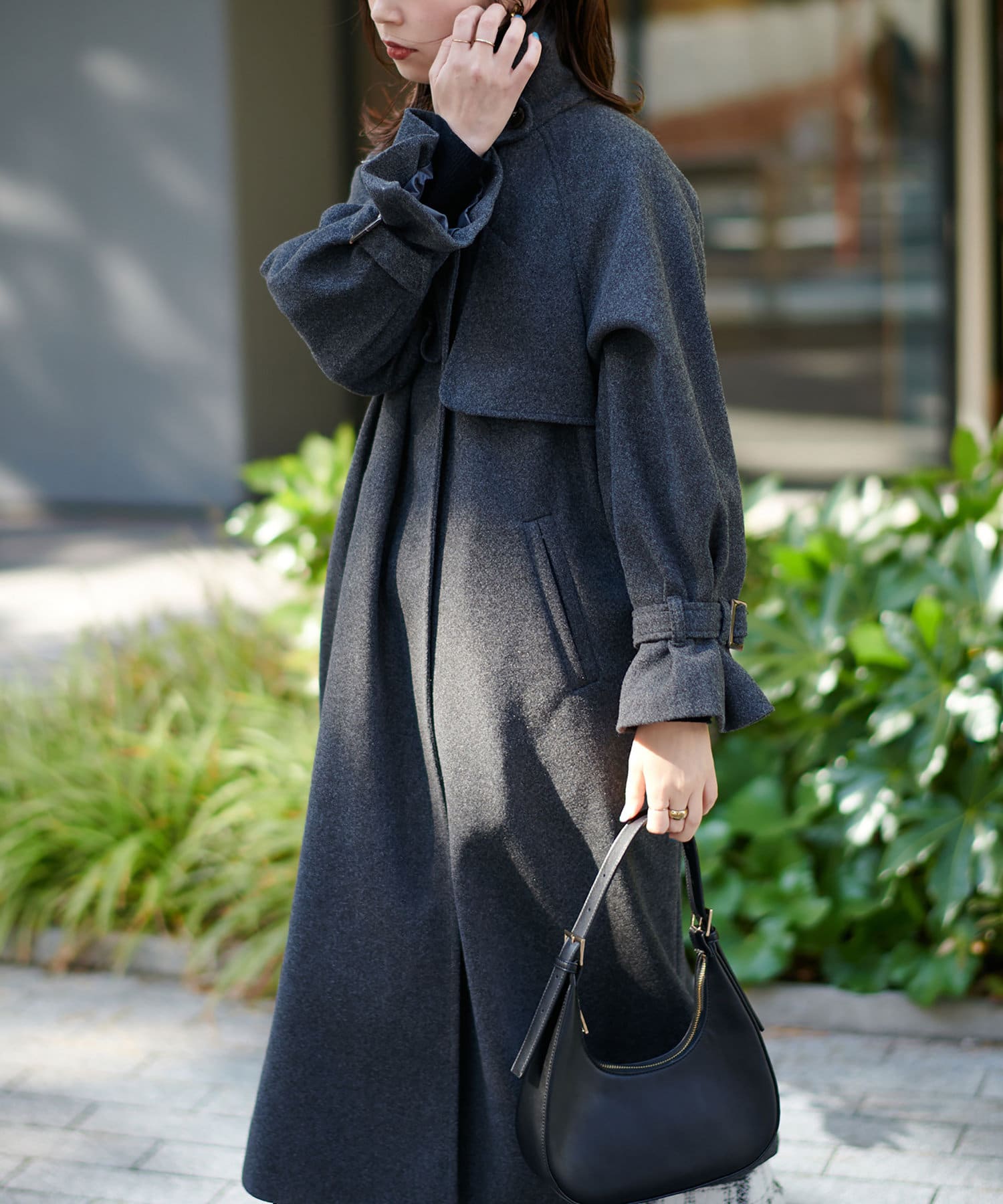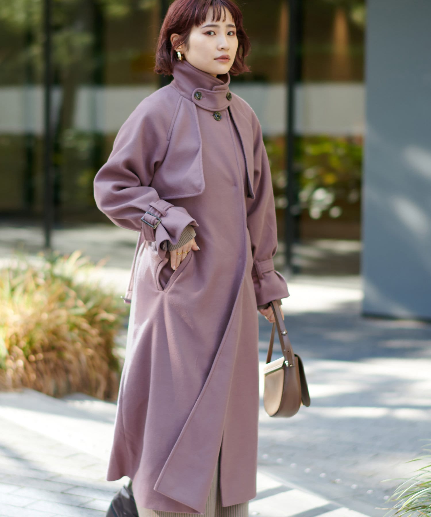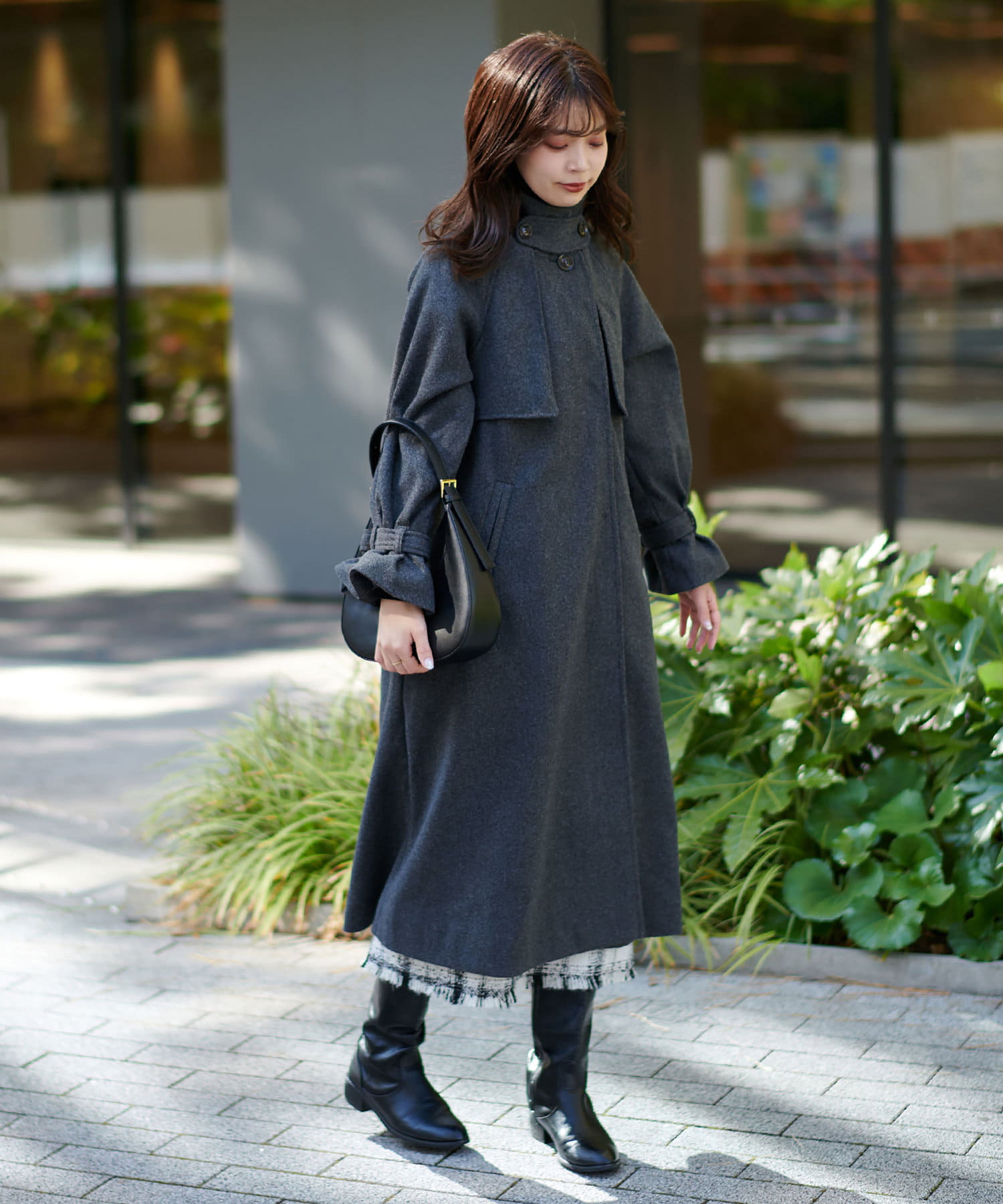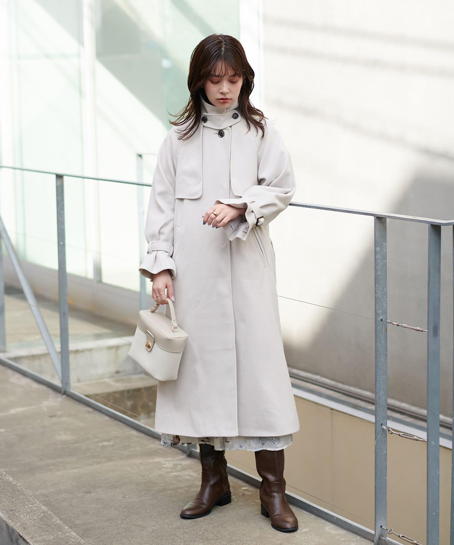 トレンド感のあるスタンドカラーがポイントのロングコートの登場。