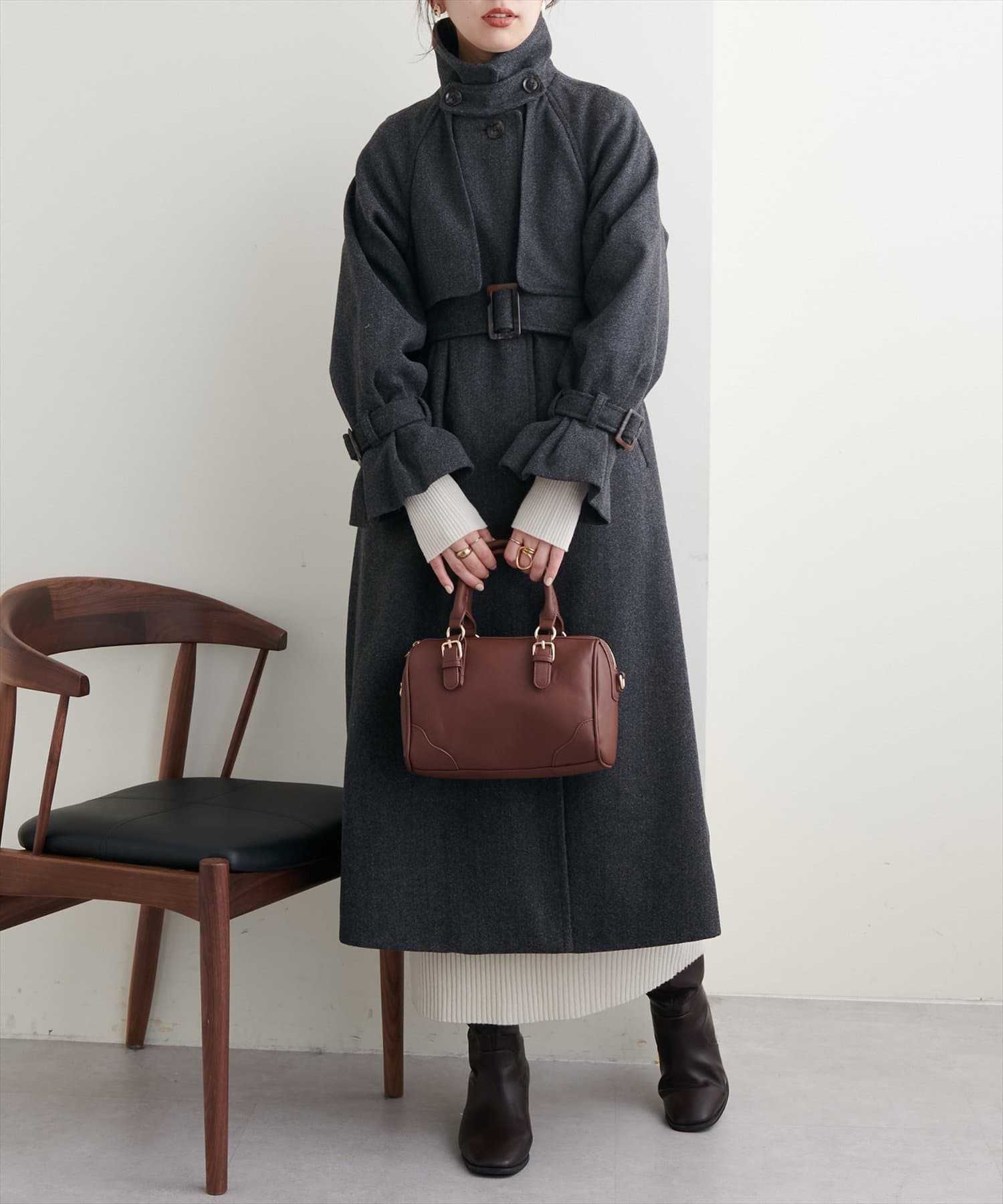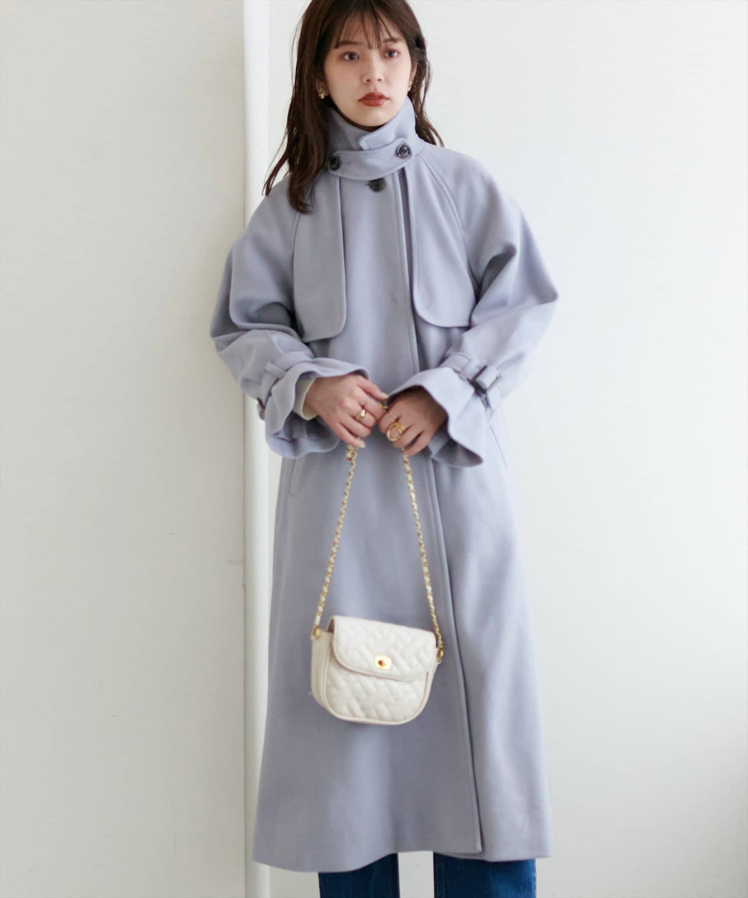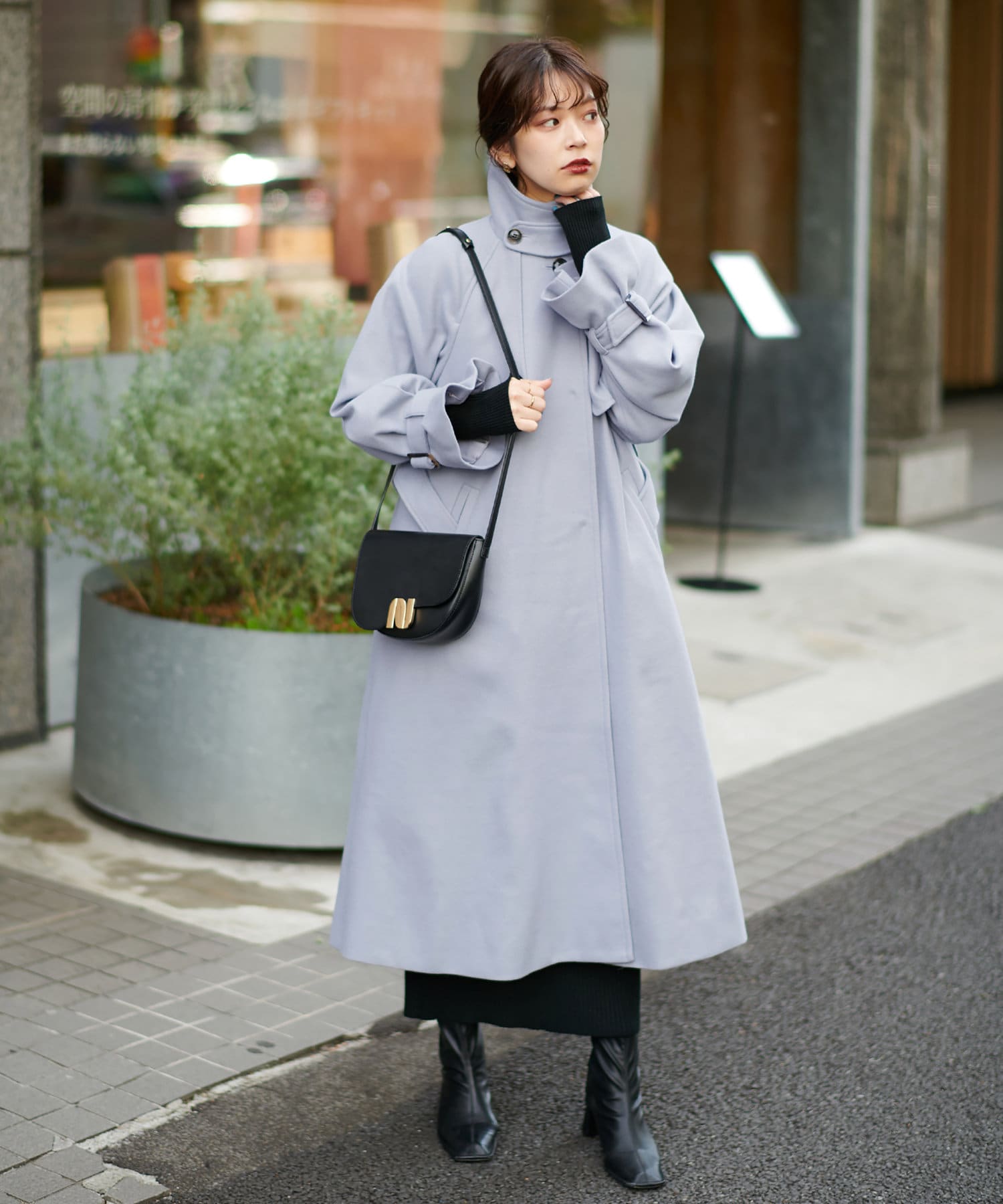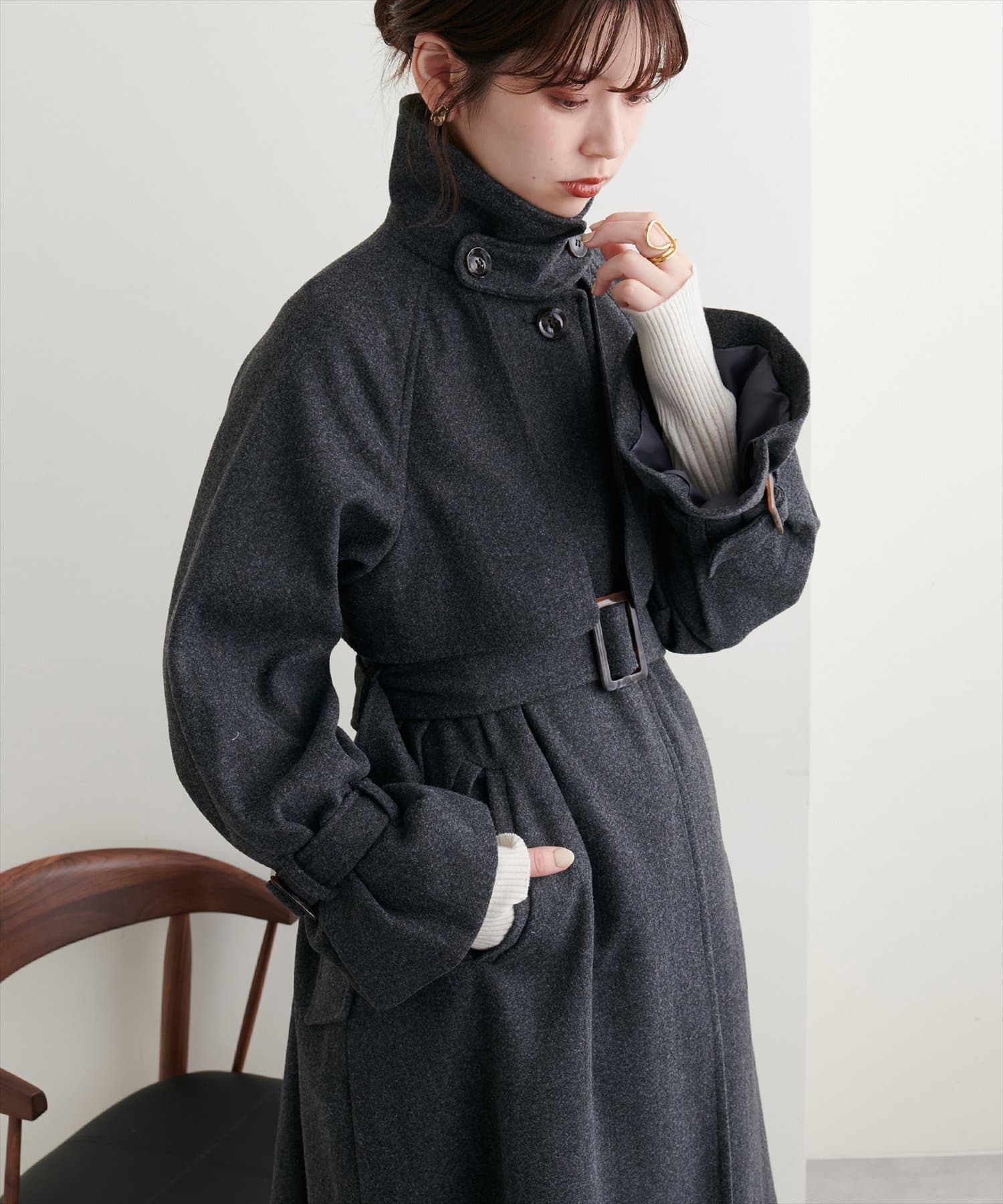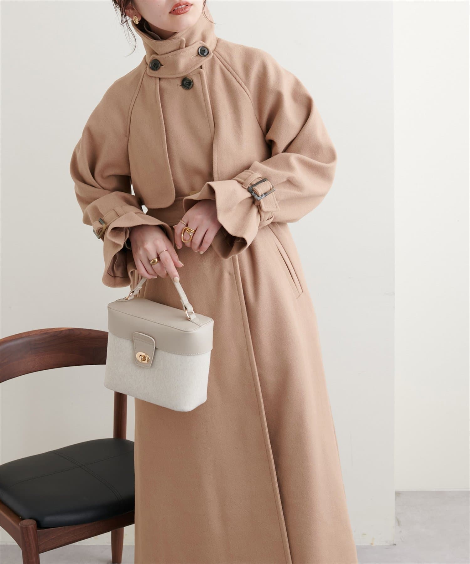 トレンド感のあるスタンドカラーがポイントのロングコートの登場。