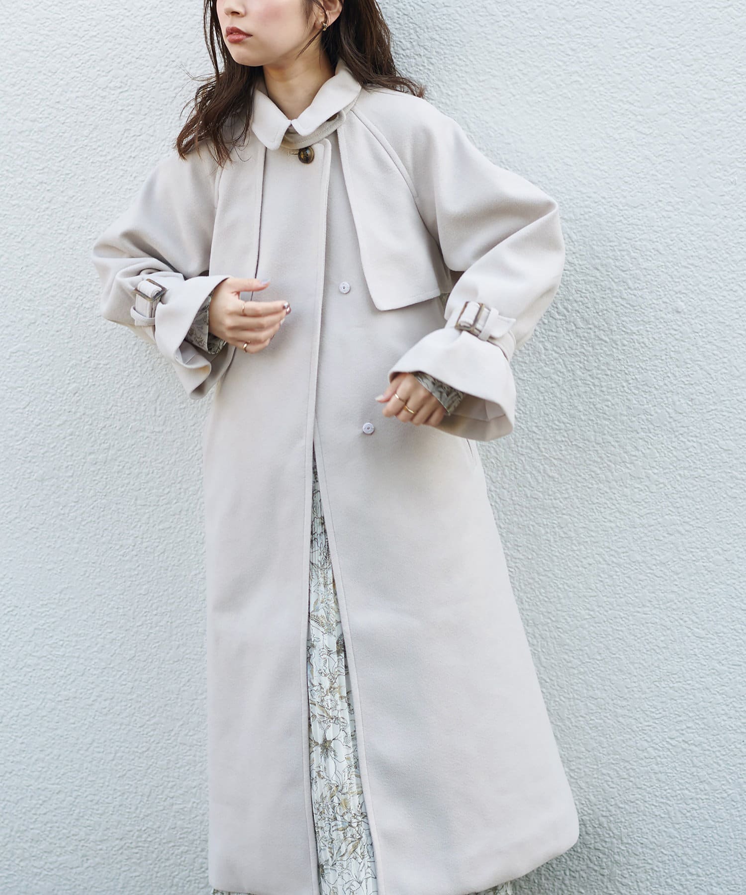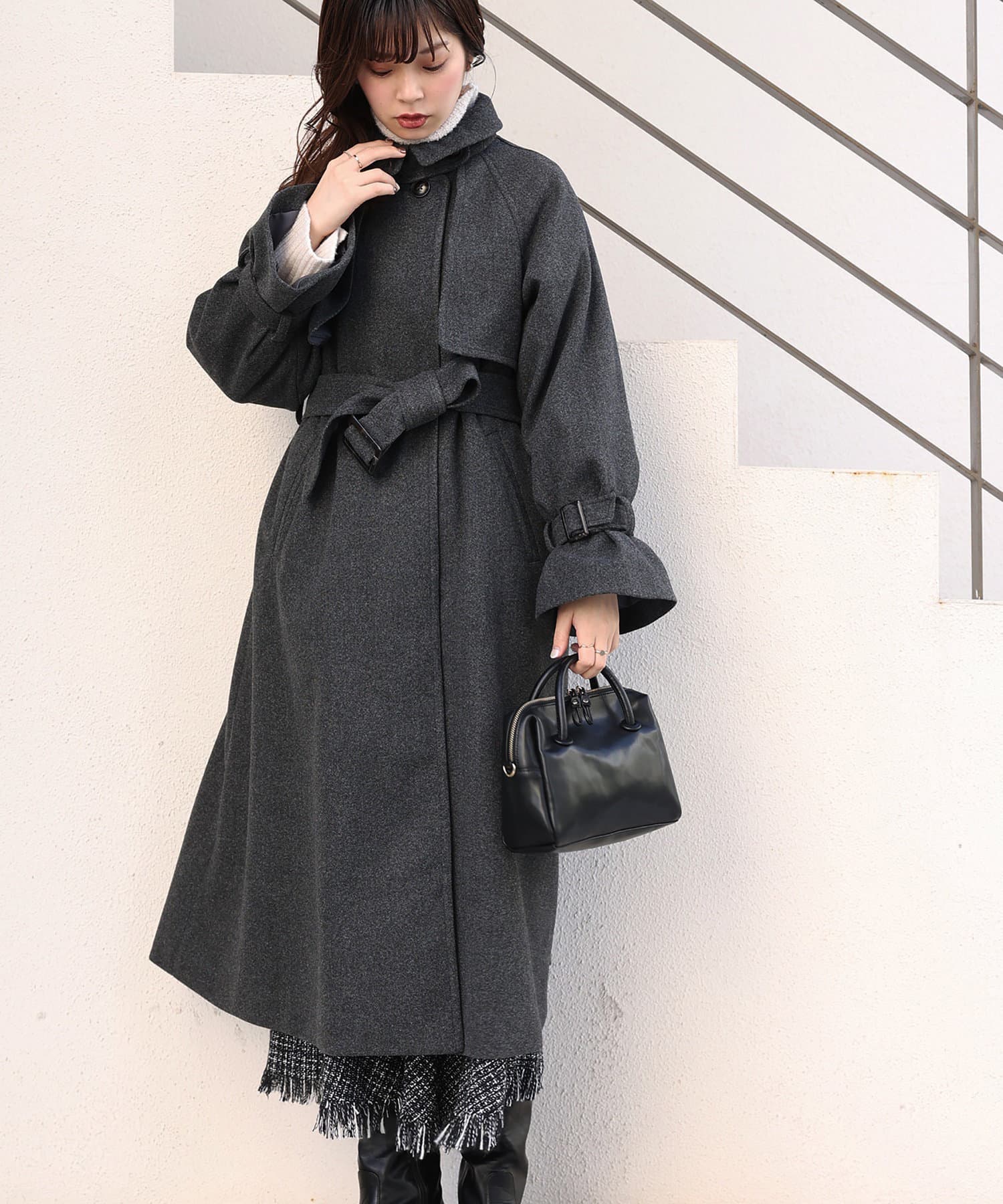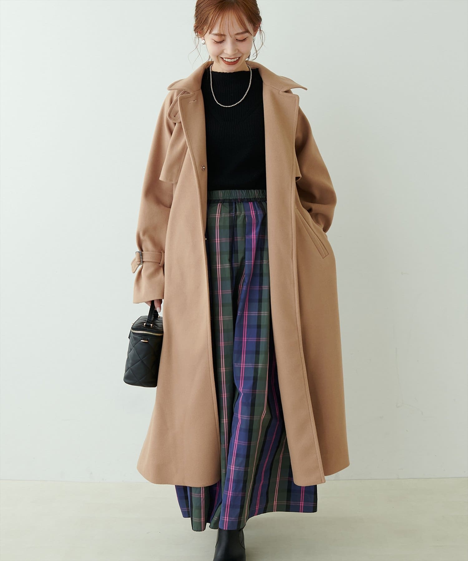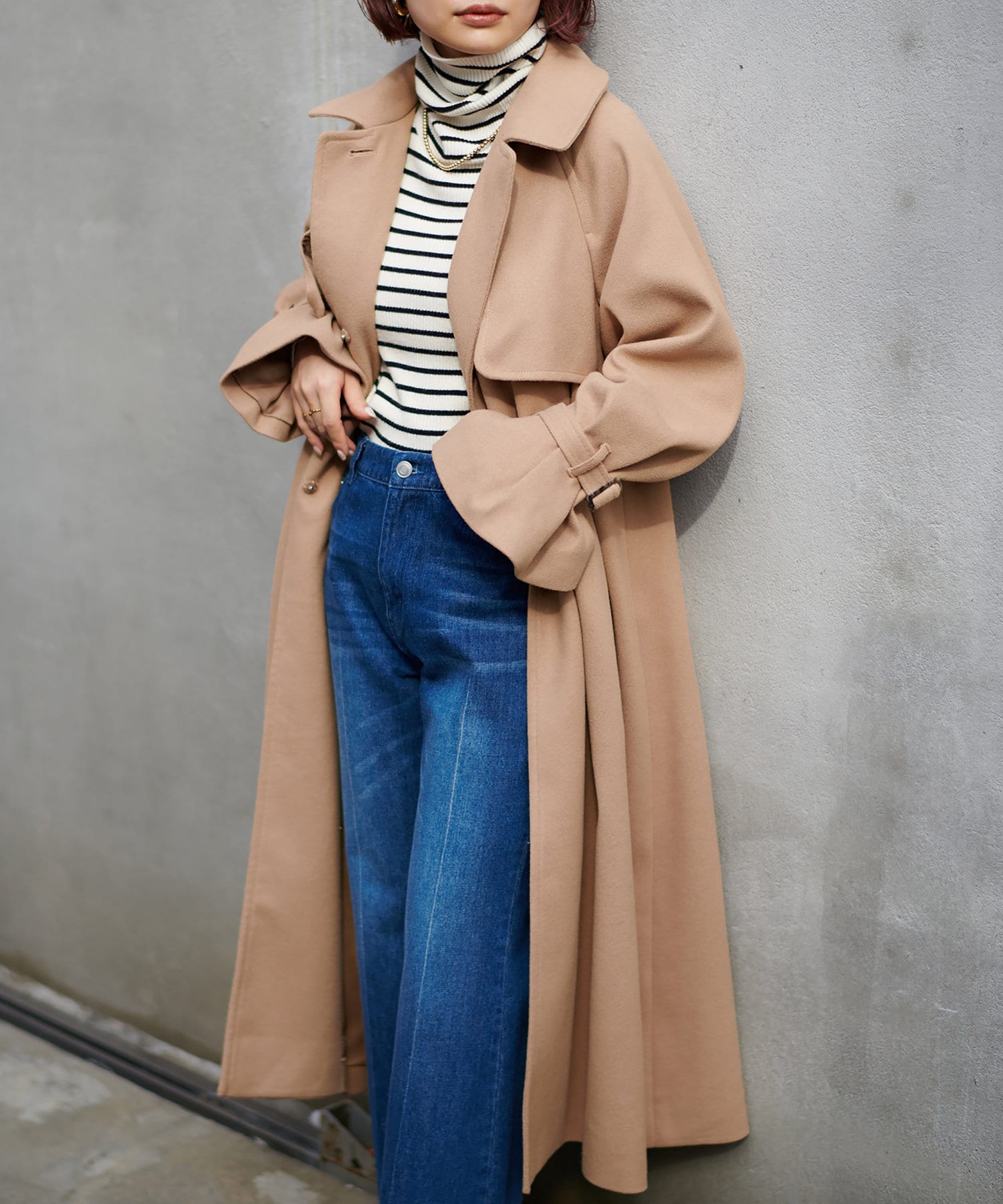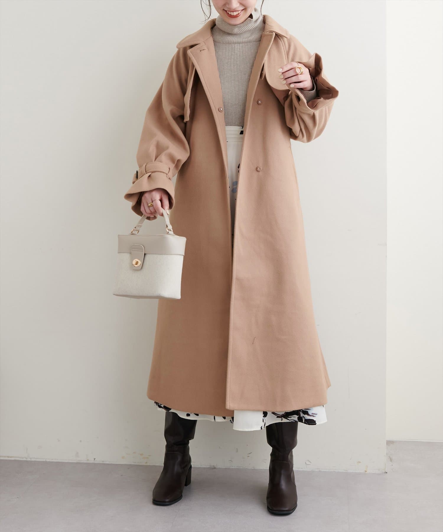 トレンド感のあるスタンドカラーがポイントのロングコートの登場。