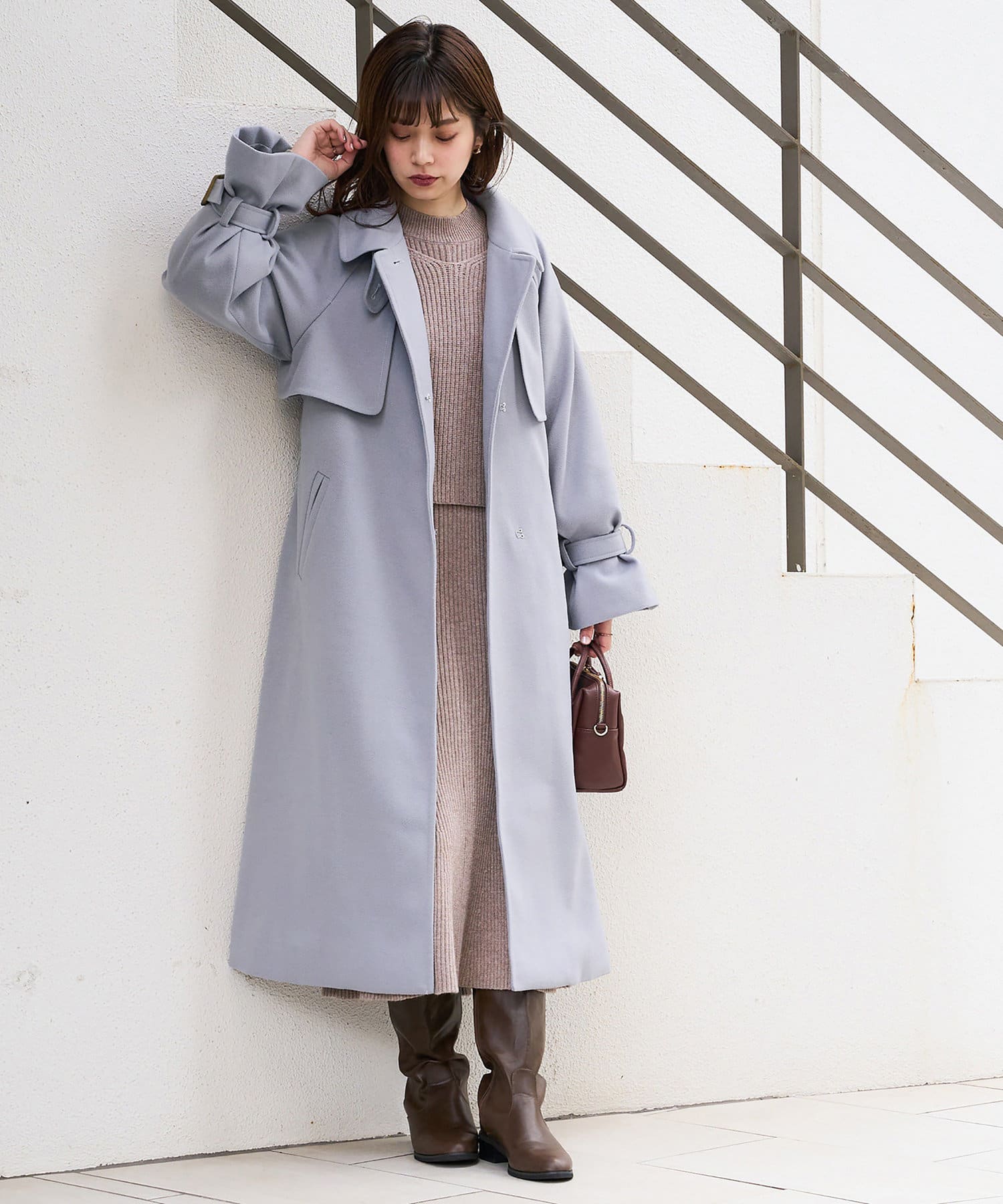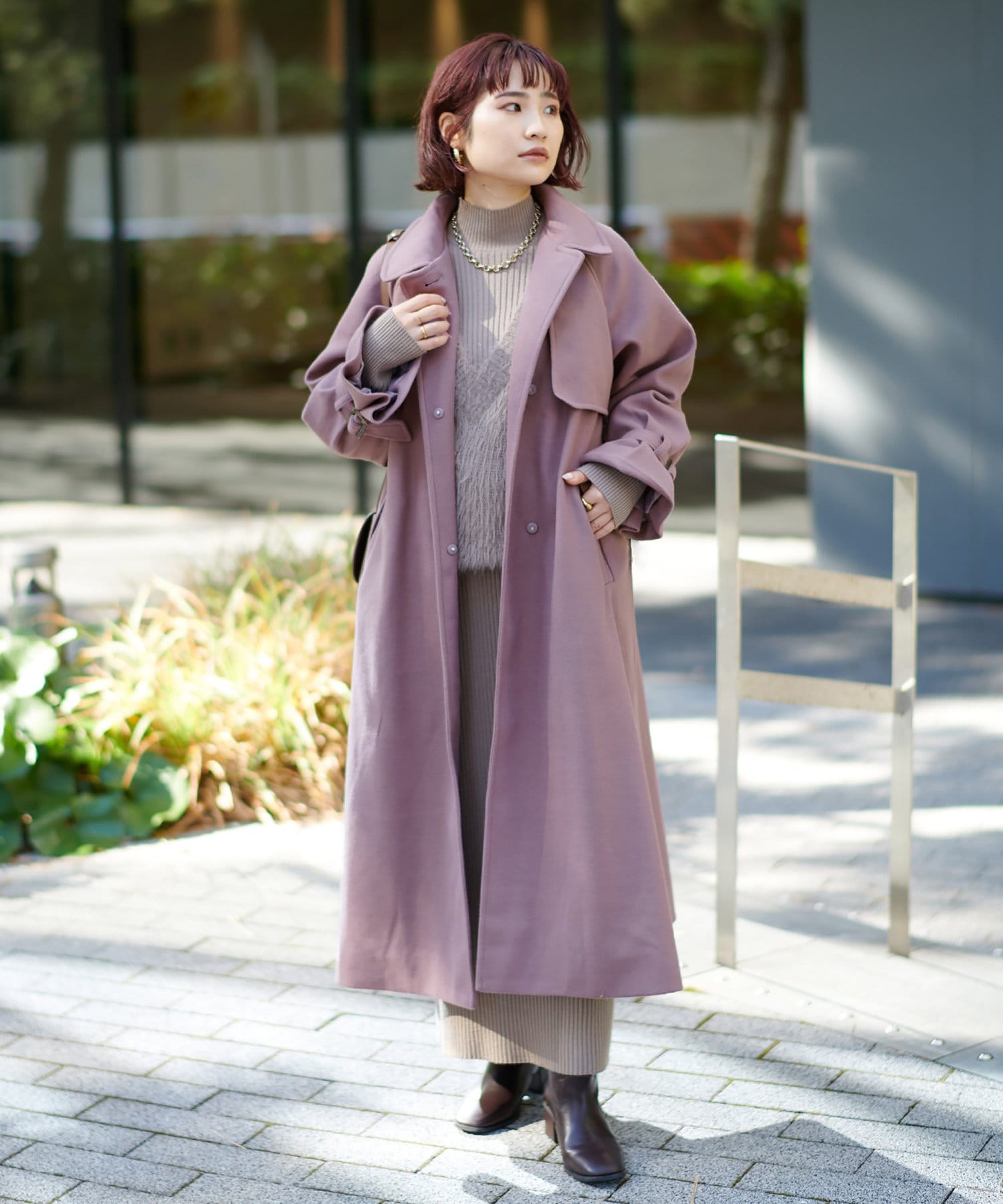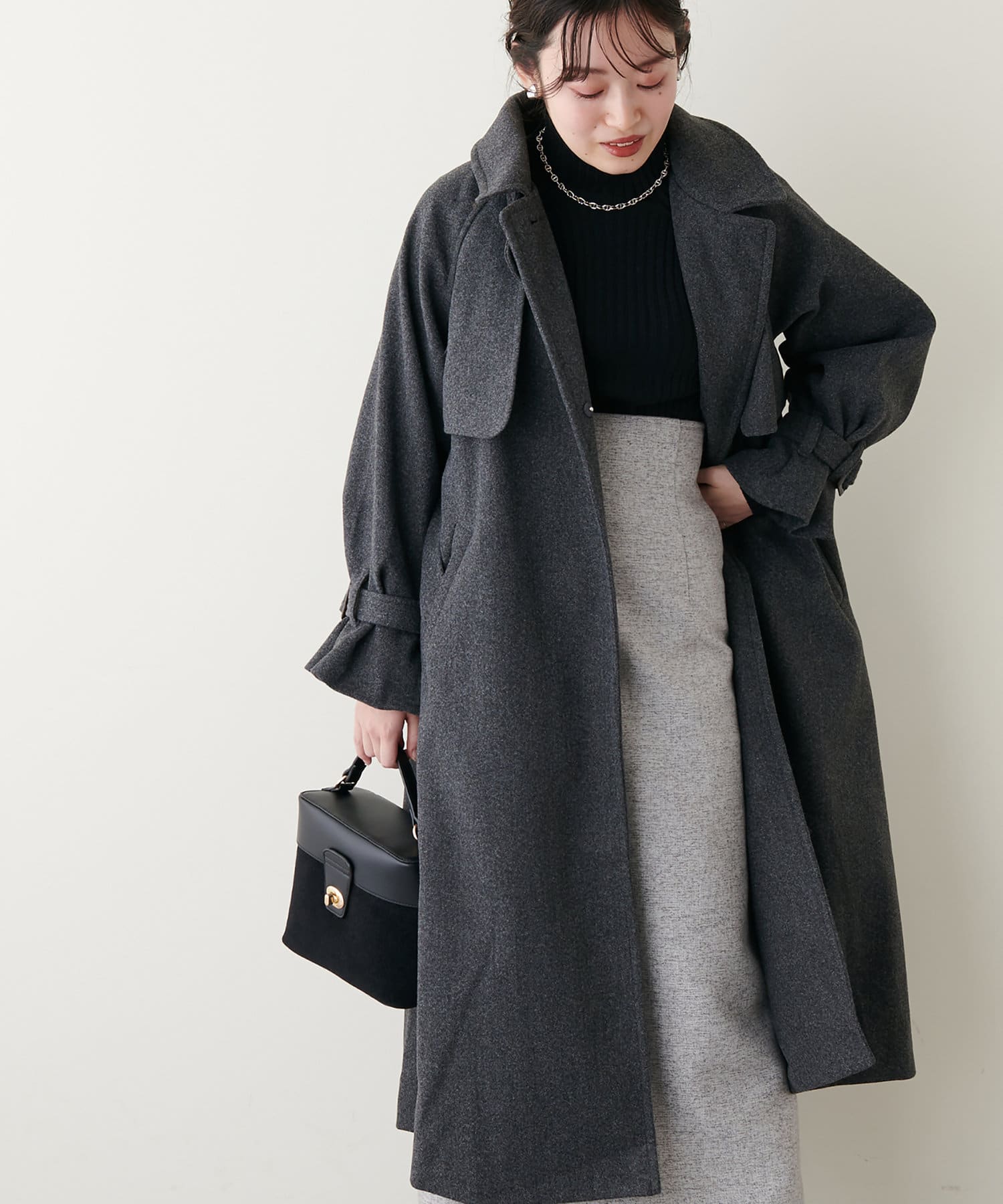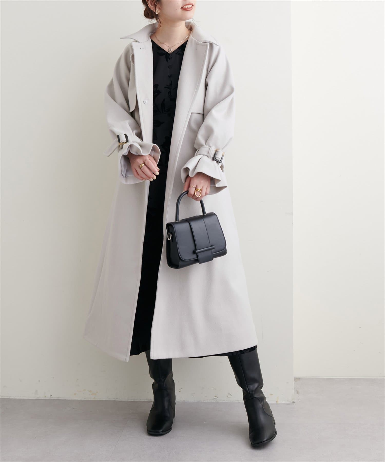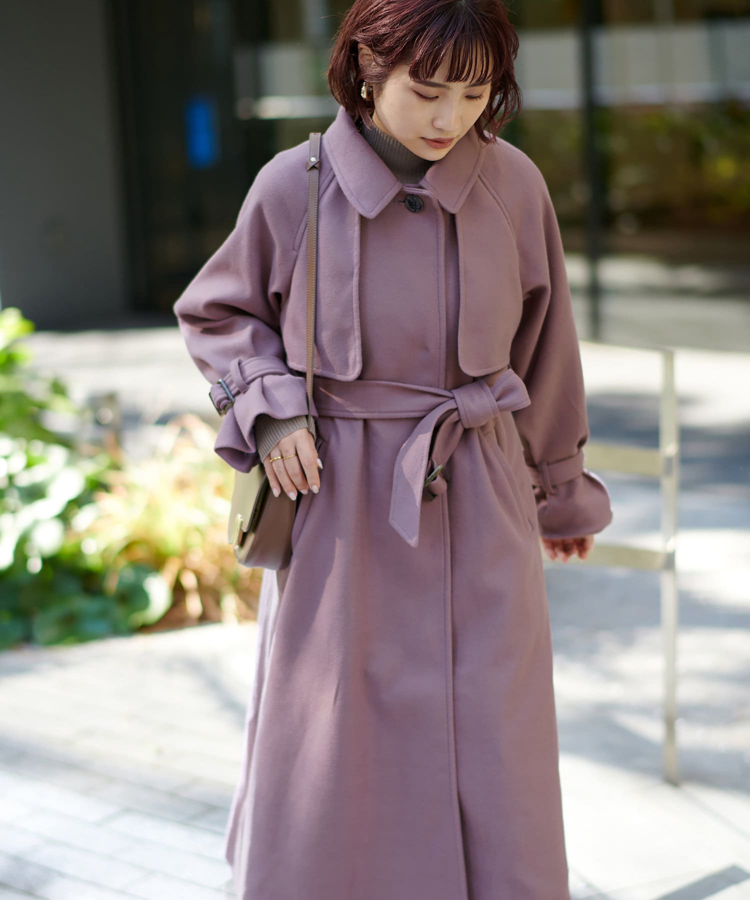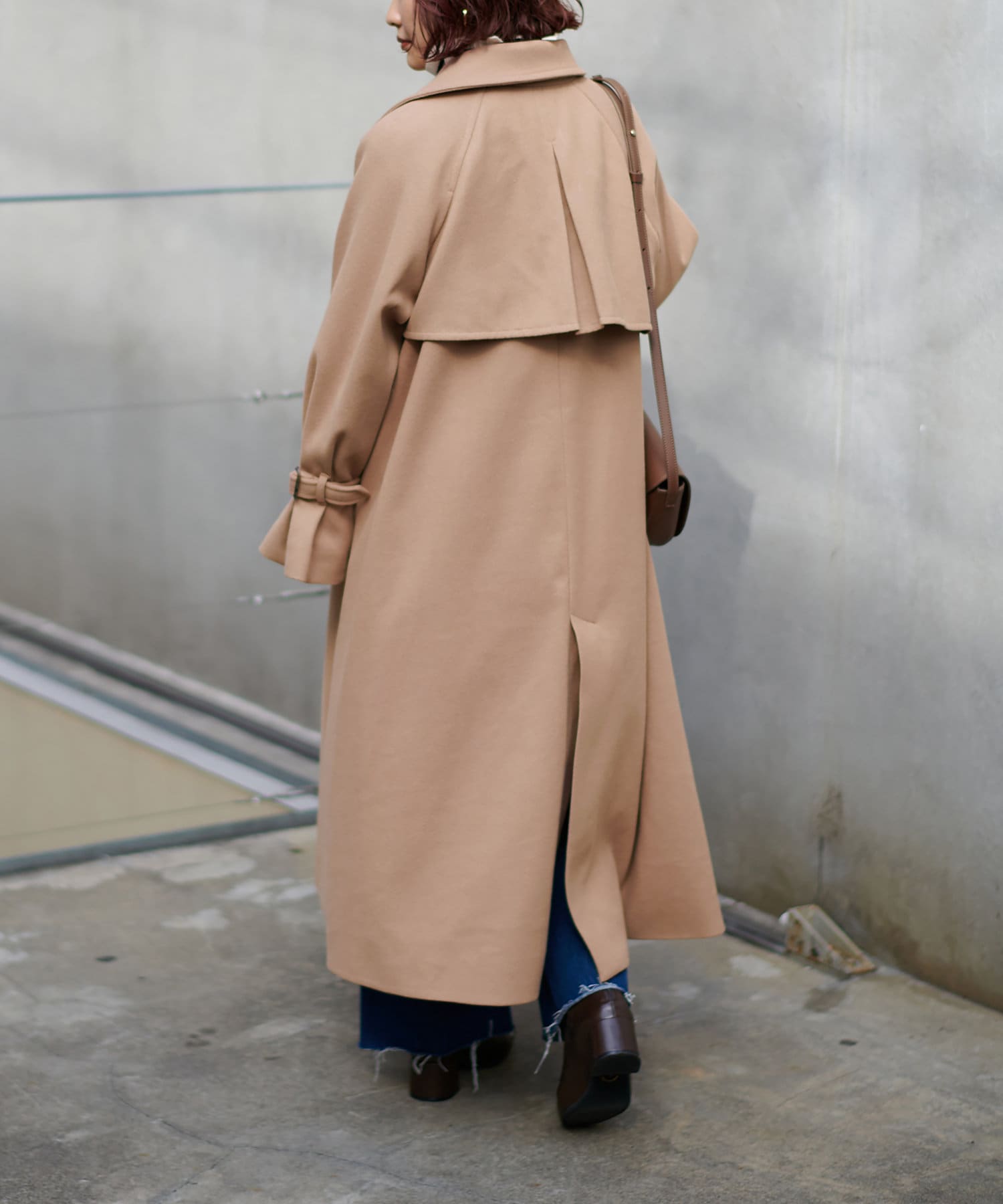 トレンド感のあるスタンドカラーがポイントのロングコートの登場。