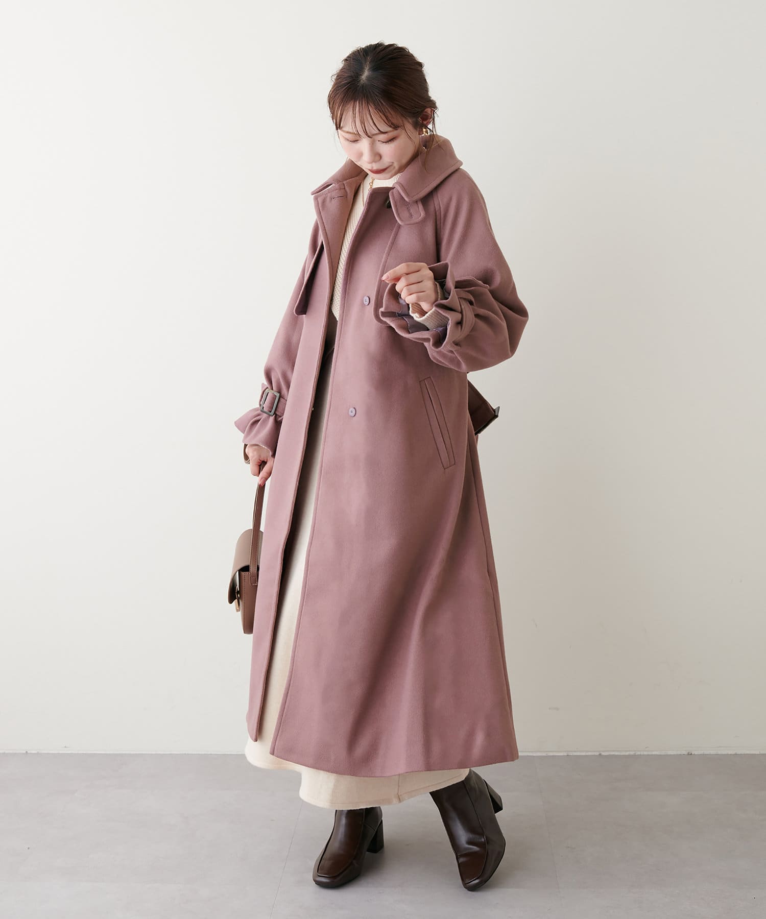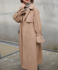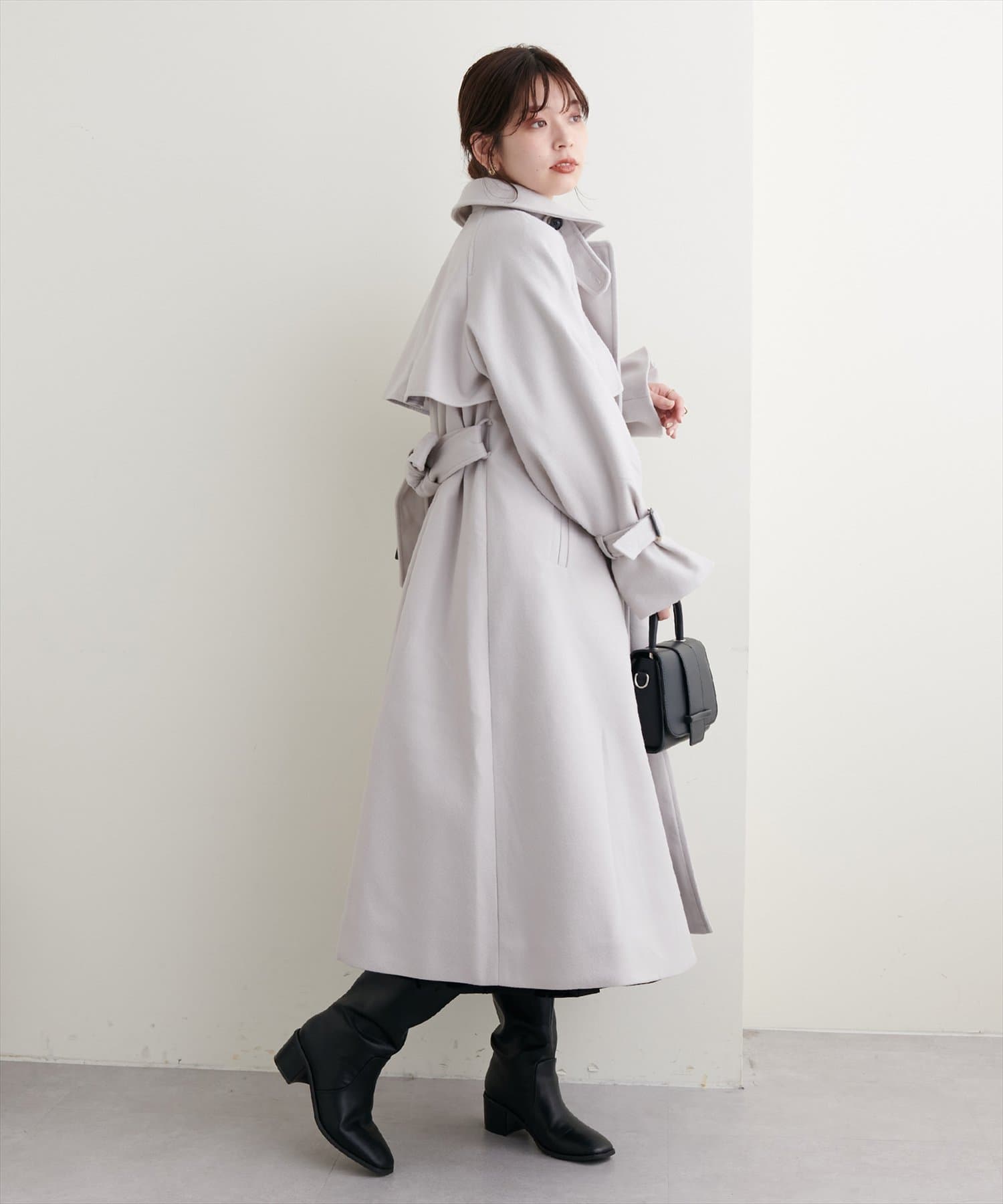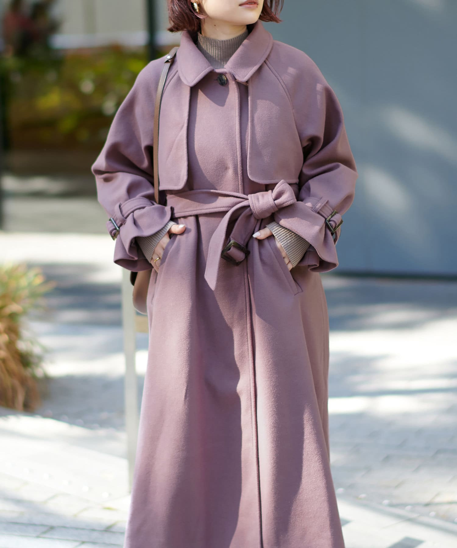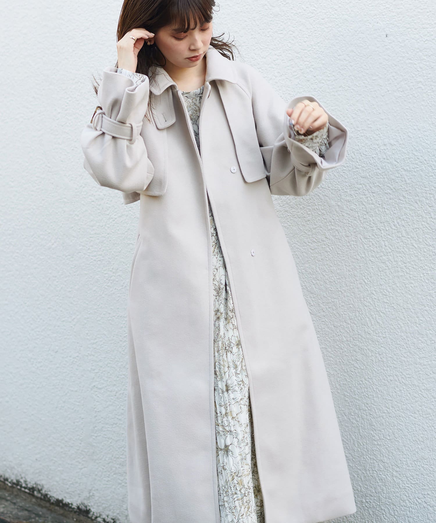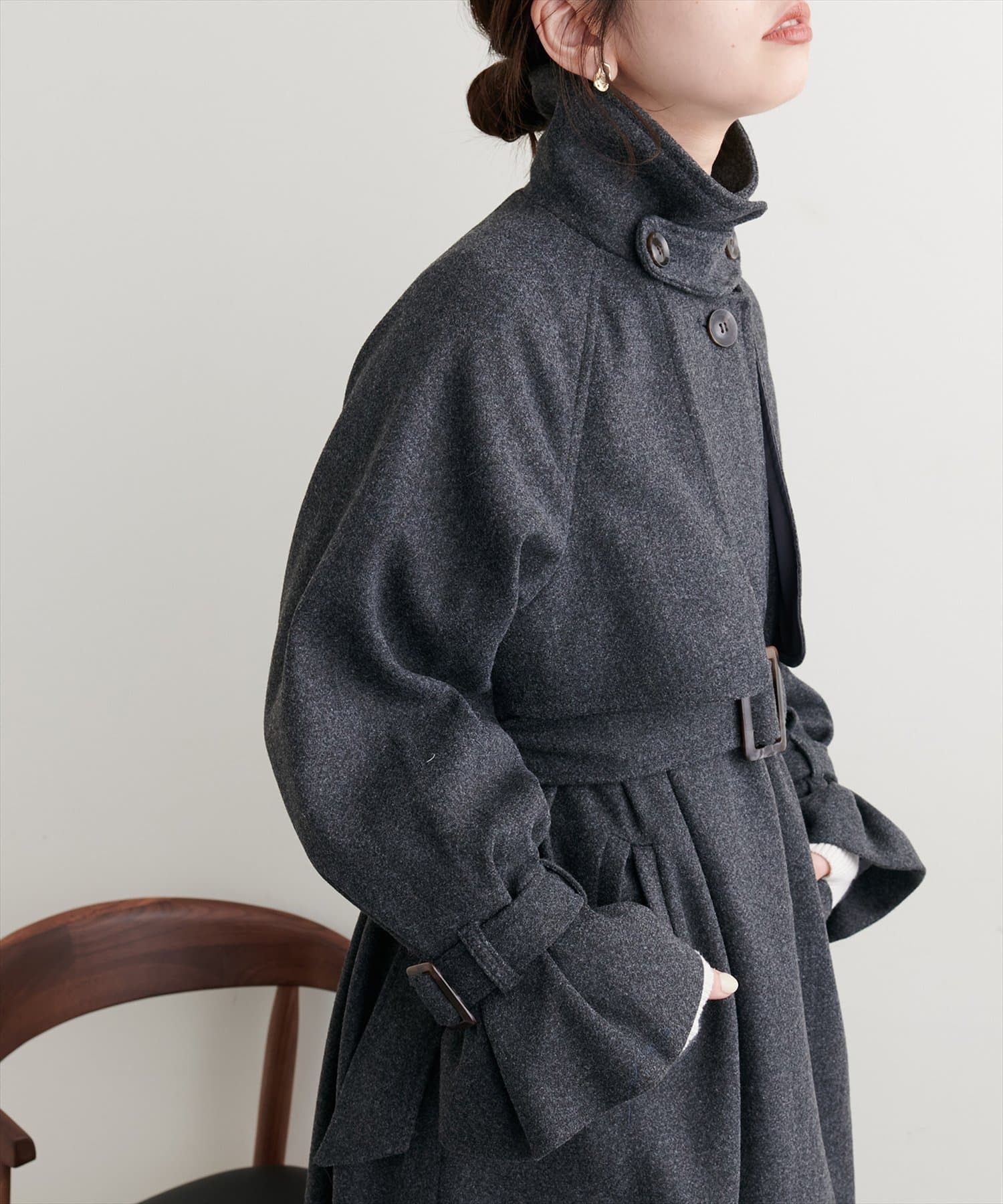 トレンド感のあるスタンドカラーがポイントのロングコートの登場。