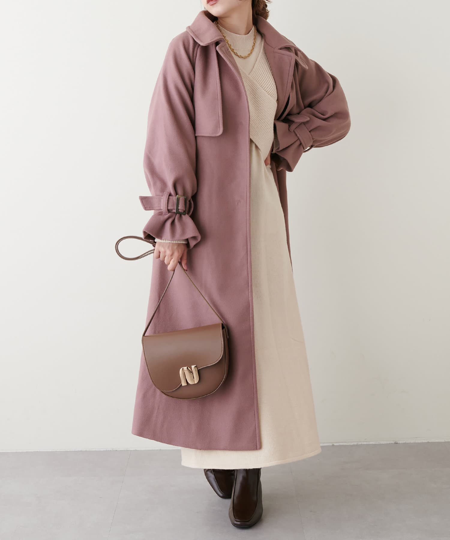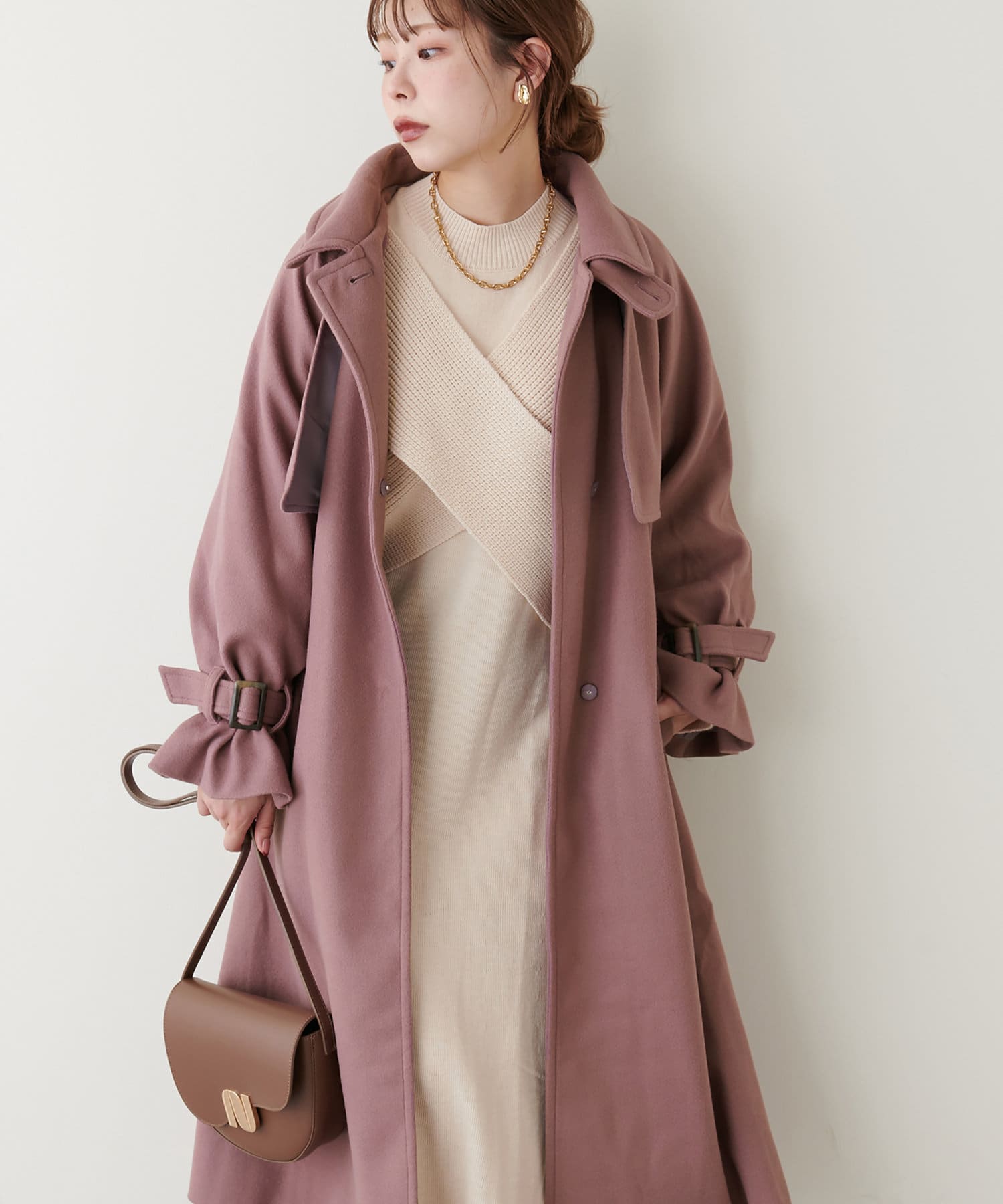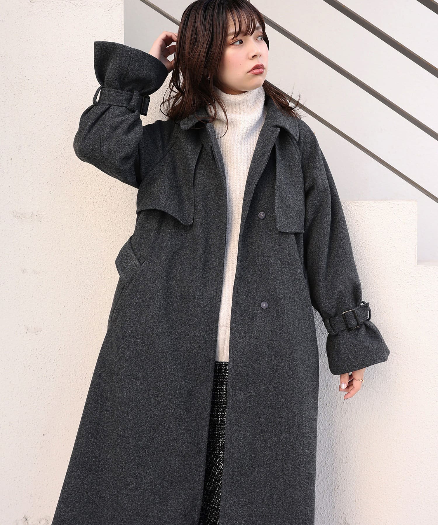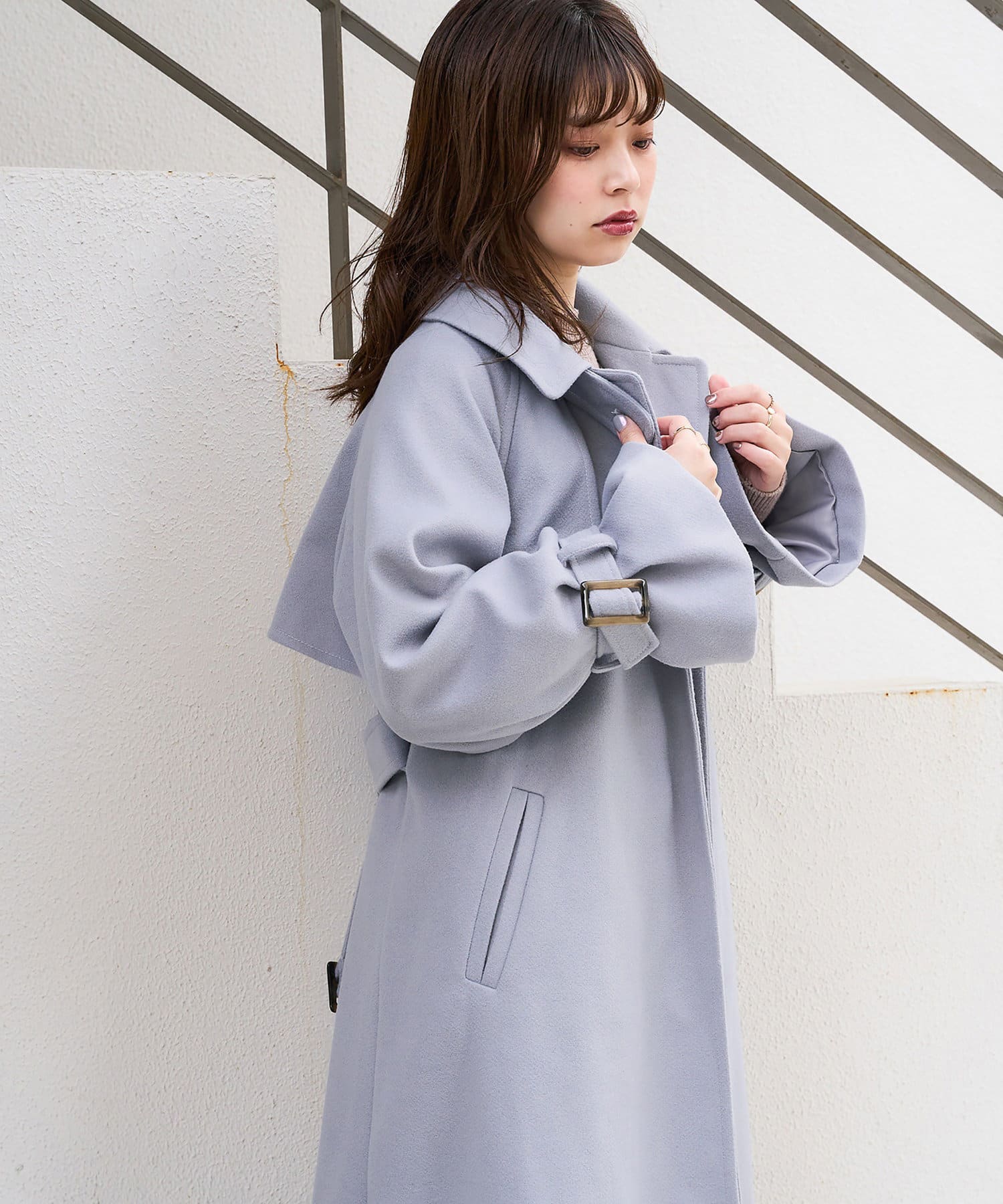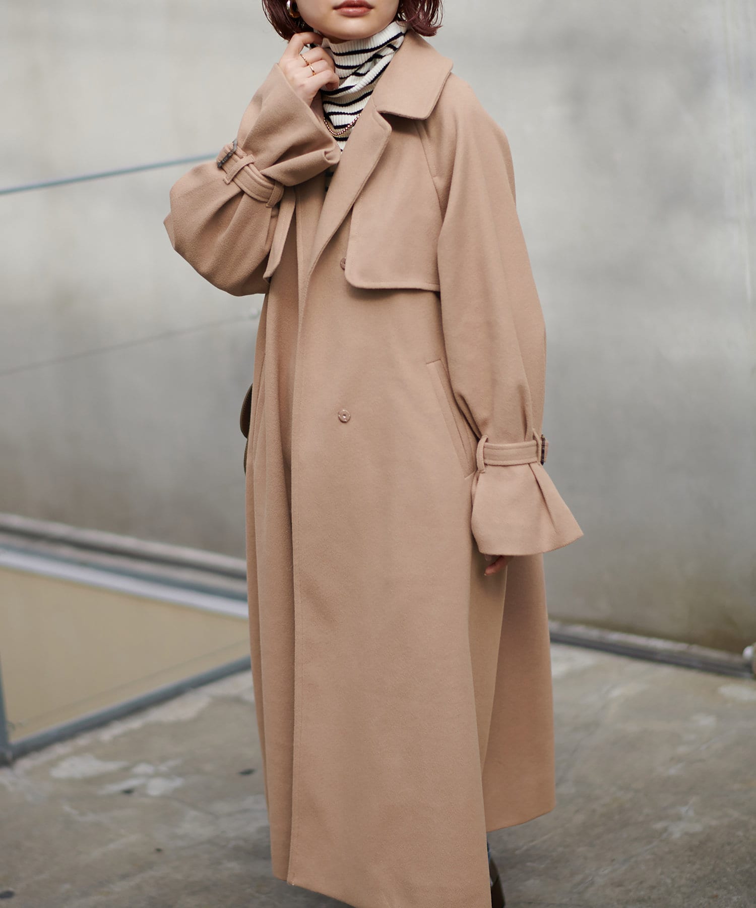 トレンド感のあるスタンドカラーがポイントのロングコートの登場。