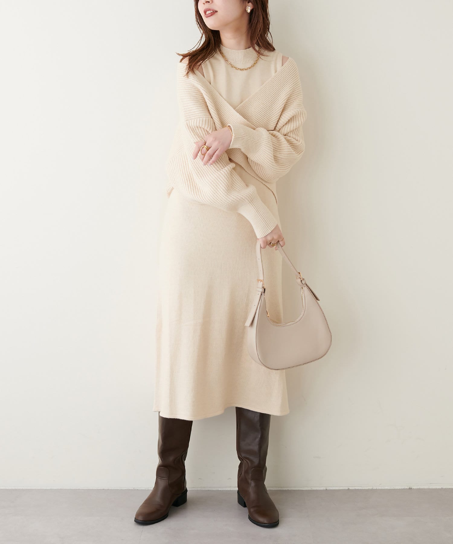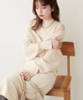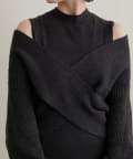 クロスニットのトップスにタートルネックやシャツをレイヤードしたスタイリングもオススメ◎