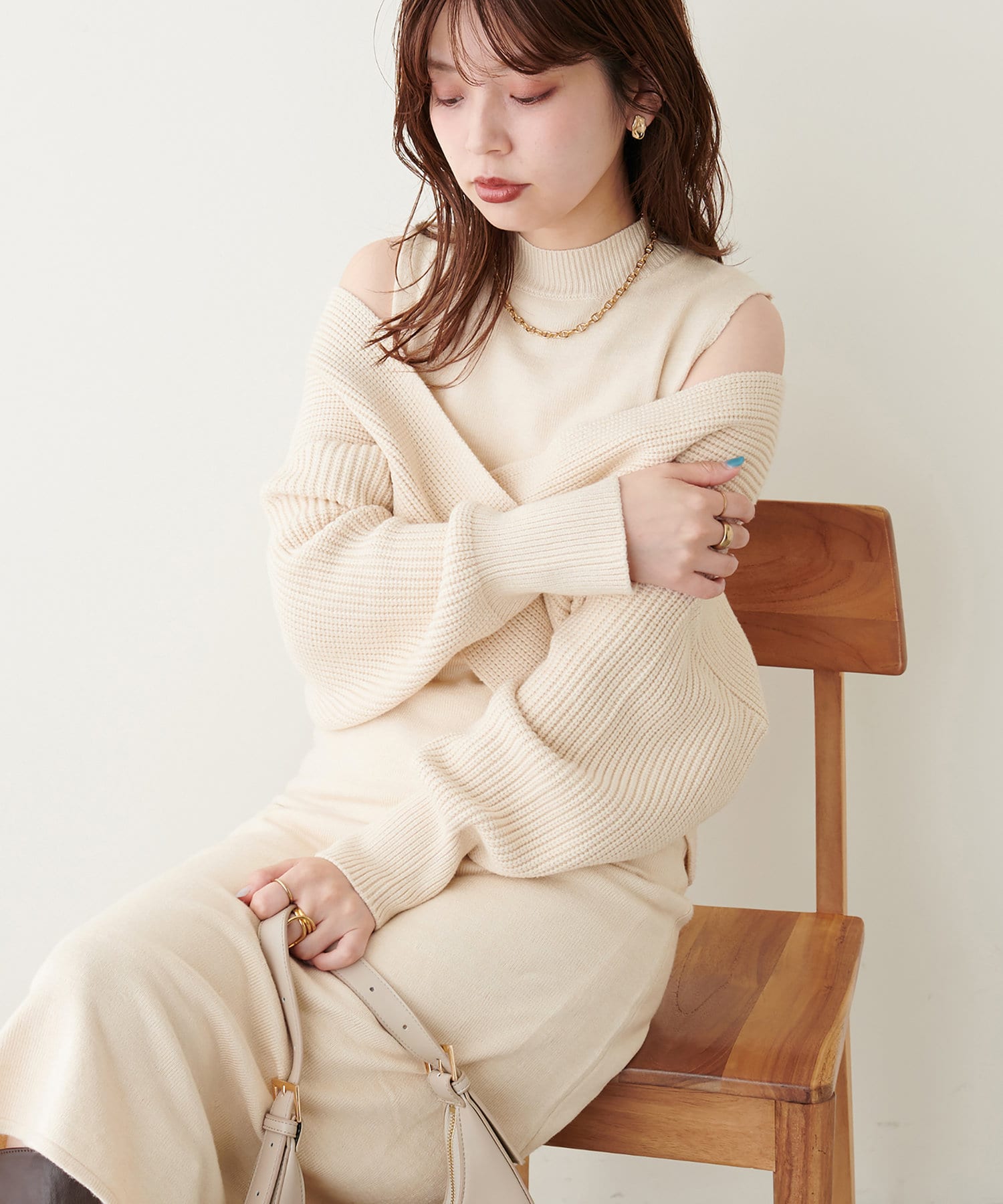 肩から覗く肌魅せがヘルシーで大人っぽい着こなしに。