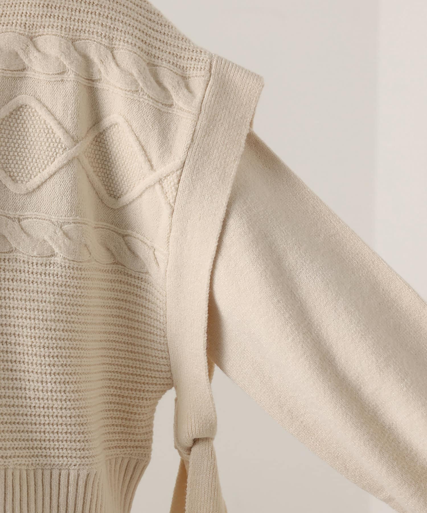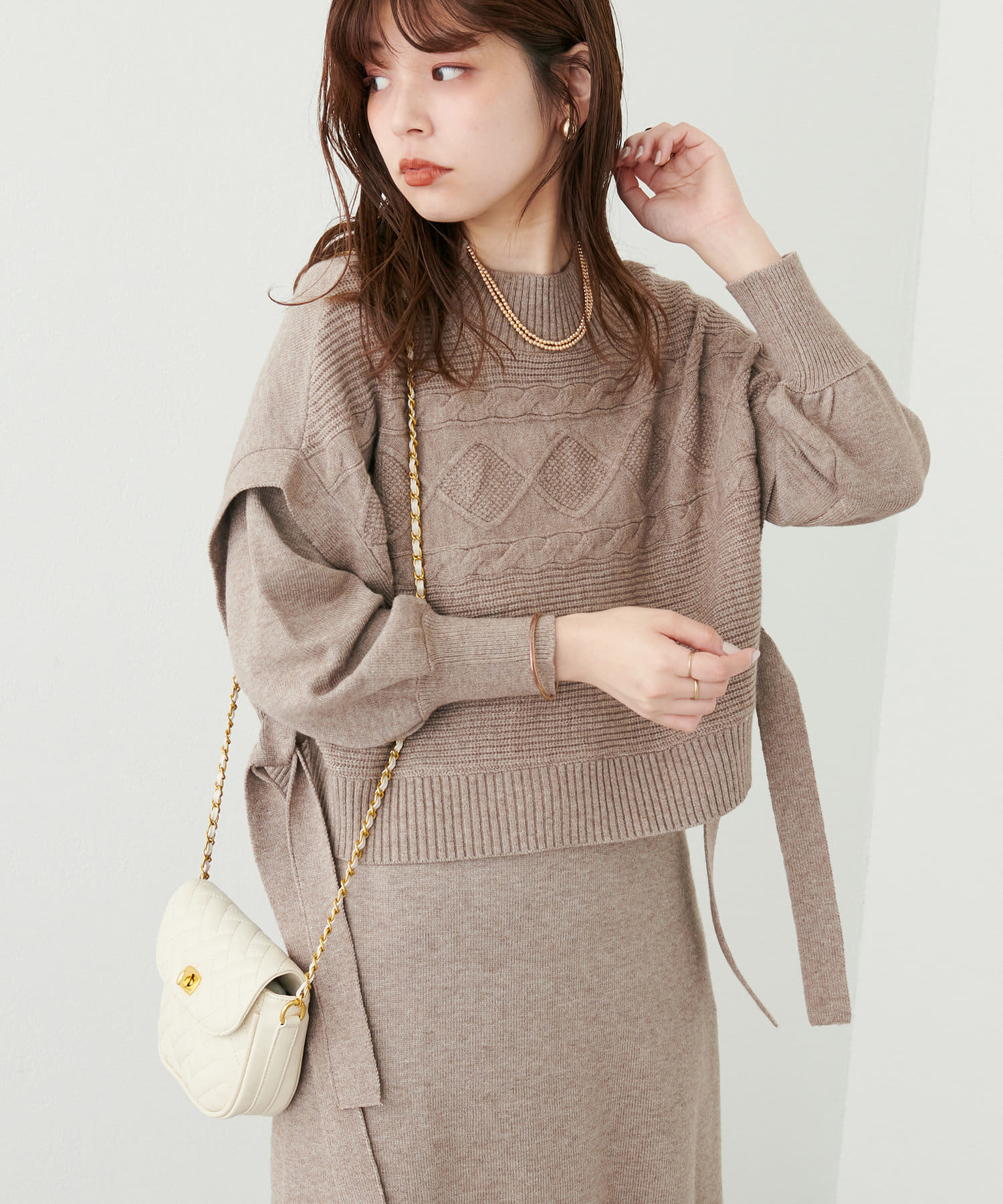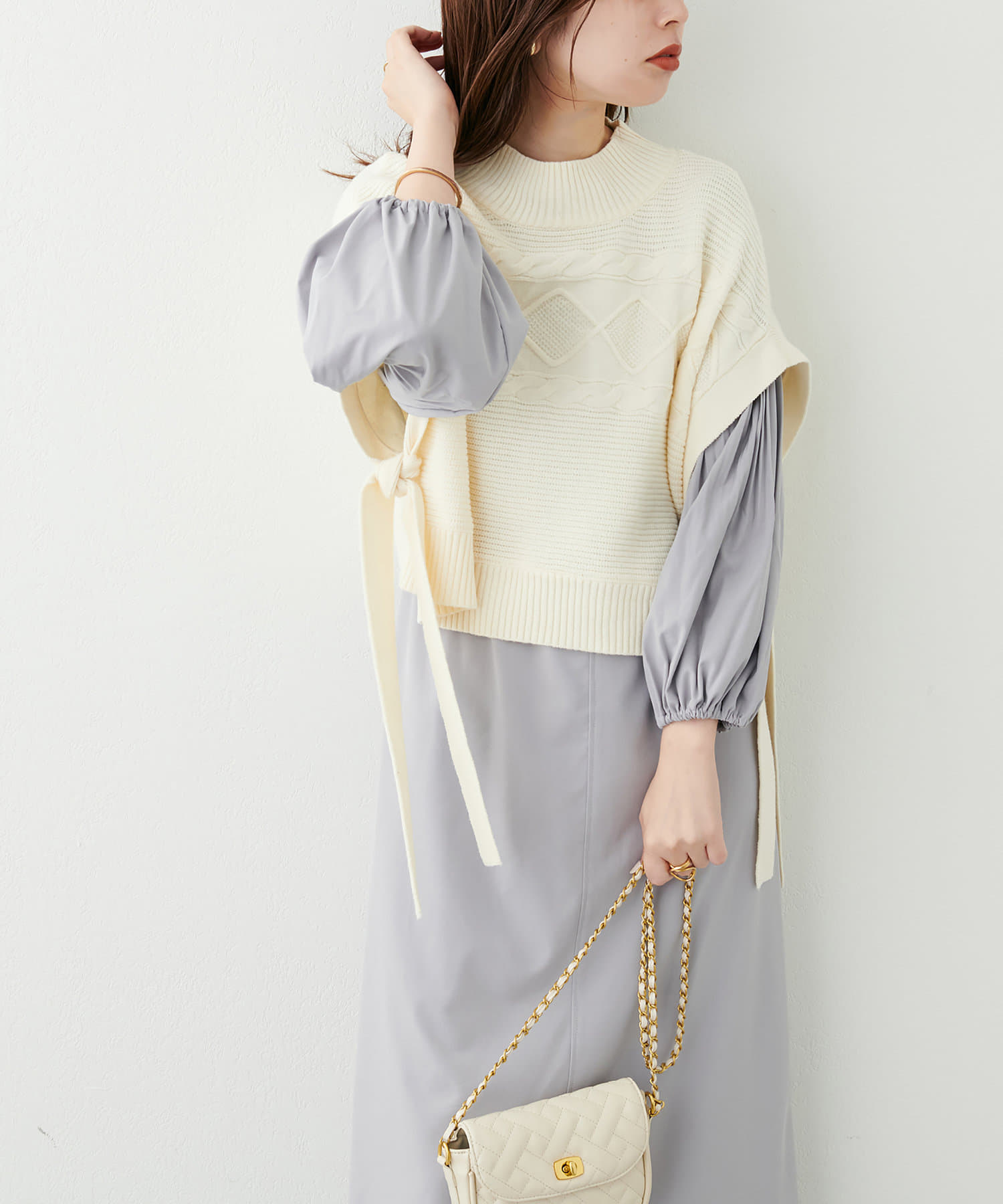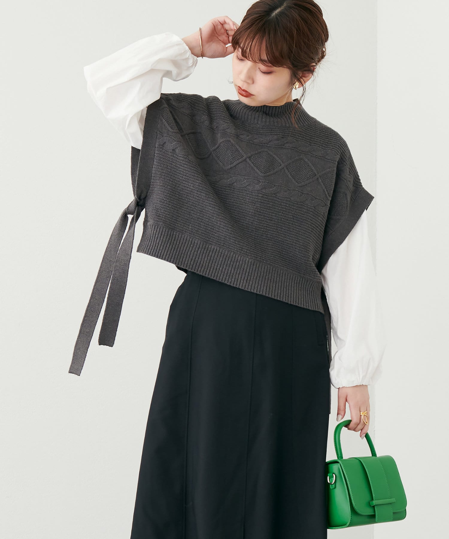 ケーブルニットベストは、脇の部分をお好みで結んで頂くとポイントに◎