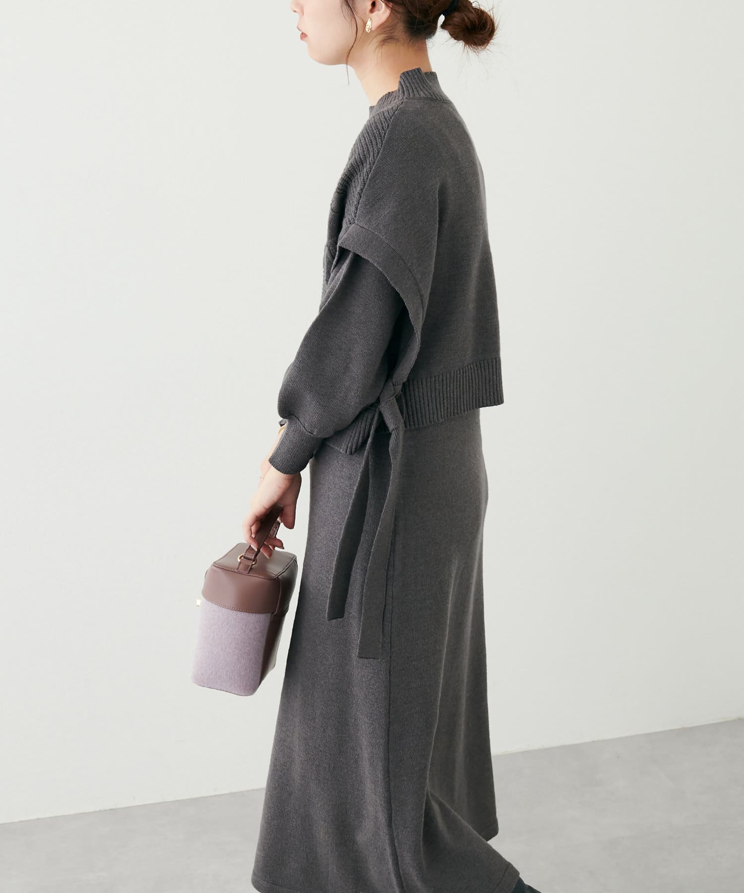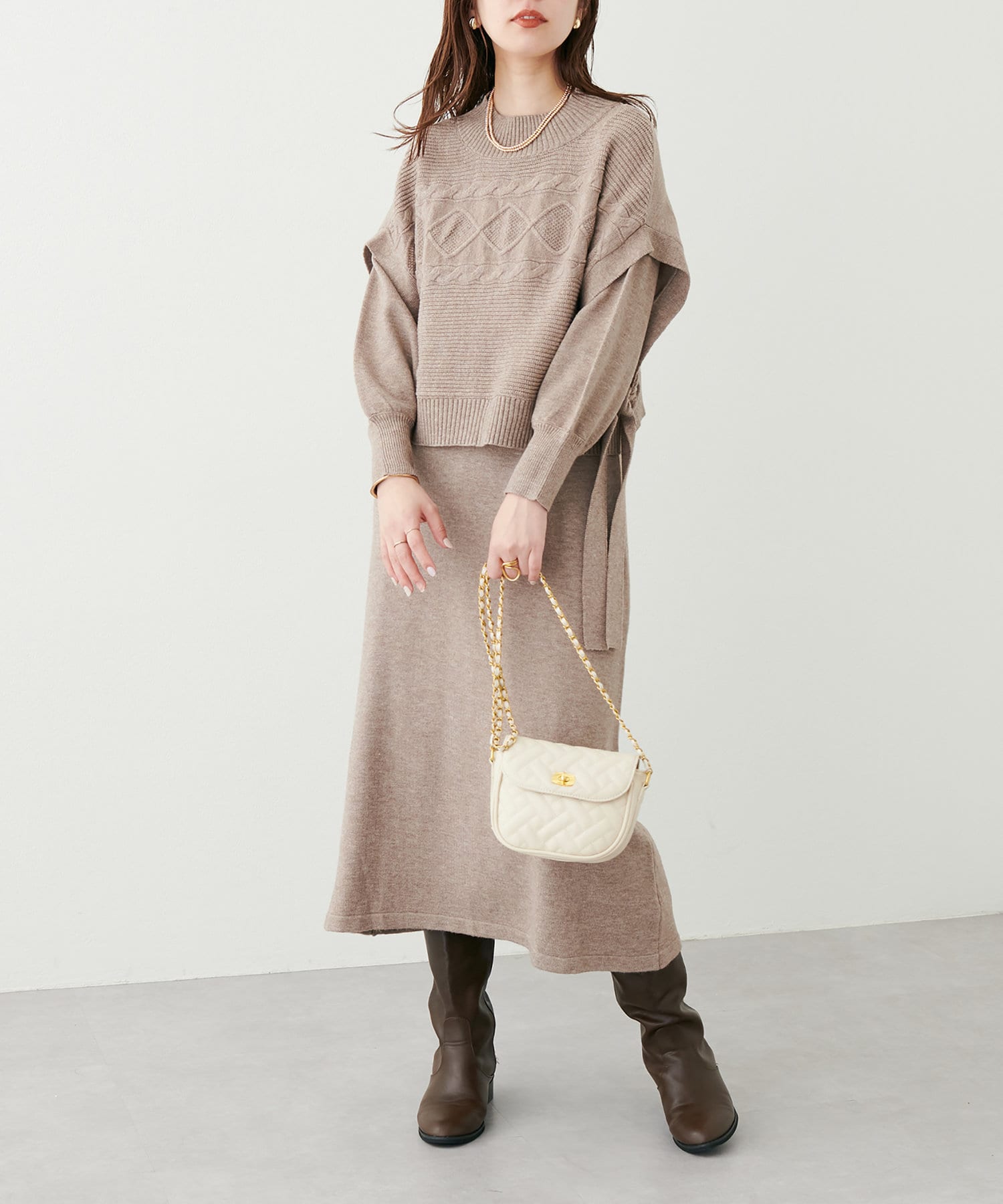 ほっこりとした暖かみのあるケーブル編みニットベストと、ニットワンピースのお得なセットアイテム。