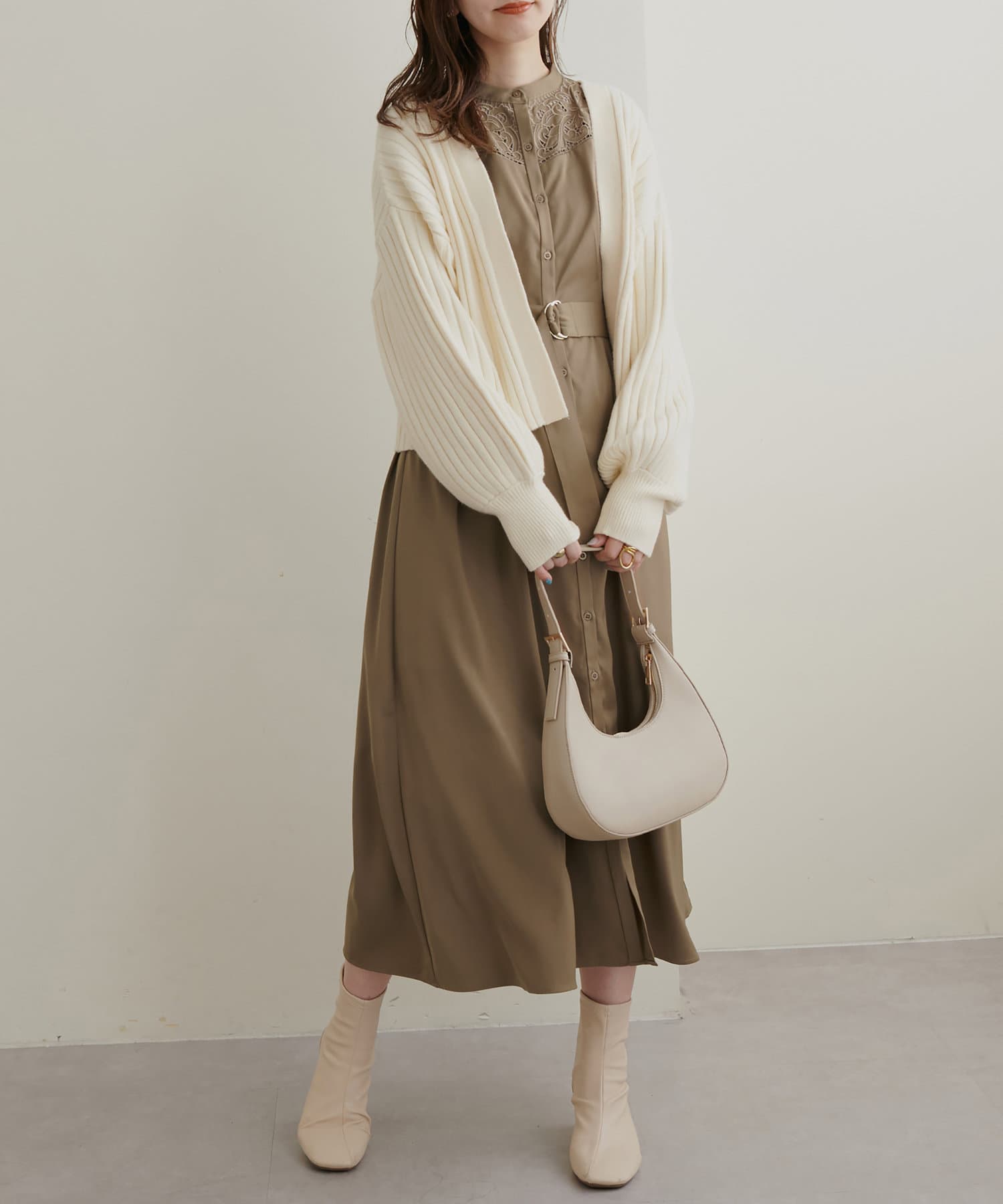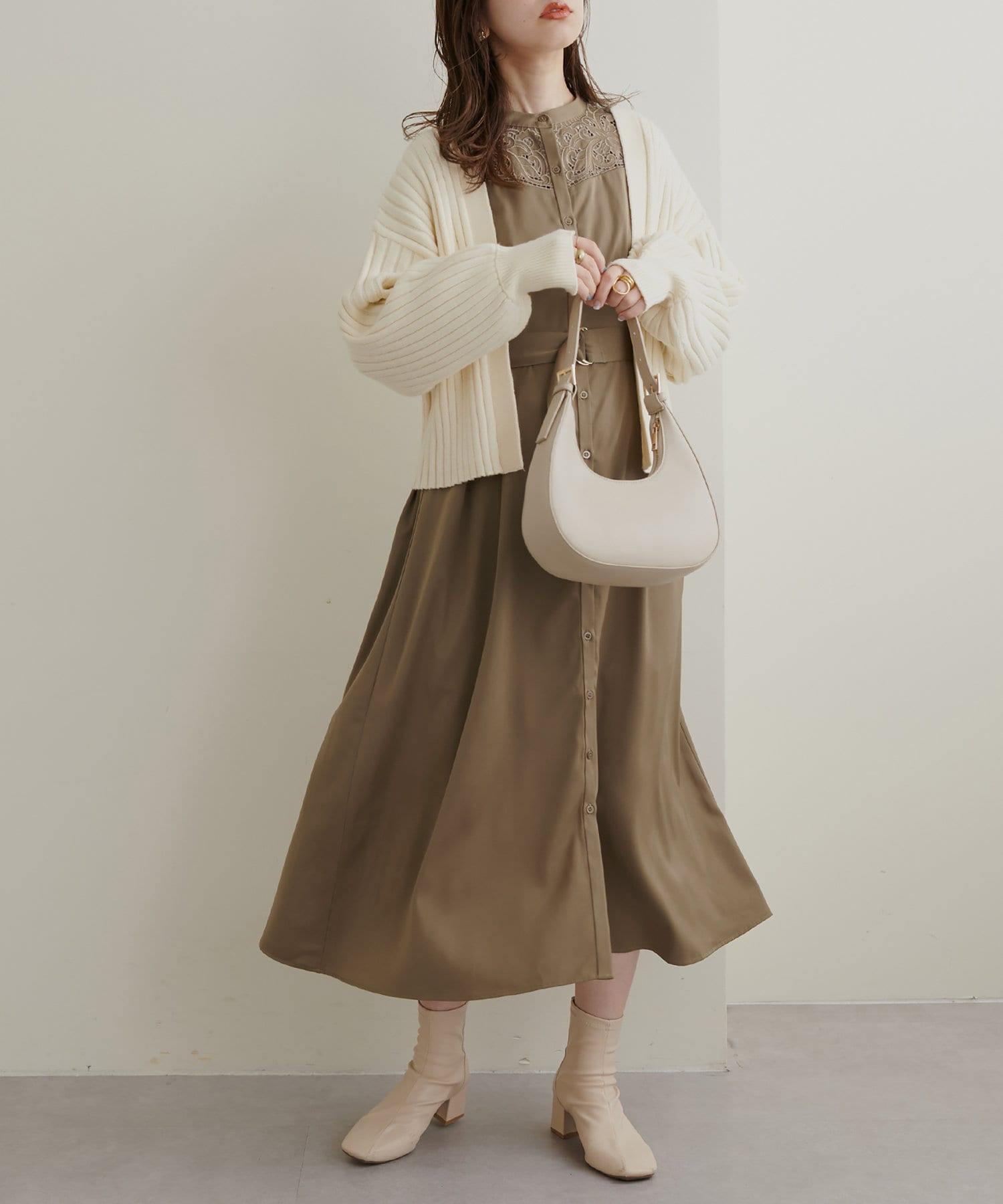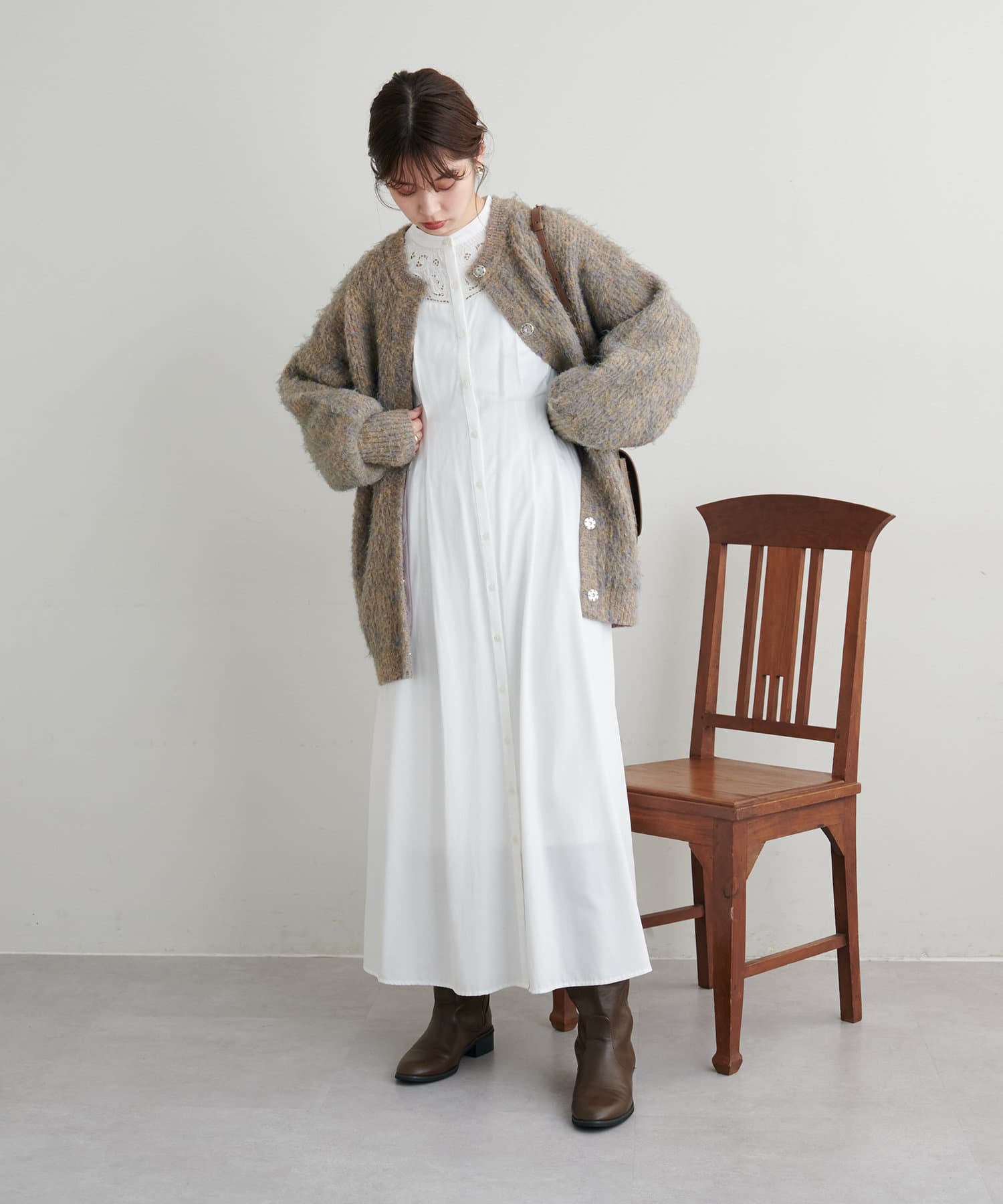 お好みでニットカーデやファーベスト、プルオーバーとのレイヤードスタイルでも異なる雰囲気を楽しんで頂けます。