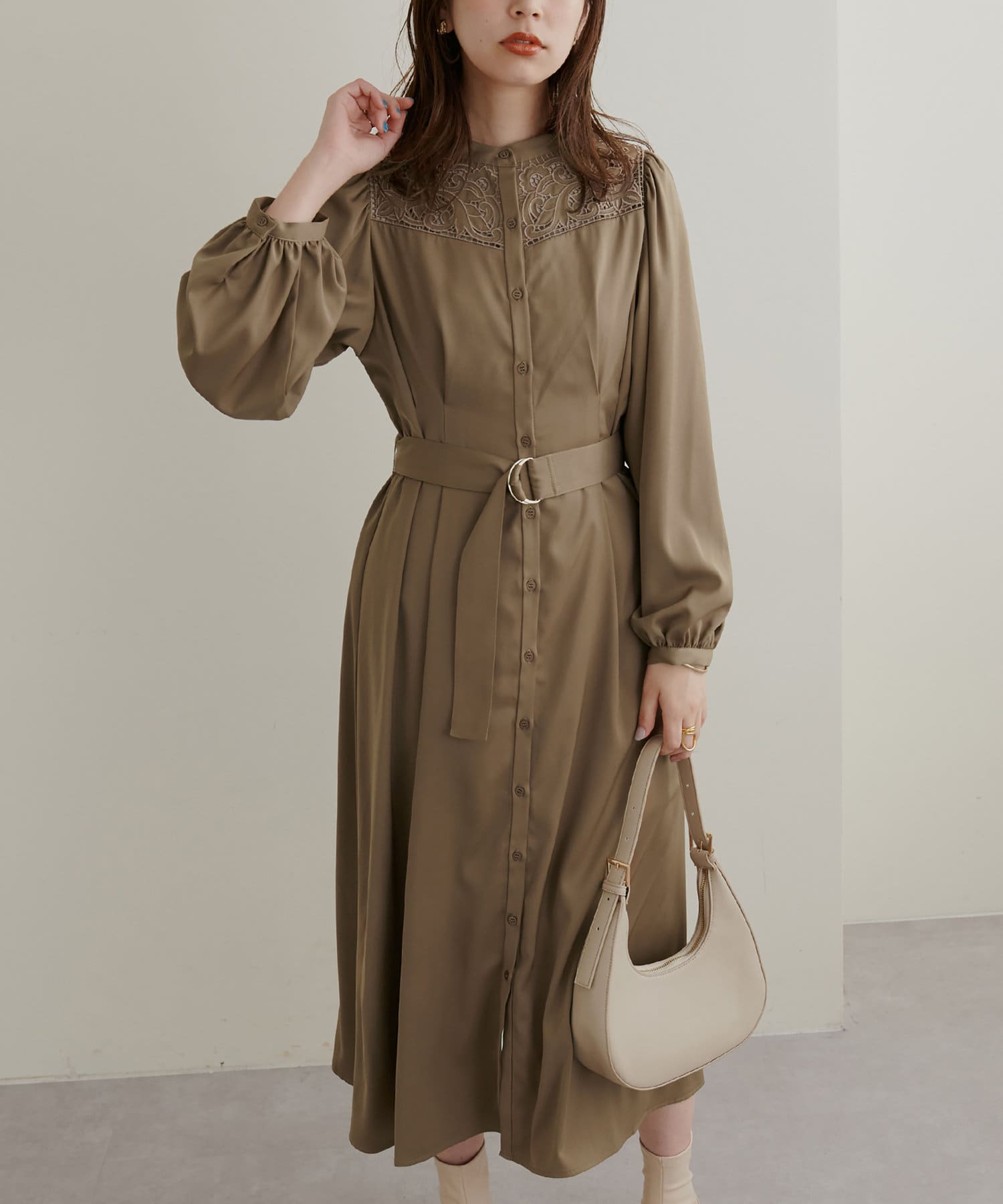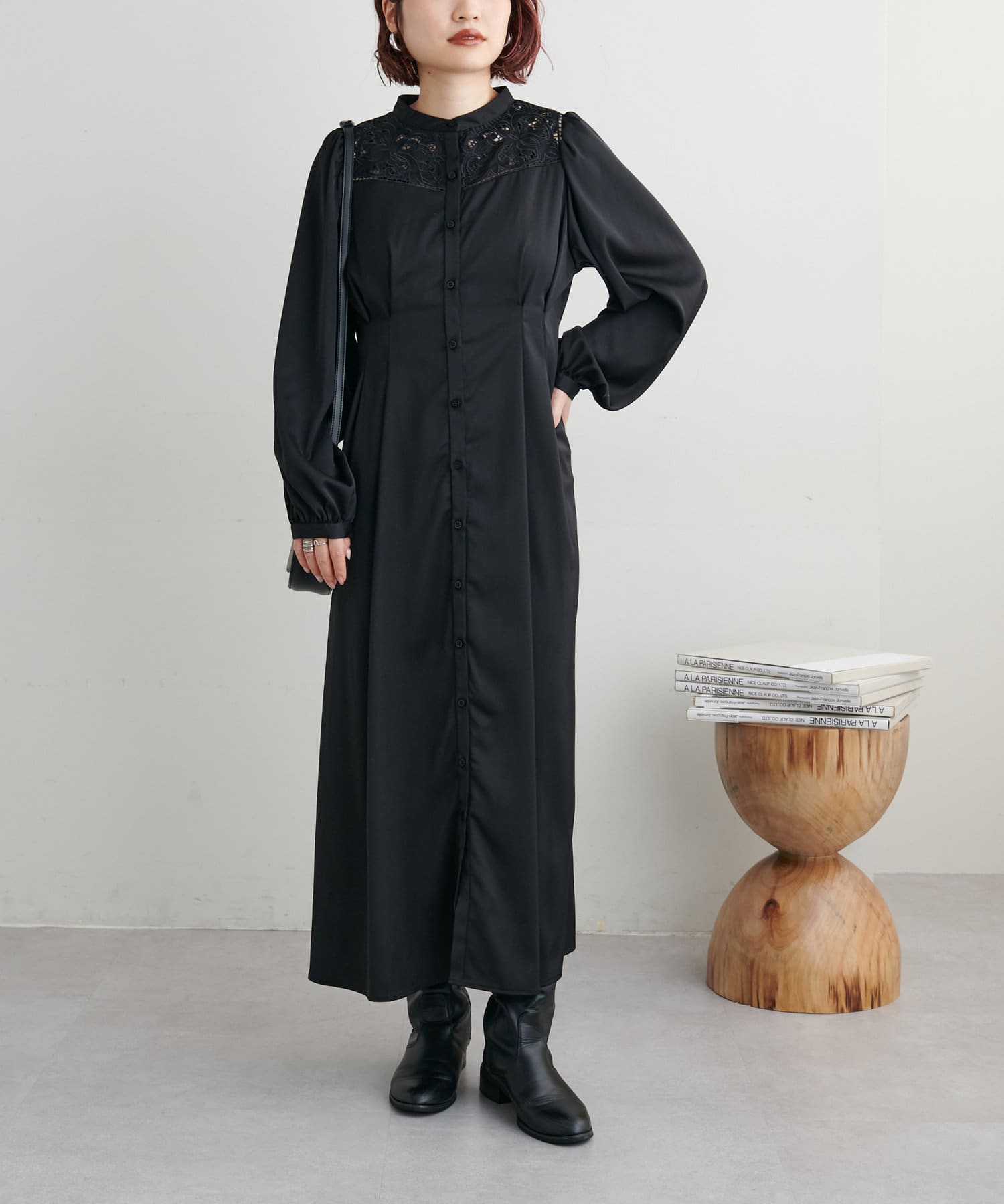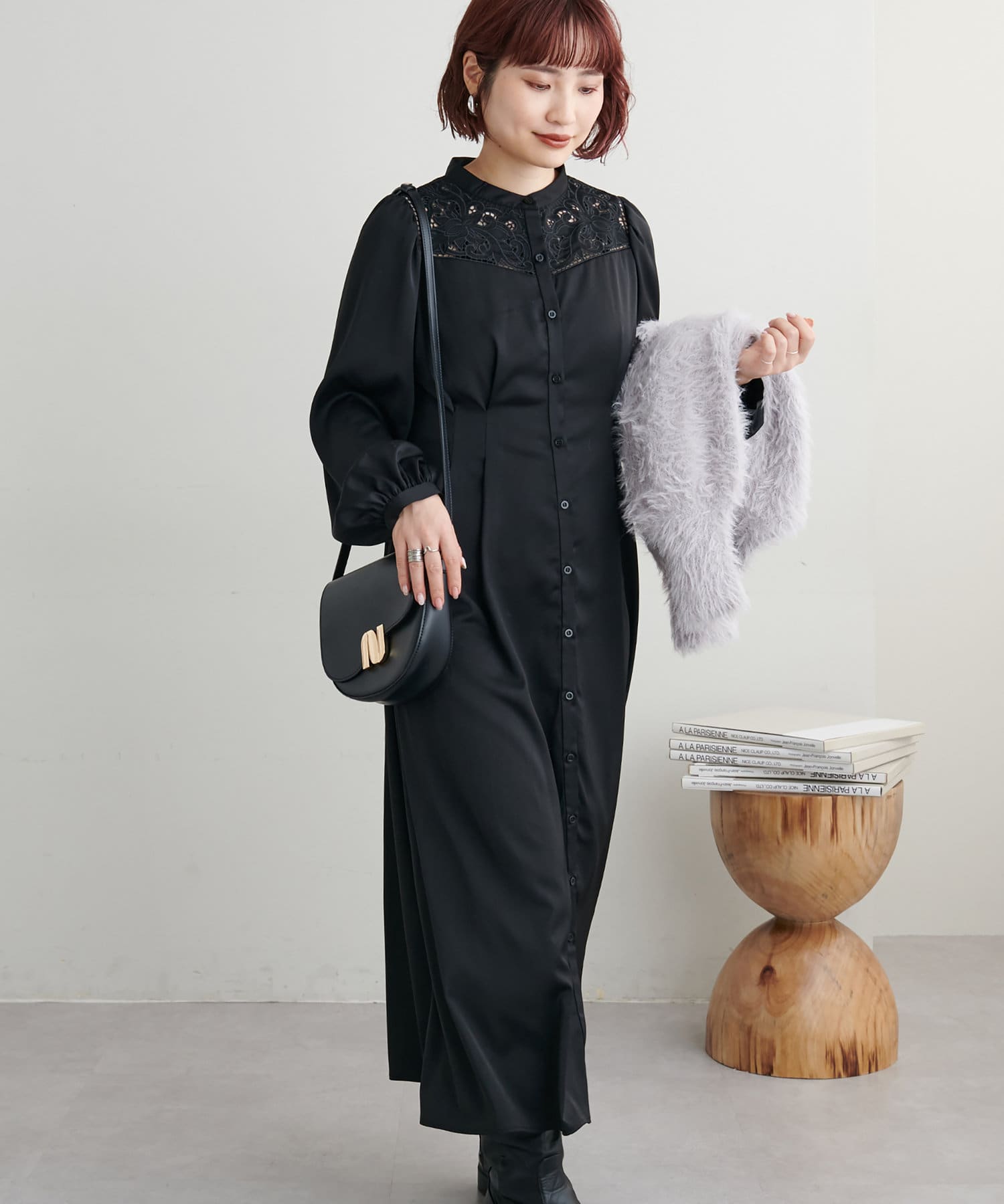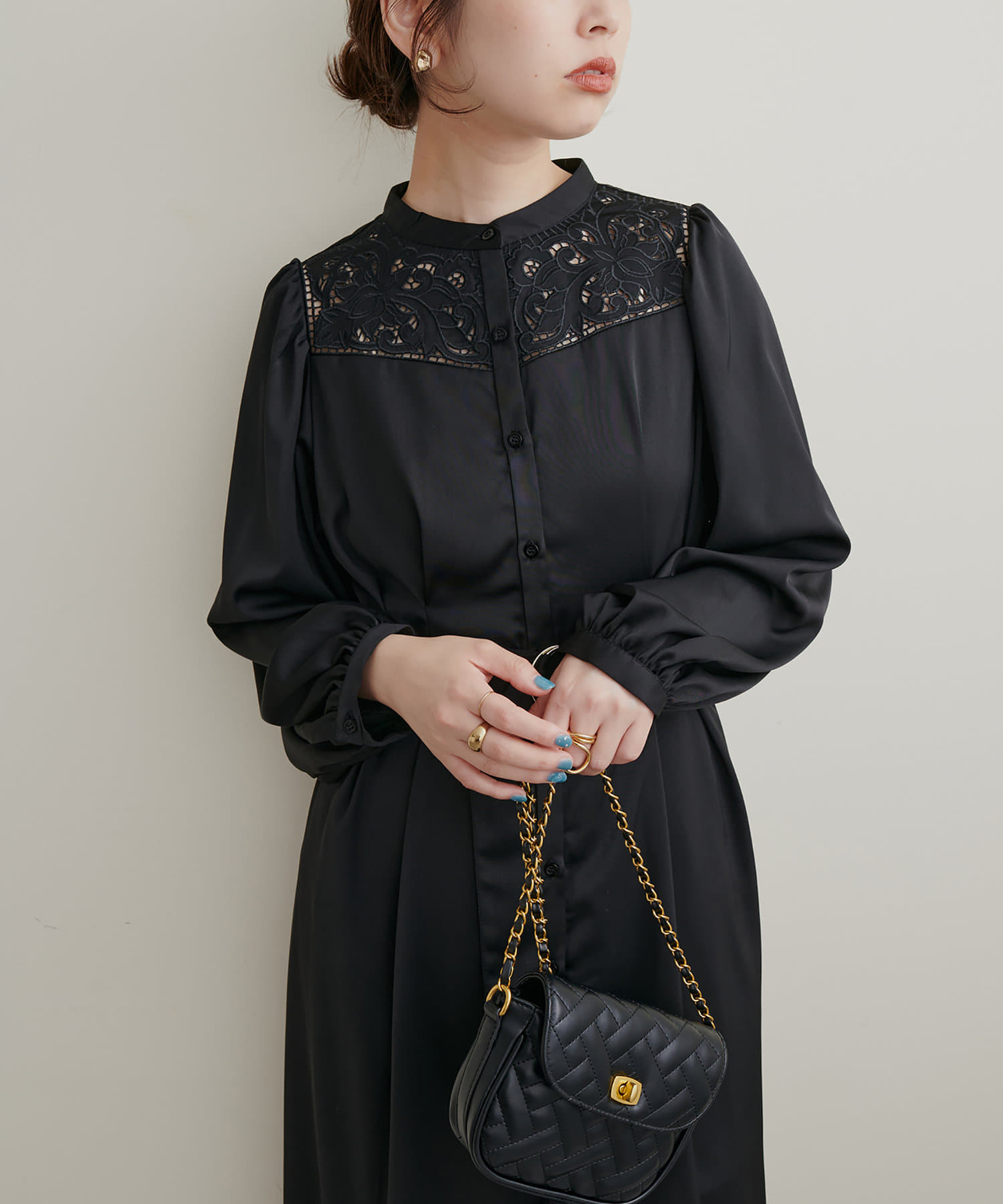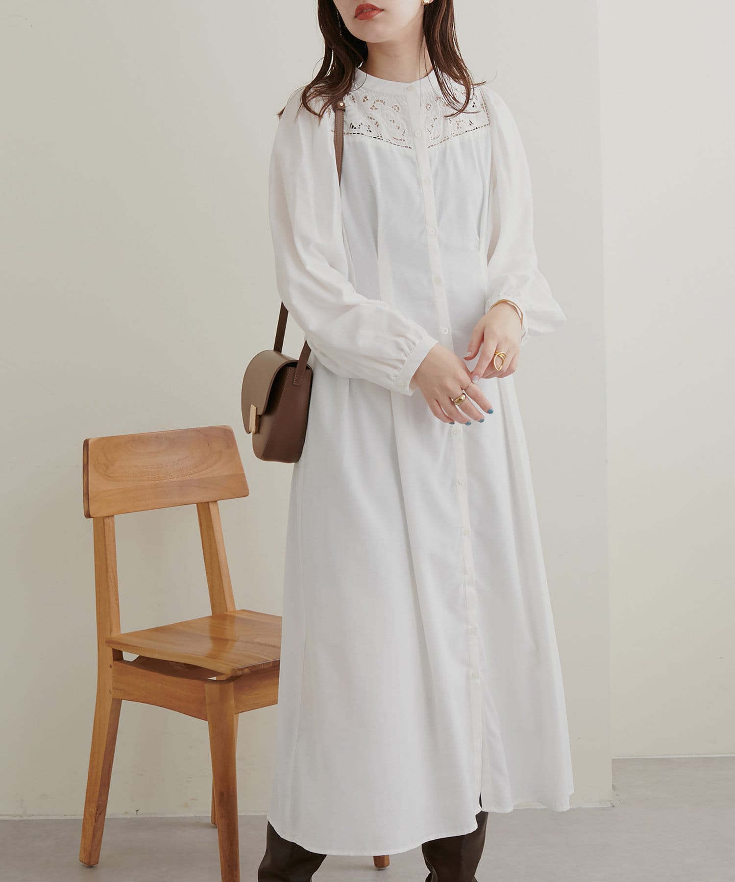 胸元のモチーフレースが上品さとビンテージ感溢れる、大人レディワンピース。