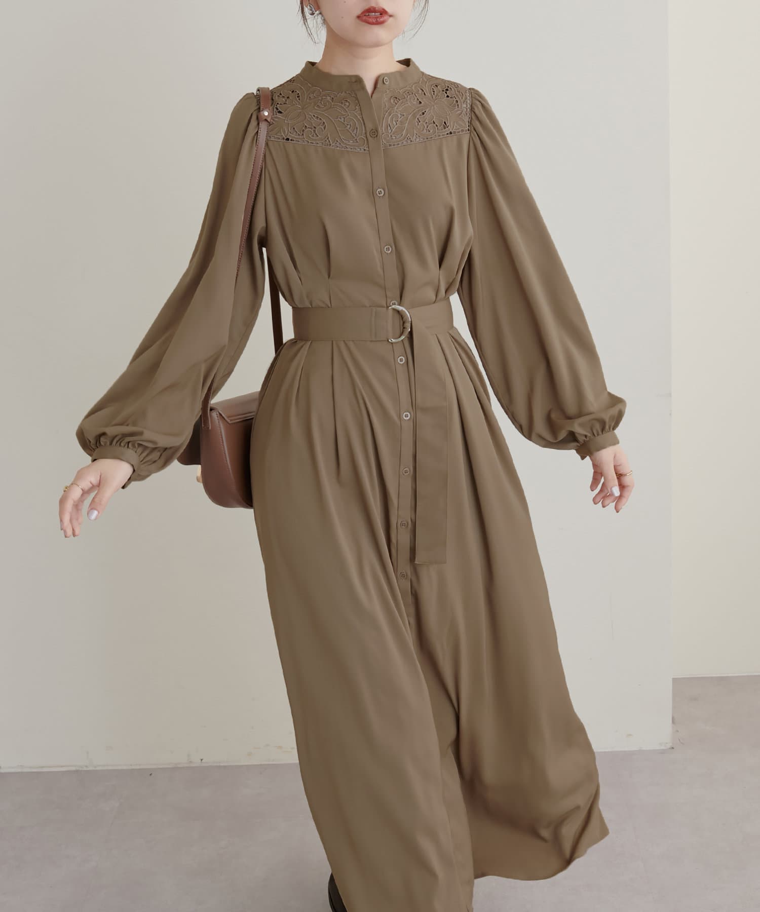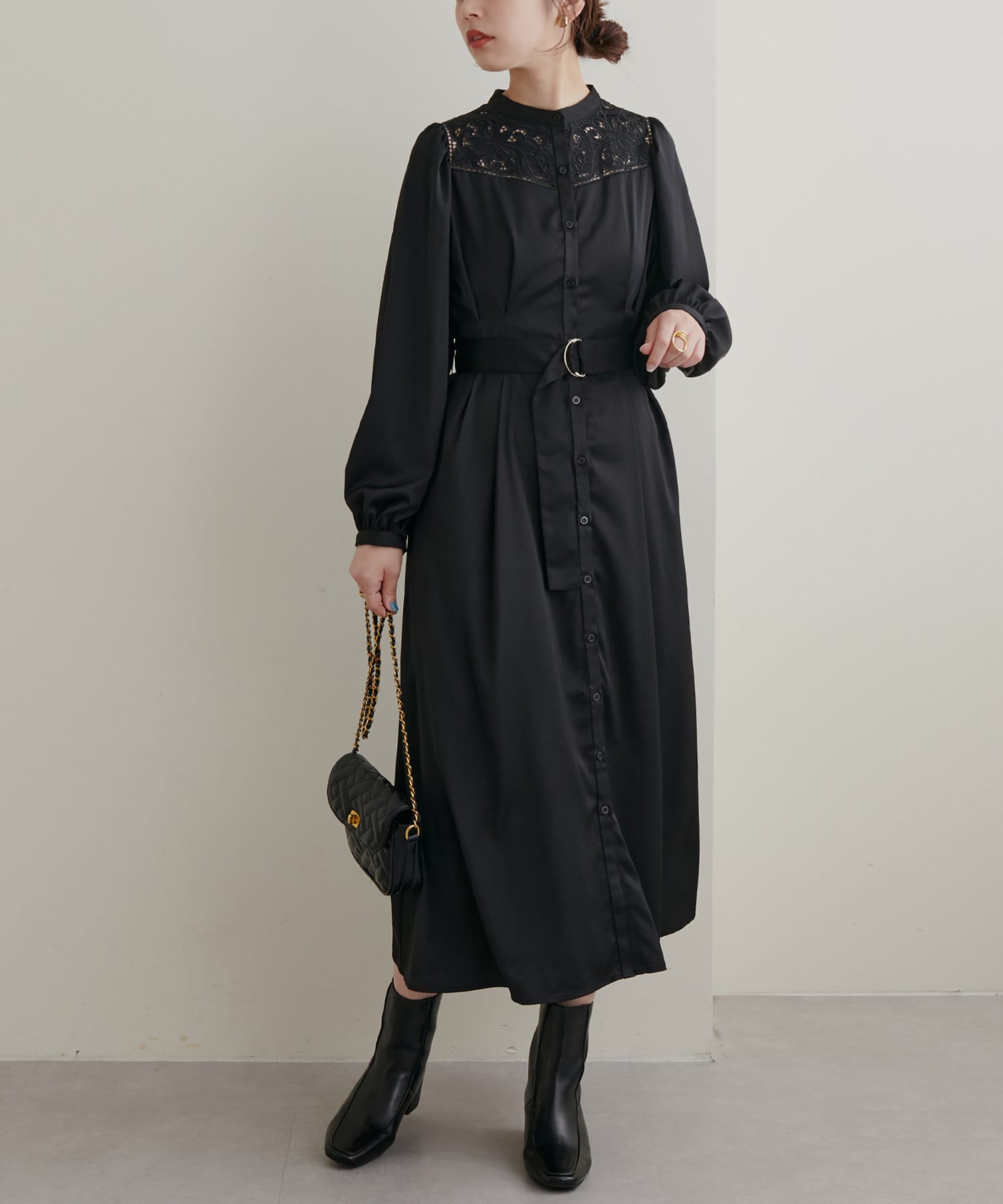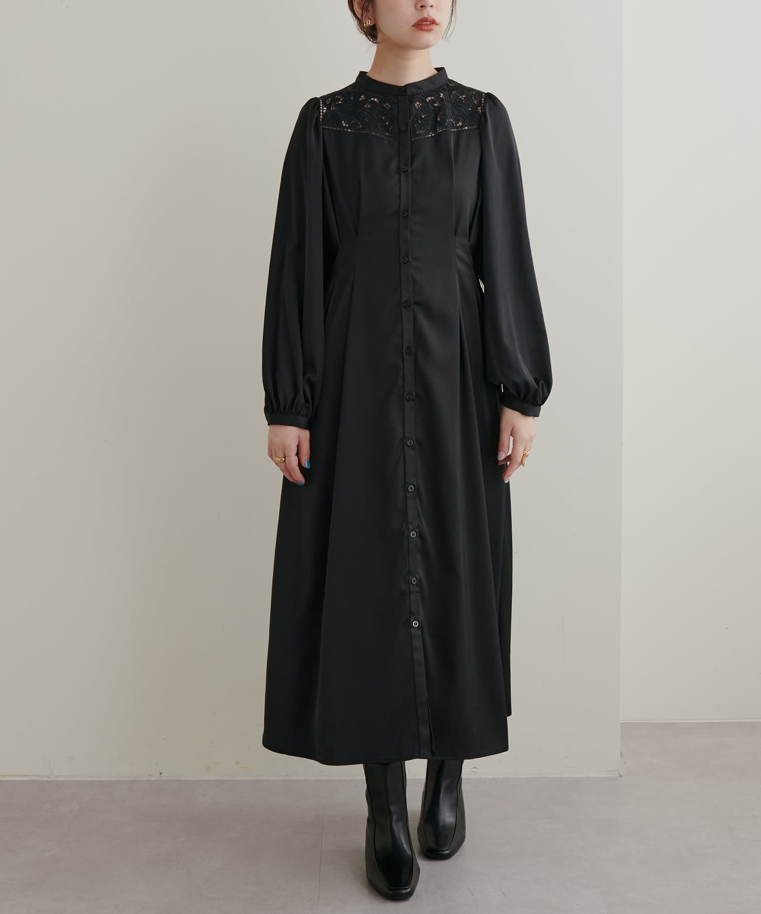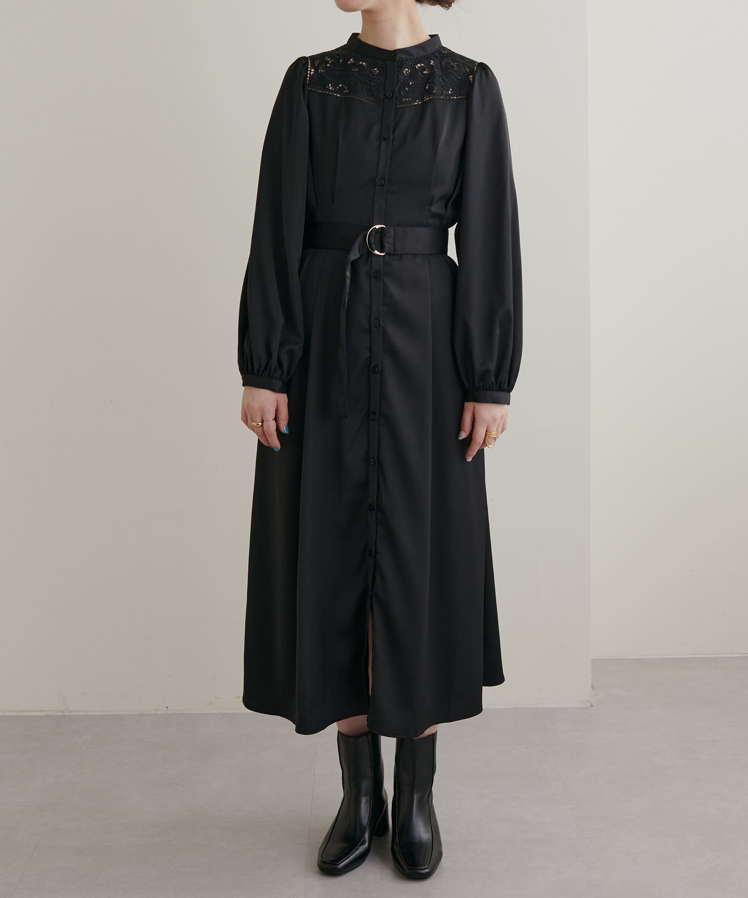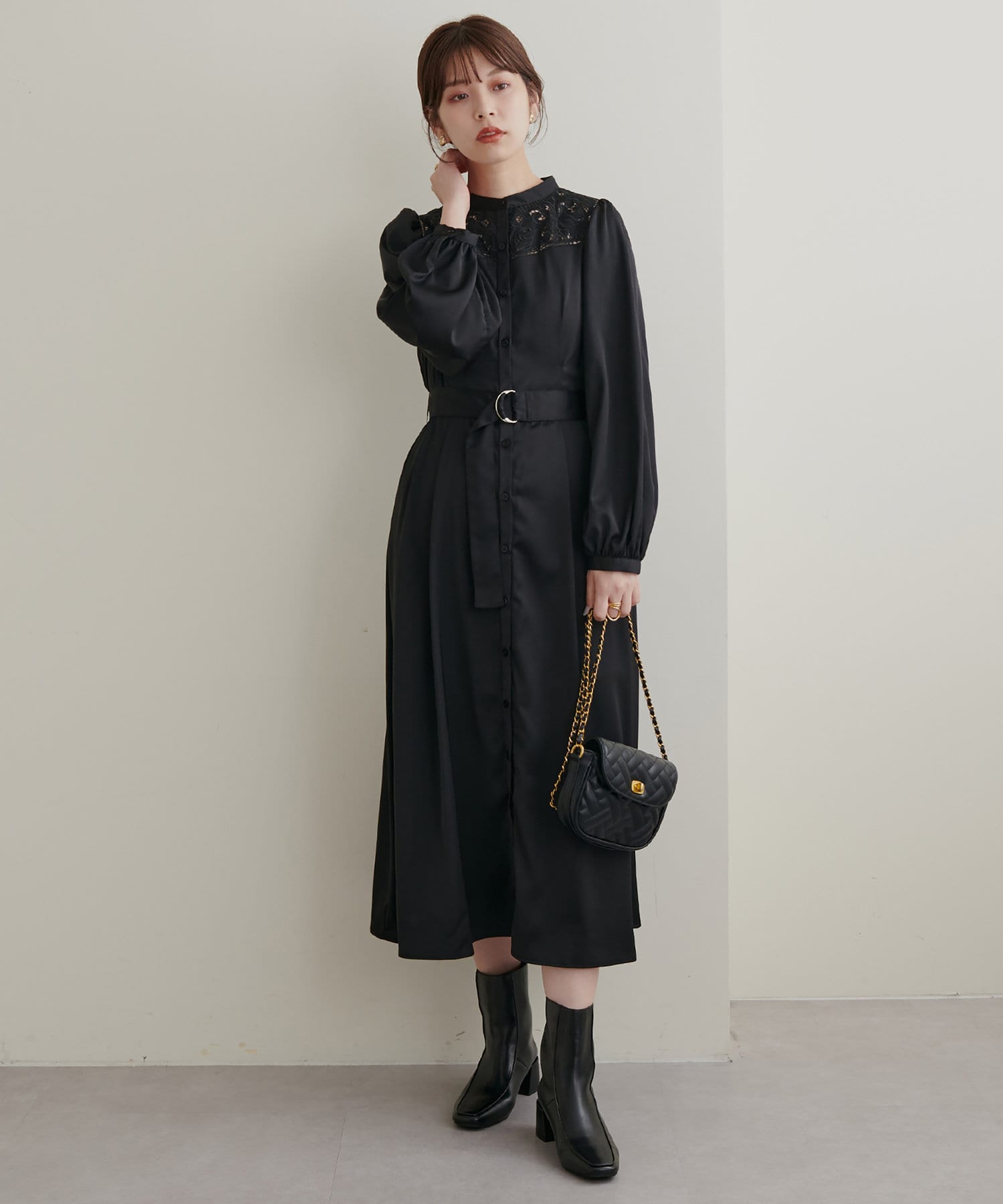 胸元のモチーフレースが上品さとビンテージ感溢れる、大人レディワンピース。